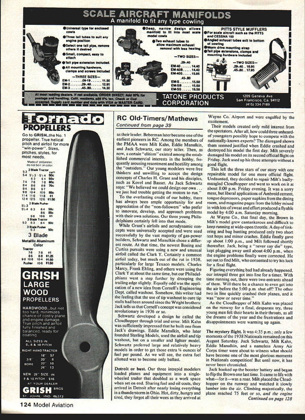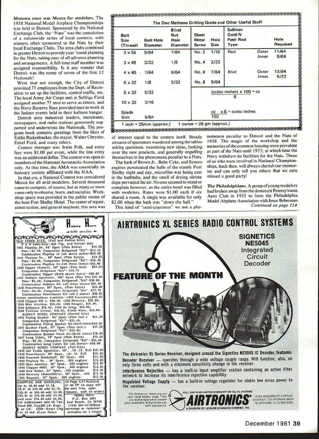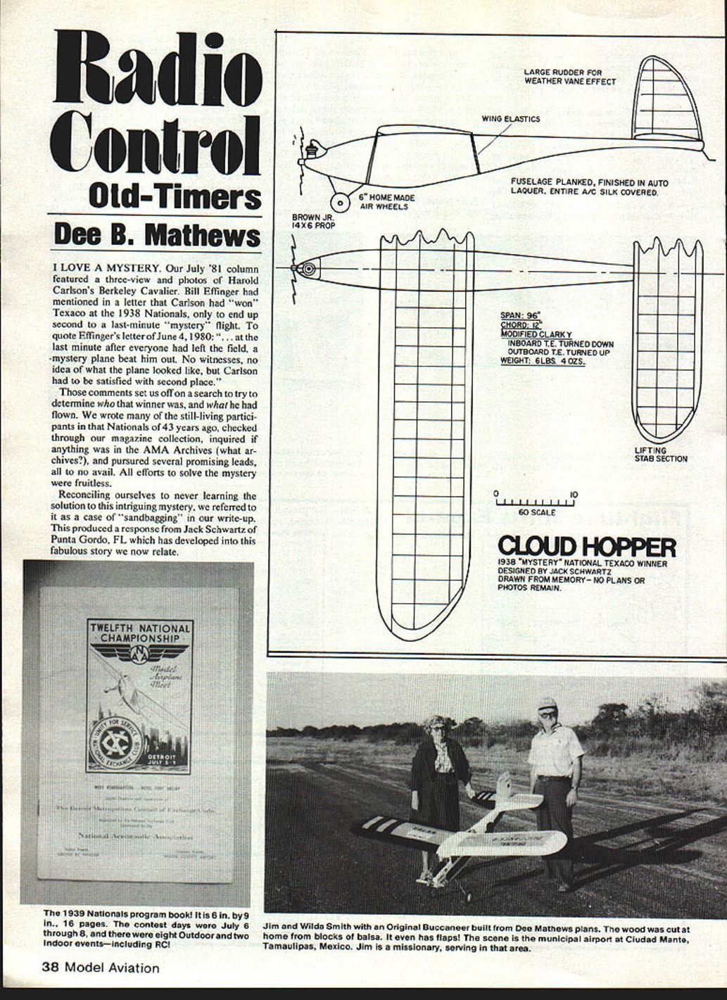 Control Old-Timers Dee B Mathews LOVE MYSTERY July 81 column featured three-view photos Harold Carisons Berkeley Cavalier Bill Eflinger mentioned letter Carlson won Texaco 1938 Nationals end up second last-minute mystery flight quote Effingers letter June 4 1980 . last minute after everyone left field mystery plane beat him out No witnesses no idea what plane looked like Carlson satisfied second place comments set us off search try determine winner what flown wrote still-living partici pants Nationals 43 years ago checked through magazine collection inquired anything AMA Archives what ar chives pursured several promising leads no avail efforts solve mystery fruitless Reconciling ourselves never learning solution intriguing mystery referred case sandbagging write-up produced response Jack Schwartz Punta Gordo FL has developed fhulous story now relate LARGE RUDDER FOR WEATHER VANE EFFECT WING ELASTICS HOMEMADE AIR WHEELS BROWN JR 14X6 PROP FUSELAGE PLANKED FINISHED IN AUTO LAQUER ENTIRE A/C SILK COVERED KSPAN 96 iiW 12 MODIFIED CLARK Y INBOARD TE TURNED DOWN OUTBOARD TE TURNED UP WEIGHT 6LBS 40Z5. LIFTING STAB SECTION O10 11111liii 60 SCALE CWUD HOPPER 1938 MYSTERY NATIONAL TEXACo WINNER DESIGNED BY JACK SCHWARTZ DRAWN FROM MEMORY NO PLANS OR PHOTOS REMAIN / 38 Model Aviation Ins 1 onals program book ise 9 16 pages Contest days July 6 Jim Wilda Smith Original Buccaneer built Dee Mathews plans wood Cut through 8 eight Outdoorand two home blocks balsa has flaps scene municipal airport Ciudad Mante Indoor eventsincluding Rd Tamaulipas Mexico Jim missionary sewing area Motown once Mecca modelers 1938 National Model Airplane Championships held Detroit Sponsored National Exchange Club Nats cumulation nationwide series local contests winners often sponsored Nats local Exchange Clubs area clubs combined greater Detroit provide year round planning Nats taking care advance planning arrangements full-time staff member assigned responsibility wonder Detroit scene seven first 12 Nationals enough City Detroit provided 75 employees Dept Recre ation set up facilities control traffic etc local Army Air Corps unit Selfrige Field assigned another 75 men serve timers Navy Reserve Base provided men work Indoor events held balloon hangar Detroit area industrial leaders merchants newspapers radio stations generously sup ported underwrote Nationals pro gram book contains greetings likes Eddie Rickenbacker mayor Walter Chrysler Edsel Ford others Contest manager Irwin Polk entry fees $100 per event late entry additional dollar contest open members National Aeronautic Association time AMA essentially honoary society affiliated NAA era National Contest considered Mecca avid modelers Several thousand came compete course came observe learn socialize Work shop space provided public rooms host Fort Shelby Hotel center repair construction general mayhem area Inner9/64 3x483/321/8No4 3/32 4 x407/649/64No67/64BlueOuter13/64 Inner5/32 6x321/85/32No89/64 8 x 325/32Icubic inches x 100 10x323/16 Spadecc x 6 c inches Bolt9/64100 1 inch approx1 ounce m approx interest equal contest itself Steady streams spectators wandered among tables asking questions examining new ideas looking over new products generally engulfing themselves phenomena peculiar Nats bark Brown Jr Baby Cyke Syncro engines punctuated halls stately Fort Shelby night day microfilm being cast bathtubs smell drying nitrate dope pervaded air No seemed mind complain however entire hotel filled modelers Rates $100 six shared room single available $200 bath down hall kind semi-craziness ws phe nomenon peculiar Detroit Nats 1938 magic workshop memories common housing prevalent part Nats until 1973 time Navy withdrew its facilities Nats us involved National Champion ships back will always cherish memor ies can tell others sure missed good party Philadelphians group young modelers broken away dominant Pennsylvania Aero Club 1935 form Philadelphia Model Airplane Association Jesse Beberman Continued page 124 December1981 39 1Batmis B0 .Aabt OLD TIMER KITS tYolI al P & W Semi-Kits--RI no 1941 Playboy Jr 54 Sp Ptan--$2IO Compan no combination Playboy 1041 Playboy 5r 80 Plan--$3 00 companion Stripwood Kt--$20 30 combination Playboy 5ralI three items-$450O 1939 Zipper comet 54 Span Plan Inol $3300 companion stripwood Kit--SIl 72 combination Zipper Both above ilema--$4500 1932 Dallaire Sportater 109 Span Plan EX $2600 Flan--$5OO companion Slripwood Kil~$3000 combination ualtaire Kit three itemo-$50 00 1930 Pomerhouse 04 span Plan Eatra $2100 Flan--$4 09 companion slripwood Kit--$17 70 combination Powerhoune Kit 3 above $3900 Other combinations available-- 1930 Buccaneer$45 00 1930 clipper MK $3000 1939 Mercury $1100 1931 Miss America $1900 1940 Ranger $2200 1949 Sailplane $7000 1940 So Long $2000 1938 Trenton Terror $3000 Korda Woke $1600 MIDWAY MODEL COMPANY Partial Kits 1930 Flying Quaker 04 span Plan tool $2110 Companion Stripwood Kil--$3140 Combination Flying Quaker Kit Roth items$4900 1937 Quaker Flash oi span Plan lncl $1710 Companion stripwood Kit--$2345 combination Quaker Flash Kit Both items $3900 1937 Lung Cabin 70 span Plan Extra $1500 Plan--SI 00 Companion stripwood Kit--$24 00 Combination Long Cabin Kit three--$4OOO MIDWAY MODEL COMPANY Full Kits 1939 Air Traila Sporlater 10 1511 R/C $3590 1939 Powerhouse 59 span 10- 15 R/C $3190 1940 Buzzard Bombshell 30 span 029 $1191 1940 Playboy Sr 39 Span 020 engines $1291 1935 Misa America 20 Span 020 engines $1295 1949 Clipper MKII 36 Span 920 engines $1491 1940 New Ruler 31 Span 029 enginea $1395 1940 Mercury Scientifics 30 span 029 $1291 1941 Request 30 span 020 engines $12951 SHIPPING AND HANDLtNG 00 Page CATALOGUE up $800 add $110 $100 PP copy witi $801 $2900 add $221 sent free upon $2901 $4109 add $300 request orderi $4501 $7089 add $310 a y am over $7909 add $450 PO ass 3000 CA Addressees add 6% Tax Seal Beach Ca 90749 send MOVisalTdC 19 EapI 7141 094-6223[Be5t CK COD--Exact Chg mornings recorder--li rs1s0 Hdt Cash Only a