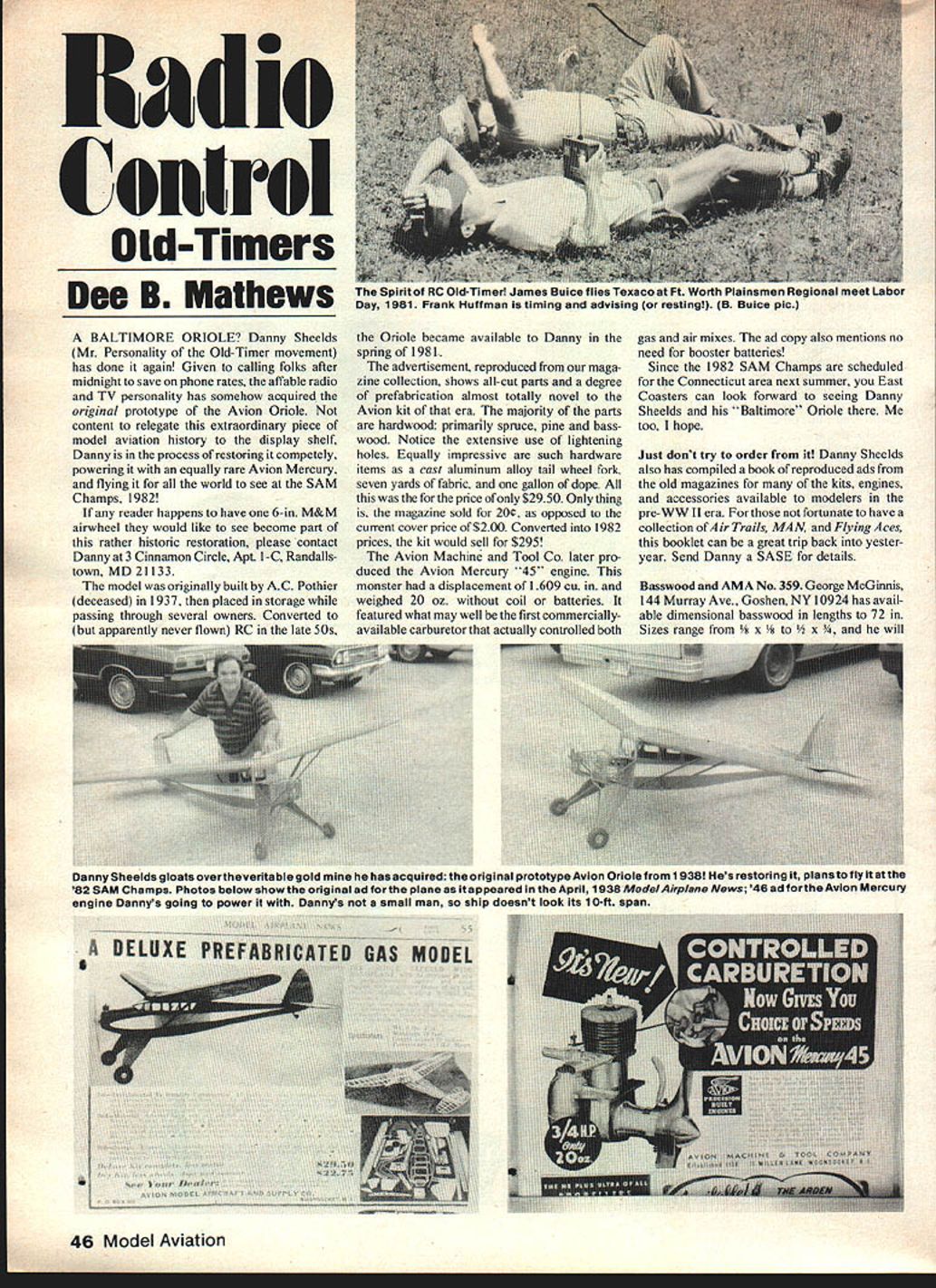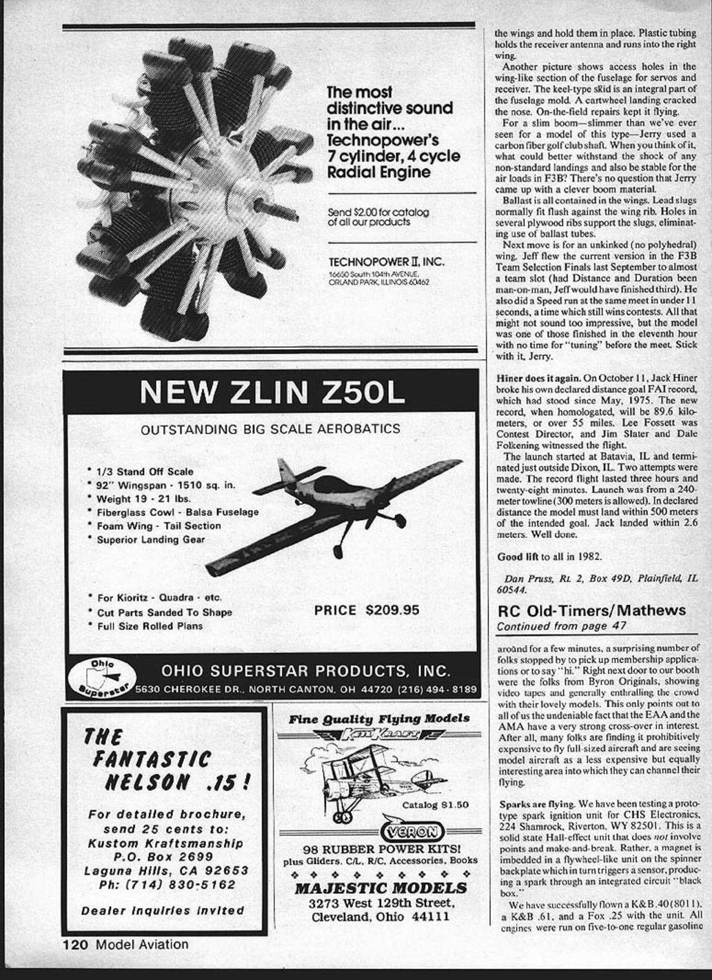 Radio CuErol 0 Id-Timers Dee B Mathews BALTIMORE ORIOLE Danny Sheelds Mr Personality Old-Timer movement has done again Given calling folks after midnight save phone rates affable radio TV personality has somehow acquired original prototype Avion Oriole content relegate extraordinary piece model aviation history display shelf Danny process restoring competely powering equally rare Avion Mercury flying world see SAM Champs 1982 reader happens have 6-in M&M airwheel would like see become part rather historic restoration please contact Danny 3 Cinnamon Circle Apt 1-C Randalls town MD 21133 model originally built C Pothier deceased 1937 placed storage passing through several owners Converted apparently never flown RC late SOs Oriole became available Danny spring 1981. advertisement reproduced maga zine collection shows all-cut parts degree prefabrication almost totally novel Avion kit era majority parts hardwood primarily spruce pine bass wood Notice extensive use lightening holes Equally impressive such hardware items cast aluminum alloy tail wheel fork seven yards fabric gallon dope the price $2950 Only thing magazine sold 20t opposed current cover price $200 Converted 1982 prices kit would sell $295 Avion Machine Tool Co later pro duced Avion Mercury 45 engine monster displacement 1609 cu weighed 20 oz coil batteries featured what may well first commerciallyavailable carburetor actually controlled both gas air mixes ad copy also mentions no need booster batteries Since 1982 SAM Champs scheduled Connecticut area next summer East Coasters can look forward seeing Danny Sheelds Baltimore Oriole too hope Just dont try order Danny Sheelds also has compiled book reproduced ads old magazines kits engines accessories available modelers pre-WW II era fortunate have collection Air Trails MAN Flying Aces booklet can great trip back yester year Send Danny SASE details Basswood AMA No 359 George McGinnis 144 Murray Ave. Goshen NY 10924 has avail able dimensional basswood lengths 72 Sizes range x 46 Model Aviation Spirit RC Old-Timer James Buice f lies Texaco Ft Worth Plainamen Regional meet Labor Day 1981 Frank Huffman timing advising resting B Buice plc Danny Sheelds gloats overtheveritable gold has acquired original prototype Avion uriole trom 1 J uss restoring puansto THY tne 82 SAM Champs Photos below show original ad forthe plane appeared April 1938 Mode/Airplane News 46 ad Avion Mercury engine Dannys going power Dannys small man ship doesnt look its 1Oft span L custom-cut other dimensions Anyone has built VK Models Fokker Nieuport kits can really appreciate novel properties basswooct slightly heavier balsa yet infinitely stronger cuts sands much better spruce glues easily Hot Stuff best ahout same price balsa George McGinnis story himself alongtime industrial arts instructor high school level George sponsored model clubs years such East Coast contests Mirror Meet thosethenyoung men have become highly successful aviation allied industries man has continuous member supporter AMA since 1938 can see membership number Elmer Rescue again have using Top Elites FabriKote nearly nine months continuously learning about its idiosyncrasies material definitely adheres better structure has pre coated water-thinned Elmers white glue much like use Sigs Koverall little step greatly enhances application FabriKote feel should auto matic step its use have also learned excessive heat will cause inadequate fusion second layer over first temperature settings illustrated Instructions too warm iron 2 oclock setting really dont have much trouble joints However rare cases ofjoint separation find thin coat Sigment other nitrocellulose cement will cure problem missed Old-Timer events Alamo Nats tried best make couldntI weathered Appleton WI airport Let explain flown up EAA Fly-In Oshkosh WI came time leave instrument flying weather air control lers strike made impossible file flight plan over phone wait out bad weather fly home VERafter Nats Oh well maybe can go Nats twice next year make up Since Old-Timer fanatics generally interested real airplanes too let tell little bit about some impressions EAA meet thousands aviation enthusiasts show up displays airshows general socializing fellow airplane nuts During socializing particularly impressed something saw commercial hangar exhibits deepest crowds among manufacturers distributors front AMAs booth stood Continued page 120 February 1982 47 Docs test-tlying new CHS Electronics electronic ingition system Unit prototype Photo left shows except magnetic pulse generator spark plug grounded/shielded high-tension lead electronics box switch/charging jack/harness leading rechargeable 48 V Nicad pack thetiming sensor fits engines mounting bolts System weight 7 oz but4 oz gasoline fuel will dothesamejobasa oz glow fuelweight penalty couple oz Photo right shows system K& 840 8011 backplate magnetic pulse generator takes place breaker points Prop 11-6 12-4 works well too * 1/3 Stand Off Scale * 92 Wingspan 1510 sq * Weight 19 21 lbs * Fiberglass Cowl Balsa Fuselage * Foam Wing Tail Section * Superior Landing Gear * For Kioritz Quadra etc * Cut Parts Sanded Shape * Full Size Rolled Plans detailed brochure send 25 cents Kus torn Kraftsmanship PO Box 2699 Laguna Hills CA 92653 Ph 714 830-5162 Dealer inquiries Invited 120 Model Aviation distinctive sound air. Technopowers 7 cylinder 4 cycle Radial Engine Send $200 catalog products TECH NOPOWER H INC 16650 South 104th AVENUE ORLAND PARK ILLINOIS 60462 PRICE $20995 81 50 98 RUBBER POWER KITS plus Gliders C/L R/C Accessories Books MAJESTIC MODELS 3273 West 129th Street Cleveland Ohio 44111 wings hold place Plastic tubing holds receiver antenna runs right wing Another picture shows access holes wing-like section fuselage servos receiver keel-type sRid integral part fuselage mold cartwheel landing cracked nose On-the-field repairs kept flying slim boomslimmer weve ever seen model typeJerry used carbon fiber golf club shaft think what could better w