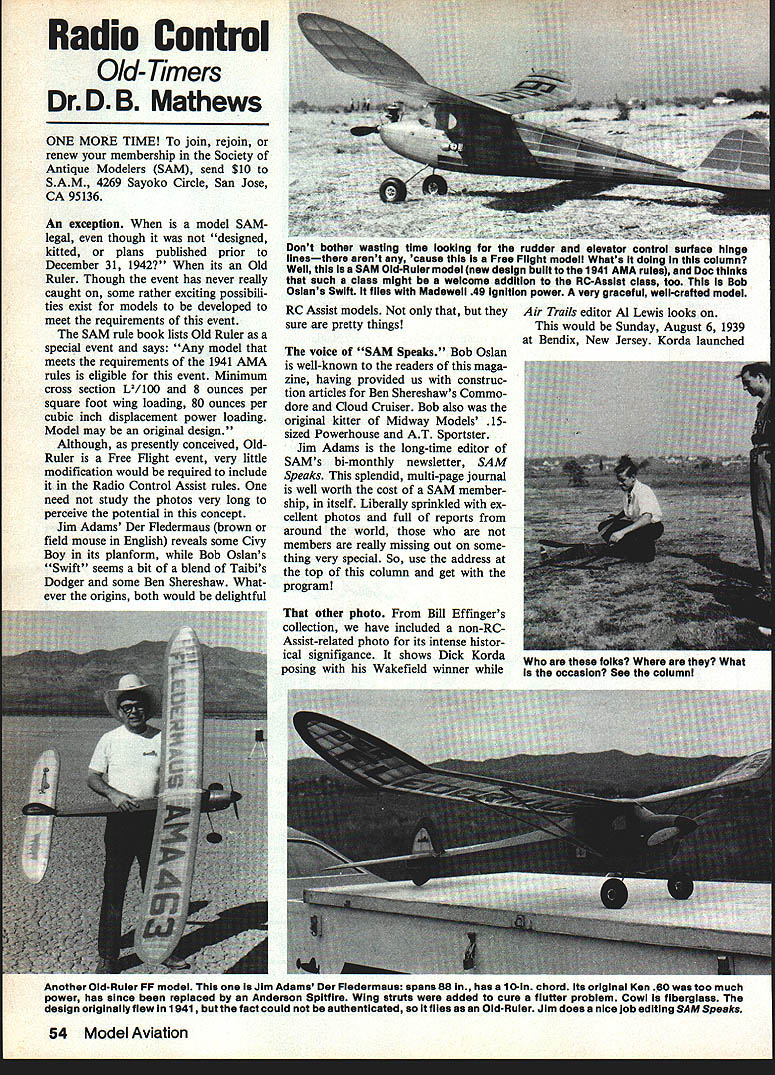 Radio Contml Old- Timers Dr D B Mathews ONE MORE TIME join rejoin renew membership Society Antique Modelers SAM send $10 SAM 4269 Sayoko Circle San Jose CA 95136 An exception model SAMlegal though designed kitted pians published prior December 31 1942 its Old Ruler Though event has never really caught some rather exciting possibili ties exist models developed meet requirements event SAM rule book lists Old Ruler special event says Any model meets requirements 1941 AMA rules eligible event Minimum cross section L2/l00 8 ounces per square foot wing loading 80 ounces per cubic inch displacement power loading Model may original design Although presently conceived OldRuler Free Flight event very little modification would required include Radio Control Assist rules need study photos very long perceive potential concept Jim Adams Der Fledermaus brown field mouse English reveals some Civy Boy its planform Bob Oslans Swift seems bit blend Taibis Dodger some Ben Shereshaw What ever origins both would delightful RC Assist models sure pretty things voice SAM Speaks Bob Oslan well-known readers maga zine having provided us construc tion articles Ben Shereshaws Commo dore Cloud Cruiser Bob also original kitter Midway Models 15sized Powerhouse AT Sportster Jim Adams long-time editor SAMs bi-monthly newsletter SAM Speaks splendid multi-page journal well worth cost SAM member ship itself Liberally sprinkled ex cellent photos full reports around world members really missing out some thing very special So use address top column get program other photo Bill Effingers collection have included non-RC Assist-related photo its intense histor ical signifigance shows Dick Korda posing Wakefield winner Air Trails editor Al Lewis looks would Sunday August 6 1939 Bendix New Jersey Korda launched 54 Model Aviation Dont bother wasting time looKing Tor tne ruaaer ma elevator control surtace hinge linesthere arent cause Free Flight model Whats doing column Well SAM Old-Ruler model new design built 1941 AMA rules Doc thinks such class might weicome addition RC-Assist class too Bob Oslans Swift flies Madeweli 49 Ignition power very graceful well-crafted model folks What occasion See column Another Old-Ruler FF model Jim Adams Der Fledermaus spans 88 has 1 0-In chord Its original Ken 60 too much power has since replaced Anderson Spitfire Wing struts added cure flutter problem Cowl fiberglass design originally flew 1941 fact could authenticated solt flies Old-Ruler Jim does nice job editing SAM Speaks model darndest ther mals modeling history model floated 43 minutes 29 seconds yet landed site Incidentally Ben dix family allowed use company golf course international event Kresge Department Stores provided equipment US Army sent men time Bernarr Macfadden financed event Kordas first flight enough FOX INTRODUCES THE NEW COMPACT 110 RC WEIGHT9 oz Bore840 Stroke715 RPM 10-6 prop13000 Youre wondering offering new 40 existing 4OBB powerful rugged 40 market Well unfortunately massive construction 4OBB makes too large fit planes calling 40s answer new Compact 40 gives outstanding performance Fox lighter compact frame model interchangeable K&B OS HB Enya performs excellently no-nitro fuel superb idle transition recommend new Compact 40 size weight factors larger frame 4088 super-durability desired November1984 55 0 Karl Splelmaker has Aero Champ kits saleand soon Megow 199 engIne Unfortunately Items now cost lots morel 1940 MAN ad prices assure him victory flew two officials accommodate photo graphers flight electrified hobby set off new wave interest models modeling Megow com pany advertised kit Kordas model November 1939 issue Model Airplane News AMA Nationalswinning Cessna Airmaster featured construction article well Interestingly January 1940 issue MAN contains ads Megow ver Continued page 155 Want REV UP Props Average laventery 4DDD Prep! Over 50 Sizes Fe AU Events Now About Custon Tuned Engines Ceinba1 Racing Free Flight S Sped Cenipetitien Accessories S Parts Pp/en Racing Pattern S Sport FA S V/C. Rage lnveaterv! Specialists Caste Ces ZD S Reed Engines Stat S RC Custens Parts Fer Ces Engines Cemplete Inventery Di mdi v/dual Stech Parts Fer Current 1D S Atedallien Engines New Parts Fer Discontinued Ce Engines Repiic Orwwk 23 29 0 Engines Ignition Engine Accesseries Visa S MasterCard Welceme Fer Detailed Irechare Send 75V te Nusten Kraitsnansh4 PD lox 2EDD Lagaina Nil/s CA p2654 Ph 714130-5162 24099 Compact 40 RC$5995 90236 Tilt-Up Muffler1495 90237 TiItDown Muffler1495 F 0 X MANUFACTURING CO 5305 TOWSON AVEFORT SMITH ARK 72901 Hot tins 5011 SU-1656 E E LA5 sCALE TZER ENTERPRISES PO BOX 834 HILLSBORO 7123 3 SHEETS Q C J 90L 76 Wflgspafl W ngSpafl PRICEr 4 SHEETS___ OUADRA Poweredy 3 ft Sft 3500 PP0Liizzz P ---L HOG AHALF PLANSCOMPLETE WING SHOWNN 8x12 COLOR PHOTO HOG1984 FEATURE MATERIAL LISTSFiberglaes Cowl & AccessoryCalalog COCKPIT & MARKING DETAILPak Available Soon $110 E INCLUDES MAILING TUBE ADO $ 400 FOR AIRMAIL FOREIGN OVERSEAS ORDERS ADD $ 1600 F PRICE B 3995 PPO 60- 90 RC Old-TimerslMathews Continued page 55 sion another Burd Scientific Models ad Victory Gold Star Later MAN offered free Korda Wake kit subscription renewals Did ya ever. break nylon wing bolt off flush block use warmed screwdriver tip melt slot tired loose pieces stuff rolling around inside tool box stick magnetic cabinet latch wall catch . use acetone clean gunk off MonoKote iron shoe tongue-depressor blades drug store mix epoxy stuff ya havent tried ideas should Color documentation Old-Timers George Wagner editor newsletter San Diego Aeroneers recently pages several occasions recently have asked about color scheme Joe Weathers Mystery Man Seems like old magazines didnt have color photos dear old days impossible determine original colors models unless specified Joe being patriarch Aero neers given call other night missing data Very simple said Joe colors red white blue chord simply divided thirds leading edge red trailing edge blue fuselage got same tr