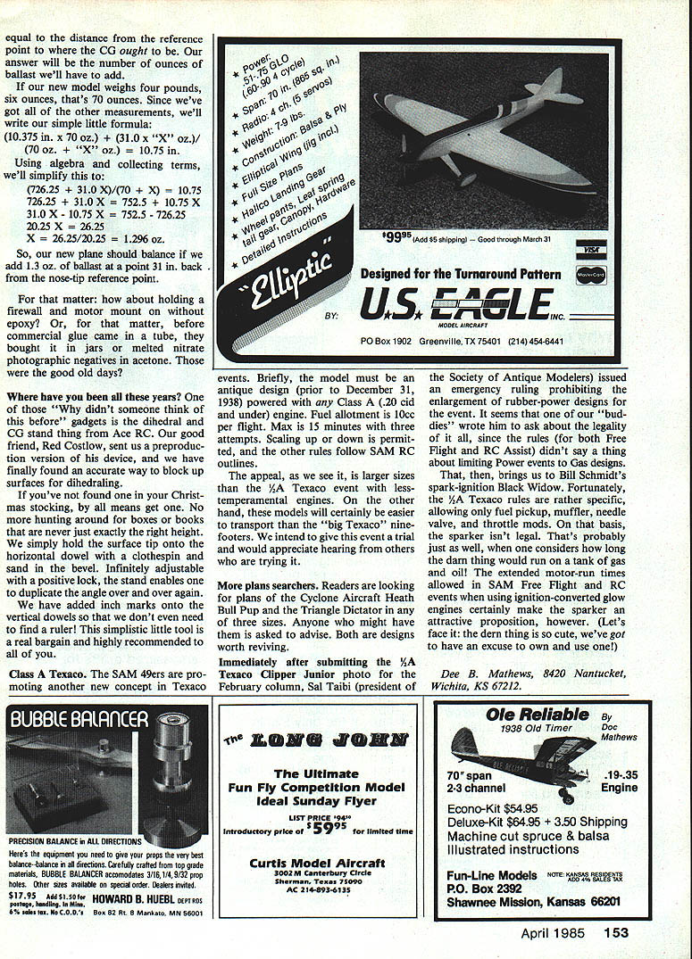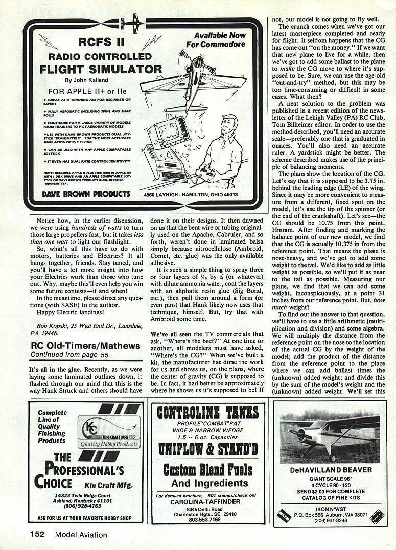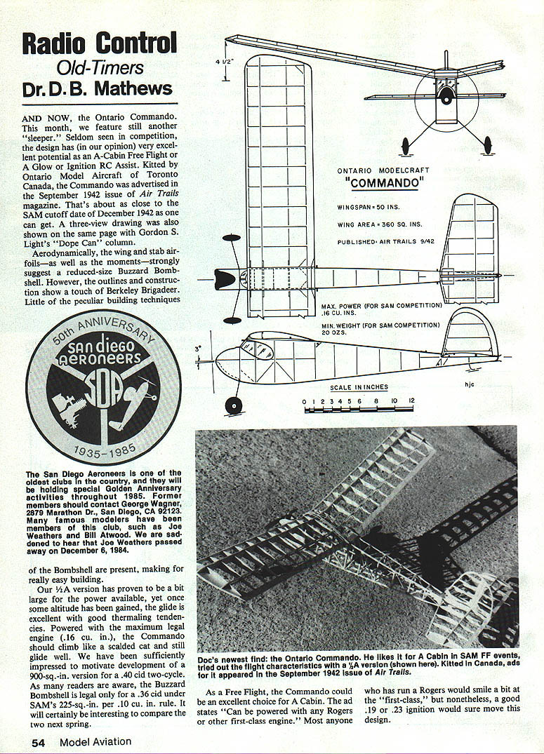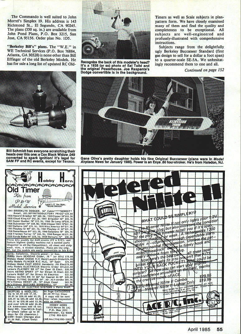 Radio Control Old-Timers DrDB Mathews AND NOW Ontario Commando month feature still another sleeper Seldom seen competition design has opinion very excel lent potential A-Cabin Free Flight Glow Ignition RC Assist Kitted Ontario Model Aircraft Toronto Canada Commando advertised September 1942 issue Air Trails magazine Thats about close SAM cutoff date December 1942 can get three-view drawing also shown same page Gordon S Lights Dope Can column Aerodynamically wing stab air foilsas well momentsstrongly suggest reduced-size Buzzard Bomb shell However outlines construc tion show touch Berkeley Brigadeer Little peculiar building techniques 351 San Diego Aeroneers aidest clubs country will holding special Golden Anniversary activIties throughout 1985 Former members shouid contact George Wagner 2879 Marathon Dr San Diego CA 92128 famous modeicre have members club such Joe Weathers Bill Atwood sad dened hear Joe Weathers passed away December 6 1984 Bombshell present making really easy building /2A version has proven bit large power available yet once some altitude has gained glide excellent good thermaling tenden cies Powered maximum legal engine 16 cu Commando should climb like scalded cat still glide well have sufficiently impressed motivate development 900-sq-in version 40 cid two-cycle As readers aware Buzzard Bombshell legal 36 cid under SAMs 225-sq-in per 10 cu rule will certainly interesting compare two next spring L L L L K 7 fl ONTARIO MODELCRAFT I 'COMMANDO' WINGSPAN5O INS WING AREA SQ INS IPUBLISHED AIR TRAILS 9/42 r --i-IJ MAX POWER FOR SAM cOMPETITION 012345681012 As Free Flight Commando could excellent choice Cabin ad states Can powered Rogers other first-class engine Most anyone has run Rogers would smile bit first-class nonetheless good 19 23 ignition would sure move design 54 Model Aviation Docs newest find Ontario Commando likes tar Uabin SAM FF events tried out flight characteristics version shown Kitted Canada ads appeared September 1942 issue Air Trails Commando well suited John Morrels Simplex 19 address 143 Richmond St El Segundo CA 90245 plans 350 sq available John Pond Plans PO Box 3215 San Jose CA 95156 Order plan No 1D5 Berkeley Bills plans WE WE Technical Services PO Box 76884 Atlanta GA 30328 other Bill Effinger old Berkeley Models has sale long list updated RC OldTimers well Scale subjects planpattern form have closely examined find quality completeness exceptional subjects well-engineered profusely-illustrated comprehensive instructions Subjects range delightfully ugly Berkeley Buccaneer Standard first gas design sell dollar foot span quarter-scale SE-SA unhesitat ingly recommend Continued page 152 HObbY Horn Old Timer /tom 1/ LaaZss 9 GAS MODEL Jl4odzL L7Ar1aL 9EC000 IREASE5 1941 BROOKLYN DODGER 56 Cabin""NEWEST5 Retail S5295**INTRODUCTORY PRICES39O0 1938 Record Breaker 96 $6956 lO3GZipper 54$5356 1938 Kloud King 63 $4236 1941 Brigidier 56 $4076 1 941 Super Quake- 78 $72 76 1946 So Long 50$30 36 1936 Buccaneer 04 $5996 1938 Clipper MKI 72$4156 1937 Dallaire 100 $7516 1935 Miss America 84 $7196 1941 Playboy Sr 80 $5116 1941 Playboy Jr 54 $3116 1938 Powerhouse 84 $53 56 1940 Sailplane 78 $8476 1938 Trenton Terror 72 $4076 1940 Ranger 46$3196 1939 Korda Wake 44 $1916 1939 Mercury 72 6 kits qualify SAM events FF & RIG feature highest quality machine cut & sanded parts Superior Competition sheet strip mood wire & window motorist Plans orig FF models easily convertible 3ch R IC KITS Sailplanes Electric power Gas Hobby Horn SENSOAR Glider 78 $1800 Midway Model GNOME R/G Hand Launch Glider$2400 Jolly Models PLINGER R/G HLG 50 Span $2400 Midway Model PAST EDDIE Aerobatic /05 Elec$1900 Jolly Models ELECTRICUS Electric Glider 05s$325O Leisure PLAYBOY SR 67 Gear 05 Elect $3000 Astro ASTRO SPORT 37 Direct 05 Elect $2210 Leisure WASP 37 Direct 05 Electrics $2250 Midway ULTRA MK IV 86 Geared 04 EP $3900 Midway PLYING QUAKER 04 40-454 stroke $6476 4ks/Midway DENNY JR 72 Alum Comel $6396 4ks/Midway BUZZARD BOMBSHELL 72$5196 PULL LINE OP ELECTRIC SYSTEMS 0 Parts Avail SHIPPING 8 HANDLING 64 Page CATALOGUE Up $000 add $150 $200 PP/tot Class $801 $2000 add $225 copy will sent $2001 $4500 add $300 free-when requested$4501 $7000 add $350 order over $7000 add $406 HOBBY HORN CA Addressees add 6% tax 15173 Moran St [Al Send MO Visa/MCI#sExp PO Box 2212 Check allow up 00 30 Westminster Ca 92604 days CK clearance 7141 8938311 COD Exact Charges plus $150 Hdl Cash Only [Aft Hrs 714095120311 WP 5- 7~ sorfl te n ~je dab 9S~e L2LjrnIY 1O aflC j~esS0 jg apa 7IrT8 eaSter 00rdb bWe3ACK~ irtl or ean I. fl JACI1NH] cr0 [V1 .jNI1 ite Cc nbC$9l P OO 7/ rii 4650~ Eu U 8 M rk8 md$2DEO DO4 April 1985 55 eoognize tfl5 back 0 modelers head its 1938 photo Sal Talbi original Powerhouse Joe Raspantes Dodge convertible background Bill Schmidt has everyone scratching heads over Ccx Black Widow 048 convened spark ignitionl Its legal SAM FF RC events except Texaco Gene Olivas pretty daughter holds fine Original Duccaneer plans Model Airplane News January 1980 Power Enys 60 fourstroker Hes Haledon NJ NIi JnO RCFS II RADIO CONTROLLED FLIGHT SIMULATOR John Kallend FOR APPLE 11 lie GREAT AS TRAINING AID FOR BEGINNER OR -PPm PIAJY AEROBATIC INCLUDING SPINS AND SNAP ROUS CONFIGURE FOR LARGE VARIETY OF MODELS FROM TRAINERS TO HOT AERORATIC MODELS USE WITH DAVE BROWN PRODUCTS DUAL JOY STICK TRANSMrITEW FOR THE MOST ACCURATE SIMULATION OF R/C PLYING CAN BE USED WITH ANY APPLE COMPATABLE JOYSTICK IT EVEN HAS DUAL RATE CONTROL SENSmVITY NOSE BEGUIREI APPLE II PUll 48K sInI E II WITH BIlE DRIVE AND AR APPLE COMPATARLE JOY 551CR OR DAVE BROWN PRODUCIS DUAl JOYSTICIC TEANIMmEB DAVE BROWN PRODUCTS Notice earlier discussion using hundreds watts turn large propellers fast takes less watt light flashlight So whats have motors batteries Electrics hangs together friends Stay tuned youll have lot insight Electrics work tune out maybe thisll help win some future contestsif meantime please direct ques tions SASE author Happy Electric la