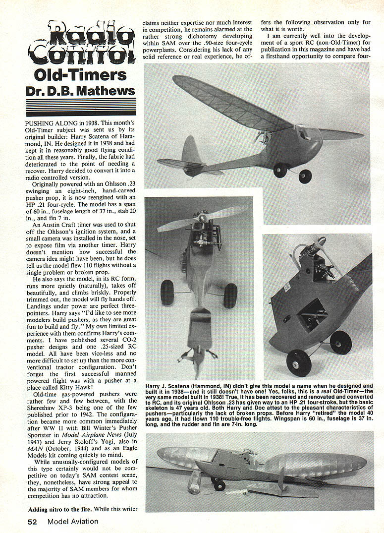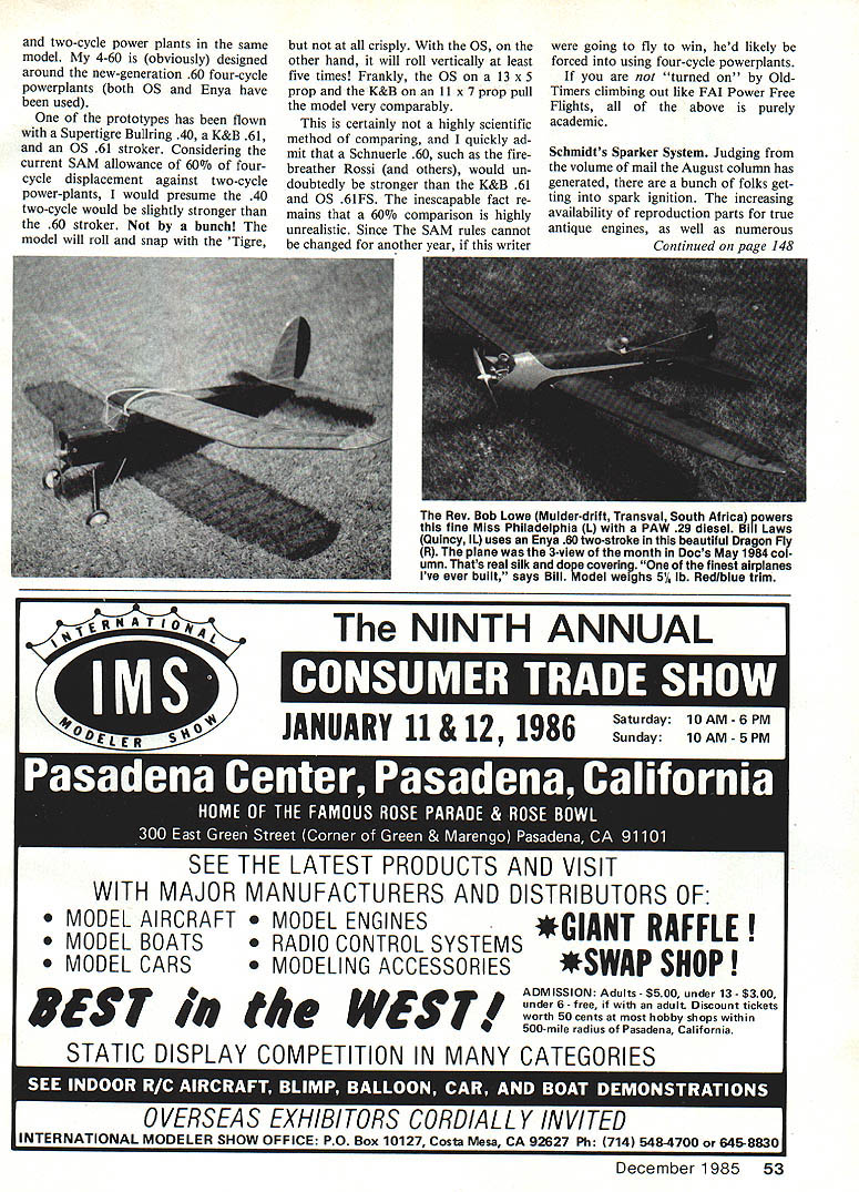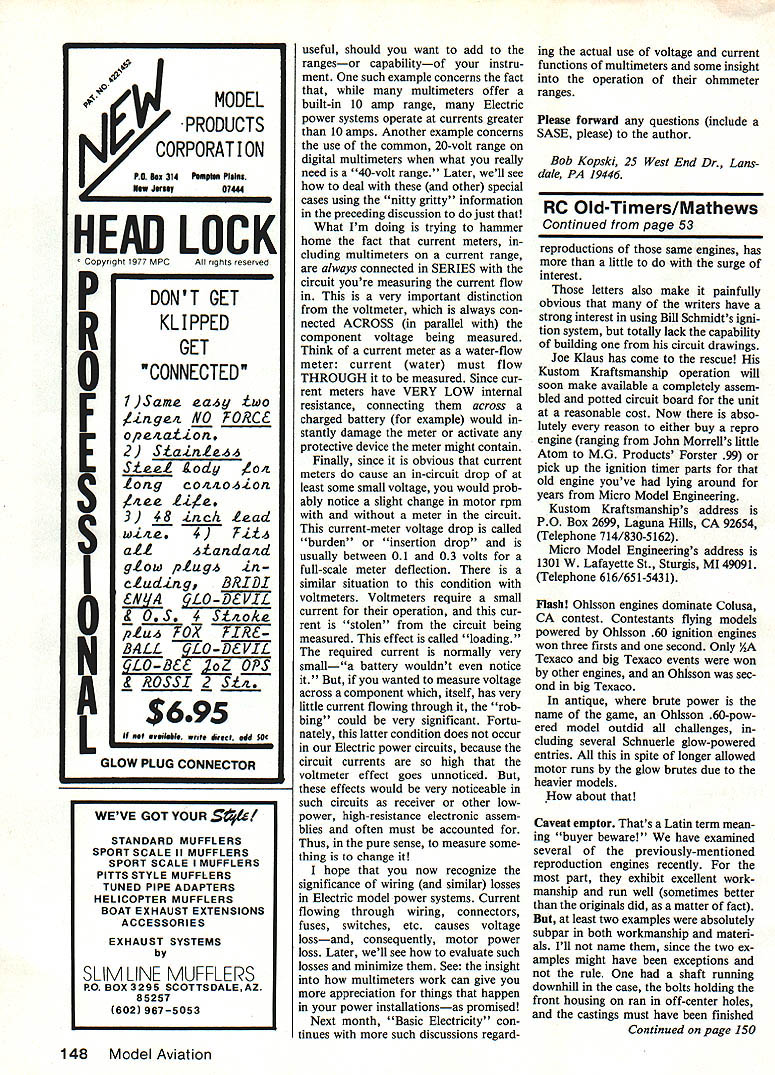 claims neither expertise nor much interest competition remains alarmed rather strong dichotomy developing within SAM over 90-size four-cycle powerplants Considering lack solid reference real experience ofOld-Timers Dr DB Mathews PUSHING ALONG 1938 months Old-Timer subject sent us its original builder Harry Scatena Ham mond IN designed 1938 kept reasonably good flying condi tion years Finally fabric deteriorated point needing recover Harry decided convert radio controlled version Originally powered Ohisson 23 swinging eight-inch hand-carved pusher prop now reengined HP 21 four-cycle model has span 60 fuselage length 37 stab 20 fin 7 An Austin Craft timer used shut off Ohlssons ignition system small camera installed nose set expose film via another timer Harry doesnt mention successful camera idea might have does tell us model flew 110 flights single problem broken prop also says model its RC form runs quietly naturally takes off beautifully climbs briskly Properly trimmed out model will fly hands off Landings under power perfect threepointers Harry says Id like see modelers build pushers great fun build fly own limited ex perience confirms Harrys com ments have published several CO-2 pusher designs 25-sized RC model have vice-less no difficult set up con ventional tractor configuration Dont forget first successful manned powered flight pusher place called Kitty Hawk Old-time gas-powered pushers rather few few between Shereshaw XP-3 being few published prior 1942 configura tion became common immediately after WW II Bill Winters Pusher Sportster Model Airplane News July 1947 Jerry Stoloffs Yogi also MAN October 1944 Eagle Models kit coming quickly mind unusually-configured models type certainly would com petitive todays SAM contest scene nonetheless have strong appeal majority SAM members competition has no attraction Adding nitro fire writer fers following observation what worth am currently well develop ment sport RC non-Old-Timer publication magazine have firsthand opportunity compare four52 Model Aviation Harry J Scatena Hammond IN didnt give model name designed built 1938and still doesnt have Yes folks real Old-Timerthe very same model built 1938 True has recovered renovated converted RC Its original Ohlsson 23 has given way HP 21 four-stroke basic skeleton 47 years old Both Harry Doc attest pleasant characteristics pushersparticularly iack broken props Before Harry retired model 40 ears go flown 110 trouble-free flights Wingspan 60 fuselage 37 ong rudder fin 7-in long two-cycle power plants same model 4-60 obviously designed around new-generation 60 four-cycle powerplants both OS Enya have used prototypes has flown Supertigre Bullring 40 K&B 61 05 61 stroker Considering current SAM allowance 60% fourcycle displacement against two-cycle power-plants would presume 40 two-cycle would slightly stronger 60 stroker bunch model will roll snap Tigre crisply OS other hand will roll vertically least five times Frankly OS 13 x 5 prop K&B 11 x 7 prop pull model very comparably certainly highly scientific method comparing quickly ad mit Schnuerle 60 such firebreather Rossi others would un doubtedly stronger K&B 61 OS 61F5 inescapable fact re mains 60% comparison highly unrealistic Since SAM rules cannot changed another year writer going fly win hed likely forced using four-cycle powerplants turned OldTimers climbing out like FAI Power Free Flights above purely academic Schmidts Sparker System Judging volume mail August column has generated bunch folks get ting spark ignition increasing availability reproduction parts true antique engines well numerous Continued pare 148 NINTH ANNUAL RIIJ f1 I] 1 1 JANUARY 11 & 12 1986 PEST WEST ADMISSION Adults -$500 under 13- $300 under 6 free adult Discount tickets worth 50 cents hobby shops within 500-mile radius Pasadena California __ STATIC DISPLAY COMPETITION IN MANY CATEGORIES 1 lisimi LSUi ]Uj p lek ~1kl Ui] LA [S1I1 II [S]IU December 1985 53 Rev Bob Lowe Mulderdrift Transval South Africa powers line Miss Philadelphia L PAW 29 diesel Bill Laws Quincy IL uses Enya 60 twostroke beautiful Dragon Fly R plane 3view month Docs May 1984 col umn Thats real silk dope covering finest airplanes Ive ever built says Bill Mo del weighs 51/4 lb Redlblue trim Saturday 10AM -6 PM Sunday 1OAM-5PM SEE THE LATEST PRODUCTS AND VISII WITH MAJOR MANUFACTURERS AND DISTRIBUTORS OF MODEL AIRCRAFT L ENGINES MODEL BOATS O CONTROL SYSTEMS *GIANT RAFFLE L CARS MODELING ACCESSORIES*SWAP SHOP OVERSEAS EXHIBITORS CORDIALLY IN VI TED INTERNATIONAL MODELER SHOW OFFICE PO Box 10127 Costa Mesa CA 92627 Ph 714 5484700 645-8830 MODEL PRODUCTS 07444 CORPORAT ON PU ha 314 Pmpiu Plains HEAD Copyright 1977 MPG P R 0 F E S S I_____ 0 N L LOCK ghs ese ed DONT GET KLIPPED GET U iSame eau two inga4 NO FORCE o/1L4atLon SL~ Lody 404 tong c04404i0n 4L LL4 3 48 inch ILad -tanda4d glow plug4 cluding BRIDI £NI/A 9LO-DVIL t OS 4 Stto/cL plu6 FOX FIR& BALL TEO-D&VtL 4L0-BLL 2oZ OPS ROSSI 2 SLr $695 IfI veAhI writ 4erce odd SOC useful should want add rangesor capabilityof instru ment such example concerns fact multimeters offer built-in 10 amp range Electric power systems operate currents greater 10 amps Another example concerns use common 20-volt range digital multimeters what really need 40-volt range Later well see deal other special cases using nitty gritty information preceding discussion just What Im doing trying hammer home fact current meters cluding multimeters current range always connected SERIES circuit youre measuring current flow very important distinction voltmeter always con nected ACROSS parallel component voltage being measured Think current meter water-flow meter current water must flow THROUGH measured Since cur rent meters have VERY LOW internal resistance connecting across charged battery example would stantly damage meter activate protective device meter might contain Finally since obvious current meters cause in-circuit drop least some small voltage would prob ably notice slight change 