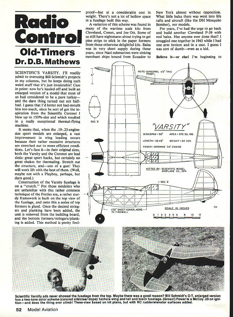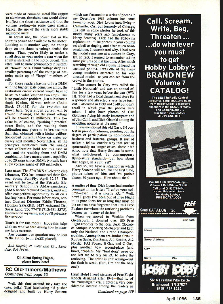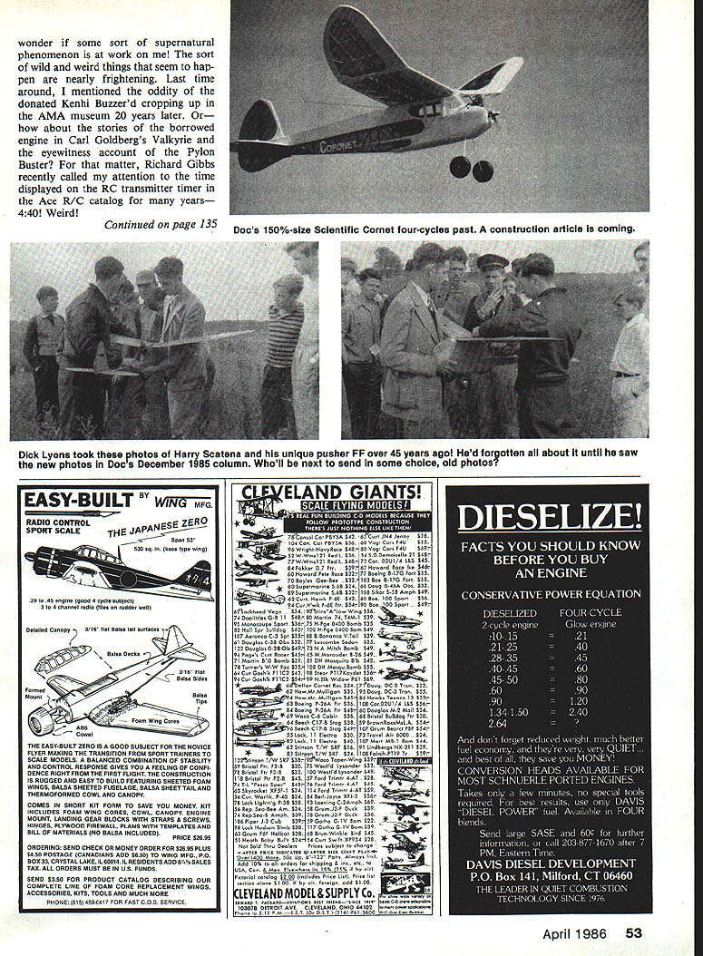 Radio Control Old-Timers Dr DB Mathews SCIENTIFICS VARSITY Ill readily admit overusing Bill Schmidts projects columns keeps doing such weird stuff its just irresistable Case point now hes hauled off built enlarged version model us considered pure turkey darn thing turned out halfbad guess Id better bad-mouth him too much since sort got spiration Scientific Coronet blew up 150%-size resulted really exceptional thermal-flying machine seems 3-enginesize sport models enlarged vast improvement wing loading occurs because rather excessive structures stretched out efficient condi tions Lets face itin original sizes both Varsity Coronet lead sleds great sport hacks certainly no great shakes thermaling Stretch out structure andson gun will work lift best Well maybe Playboy perhaps darn good Construction Varsity fuselage crutch modelers unfamiliar rather common technique Forties era rather stur dy framework built top view fuselage onto series top foriners glued Once desired string ers planking have added unit removed building board bottom formers/stringers/plank ing added method pretty foolproofbut considerable cost weight Theres lot hollow space fuselage built way variation scheme found wartime scale kits Cleveland Comet Joe Ott Some us still have nightmares about trying get pine strips stick paper formers otherwise delightful kits Balsa very short supply during years since Nazi submarines sinking merchant ships bound Ecuador NOTEDIHEORAL 1/2 THIS 1POINT] SECA____ ____ II New York almost opposition What little balsa went life rafts aircraft like DH Mosquito Bomber models years Ive urge go back build another Cleveland P-39 real balsa Has anyone ever done struggled together 1943 arm broken cast guess sort dumbeven kid Believe itor else Im beginning VARSITY WINGSPAN EA 370 50 INS LENGTH33 1/2WEIGHT 22 OZS 0 POWER BROWNIE 29 ENGINE /A KITTED BY SCIENTIFIC MODEL AiRPLANE CO 1941 SEC II2 I1I V L1/52 SHEET COVER HERE-1 TO FIREWALL II I- SCALE IN INCHES 01234568 hIc 1012 Scientific Varsity ads never showed fuselage top Maybe good reason Bill Schmidts 0T enlarged version has twotone color scheme colored slik/clear dope fuchsia wing tail black fuselage Gross Power McCoy 29 igni tionand does thing ever climb Threeview based kit plans RC rudder/elevator surfaces added 52 Model Aviation wonder some sort supernatural phenomenon work sort wild weird things seem hap pen nearly frightening Last time around mentioned oddity donated Kenhi Buzzerd cropping up AMA museum 20 years later about stories borrowed engine Carl Goldbergs Valkyrie eyewitness account Pylon Buster matter Richard Gibbs recently called attention time displayed RC transmitter timer Ace R/C catalog years 440 Weird Continued page 135 Dick Lyons took photos Harry Scatena unique pusher FF over 45 years ago Hed forgotten about until saw new photos Docs December 1985 column Wholl next send some choice old photos EASY-BUILT BY RADIO CONTROLZERO E JAPANESE SPORT SCALETI-I Seen 53 53004 0 kooo ype loing 29 45 engIne good 4 09 0 oob 00 3 4 ohoneel rodlo fIle rodder 011 DeloIled COnoPY 3116 hOt BOICO toil 0110000 r BoIoo Deoko 3/16 FIet Bole Side Formed BOIOO Moon -ripo Foon WIng Cores - ASS____Cowel THE EASY-BUILT ZERO ISA GOOD SUBJECT FOR THE NOVICE FLYER MAKING THE TRANSITION FROM SPORT TRAINERS TO SCALE MODELS BALANCED COMBINATION OF STABILITY AND CONTROL RESPONSE GIVES YOU FEELING OF CONFI DENCE RIGHT FROM THE FIRST FLIGHT THE CONSTRUCTION IS RUGGED AND EASY TO BUILD FEATURING SHEETED FOAM WINGS BALSA SHEETED FUSELAGE BALSA SHEET TAIL AND THERMOFORMED COWL AND CANOPY COMES IN SHORT KIT FORM TO SAVE YOU MONEY KIT INCLUDES FOAM WING CORES COWL CANOPY ENGINE MOUNT LANDING GEAR BLOCKS WITH STRAPS & SCREWS HINGES PLYWOOD FIREWALL PLANS WITH TEMPLATES AND BILL OF MATERIALS NO BALSA INCLUDED PRICE 52695 ORDERING SEND CHECK OR MONEY ORDER FOR $2695 PLUS $450 POSTAGE CANADIANS ADD SOSO TO WING MPG PO B0X33 CRYSTALLAKE1L600I4ILRESIOENTSADDBA%SALES TAO ALL ORDERS MUST BE IN US FUNDS SEND $350 FOR PRODUCT CATALOG DESCRIBING OUR COMPLETE LINE OF FOAM CORE REPLACEMENT WINGS ACCESSORIES KITS TOOLS AND MUCH MORE FHONE 815 4590417 FOR FAST 000 SERVICE April 1986 53 Docs 150%-size Scientific Cornet four-cycles past construction article coming made common metal like copper aluminum shunt heat would direct ly affect shunt resistance thus voltage readingin some cases grossly Hence use vastly stable nichrome metal actual use power lost shunt power avallable motor Looking another way voltage drop shunt voltage denied motor Thus youre likely notice small drop motors rpm shunt installed motor circuit effect will pronounced systems fewer cells Shunt voltage drop smaller percentage voltage bat teries made up large numbers cells readers having DMM highest scale being two amps calibration circuit current would have set value less two amps no particular problem just substitute single 10-ohm 10-watt resistor Radio Shack 271-132 two-ohm set shown circuit current will around 12 amps shunt voltage will around 12 millivolts low value course pushing practical meter limits resulting shunt calibration may prove less accurate obtained higher calibra tion-circuit current meter ac curacy next month Nevertheless principles mentioned analog meter calibration hold case well resulting shunt DMM combination have measurement capability up 20 amps since DMMs typically have low voltage range 200 millivolts Late news SPARKS all-electric club Houston TX has announced Sec ond Spring Fun-Fly April 12-13 event will held Petrosky Ele mentary School its AMA-sanctioned AMA license required enter will offer competitive opportunity low-key basis information con tact Contest Director Eddie Thomas Houston SPARKS 1427 Ashwood Dr Sugar Land TX 77478 713/491-3375 Just mention name youll get extrafine service Thats month Hope helps whove asking meas ure large currents Any comment question may sent author SASE please Bob Kopski 25 West End Dr Lans dale PA 19446 Oh Silent Spring Flights please hurry RC Old-Timers/Mathe