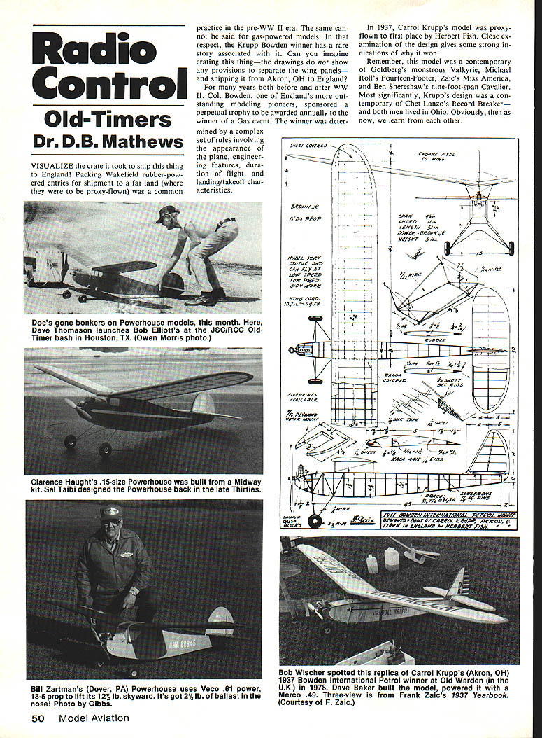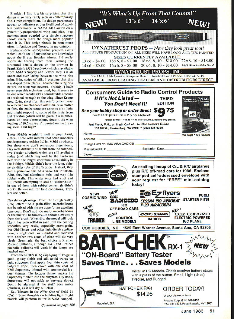 Radio Control Old-Timers Dr DB Mathews VISUALIZE Crate took ship thing England Packing Wakefield rubber-pow ered entries shipment far land proxy-flown common practice pre-WW II era same can said gas-powered models respect Krupp Bowden winner has rare story associated Can imagine crating thingthe drawings show provisions separate wing panels shipping Akron OH England years both before after WW II Col Bowden Englands Out standing modeling pioneers sponsored perpetual trophy awarded annually winner Gas event winner determined complex set rules involving appearance plane engineer ing features dura tion flight landing/takeoff char acteristics 1937 Carrol Krupps model proxyflown first place Herbert Fish Close ex amination design gives some strong dications won Remember model contemporary Goldbergs monstrous Valkyrie Michael Rolls Fourteen-Footer Zaics Miss America Ben Shereshaws nine-foot-span Cavalier Most significantly Krupps design con temporary Chet Lanzos Record Breaker both men lived Ohio Obviously now learn other &r covoeto CA44NC AOfD 7 - - - 1 3eow4he - - LNA67A 5/, Bea jf wg6#r S ~15 #OAL iN- AVO7 CAn LyArhqRn petZ 5/ON AR WIA6 104 IO7SffF--7 4zZZILZzZ _________ -IBAlSAN COV*DSWO6T MT eOo -I 3LaeeeSrS 4r4L4aL 22-7 NOYIR ~F 4j jq7 j/ 4r4j -Z4CA VZ -j e/8S fre45 7 fN/ fy4 / 44 PrAOL MWAff I&Y4wlaI4u 17 CW~ ea AeeOA4 0 jdwV iN EAEIAND 4. *2EjE*T /3h 50 Model Aviation Docs gone bonkers Powerhouse models month Dave Thomason launches Bob Elliotts JSCIRCC Old Timer bash Houston TX Owen Morris photo Clarence Haughts 15-size Powerhouse built Midway kit Sal Taibi designed Powerhouse back late Thirties Bill Zartmans Dover PA Powerhouse uses Veco 61 power 135 prop lift its 12% lb skyward Its got 21/2 lb ballast nose Photo Gibbs 5ob Wischer spotted replica Carrol Krupps Akron OH 1937 Bowden International Petrol winner Old Warden UK 1978 Dave Baker built model powered Merco 49 Three-view Frank Zaics 1937 Yearbook Courtesy F Zaic Frankly find bit surprising design very rarely seen contemporary Old-Timer competition Its design parameters appear indicate strong likelihood excel lent performance NACA 4412 airfoil generously-proportioned wing nice long moment arms coupled simple structure should surely make design popular design should seen often Antique Texaco opinion Perhaps some aerodynamic problem exists cant see anyone has knowledge about Krupp Bowden winner Id really appreciate hearing Among structural details shown drawing Frank Zaics 1938 Yearbook available AMAs Supply Service Dept under-and-over lacing between wing ribs using A-in strips silk presume doped places touched wing ribs before wing covered Frankly have never seen technique used seems would add considerable amount torsional strength wing Since Krupp used A-in sheet ribs reinforcement may have much-needed addition As matter fact entire structure appears bit light might respond some hints Eut Tileston will given minute Based observations doesnt wing loading 107 oz/sq ft quoted draw ing seem bit high M&Ms wouldnt melt hand either note interest some modelers desperately seeking 3A-in M&M airwheels dont remember items distinctly different competi tive Trexler airwheels still available today may well hardware item longest continuous-availability hobby M&Ms didnt have long skin ny air-filler tube Trexlers Instead primitive sort valve inflation Also aluminum hubs very thin rubber walls writer once set still recalls attempting seal sticker-hole rubber cement didnt work Believe field conditions Trex lers better Newsletter gleanings Lehigh Valley PA letter As grain-filler microballoons can mixed nitrate dope excellent base coat Dont add too microballoons mix will too dryit should flow easily brush dry model will look like has rolled sand coating smoothes very easily especially cross-grain Old-Timers other light-finish applica tions single coat well-sanded followed another two coats clear will very nicely Seemingly best choice Prather Miracle Balloons although K&B Prather phenolic balloons will work lumps mashed out SCIFs CA Flightplug get good glossy finish still avoid warps light structure first apply four thin coats butyrate dope cover coat K&B Superpoxy thinned commercial lac quer thinner lacquer thinner makes Superpoxy bite butyrate itself Superpoxy will stick butyrate dope Dont alarmed stuff goes milky blushes will dry out clear Eut Tileston Nifty SAM 51 CA Some thoughts building light Light models will perform better SAM competi Continued page 150 2541 NE 11th Court ano Beach Florida 33062 e 3051 941-9119 AVAILABLE FROM LEADING DEALERS AND DISTRUBUTORS DIRECT NEW COSMIC WIND An exciting lineup CIL & RIC airplanes plus RIC off-road cars 1986 Enclose stamped self-addressed envelope request FREE mini-catalog today EZ flyers FUEL cox 3AHDO CESSNA 150 AEROBAT STARTER KITS RIC P-39 AIRACOBRA OFFROAD CARS O/ SAN WA CONTROLRADIOS TRAIlER LINE MODELS cox carxirzio ELECTRIC POWERED RIC PLANE COX HOBBIES INC 1525 East Warner Avenue Santa Ana CA 92705 ATT- CHEKRX NEW ON-Board Battery Tester Saves Time. Saves Models Install RC Models Check receiver battery status press button Small Light /2 oz Precise Rugged BA1TCHEK RX-1ORDER TODAY $1495at dealer Protune Corp 914 462-6452 ade LISAPO Box 1808 Poughkeepsie NY 12601 June1986 51 DYNATHRUST PROPS look great too! ALL FUTURE PRODUCTION ON ALL SIZES WILL HAVE LOGO AND TIPS PAINTED SIZES CURRENTLY AVAILABLE 13x6 $400 15x6 8 $700 18x6 810 0 22x8 10 0 14x6 16x6 8 $800 20x6 8 10 0 AddISzesAvailableSoon Consumers Guide Radio Control Products Its Listed THIRD Dont Need ItEDITION See hobby shop order direct $075 Price $795 plus $180 UPS total ign air mail $1345 $795 pi s $550 u dol s please Send Check MO Credit Card info Consumers Guide 150 Ott St Harrisonburg VA 22801 4340350 Name Address Charge Card No MC VISA CHOICEI MasterCard lB # ______________________ Expiration Date ___________________________ $innod from 5 FOUR CYCLE ENGINE MOUNT Cast atunwtum alloy Graund 9#sssst Mn Esight polish NrIstaed Socket cop screw