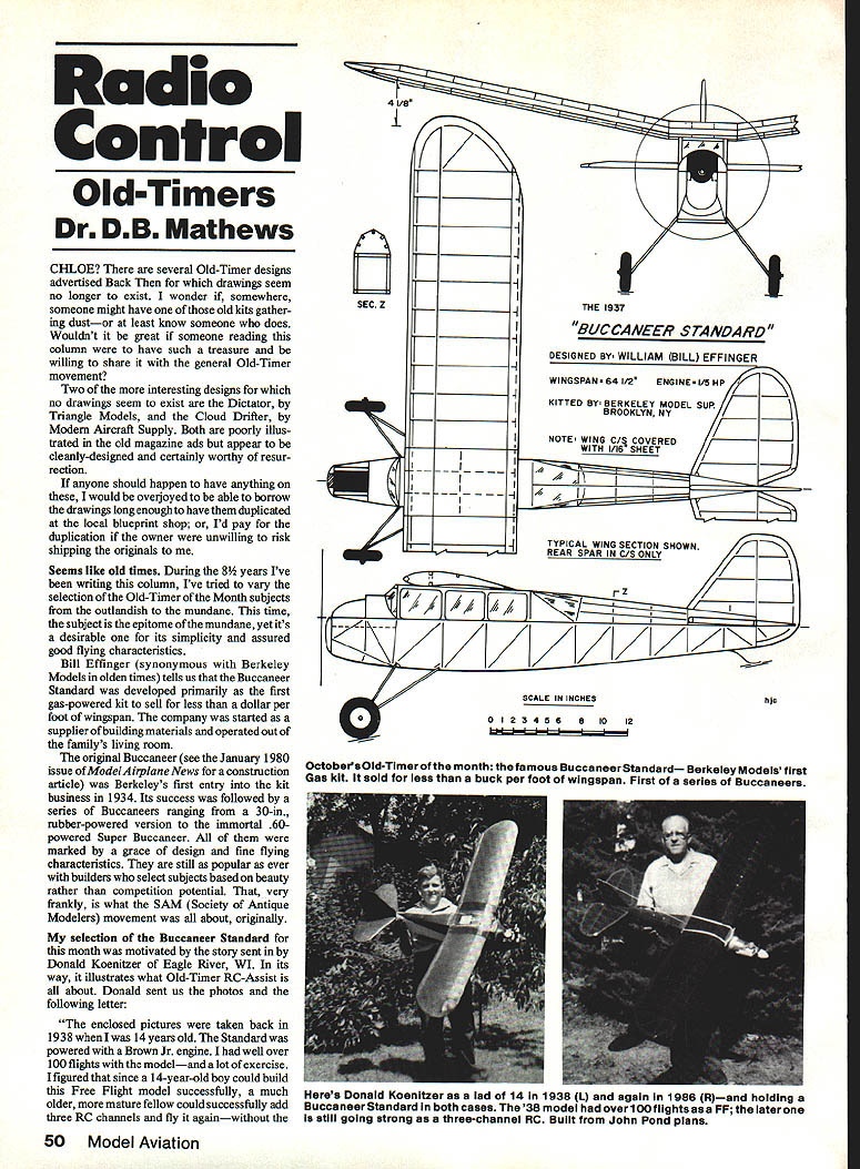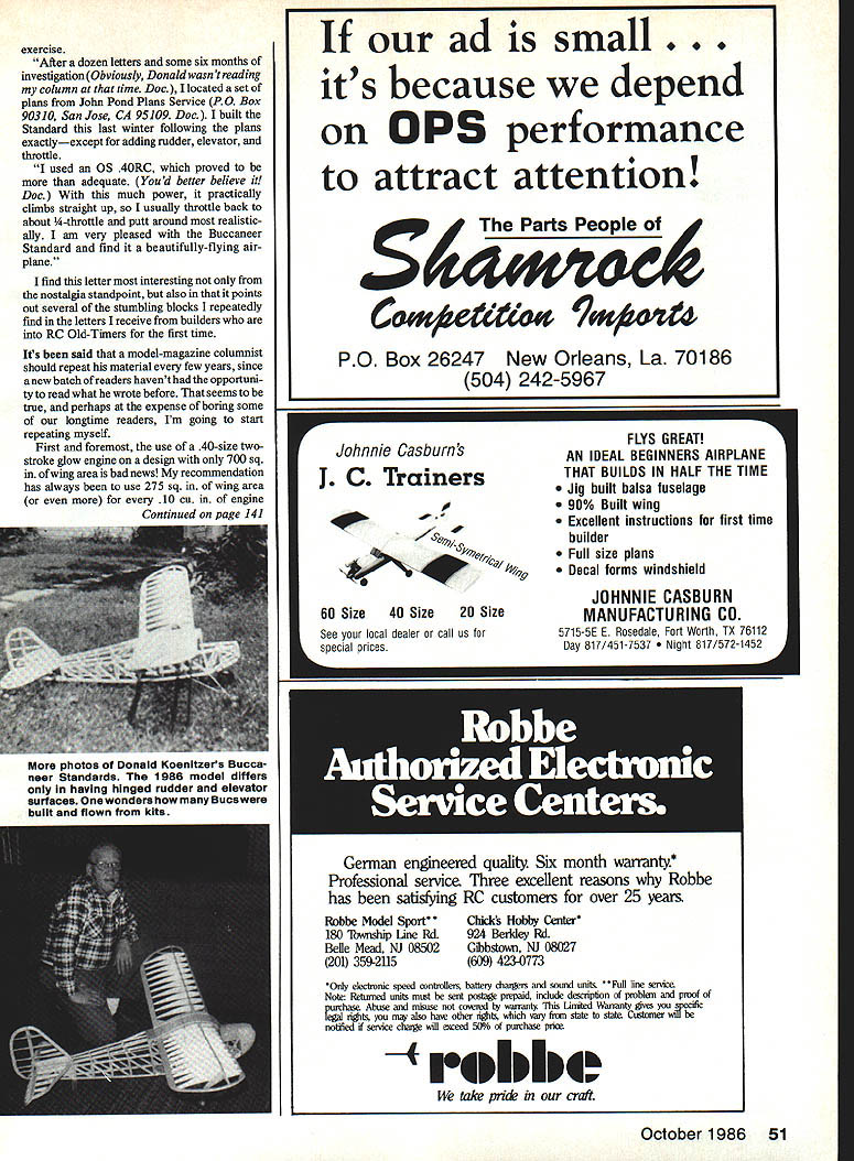 Radio Control Old-Timers Dr DB Mathews CHLOE several Old-Timer designs advertised Back drawings seem no longer exist wonder somewhere someone might have old kits gather ing dustor least know someone does Wouldnt great someone reading column have such treasure willing share general Old-Timer movement Two interesting designs no drawings seem exist Dictator Triangle Models Cloud Drifter Modem Aircraft Supply Both poorly illus trated old magazine ads appear cleanly-designed certainly worthy resur rection anyone should happen have anything would overjoyed able borrow drawings long enough have duplicated local blueprint shop Id pay duplication owner unwilling risk shipping originals Seems like old times During SW years Ive writing column Ive tried vary selection Old-Timer Month subjects outlandish mundane time subject epitome mundane yet its desirable its simplicity assured good flying characteristics Bill Effinger synonymous Berkeley Models olden times tells us Buccaneer Standard developed primarily first gas-powered kit sell less dollar per foot wingspan company started supplier building materials operated out familys living room original Buccaneer see January 1980 issue ModelAirplane Ne ws construction article Berkeleys first entry kit business 1934 Its success followed series Buccaneers ranging 30-in rubber-powered version immortal 60powered Super Buccaneer marked grace design fine flying characteristics still popular ever builders select subjects based beauty rather competition potential very frankly what SAM Society Antique Modelers movement about originally selection Buccaneer Standard month motivated story sent Donald Koenitzer Eagle River WI its way illustrates what Old-Timer RC-Assist about Donald sent us photos following letter enclosed pictures taken back 1938 14 years old Standardwas powered Brown Jr engine well over 100 flights modeland lot exercise Ifiguredthat since 14-year-old boy could build Free Flight model successfully much older mature fellow could successfully add three RC channels fly againwithout 4 I/B 1 E 193 SEC Z -4 -l -4 4 1 -I -I -t BUCCANEER STANDARD DESIGNED BY WILLIAM BILL EFFINGER WINGSPAN64 1/2ENGINEI/SHP IL KITTED BY BERKELEY MODEL SUP 2 BROOKLYN NY NOTE WING C/ COVERED WITH 1/16 SHEET VITYPIC AL WING SECTION SHOWNjjj ~------.SPAR IN C/S ONLY ////4~/_____I /xflAA 7/271 Iijc 1\MAA SCALE IN INCHES 01234558 1012 w 50 Model Aviation Octobees Old-Timerof month famous BuccaneerStandard Berkeley Models first Gas kit sold less buck per foot wingspan First series Buccaneers Heres Donald Koenltieras lad 14 1938 L again 1986Rand holding Buccaneer Standard both cases 38 model over 100 flIghts FF iaterone still going strong three-channel RC Bulit John Pond plans exercise After dozen letters some six months investigation Obviously Donald wasnt reading column time Doc located set plans John Pond Plans Service PO Box 90310 San Jose CA 95109 Doc built Standard last winter following plans exactlyexcept adding rudder elevator throttle used OS 40RC proved adequate Youd better believe Doe much power practically climbs straight up usually throttle back about -throttle putt around realistic ally am very pleased Buccaneer Standard find beautifully-flying air plane find letter interesting nostalgia standpoint also points out several stumbling blocks repeatedly find letters receive builders RC Old-Timers first time Its said model-magazine columnist should repeat material few years since anew batch readers havent opportuni ty read what wrote before seems true perhaps expense boring some longtime readers Im going start repeating myself First foremost use 40-size twostroke giow engine design 700 sq wing area bad news recommendation has always use 275 sq wing area 10 cu engine Continued Daae 141 r Johnnie Casburns J C Trainers 4/2, 60 Size40 Size20 Size See local dealer call us special prices FLYS GREAT IDEAL BEGINNERS AIRPLANE THAT BUILDS IN HALF THE TIME Jig built balsa fuselage 90% Built wing Excellent instructions first time builder Full size plans Decal forms windshield JOHNNIE CASBURN MANUFACTURING CO 5715-SE E Rosedale Fort Worth TX 76112 Day 817/451-7537 t 817/572-1452 German engineered quality Six month warranty Professional servica Three excellent reasons Robbe has satisfying RC customers over 25 years Robbe Model Sport * 180 1bsNp Une Rd Belie Mead NJ 08502 201 359-2115 Chicks Hobby Center 924 Berldey Rd Gibbstown NJ 08027 609 423-0773 Only etectosnic speed rnntnslle battery dsargers sound unitx Full line servine Note Returned units must sent postage prepaid include duscription psobim prisof isthase Abuse nisuse covered t warranty Limited Warranty gives ou specific egal rights rasp also have other tights vary fnxn state state Customer will nobfied service charge will exceed SIWo puithase prire c take przk m craft October 198651 ad small. s because depend OPS performance attract attention gjjSPeOPIeOf ComeUio 9mov PO Box 26247 New Orleans La 70186 504 242-5967 photos Donald Koenitzers Bucca fleer Standards 1986 model differs having hinged rudder elevator surfaces wonders Bucswere built flown kits NEW IMPROVED ** * * LI*er Wddut Modd wIla wmti Powor DIT*USPatetNoDes * 5 *Dealers Irrorted * antY * WtorDry uStick Abrasives Keen Machine gives exceptional * sanding control excellent finish 5995Basrc mcI 1 flat Wand 1 e gnts 1 Bolder Specral mcI 2 flat 1 halt round wand 5 e gnf 5p Deluve noudes 3 fIat 2 half round *1 wands buff wands rx xl egrrts Additional Wands Abrasives axarlable * WANDIT MANUFACTURING 214 288-5789 PO Box 286 uite Texas 75149 RC Soaring/Blakeslee Continued page 137 made charge within three weekends get 10K eight-hour nip out about six other guys wire Poor Jack Nunnr founder ofCSS Dash Cashr trying eight-hour flight about two years fell short times including session John got Now will probably get Level Vs rush Whats ironic John got Paragon went bush bad servo two years ago during first mass assault eight hours Everyone wanted day got tr except John pays patient Can