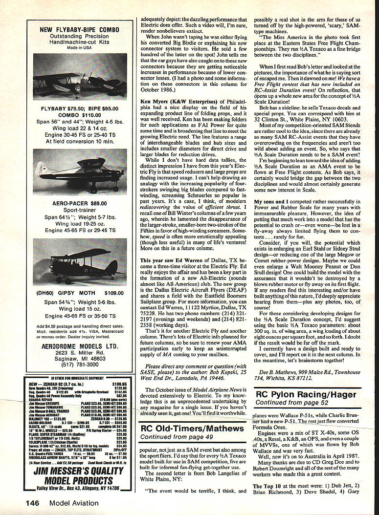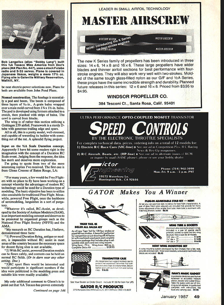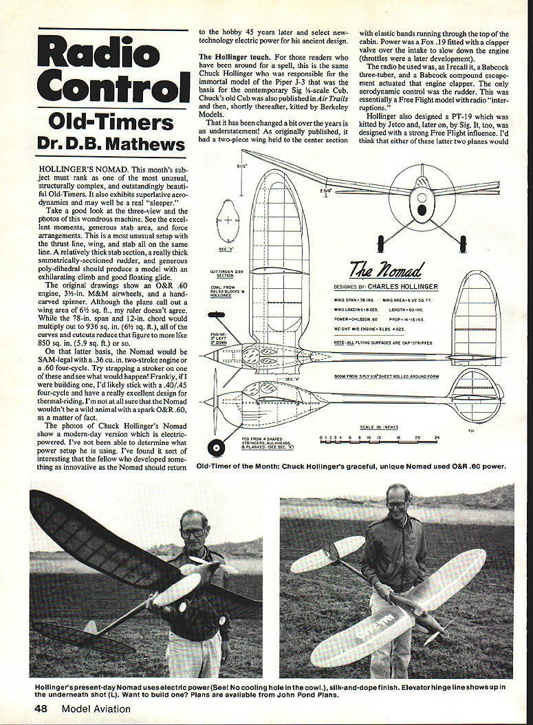 Radio Control Old-Timers Dr DB Mathews hobby 45 years later select newtechnology electric power ancient design Hollinger touch readers have around spell same Chuck Hollinger responsible immortal model Piper J-3 basis contemporary Sig -scale Cub Chucks old Cub also published inAir Trails shortly thereafter kitted Berkeley Models has changed bit over years understatement As originally published two-piece wing held center section elastic bands running through top cabin Power Fox 19 fitted clapper valve over intake slow down engine throttles later development radio used recall Babcock three-tuber Babcock compound escape ment actuated engine clapper aerodynamic control rudder essentially Free Flight model radio inter ruptions Holllnger also designed PT-19 kitted Jetco later Sig too designed strong Free Flight influence Id think either latter two planes would HOLLINGERS NOMAD months sub ject must rank unusual structurally complex outstandingly beauti ful Old-Timers also exhibits superlative aero dynamics may well real sleeper Take good look three-view photos wondrous machine See excel lent moments generous stab area force anangements unusual setup thrust line wing stab same line relatively thick stab section really thick smmetrically-sectioned rudder generous poly-dihedral should produce model exhilarating climb good floating glide original drawings show O&R 60 engine 3-in M&M airwheels handcarved spinner Although plans call out wing area 6 sq ft ruler doesnt agree 78-in span 12-in chord would multiply out 936 sq 6 sq ft curves cutouts reduce figure like 850 sq 59 sq ft latter basis Nomad would SAM-legal 36 cu two-stroke engine 60 four-cycle Try strapping stroker see what would happen Frankly building Id likely stick 40145 four-cycle have really excellent design thermal-riding Im sure Nomad wouldnt wild animal spark O&R 60 matter fact photos Chuck Hollingers Nomad show modem-day version electricpowered Ive able determine what power setup using Ive found sort interesting fellow developed some thing innovative Nomad should return 9 1f2 IIA 25/B 0 EC H GOTTINOEN 239 SECTION COWL FROM BALSA BLOCKS B HOLLOWED DESIGNED GY CHARLES HOLLINGER WING SPANTR INSWING AREAR VD SO FT WING LOADINGBOZS TR KD INS POWER-OI4LGSDNKHPROP 14-15 INS WEIGHT W/O ENGINE9LBS WOZO /______________ ENGINE 3 LEF DDHW I NOTEALLELYINASURFACES ARE CAP-STRIPPED -I.______________________ I 4-I II SCALE IN INCHED 10 PODFRHMWSHAPED01034KB ID ID16DOOW STRINGERS BULKHEADS HA PLANKED SEE SEC H Old-Timer Month Chuck Hollingers graceful unique Nomad used O&R 60 power Hollingers present-day Nomad uses electric powerSeeI No cooling hole inthe cowl silk-and-dope finish Elevator hinge line shows up underneath shot L Want build Plans available John Pond Plans 48 Model Aviation neat electric-power selections now Plans both available John Pond Plans Nomad construction fuselage essential ly pod boom boom composed three layers 6-in A-grain balsa wrapped over male mold carved 1 x 1-in balsa pod developed using formers attached crutch planked strips balsa cowl carved blocks wing rather thin section utilizing Gottingen 239 airfoil Framework sturdy D tube generous trailing edge spars pretty model well-stressed capable rewarding its builder some thing out ruL splendid flying project Input Scale Duration concept Apparently have hit some readers right imagination concept Duration RC Scale event Judging response idea has merit deserves exploration Im going quote two interesting replies Ive received first Glenn Cresens Baton Rouge LA years few would-be Free Flight ers no place fly have working concept whereby advantages modern RC technology could used Duration type modeling basic objective has utilize sites unsuitable traditional Free Flight Mean powered Free Flight once backbone aeromodeling languishes sort purga tory Whatever its called RC-Assist devel oped Society Antique Modelers SAM important modeling concept deserves promoted organized groups such National Free Flight Society NFFS AMA research RC Duration has believe demonstrated three facts 1 Powered Duration flying antique mod ern impossible RC assist areas country because necessary space decent flying sites available 2 RC assist powered Duration models can flown safely contests can held normal RC fields darn near other setting Doe 3RC sport fliers would interested would participate significant numbers idea publicized modeling press suitable kits readily available additional comment Glenns point out Texaco has proven extremely Continued page 146 An oil new Tiger Toil 120 four strokes piped 60 two strokes beoutifulperforner farcompetitionorjustshowingo bolso kit machined wood ports ond complete hardwore pockoge includes plug-in ad justoble stab ports ond new wing mounts Wing Spon -72 Wing Areo 860 sq Complete Delun Kit$15995 CASE An inespernoc bet ssggea molded case proted mat espensne transmitter Pot both hoo stick single stick transmitters Broon earner grain aluminum mm locking clasp- $1a9s See Your Dealer Order Direct loclude $1 51 Per Item UPS GATOR R/C PRODUCTS 3713 Pompano Prune Pensacola FL 39514 e 1904 476-8639 PUJG4N ADJUTAaLE STA3 UT last cart opumize stab incidence best tigf8 chreacteristics per glass hlled adjusters e included pourde micro screar adjustment smaller front tube Main tube aluminum matching phenolic socket $495 mu urn & uoams Aluminum allay tubing plug-In wings Included pair special slip-fit phetiohc sockets beild wing structure Noar size models 7/st din u 2$ 195 1/ din u 2$ 995 1 -- dra u 3$1495 NEWt WING MOUUNS UT wing mounting system derksoped Ron Chidgey fast neat accurateandstapstight Thwetr4oukeacketuncreassgndmachinedwing blocks included- $595 IVANS MAGIC GADGET - A protractor dearceasused bytras Kostensen accurately measure aileron elerator ruddattiroms Takes guess work out tim ming out airplrere qualhytob complete instructross log book cenptsg case $795 January 1987 49 Bob Langelius alias Bobby Lang built 1/2A Texaco Miss America Docs plansMA Plan No447 usesastockP