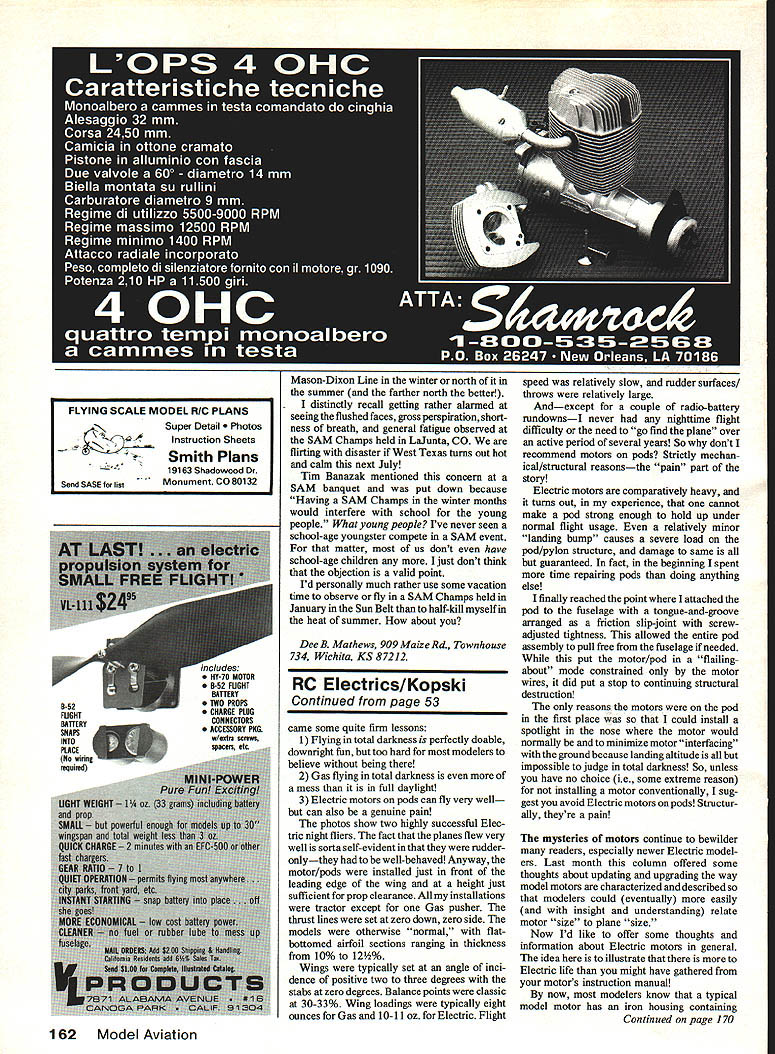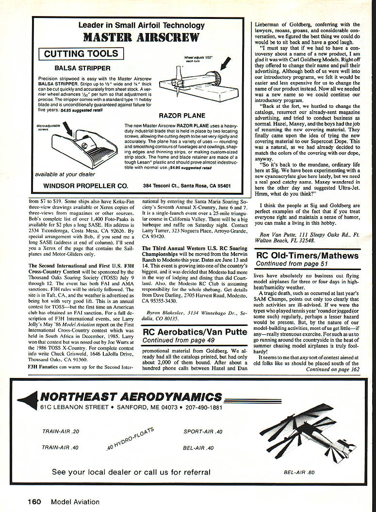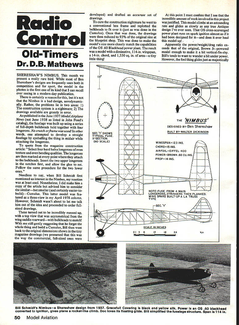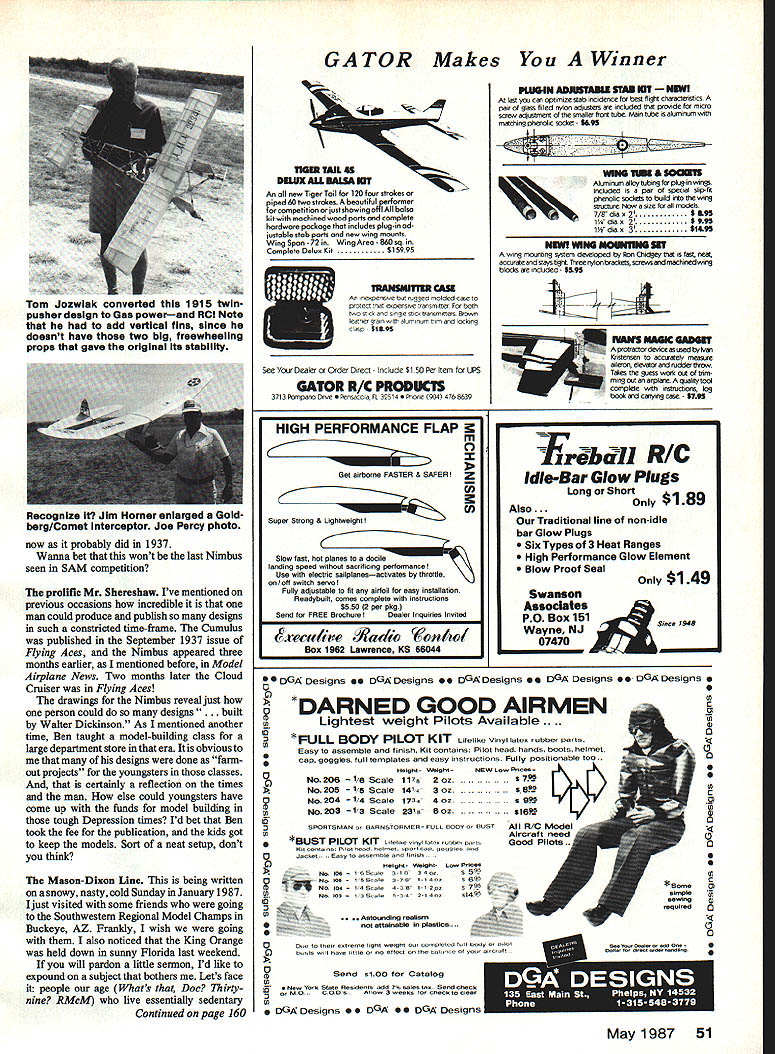 Radio Control Old-Timers Dr DB Mathews SHERESHAWS NIMBUS month present really rare bird Ben Shereshaws designs frequently seen both competition sport model photos first its kind can recall ever seeing modern-day publication certainly reason its Nimbus bad design aerodynamic ally Rather problems lie two areas 1 construction system nightmare 2 drawings available grossly error As published June 1937 ModelAirplane News June 1938 listed John Ponds catalog fuselage built up using series full-depth bulkheads held together four longerons No crutch orframe used other words attempted develop straight fuselage eyeballing thing midair attaching longerons quote magazine construction article Select four hard balsa longerons texture bending qualities longerons marked point attach bulkheads Insert two upper longerons notches first allow glue set Follow same procedure two lower ones Needless say Bill Schmidt first mentioned interest Nimbus reaction least cool Nonetheless did make him copy article advised him consider similarbut smaller certainly easier-to buildCumulus latter model fea tured three-view April 1978 column However Schmidt wasnt about let talk him out idea proceeded order fullsized drawings turned out incredibly messed up top view asymmetrical wing saddle rearwardwith bulkheads match still gently suggesting forget whole thing build Cumulus Bill went back original dimensions shown tiny magazine drawings presumed way commercial full-sized ones developed drafted accurate set drawings cure construction nightmare went conventional box frame replotted bulkheads fit over just done Cumulus Once done drawings reduced 93% original size blueprint shop done make models size closely match capabilities OS60 Blackhead power plant result model diminutive 114-in wingspan 14-in chord 1550 sq areaa tiny little thing point must confess see incredible amount work involved project justified model climbs astounding rate glides slowly true Antique design Ive ever seen OS cross-scavenged power plant runs spark ignition aimost designed itand does ever haul model up Apparently power/weight/drag ratio ex ceeds original Brown Jr-powered model enough make bit vertical-fin-shy Bills tends want wander bit under power However fool thing glides just majestically SEC Y SHOWS TYPICAL FUSE X-SECTION NO SCALEWINGSPAN 123 INS CHORDI5 INS7 AIRFOILEIFFEL 400_____ POWER BROWN 60 CU INS PROPI4INSL NOTE FUSE FROM 4 MAIN LONGERONSSTRINGERS THEN PLANKED WING SPARS BUILT-UP LA TRUSS Ir THE NIMBUS DESIGNED BY Ben Shereshaw BUILT BY WALTER DICKINSON 50 Model Aviation Bill Schmidts Nimbusa Shereahaw design 1937 Graceful Covering black yellow silk Power OS 60 blackhead converted ignition gives plane rocketlike climb Doc loves its floating glide Bill simplified fuselage structure Span 114 Recognize Jim Homer enlarged Gold berg/Comet Interceptor Joe Percy photo now probably did 1937 Wanna bet wont last Nimbus seen SAM competition prolific Mr Shereshaw Ive mentioned previous occasions incredible man could produce publish designs such constricted time-frame Cumulus published September 1937 issue Flying Aces Nimbus appeared three months earlier mentioned before Model Airplane News Two months later Cloud Cruiser Flying Aces drawings Nimbus reveal just person could designs . built Walter Dickinson As mentioned another time Ben taught model-building class large department store era obvious designs done farm out projects youngsters classes certainly reflection times man else could youngsters have come up funds model building tough Depression times Id bet Ben took fee publication kids got keep models Sort neat setup dont think Mason-Dixon Line being written snowy nasty cold Sunday January 1987 Ijust visited some friends going Southwestern Regional Model Champs Buckeye AZ Franidy wish going also noticed King Orange held down sunny Florida last weekend will pardon little sermon Id like expound subject bothers Lets face people age Whats Doc Thirtynine RMcM live essentially sedentary Continued page 160 GATOR Makes Winner L 11613 TAIL 45 DELUX ALL 3MM UT An new Tiger Toil 120 four strokes piped 60 twa strokes beautiful performer foreompetitionorjustshowingofflAll balsa hit mochined wood ports complete hordwore poclioge tisot includes plug-in od justoble stob parts ond nem wing mounts Wing Spon -72 Wing Areo -860 sq Complete Delun Kit$15995 CASE An ineriperisse nuggro molded case protect erspensive transmtter both Sno stick single stick transmitters Brown leather gran witr aluminum trim ano locking caso $1395 See Your Dealer Order Direct Include $1 50 Per Item UPS GATOR R/C PRODUCTS 37t3 Pompano brine C Pensacola FL 35514 Phone 1904 4768639 PUI64N ADIUTADLI STA3 UT last stu can optimize stab incidence best Bight chreactenistics pair glass filled tryf adjusters ao nacladed IBM proside micro screna adjastmest smaller tromi tube Main tube alaminam mitt matcbng plienolic socket $695 WINS urn U@aiis Aluminuam alloytubrng plug-insmafl Included pair specat slip-fit phenofic sockets build tie miss muctsam Noh 6ZC modats 7/8 dia u 2 $ aa 2$995 1W dia 5 3$1495 momnims urn wing mounting system desieloped 86s Chidgey tiM t neM accurate stays tight Three rry4on keachets saemssand mactitnedannag blocks no included- $595 - MMK GAMUT Knstensen 0 aces Mety measure Aprdeadardeaceasused bylvai eto, eenatoranduddo-ttnow Sates guess wala os 0 5T inmngcutsnarpase Aqua tytod i J.r omp etc mfluctors 05 booliand arynag case $795 CS DGA DemignS DGADOmIgflS Os DGADesIgfltu se DGA Designie DGA Designs e C *DARNED GOOD AIRMEN Lightest weight Pilots Available B 0 * FULL BODY PILOT KIT L e ke V ny os ubber parts Easy osnemble tinish Kit oontains Pilot head hands boots helrriet 0 sCOP goggles toll teniplates andeasy instruCtionS Fullypositionable too.0 Height- Vight-NEW Low N-weeNo206-1/6 Scale 11s2 ozS790 No2051/5 Scale l4ia30z5951A\i/In No204-1/4 Scale 173a4 ozs gej SPORTSMAN BAR5STORMhR FULL BOOT OUST No205 —1/3 Scale 23 Oozte9 C *us PILOT KIT Liieiiim nnni nine iusbni trans 00 Kitnon