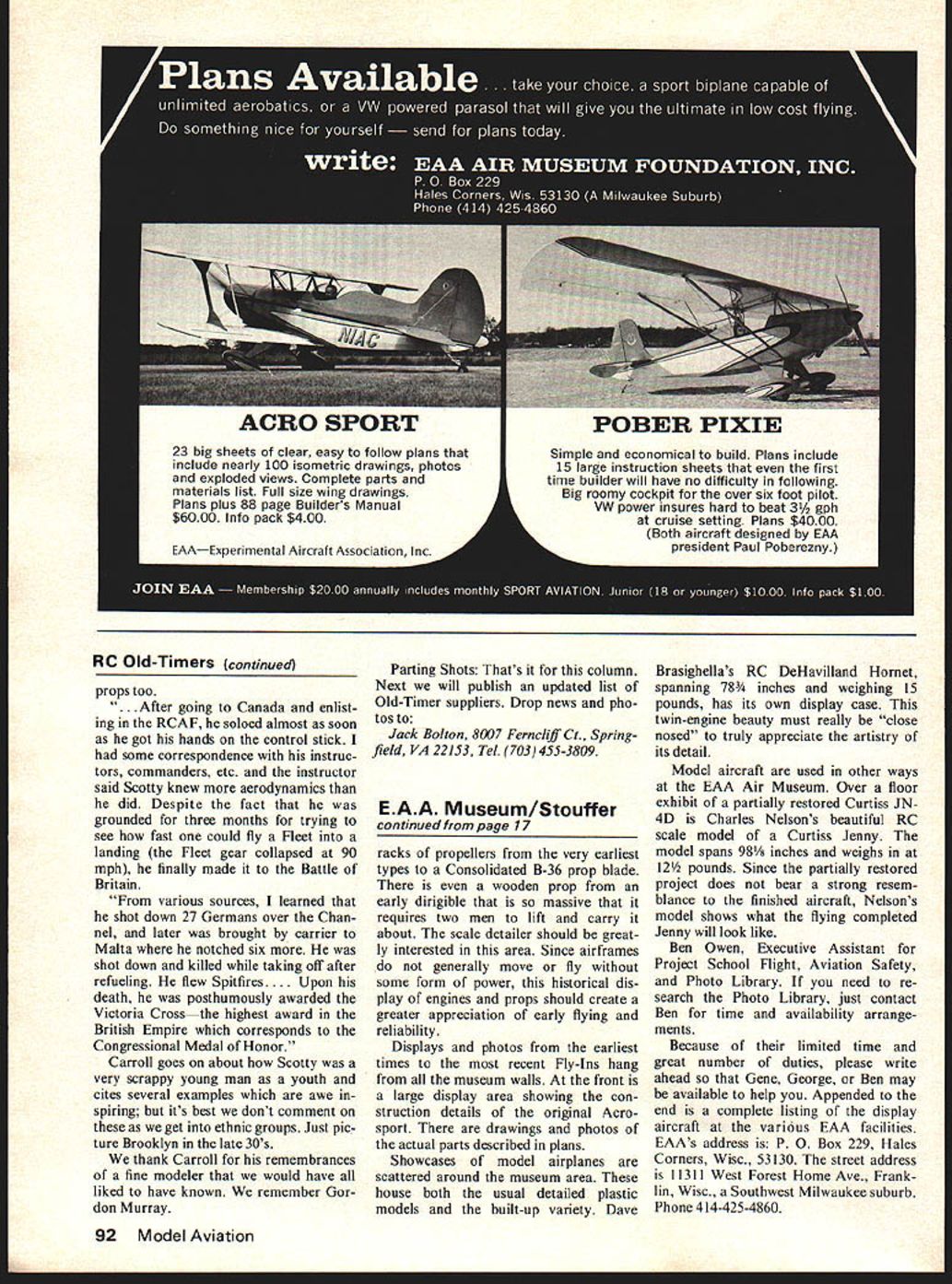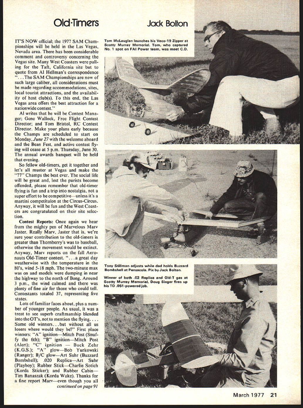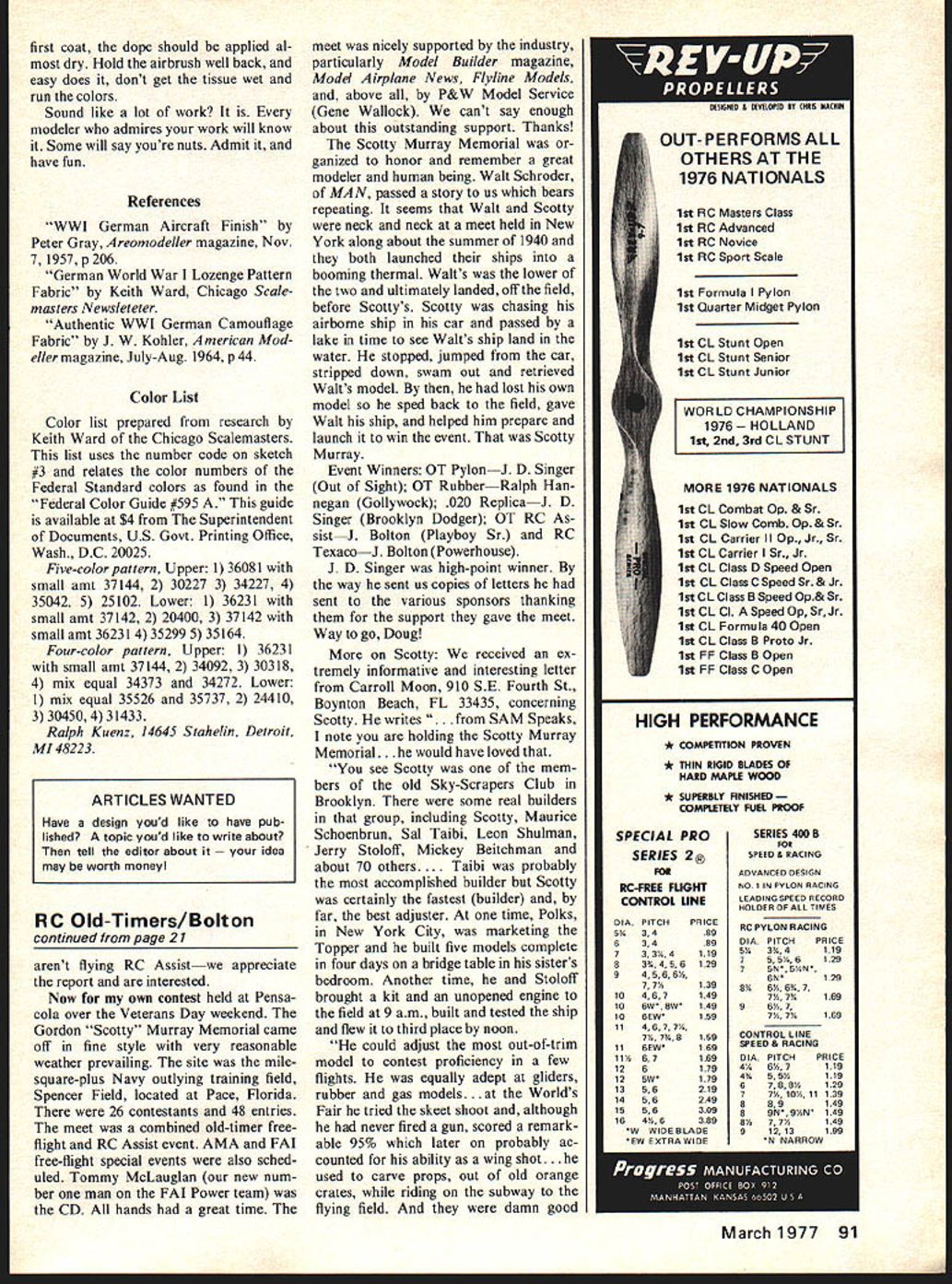 Old Timers ITS NOW official 1977 SAM Cham pionships will held Las Vegas Nevada area has considerable comment controversy concerning Vegas site West Coasters pull ing Taft California site quote Al Hellmans correspondence Championships now such large caliber considerations must made regarding accommodations sites local tourist attractions availabil ity host clubs end Las Vegas area offers best attraction nationwide contest Al writes will Contest Mana ger Gene Wallock Free Flight Contest Director Tom Bristol RC Contest Director Make plans early because Champs scheduled start Monday June27 welcome aboard Bean Fest active contest fly ing will cease 5 pm Thursday June 30 annual awards banquet will held evening So fellow old-timers get together lets muster Vegas make 77 Champs best ever social life will great lest purists become offended please remember old-timer flying fun trip nostalgia super effort competitiveunless its martini competituion Circus-Circus Anyway will fun West Coast ers congratulated site selec tion Contest Reports Once again hear mighty pen Marvelous Mary Jaster Really Mary Jaster sure contribution old-timers greater Thomberrys baseball otherwise movement would extinct Anyway Mary reports fall Aero nauts Old-Timer contest .. great day weatherwise temperature 80s wind 5-18 mph two-minute max models dumping near highway north Bong Around 3 pm wind calmed plenty fine air could tell Contestants totaled 37 representing five states Lots familiar faces about plus num ber younger people As usual treat see superb craftmanship blended OTs mention flying.. Same old winners. us losers would First place winners ignitionMitch Post Snuf fy 6th B ignitionMitch Post Alert C ignition Zehr KGS glowBob Yurkowski Ranger B/C glowArt Suhr Buzzard Bombshell 020 ReplicaArt Suhr Playboy Rubber StickCharlie Sotich Korda Sticker Rubber Cabin Tim Banaszak Korda Wake Thanks fine report Maryeven though continued page 91 March 1977 21 Tom McLauglan launches Veco-19 Zipper Scotty Murray Memorial Tom captured No 1 spot FAI Power team meet CD Tony Stiliman adjusts dad holds Buzzard Bombshell Pensacola Pix Jack Bolton Winner both 02 Replica Old-T gas Scotty Murray Memorial Doug Singer fires up TD 051-powered job first coat dope should applied al dry Hold airbrush well back easy does dont get tissue wet run colors Sound like lot work modeler admires work will know Some will say youre nuts Admit have fun References WWI German Aircraft Finish Peter Gray Areomodeller magazine Nov 7 1957 p 206 German World War Lozenge Pattern Fabric Keith Ward Chicago Scalemast ers Newsleteter Authentic WWI German Camouflage Fabric J W Kohler American Mod eller magazine July-Aug 1964 p 44 Color List Color list prepared research Keith Ward Chicago Scalemasters list uses number code sketch #3 relates color numbers Federal Standard colors found Federal Color Guide #595 guide available $4 Superintendent Documents US Govt Printing Office Wash DC 20025 Five-color pattern r 136081 small amt 37144 2 30227 334227 4 35042 5 25102 Lower 1 36231 small amt 37142 2 20400 337142 small amt 36231 435299 5 35164 Four-color pattern Upper 1 36231 small amt 37144 2 34092 3 30318 4 mix equal 34373 34272 Lower 1 mix equal 35526 35737 2 24410 330450431433 Ralph Kuenz 14645 Stahelin Detroit MI 48223 RC Old-Timers/Bolton continued page 21 arent flying RC Assistwe appreciate report interested Now own contest held Pensa cola over Veterans Day weekend Gordon Scotty Murray Memorial came off fine style very reasonable weather prevailing site milesquare-plus Navy outlying training field Spencer Field located Pace Florida 26 contestants 48 entries meet combined old-timer freeflight RC Assist event AMA FAI free-flight special events also sched uled Tommy McLauglan new num ber man FAI Power team CD hands great time meet nicely supported industry particularly Model Builder magazine Model Airplane News Flyline Models above P&W Model Service Gene Wallock cant say enough about outstanding support Thanks Scotty Murray Memorial ganized honor remember great modeler human being Walt Schroder MAN passed story us bears repeating seems Walt Scotty neck neck meet held New York along about summer 1940 both launched ships booming thermal Walts lower two ultimately landed off field before Scottys Scotty chasing airborne ship car passed lake time see Walts ship land water stopped jumped car stripped down swam out retrieved Walts model lost own model sped back field gave Walt ship helped him prepare launch win event Scotty Murray Event Winners OT Pyloni D Singer Out Sight OT RubberRalph Han negan Gollywock 020 Replicai D Singer Brooklyn Dodger OT RC As sisti Bolton Playboy Sr RC Texacoi Bolton Powerhouse i D Singer high-point winner way sent us copies letters sent various sponsors thanking support gave meet Way go Doug Scotty received ex tremely informative interesting letter Carroll Moon 910 SE Fourth St Boynton Beach FL 33435 concerning Scotty writes M Speaks note holding Scotty Murray Memorial. d have loved see Scotty mem bers old Sky-Scrapers Club Brooklyn some real builders group including Scotty Maurice Schoenbrun Sal Taibi Leon Shulman ierry Stoloff Mickey Beitchman about 70 others . Taibi probably accomplished builder Scotty certainly fastest builder far best adjuster time Polks New York City marketing Topper built five models complete four days bridge table sisters bedroom Another time Stoloff brought kit unopened engine field 9 am built tested ship flew third place noon could adjust out-of-trim model contest proficiency few flights equally adept gliders rubber gas models lds Fair tried skeet shoot although never fired gun scored remark able 95% later probably ac counted ability wing shot d carve props out old orange crates riding subway flying field damn good 1st RC Masters Class 1st RC Advanced 1st RC Novice 1st RC Sport Scale 1st Formula Pylon 1st Quarter Midget Pylon 1st CL Stunt Open 1st CL Stunt Senior 1st CL Stunt Junior WORLD CHAMPIONSHIP 1976 HOLLAND 1st 2nd 3rd CL 