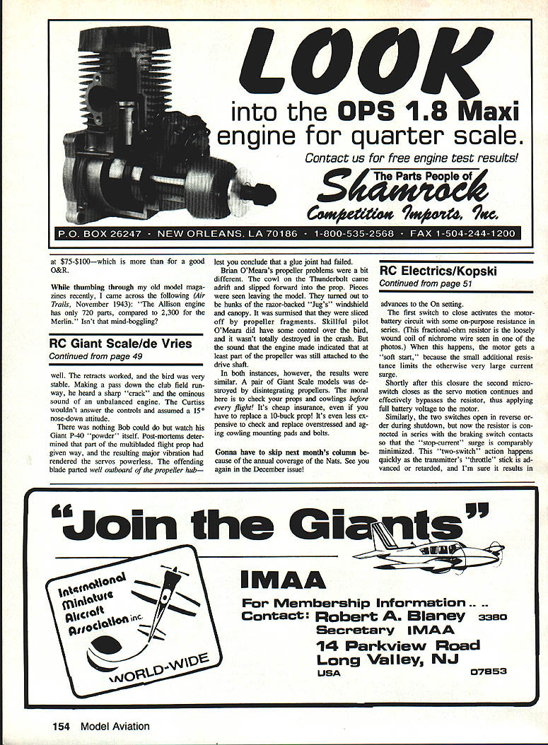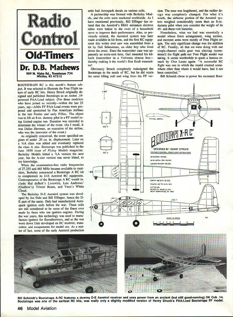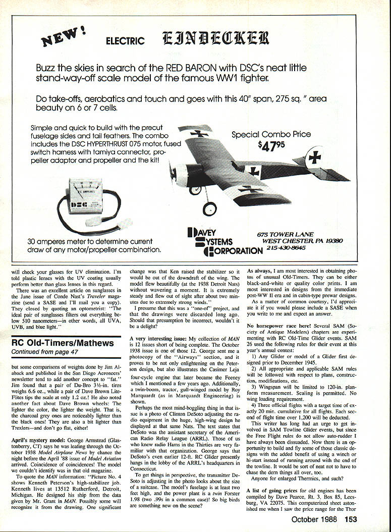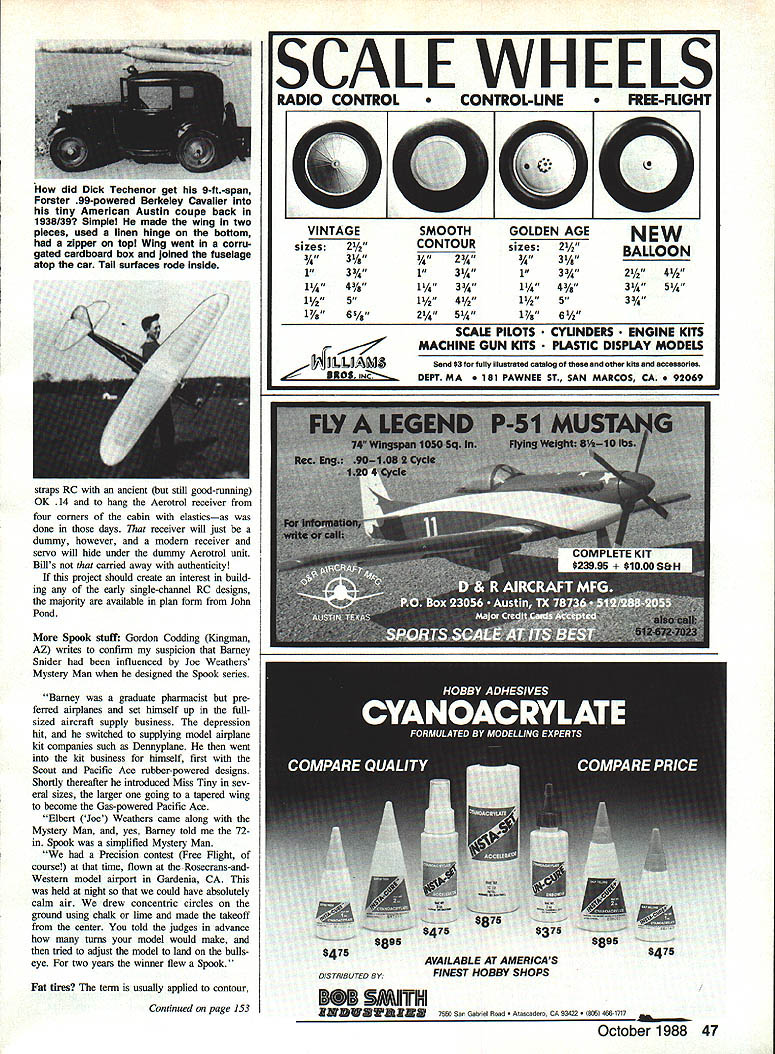 units Aerospark decals various coils partnership formed Berkeley Mod els units marketed worldwide As have mentioned previously Bill Effinger has re lated Aerotrols RK6 1 miniature electron tubes baked oven household stove improve performance Also pre viously related Aerotrol system later made available kit form first RC equip ment writer ever saw assembled kit Gail Scheurman older boy lived down street Since transmitter case ap parently extra-cost item Gail mounted kitbuilt transmitter Velveeta cheese box thereby malting worlds first Kraft transmit ter Obviously Struck completely redesigned Bootstraps needs RC did retain same lifting stab wing FF ver sion nose lengthened rudder de sign completely changed what its worth airborne portion Aerotrol sys tem weighed considerably 8-oz dummy pilot consider weight its 45- three-volt batteries Nonetheless what essentially model force arrangement wing section moment arms mostly Free Flight igin significant change addition RC Franldy doing single-channel radio gear altering some times flight path Free Right model taking seems worthwhile quote famous re mark Chet Lanzo again successful RC flight model crashed some other would have nor controlled Bill Schmidt chose power recreated BootBOOTSTRAPS RC months feature sub ject selected illustrate Free Flight na ture early RC kits Henry Struck originally de signed published Bootstraps Arden 19powered PAA-Load subject modelers have joined us recentlywithin last 25 years sayAMA FF PAA-Load events pro posed sponsored Pan American Airlines late Forties early Fiffies object lift 8-oz dummy pilot FF model us sng limited engine run Duration recorded determine winner event As recall Dallas Sherman executive airline innovator event As originally conceived event specified en gines under 20 Cu displacement Later class added eventually replaced class size Bootstraps published June 1950 issue Flying Models magazine Berkeley Models kitted version next year A-size version never kitted knowledge examination-free radio frequencies 27255 465 MHz became available mod elers Berkeley announced Bootstraps RC kit complement its D-E Aerotrol RC equipment Contemporaries Bootstraps RC would clude Hal deBolts Livewire Lou Andrews Guillows Trixter Beam Vecos White Cloud Berkeley D-E Aerotrol system devel oped Joe Dale Bill Effinger hence D E part name Dale manufactured Aero spark ignition coils before war coils still considered some finest ever made run ignition engines During war years technology used manu facture ignitors fiamethrowers war wore down Dale developed RC receiver trans mitter escapements model use As mat ter fact some early Aerotrol production B 4S1W U DES SNED BY HENRY STRuCK R BAD 0 ONTROREEGE OR AA LOAD II~ WINGSPAN 54 INS WINO AREA 350 OSINS LOADED WEIORT35OZS EMPTY WEISRT2IOZS [DEC CSEC S SCALE IN AEChiS Bill Schmidts Bootstraps A-RC features dummy D-E Aerotrol receiver uses power ancient still good-running OK Cub 14 Bootstraps earliest RC kits really slightly modified version Henry Strucks PAA-Load Bootstraps FF model POWER.09 TOIR CO INS BERKELEY MODELS INC WEST HEMPSTEAD NY 1950 46 Model Aviation Radio Conoi Old-Timers Dr DB Mathews 909 N Maize Rd Townhouse 734 WichIta KS 67212 straps RC ancient still good-running OK 14 hang Aerotrol receiver four corners cabin elasticsas done days receiver will just dummy however modern receiver servo will hide under dummy Aerotrol unit Bills carried away authenticity project should create interest build ing early single-channel RC designs majority available plan form John Pond Spook stuff Gordon Codding Kingman AZ writes confirm suspicion Barney Snider influenced Joe Weathers Mystery Man designed Spook series Barney graduate pharsnacist pre ferred airplanes set himself up fullsized aircraft supply business depression hit switched supplying model airplane kit companies such Dennyplane went kit business himself first Scout Pacific Ace rubber-powered designs Shortly thereafter introduced Miss Tiny sev erai sizes larger going tapered wing become Gas-powered Pacific Ace Elbert Joe Weathers came along Mystery Man yes Barney told 72in Spook simplified Mystery Man Precision contest Free Flight course time flown Rosecrans-and Western model airport Gardenia CA held night could have absolutely calm air drew concentric circles ground using chalk lime made takeoff center told judges advance turns model would make tried adjust model land bulls eye two years winner flew Spook Fat tires term usually applied contour Continued page 153 SCALE WHEELS RADIO CONTROL CONTROL-UNEFREE-FLIGHT VINTAGE sizes2/z 3/ 13 1144/a hA5 17/a65/a GOLDEN AGE sizes21h 31/a 13 114 4% 1A 5 17/a6A 0 NEW BALLOON 24A 314514 3 SCALE PILOTS CYUNDERS ENGINE KITS MACHINE GUN KITS PLASTIC DISPLAY MODELS Sand $3 fully illuskatad catalog otlw kits accessories DEPT MA PAWNEE ST SAN MARCOS CA 9 SMIflflHI ZNDWDUUZR8 7550 Ia, Gab,eI toad cadero CA 93422 466-1717 October 1988 47 did Dick Techenor get 9-ft-span Forster 99-powered Berkeley Cavalier tiny American Austin coupe back 1938/39 Simple made wing two pieces used linen hinge bottom zipper top Wing went corru gated cardboard box joined fuselage atop car Tall surfaces rode inside SMOOTH CONTOUR 234 1314 1143 1h 4h 214554 V 8475AVAILABLE AT AMERICAS475 DISTRIBUTED BY FINEST HOBBY SHOPS will check glasses UV elimination Im told plastic lenses UV coating usually perform better glass lenses regard excellent article sunglasses June issue Conde Nasts Traveler maga zine send SASE Ill mall copy closed quoting optometrist ideal palr sunglasses filters out everything low 510 nanometersin other words UVA UVB blue light RC Old-Timers/Mathews Continued page 47 some comparisons weights done Jim Alaback published San Diego Aeroneers newsletter tend add another concept fat Jim found pair Du-Bro 3-in tires weighs 66 oz palr Dave Brown Lite Flites tips scale 12 oz also noted another fact about Dave Brown wheels lighter color lighter weight charcoal grey ones noticeably lighter black ones also bit 