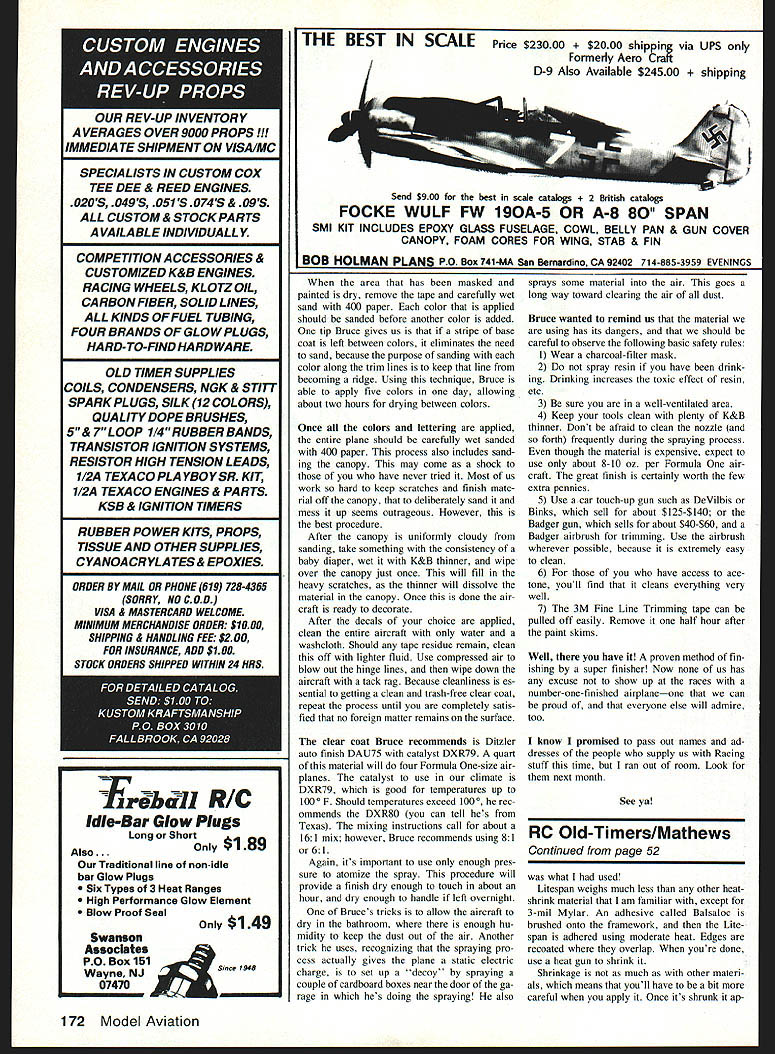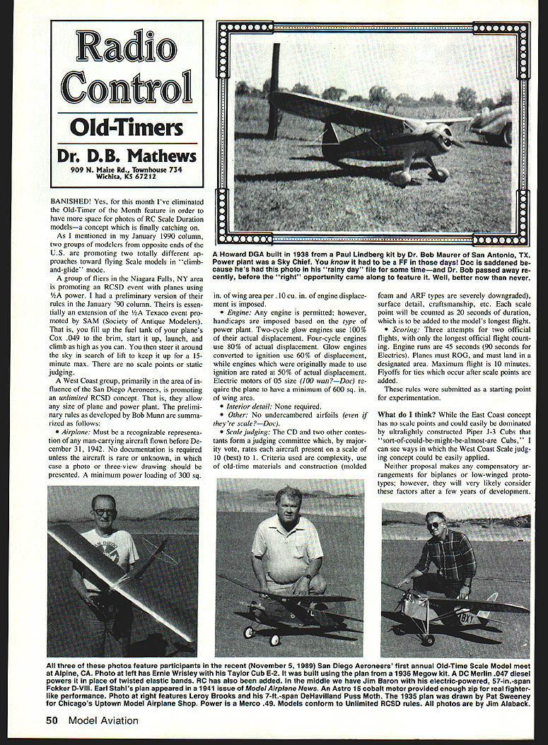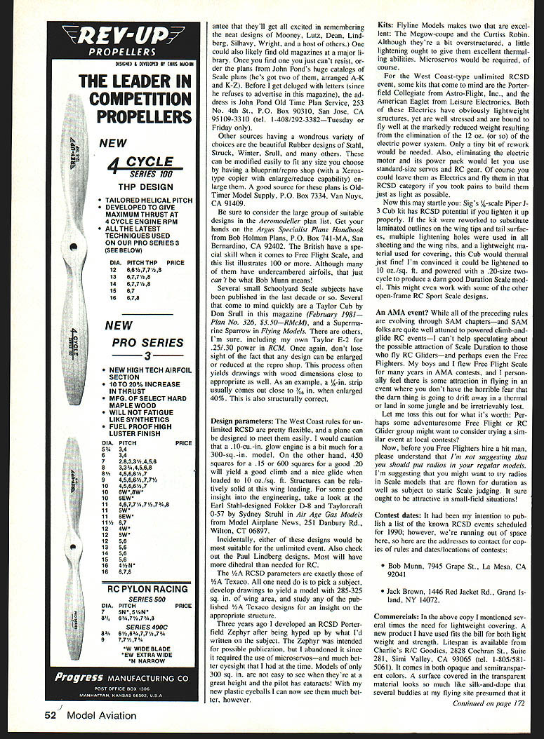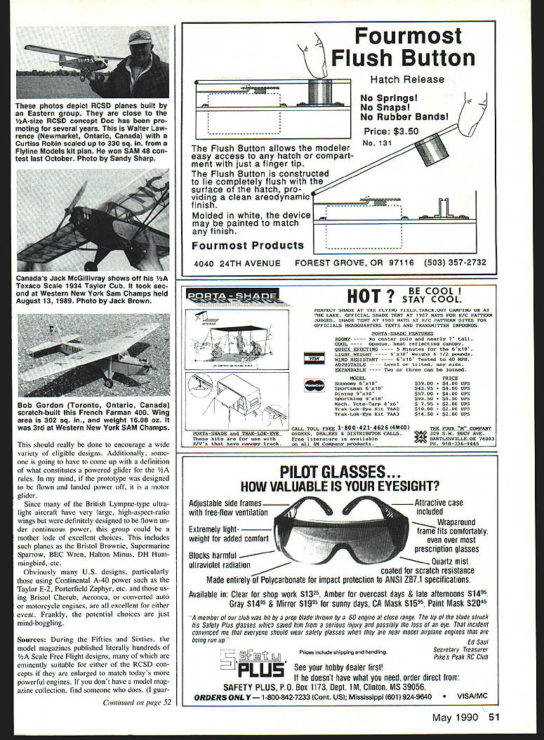 BANISHED Yes month Ive eliminated Old-Timer Month feature order have space photos RC Scale Duration modelsa concept finally catching As mentioned January 1990 column two groups modelers opposite ends US promoting two totally different ap proaches toward flying Scale models climb and-glide mode group fliers Niagara Falls NY area promoting RCSD event planes using /2A power preliminary version rules January 90 column Theirs essen tially extension Texaco event pro moted SAM Society Antique Modelers fill up fuel tank planes Cox 049 brim start up launch climb high can steer around sky search lift keep up 15minute max no scale points static judging West Coast group primarily area fluence San Diego Aeroneers promoting unlimited RCSD concept allow size plane power plant prelimi nary rules developed Bob Munn summa rized follows Airplane Must recognizable representa tion man-carrying aircraft flown before De cember 31 1942 No documentation required unless aircraft rare unknown case photo three-view drawing should presented minimum power loading 300 sq wing area per 10 cu engine displace ment imposed Engine Any engine permitted however handicaps imposed based type power plant Two-cycle glow engines use 100% actual displacement Four-cycle engines use 80% actual displacement Glow engines converted ignition use 60% displacement engines originally made use ignition rated 50% actual displacement Electric motors 05 size 100 wattDoc re quire plane have minimum 600 sq wing area Interior detail None required Other No undercambered airfoils theyre scale Doc Scale judging CD two other contes tants form judging committee major ity vote rates aircraft present scale 10 best 1 Criteria used complexity use old-time materials construction molded foam ARF types severely downgraded surface detail craftsmanship etc scale point will counted 20 seconds duration added models longest flight Scoring Three attempts two official flights witb longest official flight count ing Engine runs 45 seconds 90 seconds Electrics Planes must ROG must land designated area Maximum flight 10 minutes Flyoffs ties occur after scale points added rules submitted starting point experimentation What think East Coast concept has no scale points could easily dominated ultralightly constructed Piper J-3 Cubs sort-of-could-be-might-be-almost-are Cubs can see ways West Coast Scale judg ing concept could easily applied Neither proposal makes compensatory ar rangements biplanes low-winged proto types however will very likely consider factors after few years development 50 Model Aviation Radio Control Old-Timers Dr DB Mathews 909 N Maize Rd Townhouse 734 Wichita KS 67212 Howard DGA built 1938 Paul Lindberg kit Dr Bob Maurer San Antonio TX Power plant Sky Chief know FF days Doc saddened cause hes photo rainy day file some timeand Dr Bob passed away re cently before right opportunity came along feature Well better now never three photos feature participants recent November 5 1989 San Diego Aeroneers first annual Old-Time Scale Model meet Alpine CA Photo left has Ernie Wrisley Taylor Cub E-2 built using plan 1936 Megow kit DC Merlin 047 diesel powers place twisted elastic bands RC has also added middle have Jim Baron electric-powered 57in.span Fokker D-VIII Earl Stahls plan appeared 1941 issue Model Airplane News An Astro 15 cobalt motor provided enough zip real fighter like performance Photo right features Leroy Brooks 7-ft-span DeHavilland Puss Moth 1935 plan drawn Pat Sweeney Chicagos Uptown Model Airplane Shop Power Merco 49 Models conform Unlimited RCSD rules photos Jim Alaback Bob Gordon Toronto Ontario Canada scratch-built French Farman 400 Wing area 302 sq weight 1608 oz 3rd Western New York SAM Champs should really done encourage wide variety eligible designs Additionally some going have come up definition what constitutes powered glider /2A rules mind prototype designed flown landed power off motor glider Since British Lympne-type ultralight aircraft have very large high-aspect-ratio wings definitely designed flown un der continuous power group could mother lode excellent choices includes such planes Bristol Brownie Supermarine Sparrow BEC Wren Halton Minus DH Hum mingbird etc Obviously US designs particularly using Continental A-40 power such Taylor E-2 Porterfield Zephyr etc us ing Bristol Cherub Aeronca converted auto motorcycle engines excellent either event Frankly potential choices just mind-boggling Sources During Fifties Sixties model magazines published literally hundreds Scale Free Flight designs eminently suitable either RCSD con cepts enlarged match todays powerful engines dont have model mag azine collection find someone does guar Continued page 52 Fourmost Flush Button Hatch Release _____________Springs Price $35 No 131 Flush Button constructed lie completely flu sh th surface hatch pro finish viding clean areodynamic Molded White device may painted match finish[ Fourmost Products Flush Button allows modeler easy access hatch compart ment just finger tip 4040 24TH AVENUE FOREST GROVE OR 97116 503 357-2732 OT BE COOL HSTAY COOL PERFECT SHADE AT THE FLYING FIELDTRACKOUT CAMPING OR AT THE LAKE OFFICIAL SHADE TENT AT 1987 RATS FOR H/C PATTERN JUDGES SHADE TENT AT 1988 RATS AT R/C PATTERN SITES FOR OFFICIALS HEADQUARTERS TENTS AND TRANSMITTER IMPOUNDS FORTAsSDAQCFSATVRE$ ROOMY No center pole nearly 7 tall COOL ---- Opaque heat reflecting canopy QUICK ERECTING ---- S Minuten 6c18 IIG8TJ4EIGHT ---- hell Weighs 6 1/2 pounds VISAWIND RESISTANT ---- holD Tested 48 MPH ADJII5TAB1E ---- Level tilted side ICNDABLE ---- Two three can joined MODEL Econcey 6018 SpurteNan 6clO DinIng 9018 Sportking 9R18 Mech Tote-Tarp 406 Trak-Lok-Eye Kit TAA2 Trak-Lok-Cyc Kit TAA3 rpRANsOOCOt8Ild rna-~-nen ORDERS DEALERS & DISTRIBUTHR CALLS El tears use Cr80 literature availaBle 8/Vs have oanopy track dN Coecacy products PRICE $3988 $488 UPS S4395 05488 UPS $1788e $488UPS $93580 $SSOUPS $ 795e $280UPS $1888 $288UPS $14500 $280UPS THE FOUR_N_COROAIiY 289 SW BUCY AVE 