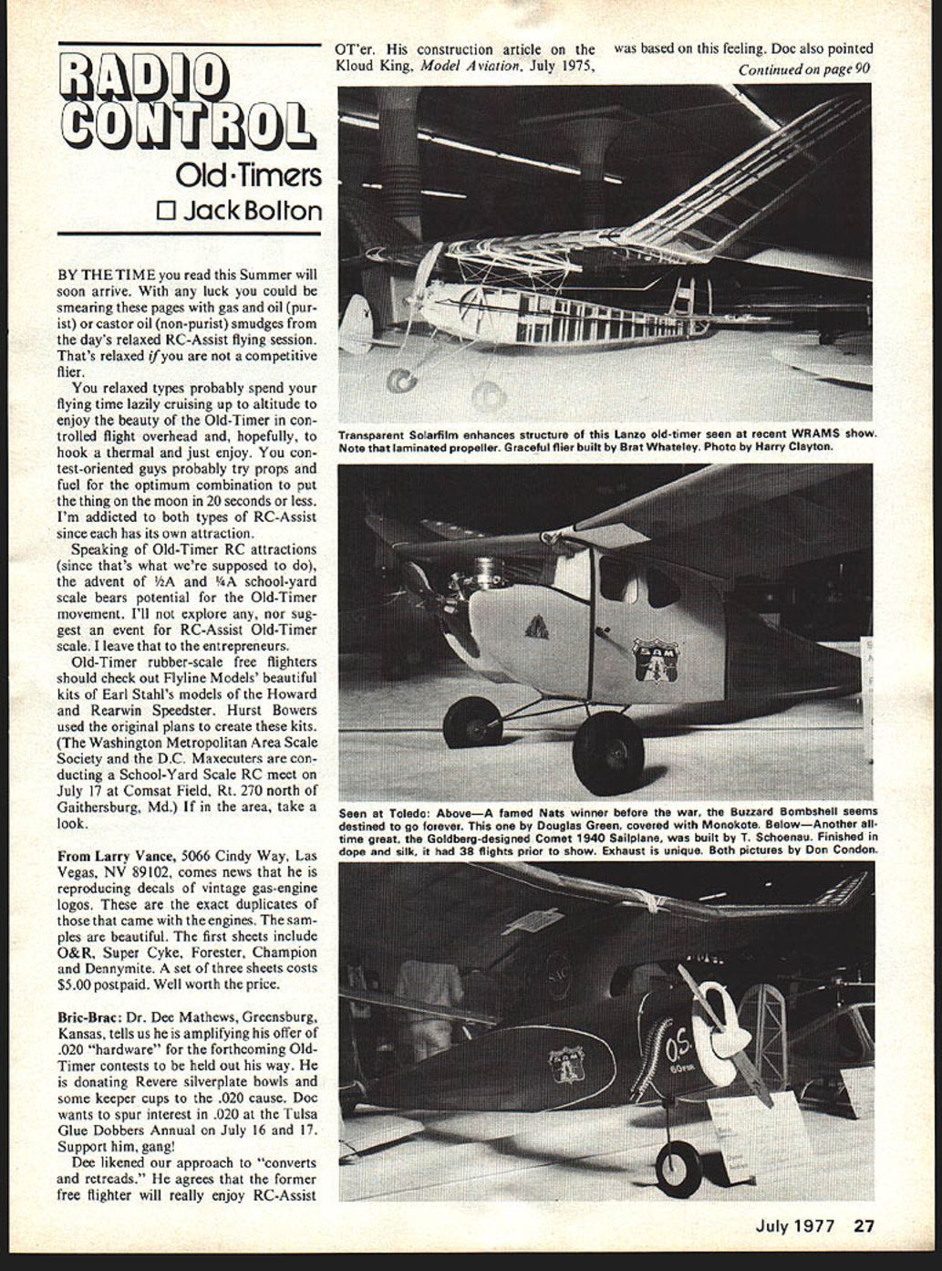OTer construction article based feeling Doc also pointed Kioud King Model Aviation July 1975Continued page90 Old Timers 0 Jack Bollon BY THE TIME read Summer will soon arrive luck could smearing pages gas oil pur ist castor oil non-purist smudges days relaxed RC-Assist flying session Thats relaxed competitive flier relaxed types probably spend flying time lazily cruising up altitude enjoy beauty Old-Timer con trolled flight overhead hopefully hook thermal just enjoy con test-oriented guys probably try props fuel optimum combination put thing moon 20 seconds less Im addicted both types RC-Assist since has its own attraction Speaking Old-Timer RC attractions since thats what supposed advent /4A school-yard scale bears potential Old-Timer movement Ill explore nor sug gest event RC-Assist Old-Timer scale leave entrepreneurs Old-Timer rubber-scale free fighters should check out Flyline Models beautiful kits Earl Stahls models Howard Rearwin Speedster Hurst Bowers used original plans create kits Washington Metropolitan Area Scale Society DC Maxecuters con ducting School-Yard Scale RC meet July 17 Comsat Field Rt 270 north Gaithersburg Md area take look Larry Vance 5066 Cindy Way Las Vegas NV 89102 comes news reproducing decals vintage gas-engine logos exact duplicates came engines sam ples beautiful first sheets include O&R Super Cyke Forester Champion Dennymite set three sheets costs $500 postpaid Well worth price Bric-Brac Dr Dee Mathews Greensburg Kansas tells us amplifying offer 020 hardware forthcoming OldTimer contests held out way donating Revere silverplate bowls some keeper cups 020 cause Doc wants spur interest 020 Tulsa Glue Dobbers Annual July 16 17 Support him gang Dee likened approach converts retreads agrees former free fighter will really enjoy RC-Assist July1977 27 Transparent Solarfilm enhances Structure Lanzo old-timer seen recent WRAMS show Note laminated propeller Graceful flier built Brat Whateley Photo Harry Clayton Seen Toledo AboveA tamed Nets winner betore war uzzara Bombshell seems destined go forever Douglas Green covered Monokote BelowAnother alltime great Goldberg-designed Comet 1940 Sailplane built T Schoenau Finished ni ciII k4 SR fliakt nin tn iit i uniaue Both nicturas Don Condon some reports no scores should still give idea top dogs name should list isnt dont blame talk CD didnt report score particularly encouraging see Junior Senior modelers list Richard Aloise Jr Gary Dombrow ski Sr right older modelers deserve real pat back performance list five names longer Otto Graf Sr Louis Matusik Robert Dombrowski Jr also would have included scores seem out reach some dont despair lot first-place scores did make list just few second- thirdplace scores list takes excellent flight conditions well good equipment skill set record make list such pressure competition area will tend produce higher scores area competition formal event relatively new Work experience foundation upon consistent winning perform ance built Richard L Perry 5016 Angelita Ave Dayton OH 45424 RC Old-Timers/Bolton continued page 27 out Kloud King Model Aviations best selling plans asks Old-Timers publicly thank Al Hellman Chairman SAM Engine Conversion Committee dip lomatic job well done Doc feels Al did masterful job avoiding hurt feelings soapbox orations OK Dee hereby acknowledge Als efforts express thanks wonder what talking about suggest join SAM get straight dope have avoided comment controversy inside Old-Timer movement didnt want column become vehicle expressed opinions ever prolific Doctor writes has recently built 020 Cleveland Viking has Ole Reliable ready publi Ron Weiss Sam 1119 come samples model covering called BMCBest Model Covering comes various col or.. H L Blockmans Model Plans 1035 Crestview Ave Seal Beach CA 90740 has available plans 13 36-in Old-Timers 020 power So Long Well gang press business coupled eminent overseas survey trip Iran prevents continuing column Ive enjoyed See fly ing fields Jack Bolton 8007 Ferncliff Ct. Spring field VA 22153 CL Speed/Snyder continued page 35 Inn would nice Speed fliers would stay same location new ST-29X has arrived scene identical 40X same outer dimensions bolt pattern etc engine strictly full-tuned pipe version whopping 180-degree exhaust 138-degree intake sleeve timing received three measured same plus minus 0003 After care ful break-in engine performed superbly full pipe However will run mini-pipe because 180-degree exhaust timing discouraged cause Mr Maloney World Engines sured piston sleeve com binations mini-pipe version way course means engine will adaptable Jr B-Speed B-Proto mini-pipe well tuned pipe Sr/Open B-Speed free-flight application new series engines K&B Supertigre truly superb really no excuse anyone turn shabby runs powerplants like Stock out box engines capable 155 Formula 40 high 170s Jr/Sr C-Speed well B-Speed realize engine tachs 24000 rpm making 400 revolutions per second think fact manufacturers can pro duce l0-oz engine around two horsepower-plus turning 400 revs per second real feat horsepower internal stresses cannot imagined amazes engines last Considering facts should much charitable manufac turer referring rod broke shaft parted etc Last least super Speed contest year Eugene Ore gon known Northwest Regionals have classes speed including FAI Traditionally Memorial Day weekend Try Sam Snyder 1041 E Pico Fresno CA 93704 Mold It/Schobloher continued page 40 represent longeron rear portion fuselage glued carpet thread also added some strength sty rofoam dissolved out gasoline al though other aromatic liquid such lacquer thinner acetone could used Just make sure leaks wont hurt finished paint should solvent leak out onto painted surfaces carved wings fuselage foam cut apart install spar wings two bulkhead 90 Model Aviation cation Model viation product review product review product review New Cyano-Acrylate Carl Goldberg Models calls Jet Like other related miracle glues gives incredibly fast drying jointshard strong per