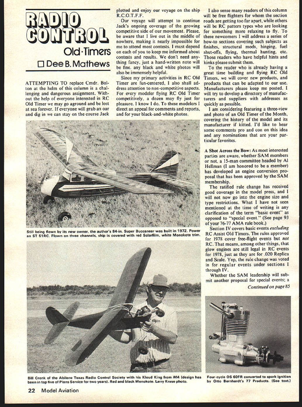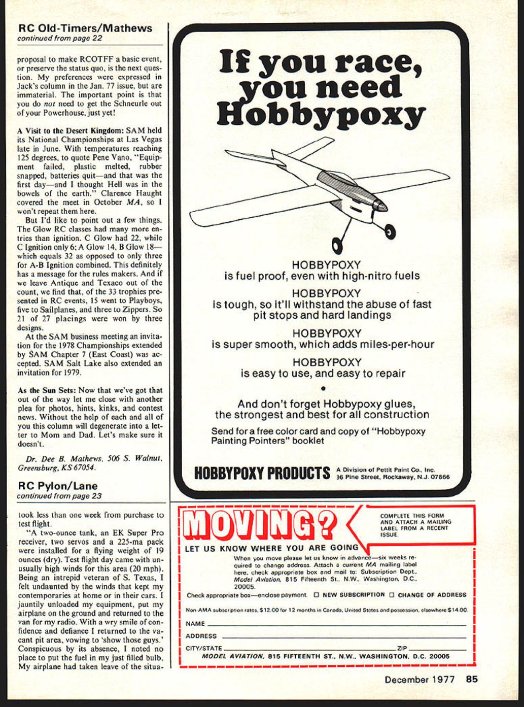 U Old Timers 0 Dee B Mathews ATTEMPTING TO replace Cmdr Bol ton helm column chal lenging dangerous assignment out help everyone interested RC Old Timer may go aground lost sea forever everyone will grab oar dig can stay course Jack plotted enjoy voyage ship RCOTFF voyage will attempt continue Jacks ongoing coverage growing competitive side movement Please aware live out middle nowhere making nearly impossible attend contests must depend keep informed about contests results dont need thing fancy just hand-written note will fine black white photos will also immensely helpful Since primary activities RC Old Timer fun-centered also shall ad dress attention non-competitive aspects modeler flying RC Old Timer competitively dozen may fly just pleasure know modelers direct appeal comments reports black-and-white photos also sense readers column will free fighters section roads getting too far apart others will RC pattern types looking something relaxing fly newcomers will address series how-to sections covering such subjects finishes structural mods hinging fuel shut-offs flying thermal hunting etc readers have helpful hints kinks please submit reader already having great time building flying RC Old Timers will cover new products products can adapted use Manufacturers please keep posted will try develop directory manufac turers suppliers addresses quickly possible am considering featuring three-view photo Old Timer Month covering history model its manufacturer kitted Id like hear some comments pro con idea nominations par ticular favorites Shot Across Bow As interested parties aware whether SAM members 15-man committee headed Al Hellman am honored member has developed engine conversion pro posal has approved SAM membership ratified rule change has received good coverage model press will now go engine size type restrictions What have seen mentioned time writing clarification term basic event opposed special event See page 93 76-77 AMA rule book Section IV covers basic events excluding RC Assist Old Timers rules approved 1978 cover free-flight events RC means among other things glow engines still legal RC events 1978 just 020 Replica Scale Yep rule change voted regular events under sections through IV Whether SAM leadership will sub mit another proposal special events 22 Model Aviation Still being flown its new owner authors 84-in Super Buccaneer built 1972 Power ST 51RC Flown three channels ship covered red Solarfilm white Monokote trim Continued page 85 Bill Cronk Abilane Texas Radio Control Society Kloud King MA design has Four-cycle OS UOFH converted spark Ignition top five Plans Service two years Red black Monokote Larry Kruse photo Otto Bernhardts 77 Products See text RC Old-Timers/Mathews continued page 22 proposal make RCOTFF basic event preserve status quo next ques tion preferences expressed Jacks column Jan 77 issue immaterial important point need get Schneurle out Powerhouse just yet Visit Desert Kingdom SAM held its National Championships Las Vegas late June temperatures reaching 125 degrees quote Pene Vano Equip ment failed plastic melted rubber snapped batteries quitand first dayand thought Hell bowels earth Clarence Haught covered meet October MA wont repeat Id like point out few things Glow RC classes en tries ignition C Glow 22 C Ignition 6 Glow 14 B Glow 18 equals 32 opposed three A-B Ignition combined definitely has message rules makers leave Antique Texaco out count find 33 trophies pre sented RC events 15 went Playboys five Sailplanes three Zippers So 21 27 placings won three designs SAM business meeting invita tion 1978 Championships extended AM Chapter 7 East Coast ac cepted SAM Salt Lake also extended invitation 1979 As Sun Sets Now weve got out way let close another plea photos hints kinks contest news Without help of column will degenerate let ter Mom Dad Lets make sure doesnt Dr Dee B Mathews 506 S Walnut Greensburg KS 67054 RC Pylon/Lane continued page 23 took less week purchase test flight two-ounce tank EK Super Pro receiver two servos 225-ma pack installed flying weight 19 ounces dry Test flight day came un usually high winds area 20 mph Being intrepid veteran S Texas felt undaunted winds kept contemporaries home cars jauntily unloaded equipment put airplane ground returned van radio wry smile con fidence defiance returned va cant pit area vowing show guys Conspicuous its absence noted no place put fuel just filled bulb airplane taken leave situa r race need bypoxy HOBBYPOXY fuel proof high-nitro fuels HOBBYPOXY tough itll withstand abuse fast pit stops hard landings HOBBYPOXY super smooth adds miles-per-hour HOBBYPOXY easy use easy repair 0 dont forget Hobbypoxy glues strongest best construction Send free color card copy Hobbypoxy Painting Pointers booklet PRODUCTS Division Pettit Paint Co Inc HuisBYPOXY Pine Street Rockaway NJ 07866 COMPLETE THIS FORM ND AlTACH MAILING ic~UEI BEL FROM RECENT LET us KNOW WHERE ou ARE GOING move please let us know advancesix weeks re quired change address Attach current MA mailing label check appropriate box mail Subscription Dept. Model Aviation 815 Fifteenth St. NW Washington DC. 20005 Check appropriate boxenclose payment 0 NEW SUBSCRIPTION 0 CHANGE OF ADDRESS Non-AMA subscription rates $1200 12 months Canada United States possession elsewhere $1400 NAME ADDRESS CITY/STATE _____________________________________________ ZIP _______________ MODEL AVIATION 815 FIFTEENTH ST. NW. WASHINGTON DC 20005 December1977 85