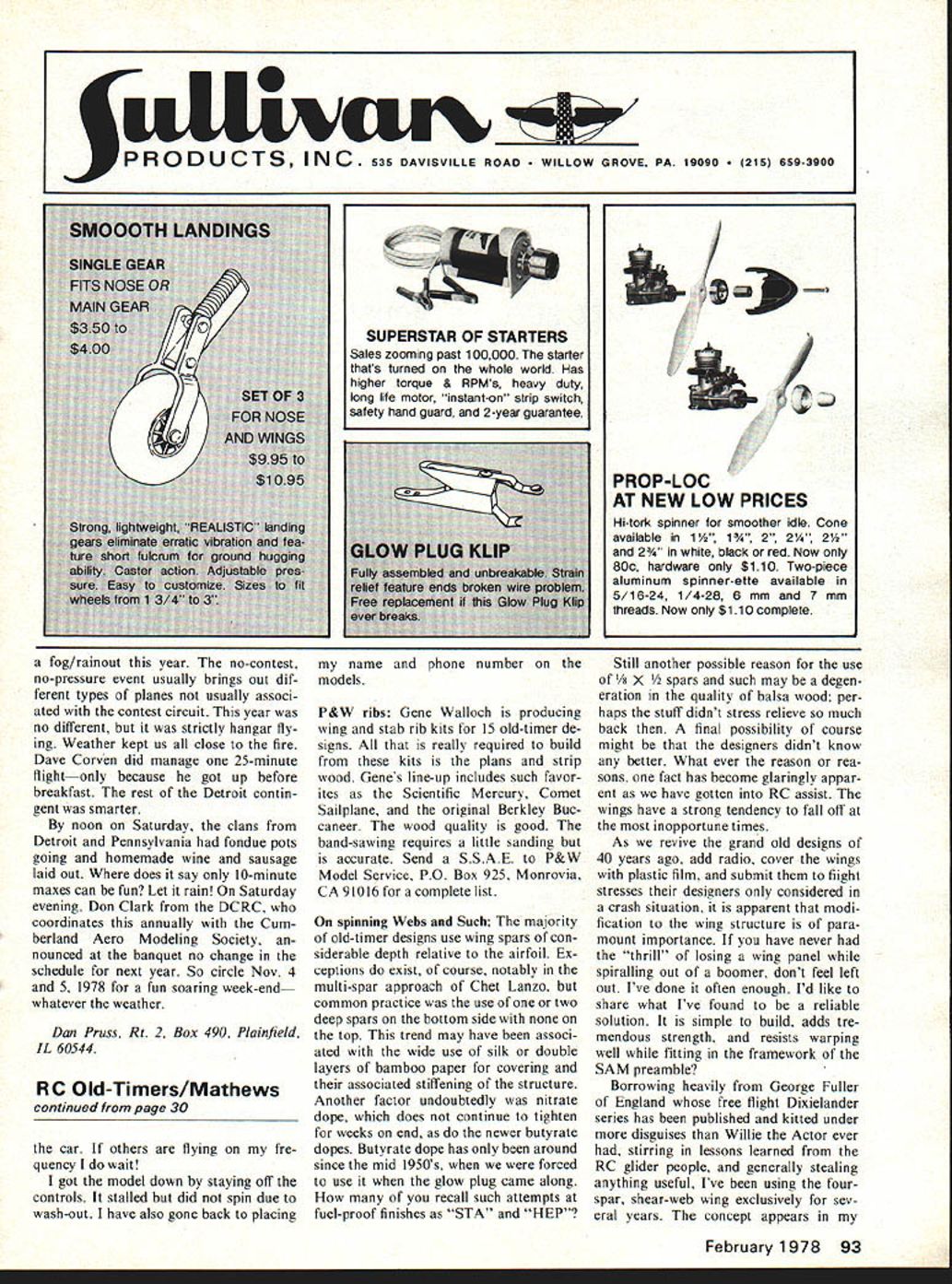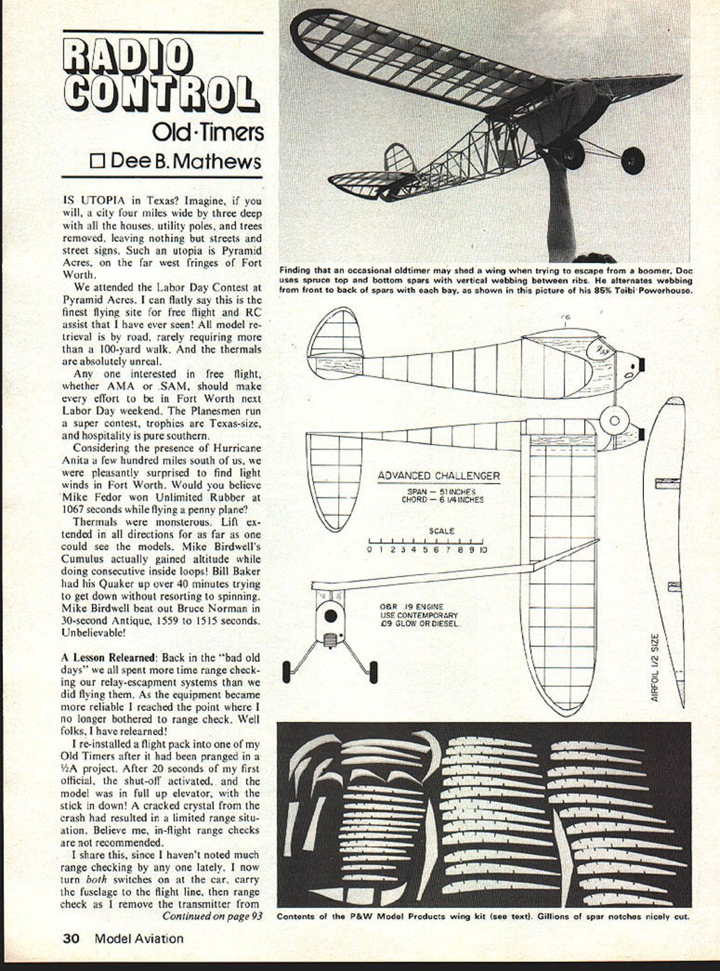 I Old Timers El Dee B Mathews IS UTOPIA Texas Imagine will city four miles wide three deep houses utility poles trees removed leaving nothing streets street signs Such utopia Pyramid Acres far west fringes Fort Worth attended Labor Day Contest Pyramid Acres can flatly say finest flying site free flight RC assist have ever seen model re trieval road rarely requiring 100-yard walk thermals absolutely unreal Any interested free flight whether AMA SAM should make effort Fort Worth next Labor Day weekend Planesmen run super contest trophies Texas-size hospitality pure southern Considering presence Hurricane Anita few hundred miles south us pleasantly surprised find light winds Fort Worth Would believe Mike Fedor won Unlimited Rubber 1067 seconds flying penny plane Thermals monsterous Lift ex tended directions far could see models Mike Birdwells Cumulus actually gained altitude doing consecutive inside loops Bill Baker Quaker up over 40 minutes trying get down resorting spinning Mike Birdwell beat out Bruce Norman 30-second Antique 1559 1515 seconds Unbelievable Lesson Relearned Back bad old days spent time range check ing relay-escapment systems did flying As equipment became reliable reached point no longer bothered range check Well folks have relearned re-installed flight pack Old Timers after pranged project After 20 seconds first official shut-off activated model full up elevator stick down cracked crystal crash resulted limited range situ ation Believe in-flight range checks recommended share since havent noted much range checking lately now turn both switches car carry fuselage flight line range check remove transmitter Continued page 93 ADVANCED CHALLENGER SPAN 51 INCHES CHORD 61/4 INCHES SCALE I 1 2 3 4 5 6 7 8 9 10 30 Model Aviation Finding occasional oldtimer may shed wing trying escape ,un boomer Doc uses spruce top bottom spars vertical webbing between ribs alternates webbing front back spars bay shown picture 85% Taibi Powerhouse w N cJ L Contents P&W Model Products wing kit see textl Gillions spar notches nicely cut fog/rainout year no-contest no-pressure event usually brings out dif ferent types planes usually associ ated contest circuit year no different strictly hangar fly ing Weather kept us close fire Dave Corven did manage 25-minute flightonly because got up before breakfast rest Detroit contin gent smarter noon Saturday clans Detroit Pennsylvania fondue pots going homemade wine sausage laid out does say 10-minute maxes can fun Let rain Saturday evening Don Clark DCRC coordinates annually Cum berland Aero Modeling Society nounced banquet no change schedule next year So circle Nov 4 5 1978 fun soaring week-end whatever weather Dan Pruss Rt 2 Box 490 Plainfield IL 60544 R C Old-Timers/Mathews continued page 30 car others flying fre quency wait got model down staying off controls stalled did spin due wash-out have also gone back placing name phone number models P&W ribs Gene Walloch producing wing stab rib kits 15 old-timer de signs really required build kits plans strip wood Genes line-up includes such favor ites Scientific Mercury Comet Sailplane original Berkley Buc caneer wood quality good band-sawing requires little sanding accurate Send SSAE P&W Model Service PO Box 925 Monrovia CA 91016 complete list spinning Webs Such majority old-timer designs use wing spars con siderable depth relative airfoil Ex ceptions exist course notably multi-spar approach Chet Lanzo common practice use two deep spars bottom side top trend may have associ ated wide use silk double layers bamboo paper covering associated stiffening structure Another factor undoubtedly nitrate dope does continue tighten weeks end newer butyrate dopes Butyrate dope has around since mid 1950s forced use glow plug came along recall such attempts fuel-proof finishes STA HEP Still another possible reason use /s X s such may degen eration quality balsa wood per haps stuff didnt stress relieve much back final possibility course might designers didnt know better What ever reason rea sons fact has become glaringly appar ent have gotten RC assist wings have strong tendency fall off inopportune times As revive grand old designs 40 years ago add radio cover wings plastic film submit flight stresses designers considered crash situation apparent modi fication wing structure para mount importance have never thrill losing wing panel spiralling out boomer dont feel left out Ive done often enough Id like share what Ive found reliable solution simple build adds tre mendous strength resists warping well fitting framework SAM preamble Borrowing heavily George Fuller England free flight Dixielander series has published kitted under disguises Willie Actor ever stirring lessons learned RC glider people generally stealing anything useful Ive using four spar shear-web wing exclusively sev eral years concept appears February 1978 93 fidtIi P R 0 D U CT S N C SVILLE ROAD OW GROVE PA 19090 659-3900 TI SUPERSTAR OF STARTERS Sales zooming past 100000 starter thats turned whole world Has higher torque & RPMs heavy duty long life motor instant-on strip switch safety hand guard 2-year guarantee PROP-LOC AT NEW LOW PRICES Hi-tork spinner smoother idle Cone available 1 1 2 2/4 21/2 2 white black red Now 80c hardware $110 Two-piece aluminum spinner-ette available 5/16-24 1/4-28 6 mm 7 mm threads Now $110 complete see local hobby dealer WI~E almost Stahl design40 years ago t~p tTA OGA 4 lOBts famous 24 1/2 WWdGSPAN 0% FOR PACKING AND POSTAGE VA NESIDENTS ADD 4% TAX RUBBER & CO2 WINNER AT THE 50th NATS Blot 221/2 WINGSPMI $695 Kioud King Ambivalent Dennyplane Miss Arpiem Brigadeer articles skeleton photo 85% Power house photo accompanying months column Depending model size four spruce spars ranging located approximately 30% 70% chord perpendicular other Fulldepth plywood dihedral joiners placed slotting ribs hacksaw stacks appropriate thickness epoxied flush spars Shear webs 1/16 balsa added grain running vertical alternating front rear spars picture