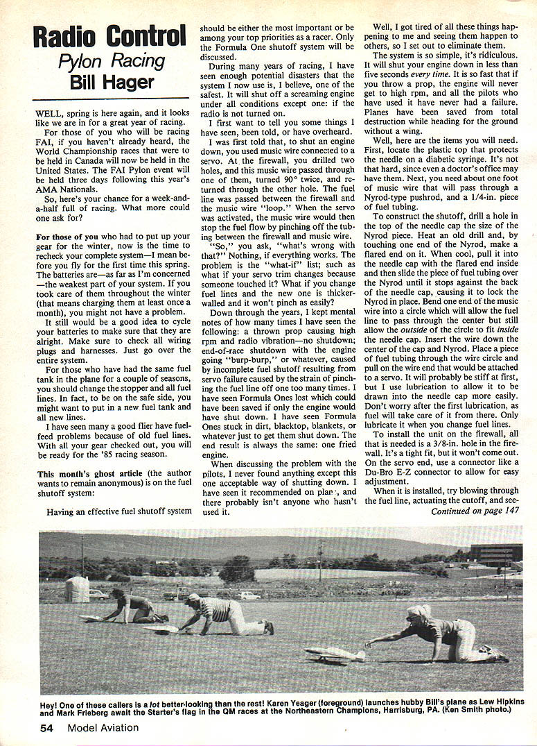 Radio Control Pylon Racing Bill Hager WELL spring again looks like great year racing will racing FAI havent already heard World Championship races held Canada will now held United States FAL Pylon event will held three days following years AMA Nationals So heres chance week-anda-half full racing What could ask put up gear winter now time recheck complete systemI mean fore fly first time spring batteries areas far Im concerned weakest part system took care throughout winter means charging least once month might have problem still would good idea cycle batteries make sure alright Make sure check wiring plugs harnesses Just go over entire system have same fuel tank plane couple seasons should change stopper fuel lines fact safe side might want put new fuel tank new lines have seen good flier have fuelfeed problems because old fuel lines gear checked out will ready 85 racing season months ghost article author wants remain anonymous fuel shutoff system Having effective fuel shutoff system should either important among top priorities racer Only Formula shutoff system will discussed During years racing have seen enough potential disasters system now use believe safest will shut off screaming engine under conditions except radio turned first want tell some things have seen told have overheard first told shut engine down used music wire connected servo firewall drilled two holes music wire passed through turned 900 twice re turned through other hole fuel line passed between firewall music wire loop servo activated music wire would stop fuel flow pinching off tub ing between firewall music wire So ask whats wrong Nothing everything works problem what-if list such what servo trim changes because someone touched What change fuel lines new thickerwalled wont pinch easily Down through years kept mental notes times have seen following thrown prop causing high rpm radio vibrationno shutdown end-of-race shutdown engine going burp-burp whatever caused incomplete fuel shutoff resulting servo failure caused strain pinch ing fuel line off too times have seen Formula Ones lost could have saved engine would have shut down have seen Formula Ones stuck dirt blacktop blankets whatever just get shut down end result always same fried engine discussing problem pilots never found anything except acceptable way shutting down have seen recommended plar probably isnt anyone hasnt used Well got tired things hap pening seeing happen others set out eliminate system simple its ridiculous will shut engine down less five seconds time fast throw prop engine will never get high rpm pilots have used have never failure Planes have saved total destruction heading ground wing Well items will need First locate plastic top protects needle diabetic syringe Its hard since doctors office may have Next need about foot music wire will pass through Nyrod-type pushrod 1/4-in piece fuel tubing construct shutoff drill hole top needle cap size Nyrod piece Heat old drill touching end Nyrod make flared end cool pull needle cap flared end inside slide piece fuel tubing over Nyrod until stops against back needle cap causing lock Nyrod place Bend end music wire circle will allow fuel line pass through center still allow outside circle fit inside needle cap Insert wire down center cap Nyrod Place piece fuel tubing through wire circle pull wire end would attached servo will probably stiff first use lubrication allow drawn needle cap easily Dont worry after first lubrication fuel will take care Only lubricate change fuel lines install unit firewall needed 3/8-in hole fire wall Its tight fit wont come out servo end use connector like Du-Bro E-Z connector allow easy adjustment installed try blowing through fuel line actuating cutoff seeContinued page 147 Heyl callers lot better-looking rest Karen Yeager foreground launches hubby Bills plane Lew Hlpklns Mark Frieberg await Starters flag QM races Northeastern Champions Harrisburg PA Ken Smith photo 54 Model Aviation er housing also gets hotabout 600 C worth Thats well range properly-designed circuit though uncom fortable hand Military elec tronics often required perform specification temperatures exceeding boiling fact boiling water can used cool some electronic systems point Id like comment earlier Astro 15 25 systems used 16 cells 055 12 Ah capacity respectively perfectly usable systems fact have beltdrive 15 version continuous use six years have worn out three brush sets belt drive Any having systems out service because charging frustrations can now dust off remember large motors discussed two columns ago Use simple charge system charge big battery packs need too recommend following convenient charge currents times packs essentially dead 055 Ah2 amps 15 minutes 08 Ah3 amps 15 minutes 12 Ah3 amps 20 minutes Yet come charging large packs including sophisticated elec tronically-controlled charger no resistor bank demanding skilled readers will based onyou guessed itthe Radio Shack Voltage Inverter Basic Electricity series has back burner temporarily plan resume next month stay us Meanwhile comment question may forwarded author SASE please Happy Electric Landings Bob Kopski 25 West End Dr Lans dale PA 19446 RC Pylon Racing/Hager Continued page 54 ing fast cuts air flow off will find tubing will need completely inside hole order stop air flow Also note no servo strain released flow position fuel tubing pops out hole activated engine running hear quick burp really works hope will give try saves once has paid itself besides make out scrap parts pieces last word Install fifth channel toggle switch Putting sys tem control stick normally used throttle rudder will definitely cause some exciting momentssuch possible engine shutdown after release move rudder stick position mistake shutdown system nownot halfway end servo throw As said before system de signed eliminate problems give try read columns either very interested racing already racing So support group people heartbeat Pylon Racing Join National Minia ture P
