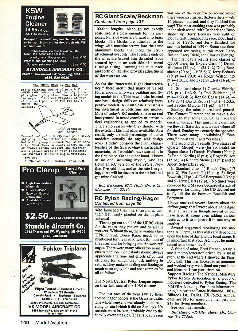 Radio Contml Pylon Racing Bill Hager RC PYLON RACING has come long way since got its start early Sixties Just about everyone flies RC gets involved some sort racing time another race anything basic trainer todays very fast Forumula seems club area has its own idea what fun race club area always few dedicated enough get interest fired up get ball rolling Sometimes people put together special interest groups just Racing course nationally have NMPRA National Miniature Pylon Rac ing Association also have lot special interest clubs area district associations United Pylon Racing Circuit UPRC over 15 years old just about oldest group still together UPRC its annual championship race September 22-23 1984 held Joe Davis State Park Lewiston NY hosted Niagara Sunday Fliers did excellent job Although looked like might short workers Saturday morning resolved itself races progressed smoothly both days workers endured sun heat Saturday cold drizzle Sunday complaint UPRC banquet held Satur day night three-star restaurant Lewiston just 10 minutes race site stories exchange about modeling racing ones wonand ones werent wives girl friends added class function made dinner much enjoy able Laura Mack topped off beauti ful dolls made door prizes women Sunday trophies awarded first through third places both Sport Formula two-day race top five event following mod elers Sport 1 Al Mack 39 ptl435 tied fast time 2 Dave Gierke 37 pt 1435 tied fast time 3 Ernie Nikodem 35 pt149 4 Gary Gau 34 pt146 5 Neil Watson 33 pt1475 Formula winners 1 Jim Meyer 35 pt126 fast time 2 Bill Brandow 30 pt1285 3 Al Mack 28 pt1295 4 Gary Gau 18 pt 1355 5 Ernie Nikodem 9 pt 1325 Engines used included six Supertigres three K&Bs Webra prizes everyone sponsors race starting workers could pick what wanted fliers turn names drawn hat would say everyone got merchandise entry fee cost picked what could use Thanks spon sors Sunday Fliers doing final race up big fitting climax last UPRC race 1984 UPRC also season point-cham pions event Trophies pre sented 1984 winners Al Mack 1984 UPRC overall season champ also season point-champ Bill Brandow Formula UPRC winner second season row Dave Kelly fast time Formula trophy sponsored Depew Hobby Center fast time 122 Sport Pylon fast time trophy 1984 sponsored Fields Hob Center went Jerry Muscato time 139 flier chosen Most Improved Racer 1984 Mark Sciandra Two Big Foot awards given callers Continued page 140 50 Model Aviation Action United Pylon Racing Circuit Start Sport Pylon race callers launch ing Left right Jerry Muscato John Raymonda Bill Brandow Pliot Bruce Knox Big Guns UPRC 1984 L R Bill Brandow Formuis i season champ Al Mack overaii champion 1984 season Look great individual trophies big trophy resting ground isthe perpetual awarded bythe circuittoAl Mack SUPER HAWK FLY MAX relaxing change pace build SUPER HAWK rubber model 1 hour plus glue drying time Show beginner magic thermal flights clubs next picnic funfly try SUPER HAWK contest 15 Wingspan 20 Length Promotional price $1495 plus $165 ahipping US number Write group discount 12 kits Send check money order No COD credit cards Dealers distrib utors please write letterhead standard discount quantities FLY MAX 1i129A Fox Dale ey Ohio 45365 RC Giant Scale/Beckman Continued page 137 100-foot lengths Although exactly scale size its close enough pur poses Pairs wires brazed brass blocks blocks attached wings machine screws same aluminum blocks hold strutattachment eyebolts fuselage ends wires brazed threaded studs secured nuts side metal fuselage fitting Running nuts back forth stud provides adjustment wire tension As uncertain flight characteris tics arent us old fogies around building fly ing models Thirties learned basic design skills relatively inex pensive models Giant Scale aircraft big investment both time money Most todays RC modelers have no real background aerodynamics aeronau tical engineering applied models Theres no reason should excellent kits plans available As result small percentage active modelers actually real design work didnt consider flight charac teristics Sparrowhawk particularly uncertain wouldnt have started first place other hand know no including myself has flown RC version F9C-2 Now Ive said rate Im go ing will dozens air before get finished Bob Beckman 8248 Holly Grove Ct Manassas VA 22110 RC Pylon Racing/Hager Continued page 50 launched fliers airplanes feet firmly planted airplane antenna Thanks go out UPRC clubs races put workers Without wouldnt UPR Circuit Bruce Knox needs mentioned matrix did races bringing out workers cages others too numer ous mention Contestants should always appreciate time efforts contest officials ask nothing return make modeling Racing much enjoyable examples follow North Central Pylon League reports last race 1984 season last race year saw 16 fliers competing honors Grassfield site whole weekend cloudy threat ening rain did Sunday No records broken probably due heavily overcast skies first days race very few record no crashes Sixteen flierswith 16 planesstarted finished way exciting race probably sixth round Bednark Brue shaber up Jerry Bednark right Dougs tail throughout race Doug time 1286 Jerry finished 16 seconds behind 1290 Some new faces appeared racing meet Larry Rosine Larry Riehl Charles Eldridge first days results two classes QSOO Expert class 1 Dennis Hoffman 22 pt1257 2 Doug Brue shaber 20 pt1266 3 Jerry Bednark 19 ptl290 4 Roger Wilson 19 pt1311 5 Jerry Elert 16 pt 1341 Standard class 1 Charles Eldridge 18 pt1435 2 Phil Zuidema 15 pt1334 3 Ronald Edgar 14 pt 1492 4 David Rech 14 pt1535 5 Rick Mercier 11 pt1446 Sunday rains poured poured Contest Director make de cision after some thought made decision race rains finally quit flew Saturday race finished Sunday exactly opposite no-finishes cut outs no-starts crashes second days results two classes Quarter Midget six heats Expert class 1 Dennis Hoffman 20 pt 2 Daniel Norlin 18 pt 3 Roger Wilson 15 pt 4 Richard Steine 11 pt 5 Albert S