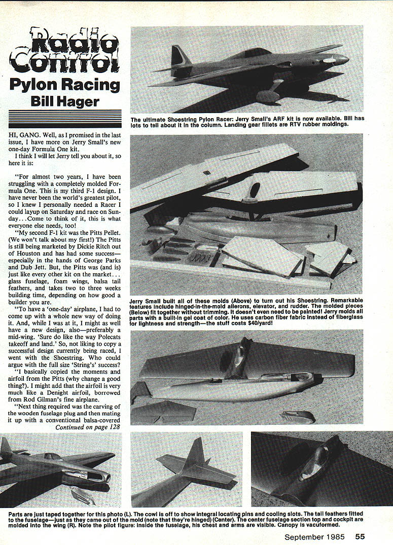 Pylon Racing Bill Hager HI GANG Well promised last issue have Jerry Smalls new one-day Formula kit think will let Jerry tell about almost two years have struggling completely molded mula third F-i design have never worlds greatest pilot knew personally needed Racer could layup Saturday race Sun day. Come think what everyone else needs too second F-i kit Pitts Pellet wont talk about first Puts still being marketed Dickie Ritch out Houston has some success especially hands George Parks Dub Jett Pitts just like other kit market. glass fuselage foam wings balsa tail feathers takes two three weeks building time depending good builder have one-day airplane come up whole new way doing might well have new design alsopreferably mid-wing Sure like way Polecats takeoff land So liking copy successful design currently being raced went Shoestring could argue full size Strings success basically copied moments airfoil Pitts change good thing might add airfoil very much like Denight airfoil borrowed Rod Gilmans fine airplane Next thing required carving wooden fuselage plug mating up conventional balsa-covered Continued page 128 Jerry Small built molds Above turn out Shoestring Remarkable features Include hlngedlnthemold ailerons elevator rudder molded pieces Below fit tether trimming doesnt need paInted Jerry molds parts bulltln gel coat color uses carbon fiber fabric Instead fiberglass lightness strengththe stuff costs S4OIyardl Parts Just taped together photo 1 cewi cff show Integral locating pins cooling slots tall feathers fitted fuselageJust came out mold note theyre hinged Center center fuselage section top cockpit molded wing R Note pilot figure inside fuselage chest arms visible Canopy vacuformed September 1985 55 ultimate Shoestring Pylon Racer Jerry Smalls ARF kit now available Bill has lots tell about column Landing gear fillets RTV rubber moldings Model Magic Epoxy Plus 2 Part 8 Mm Use anywhere two part epoxy used 25% Lighter Sandable Carveable Excellent Gap Filling Non-Sagging Superior Strength$fl95 Sands Carves like Basswoodl l lB fi ozl Equal over 8 wt oz regular epoxys See voar dealer first write call r4V4 PO Box 19784 St Paul MN 55119 715 425-1397 MODEL MAGIC PRODUCTS 0 Model Magic Filler S 0 S 0 Comparison Chart Model Magic Product X Adhesion Balsa Excellent Foam Fiberglass Strength Flexing Spreading Fsel ResistanceCood Sanding As med balsa Hardness As hard balsa Finishing Any finish/covering Shelf Life till used up Tint Acceptance Excellent water Resist Excellent 0 very Poor Soft balsa Soft balsa 57 mo Very Poor Test methods data available request care enough fill very best insist Model Magic Filler Circus Magic Filler NOWWORRY FREE STARTING POWER New completely automatic maintenance system wet galled cells Na rat-dawn batteries xplosive gasses penS rated lunderchartedi No winter storage problems Na boiled-dry batteries ttention required-electronically loverchargedl maintains fall charge Sm eax pxmx saraJUST ONNET tTrHEN FORGET tT saSan soon woor 50,s Hmn 005 Momlapeclfy 6 12 volt 2am sow PO Box 22t $4995CaRacanton 50 570t3 pla516051 9875924 $250 5&H PFOJCtS SASS intormation GOLDEN GAlE HOBBIES Y S ENGINES HATORI HEADERS/PIPES TETTRA HARDWARE ATLANTA 60 OMEGA 60 QUATRO 40 EXCEED 40 ACROSTAR SIGMA 60/40 BD-5 CANADAIR CT-114 SEE YOUR LOCAL HOBBY DEALER SEND $1 FOR CATALOG PO Box 4412 Burlingame CA 94010 TEL 415 4673170 Now have decided machine will buy get read instruction manual thoroughly Next month Ill discuss what comes next way plan write department anthology form can collect use later date expert can use later date Like maybe December can burn use stay warm months three-view Westland Lynx very capable military machine First proposed 1968 Lynx com bination effort between Westland Great Britain Aerospatiale France Designed two services Lynx very capable anti-tank helicopter armed TOW missiles British Army equally home sea used Royal Navy anti submarine helicopter Lynx may aerobatic full-size helicopter world does exhibit roll rate 180 0/second semi-rigid rotor head can absorb up negative four G enabling Lynx fly inverted short periods Lynx certainly going begging model subject believe John Griffiths stocks glass fuselage England Does anybody over have BCNU RC Pylon Racing/Hager Continued page 55 foam wing Molds made fuselage mold typical right left half wing mold topand-bottom affair top deck ing/canopy area included Also sup ported 1-in steel-tube frame wing originally separate molds ailerons meant ailerons added later pain have since corrected will cover lit tle later fuselage layup conventional wing required whole new learning process first tried two layers glass cloth went Keviar big pain Larry Jolly 5501 West Como Santa Ana CA 92703 have finally settled single layer car bon fiber cloth about 6-ounce weave about ten-thousandths thick costs $40/yard OUCH spar evolved 1/4-in balsa full-length 3/16-in spruce full-length 1/4-in balsa triangle pieces both sides spar touched wing skins Epoxy has always used next step mold set tail feathers try something new. hinge mold carved both surfaces proceeded make two-piece molds hinge line both prior layup inserted hacksaw blades actually touched hinge line non-toothed edge two mold halves separated now hard thin metal edge right hinge line should laying up tail surfaces lay carbon fiber cloth yeah expensive stuff too either side hacksaw blade 1/8-in spruce sticks touching full length blades both sides add hinge material top blades put fresh glue around edges close molds About two hours later using oven tail feathers can remQved ready used ly hinged have necessary filleting done groove underneath side elevator con trol horn perfect match rear fuselage George Parks took prototypes used fiveminute epoxy said took no 30 minutes whole rear end Since hinging tail assemblies worked well went back modified wing mold too comes out mold already hinged torque rods place Also wanted wings inter changeable made drill jig now drill tap wing countersink fuse