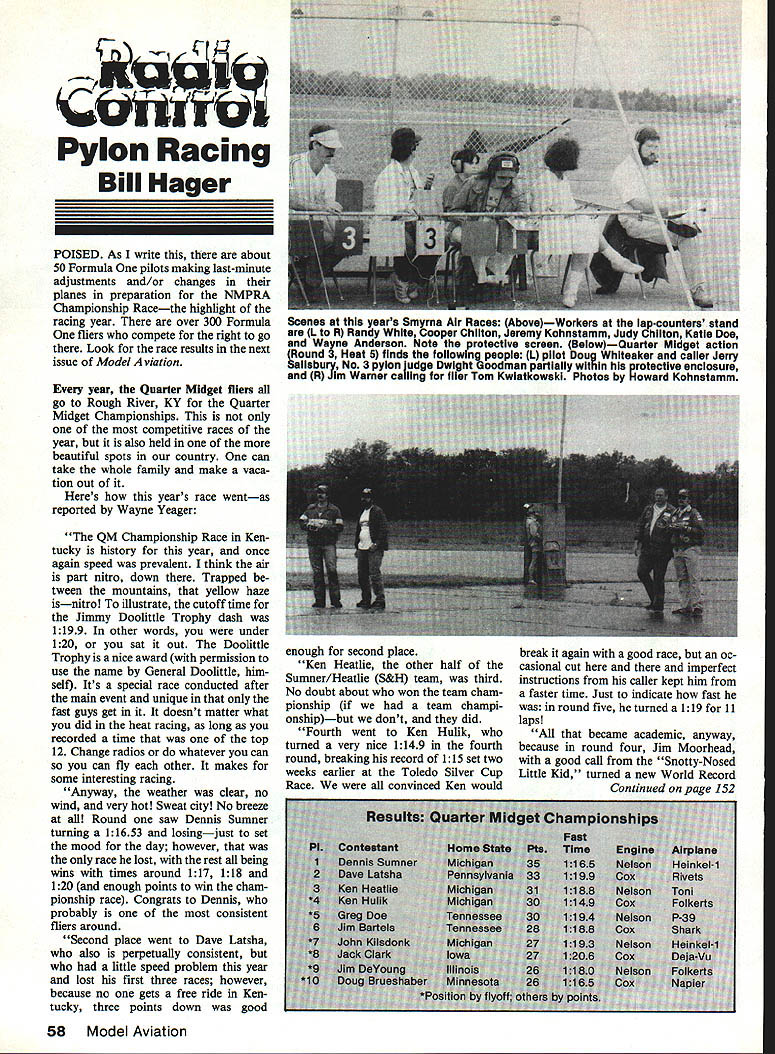 Pylon Racing Bill Hager POISED As write about 50 Formula pilots making last-minute adjustments and/or changes planes preparation NMPRA Championship Racethe highlight racing year over 300 Formula fliers compete right go Look race results next issue Model Aviation year Quarter MIdget filers go Rough River KY Quarter Midget Championships competitive races year also held beautiful spots country can take whole family make vaca tion out Heres years race wentas reported Wayne Yeager QM Championship Race Ken tucky history year once again speed prevalent think air part nitro down Trapped tween mountains yellow haze isnitro illustrate cutoff time Jimmy Doolittle Trophy dash 1199 other words under 120 sat out Doolittle Trophy nice award permission use name General Doolittle him self Its special race conducted after main event unique fast guys get doesnt matter what did heat racing long recorded time top 12 Change radios whatever can can fly other makes some interesting racing Anyway weather clear no wind very hot Sweat city No breeze Round saw Dennis Sumner turning 11653 losingjust set mood day however race lost rest being wins times around 117 118 120 enough points win cham pionship race Congrats Dennis probably consistent fliers around Second place went Dave Latsha also perpetually consistent little speed problem year lost first three races however because no gets free ride Ken tucky three points down good enough second place Ken Heatlie other half Sumner/Heatlie S&H team third No doubt about won team cham pionship team champi onshipbut dont did Fourth went Ken Hulik turned very nice 1149 fourth round breaking record 115 set two weeks earlier Toledo Silver Cup Race convinced Ken would break again good race oc casional cut imperfect instructions caller kept him faster time Just indicate fast round five turned 119 11 laps became academic anyway because round four Jim Moorhead good call Snotty-Nosed Little Kid turned new World Record Continued page 152 Ionu 58 Model Aviation Scenes years Smyrna Air Races AboveWorkers iapcounters stand L R Randy White Cooper Chilton Jeremy Kohnstamm Judy Chliton Katie Doe Wayne Anderson Note protective screen BeiowQuarter Midget action d 3 Heat 5 fInds foliowing people L piiot Doug Whiteaker caiier Jerry iisbury No 3 pylon judge Dwight Goodman partiaiiy within protective enciosure R JimWarner esi iing liier Tom Kwiatkowski Photos Howard Kohnstamm MULTIPLEX DEALER INQUIRIES INVITED 2001 FM Narrowbond RCM 14 MEMORY SOFT MODULE Cli ROYAL mc! Flight Tested Since 1979 himrr i& 02 7725 E REDFIELD RD SUITE 105 SCOTTSDALE AIRPARKO SCOTTSDALE ARIZONA 852600 PHONE 602 483-9577 Clinic last year something funny happenedthere practically no takers Clinic Electric suddenly grew up Very nearly everyone everything up running well Result Clinic discontinued year served its purpose seems its time past What better testimony present advanced Electric state Next year Well its too early know sure theres some discussion about adjusting format meet keep pace progress Electric modeling steadily-increasing Electric participation proficiency year brings can see possibility being some specialized events catering desiring flex Electric muscles Thus next year may see word contest associated some events can never see word fun-fly disassociated basic KRC Electric FlyI believe will always plenty low-key atmos phere available meet famous Finally accolades KRC members ran showthe biggest best Electric Fly ever KRC Field Officer Ed Schmitt KRC Secretary Ken Stinson two gentlemen teamed up took monumental task organizing years meeta near year-long job now realize supported assisted nearly KRC member two-thirds dont fly Electric accommodation assistance would no Electric Fly Now behalf Officers Membership Keystone RC Club hearty sincere Thank model hobby industry provid ed huge amounts support Elec tric cause traveled very far friends families join us hearty sincere Thank toofor Electric Fly Please direct comment question SASE please author Bob Kopski 25 West End Dr Lansdale PA 19446 may happy quiet land ings yours RC Giant Scale/Beckman Continued page 57 strong flat firewall radial mount simply bolted firewall engine installed mount addition fuel tank four-oz oil tank re quired Throttle linkage installation ignition box servo-controlled ignition switch completes job Operation Edwards Radial Engine realistic its sound First fuel aircrat check oil level tank ignition OFF pull propeller around least five times make sure oil has gathered lower cylinders Next ignition still OFF open throttle full choke car buretor intake pull prop through several turns Now set throttle fast-idle position turn ignition ON flip prop engine will start As full-scale engine needs few minutes warm-up before ready put out full power Forests 28-lb Fleet will take off 1/3 throttleand cruise less power requested maneuvers its some spare Ive seen several radial engines designed model use first Ive seen its size weight seems put out enough power provide scalelike operation engine available ap proximately $3000a not-unreasonable price considering work involved information contact Edwards Engine Co 12645 Amber Lane Grass Valley CA 95949 Beautiful Beech D-18 Over years have reported models designed built Phil Karafilis San Ramon CA Phil former airline pilot retire several years ago health reasons kept right flying though via models Last year way 1984 IMAA Fun Fly Festival Los Angeles spent few days visiting friends Infroduclng. iirebull RIC Idle-Bar Glow Plugs Long Short Also.Only $169 Traditional line non-idle bar Glow Plugs Six Types 3 Heat Ranges High Performance Glow Element Blow Proof Seal Swanson Associates PO Box 151 Wayne NJ 07470 Only $129 SHED p946 C. ASSOCIATES INC 25558 CLOUD WAY ASO CA 94555 455-783-55AA C JO January1986 151 / Kraft RIC Electronics PERSONAL SERVICE BY ERB SPECIAL LOW PRICESService charge repair and/or checkup system four servos $2975 maximum Extra servos$250 Parts return shipment extra FREQUENCY CONVERSIONSS30