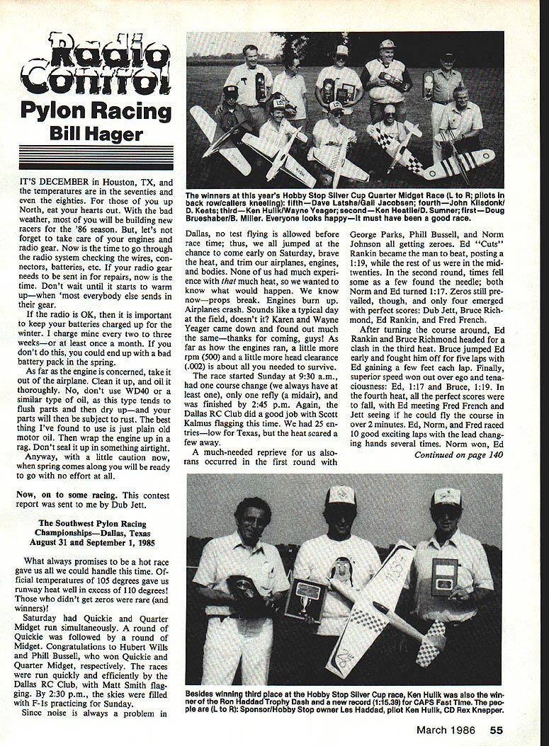 Pylon Racing Bill Hager ITS DECEMBER Houston TX temperatures seventies eighties up North eat hearts out bad weather will building new racers 86 season lets forget take care engines radio gear Now time go through radio system checking wires con nectors batteries etc radio gear needs sent repairs now time Dont wait until starts warm upwhen everybody else sends gear radio OK important keep batteries charged up winter charge two three weeksor least once month dont could end up bad battery pack spring As far engine concerned take out airplane Clean up oil thoroughly No dont use WD4O similar type oil type tends flush parts dry upand parts will subject rust best thing Ive found use just plain old motor oil wrap engine up rag Dont seal up something airtight Anyway little caution now spring comes along will ready go no effort Now some racing contest report sent Dub Jett Southwest Pylon Racing ChampionshipsDallas Texas August 31 September 1 1985 What always promises hot race gave us could handle time ficial temperatures 105 degrees gave us runway heat well excess 110 degrees didnt get zeros rare winners Saturday Quickie Quarter Midget run simultaneously round Quickie followed round Midget Congratulations Hubert Wills Phill Bussell won Quickie Quarter Midget respectively races run quickly efficiently Dallas RC Club Matt Smith flag ging 230 pm skies filled F-ls practicing Sunday Since noise always problem Dallas no test flying allowed before race time thus jumped chance come early Saturday brave heat trim airplanes engines bodies None us much experi ence much heat wanted know what would happen know nowprops break Engines burn up Airplanes crash Sounds like typical day field doesnt Karen Wayne Yeager came down found out much samethanks coming guys As far engines ran little rpm 500 little head clearance 002 about needed survive race started Sunday 930 am course change always have least refly midair finished 245 pm Again Dallas RC Club did good job Scott Kalmus flagging time 25 en trieslow Texas heat scared few away much-needed reprieve us also rans occurred first round George Parks Phill Bussell Norm Johnson getting zeroes Ed Cuts Rankin became man beat posting 119 rest us midtwenties second round times fell some few found needle both Norm Ed turned 117 Zeros still pre vailed though four emerged perfect scores Dub Jett Bruce Rich mond Ed Rankin Fred French After turning course around Ed Rankin Bruce Richmond headed clash third heat Bruce jumped Ed early fought him off five laps Ed gaining few feet lap Finally superior speed won out over ego tena ciousness Ed 117 Bruce 119 fourth heat perfect scores fall Ed meeting Fred French Jett seeing could fly course over 2 minutes Ed Norm Fred raced 10 good exciting laps lead chang ing hands several times Norm won Ed Continued page 140 March 1986 55 winners years Hobby Stop Silver Cu p Quarter Midget Ilace L H pliots back rowlcaiiers kneeiing fifthDave Latsha/Gaii Jacobsen fourthJohn KIlsdonkl D Keats thirdKen Huii klWayne Yeager secondKen HeatiielD Sumner firstDoug BrueshaberlB Miiier Everyone iooks happyit must have good race Besides winning third piace Hobby Stop Siiver Cup race Ken Huiik aiso win ner Ron Iladdad Trophy Dash new record 11539 CAPS Fast Time peo pie L R Sponsor/lobby Stop owner Les Haddad pilot Ken Huilk CD Rex Knepper Bell 47 became worlds first helicopter certified commercial opera tion Forty years 23 variants 30 user countries later Bell 47 still going strong Approximately 6000 machines built Merced saw large gas-powered Bell 47 Hirobo fly outstanding being very prototypical mannerisms like large moth flying about Helicopter Other models 47 available excellent Morley 40-size Graup ner 21-size have seen Morley fly also good Until next time good luck keep trying nothing satisfying overcoming difficult problem BCNU Larry Jolly 5501 W Como Santa Ana CA 92703 RC Pylon Racing/Hager Continued page 55 cut out Fred finished second Beginning fifth heat Bruce Fred Rick Oliver tied point down followed Dub two points down Rick Thumbs Oliver nosed over racing Ed posted fourth sub-120 time Dub Norm headed out next what promised best day Six hard laps followed lead changing hands least six times Neither gave wanting lose sec ond meeting year Suddenly Norms engine blew forced him land prop freewheeling Dub got fast time 116thanks Norm meantime Phill Bussell Gary Heithold met another exciting races Both broke 120 Gary winning nose race ended ties first secondBruce against Fred Ed Rankin versus Gary Heithold fourth fifth Bruce Fred flying Jerry Smalls Shoestrings raced neck neck eight laps before Fred kissed ground pylon three Dub calling Bruce got excited called Bruce down lap nine Bruce dead-stick lap 10 landing about 500 feet long Bruce slightly upset race marked debut en masse Jerrys Shoestring flying say fly great know fast build about eight hours Jerry built Dick Ritch looked like million dollars other excitement Bruce Richmond beeper Seems little Richmond God help us due equipped wife Sandi electronic gear Things look 86 new Formula engine product list racer FAI racing props fuel lots con test reports lots have anything interest please send indirectly See races Bill Hager 706 Glen Haven Dr Conroe TX 77385 FF Scale/Warner Continued page 63 lost progress living proof Indoor never sport could eventually become extinct already has become South France Peanut Scalers have drive hundreds miles find Indoor site read time after time what little real estate left us being priced out reach managers equate us admissions-paying basketball game Helping Juniors helps keep Burbank RACE L~EA L BEGINNER RACESU Instructions 0-500 -i FAI Programs Information Contact NORTH EAST PYLON RACING ORGANIZATION 119 DEAN AVE FRANKLIN MASS 02038 Tel 611 528-4043 203 613 -2000 140 Model Aviation New Breed 1 Schs/D#ulaaw test weight hand unit rady4-moeuht agkesa wondered would have aban RC Helicopters/Jolly doned first place respond call Continued page 138which luckily didnt come Cuts Ra