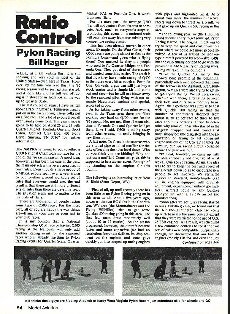 Radio Control Pylon Racing Bill Hager WELL am writing still snowing very cold United Stateseven Texas ever time read 86 racing season will just getting started looks like another full year rac ing store us AA way up Quarter Scale last couple years have written about race Smyrna Tennessee usually put early spring folks put fine race lot people over usually come years race going held April 26 27 Quarter Midget Formula Sport Pylon Contact Greg Doe 407 Pony Drive Smyrna TN 37167 further information NMPRA trying put together Q500 National Championship race end 86 racing season good idea however has case past main obstacle area uses its own rules though large group NMPRA people spent over year trying put together good workable set rules everyone would use end result still different sets rules days year situation seems matter majority fliers thousands people racing some type Q500 racer part happy way things areflying area just club races opinion National Championship Q500 race having Q500 racing Nationals will add another Racing event seasoned racer already traveling Pylon Racing events Quarter Scale Quarter Midget FAL Formula wont draw new fliers part average Q500 flier will venture area com pete much everyones surprise promoting event national scale will take away existing very competitive racing events has already proven other areas Example West Coast Q500 racers going almost fast Formula Onesand guess flying guessed people used fly Quarter Midget mula got tired events wanted something easier catch now have made racing Q500 area bit tough Formula Oh yeah guy can still just buy stock engine simple kit come out racebut will get blown away seasoned pilot flying not-sosimple blueprinted engines special reworked props As taking away other events Texas area fliers working very hard Q500 racers 86 season No new fliers mean oldtimers Formula Quarter Midget fliers Like said Q500 taking away other events really bringing new fliers last note fliers areas use tuned pipe tuned muffler sake keeping noise level down think kidding just use muffler Come guys supposed novice event Enough standing soapbox month following interesting letter Al Richt Scott Depot WV First up until recently has little no Pylon Racing going area About five years ago however two RC clubs Charles ton WV area Mountaineers Flying Hillbillies tried get some Quickee 500 racing going area first few races drew moderately well about 10 12 entries As season progressed however aircraft became faster expensive no restrictions beyond 040 cu displace ment engines some guys quickly got souped-up racing engines pipes high-nitro fuels After about four races number active racers down three As result just gave up Quickie 500 racing area folloving year Hillbillies Club decided try get some AA Pylon Racing started original intent try keep speed cost down point could get people volved few us argued Honkertype aircraft powered reed-valve 049s club finally decided go provisional AMA AA Pylon Racing rules big mistake opinion Like Quickee 500 racing showed some promise beginning particularly discovered some fellows Ashland KY/Hunt ington WV area also trying get AA Pylon Racing set up racing schedule alternating between field monthly basis Again experience similar Quickie 500 racing number contestants dropped about 10 12 per race three five after about six contests tried deter some started program dropped out found simply became disgusted ag gravation trying get consistent engine runs out Cox TD engines As result AA racing circuit collapsed before year out 1984 however came up idea probably original what call Quickee 25 racing Again idea try keep cost speed aircraft down encourage new people get involved restricted engines standard non-Schnurle 025 cu engines equipped originalequipment expansion-chamber-type muf flers Aircraft could Quickee 500-type kit l25o airfoil no modifications Soon after got Q-25 racing started Hillbillies club found out Ashland-Huntington club come up basically same concept except restricted use OS 25 FSR engines As result scheduled few combined contests see two sets rules compatible Surprisingly enough discovered baffled engines mostly HR 25s Fox Continued page 160 Bill thinks guys kidding bunch hardy West Virginia Pyion Racers Just substitute skis whecis GOI 54 Model Aviation Ly APPLIED DESIGN CORPORATION 738 Penn St El Segundo CA 90245 MINI ER ADJUSTABLE TENSION HAND BELT SANDER FIRMLY HOLDS PAPER FOR EASIER SANDING Padded lIsts end curves Handy Held Easy Use $235 MINI-STRIPS PRECISION DIE-CUT Medwm Garnet SAVES TIMEREPLACEMENTFine Garnet AND EFFORT $155SANDING BELTSAssId Water Praul TEE ALUMINUM EXTRUSION SANDING eLOCK let use 1111 CUFF-STUFF Self-adhesive sand paper Large Tree Surtace WeeIWesrOut lllechS250 Handy Iv Use 22 Inch $3 65 RUFF && STUFF SELF ADHESIVE SHEET SANDPAPER MAKE YOUR OWN SPECIAL SANDING SHAPES Easy te Use mesay give er drying Urns Media Flee r Flee $99 M N & SAW COMPACT 10 inch HACK SAW SAWS ANYTHING ANYWHERE Saw has nagged div-cast frame cemlertable chip-preet plastic lit sert handle Receding sue ad jastable B blade gives gad marIa access Cats weed pivatic metal HARDENED MUSIC WIRE extra htsdes-3/S1 99 RC Electrics/Kopski Continued page 157 pears behind pointer itself image disappears know youre look ing pointer scale markings directly line Thats end another column folks hesitate say what well cover nextthe Electric activity too dynamic what ever Ill best keep commin Please appreciate fact columns necessity limited length Per haps not-too-distant future Electric will grow sufficient size have its own magazine Till next time. Please forward comment query SASE please Bob Kopski 25 West End Dr Lansdale PA 19446 careful NOT hit switch holding Electric lapI RC Pylon Racing/Hager Continued page 54 25 competitive OS 25 FSRs fact first three places two combined contests held late fall 1984 taken non-Schnurle engines encouragement decided try set up another two-club racing circuit 1985 have seven races month far year 