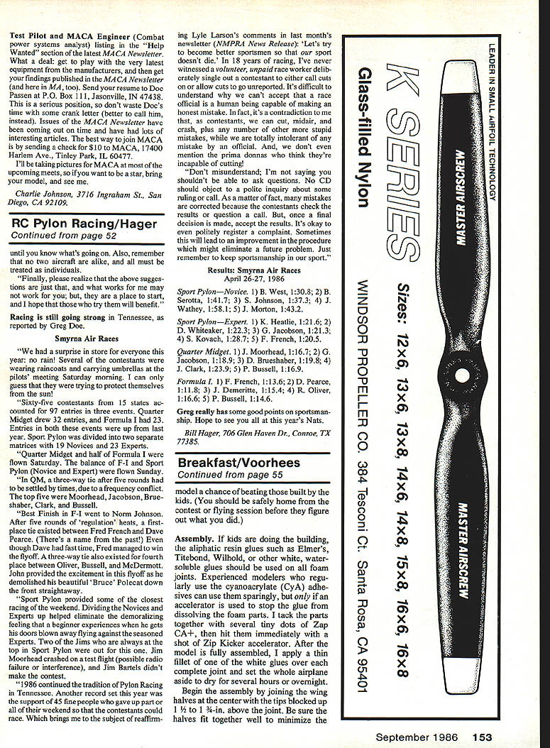 Radio Control Pylon Racing Bill Hager WANT report Ijust got back race Dallas TX put Dallas RC Club group has lost its touch proven two days fine racing enjoyed 28 entries Formula Thanks guys great Fred French got together followed Bruce Richmond Bruce Hobbs Chris Stubbs Terry Rollins Richard Oliver Ed Rankin flew fastest time ever 11304 meets Fast Time contest got first look new airplane Jerry Small called Estrellita Yes thats same Jerry Small built Shoe string time think Jerry has outdone himself think will plane beat Ill have tell next issue As promised last issue following should help some go faster Over years have seen fliers very fast planes could seem put together race day problems have noted lot time fault plane trimmed Recently Dave Shadel wrote article flight trim Pylon Racer Flight Trim Pylon Racing Aircraft Trimming models types racing critical maximum performance realized Just because designer says proper center gravity location should given point wing doesnt mean its ironclad same holds true recommended control throws nothing good place start first flight have bad airplanes required just two flights trim others still being change4 25 30 flights lives Weather conditions can change way aircraft flies due air density also affects power output engine What boils down plane trimmed given set conditions necessarily trimmed right another day fly area has fairly weather lucky setup likely change much week week suggest testing reasonably calm days testing new model like proceed follows Bear mind have doing long time much what based what works hope will serve basis find techniques work too 1 first step trimming process starts workshop Make certain radio installation correct radio does center its servos properly no good does center findout fix same goes radio drifts temperature changes 2 Use tape seal other method allows free movement surfaces keeps air bleeding through hinge lines 3 Balance aircraft per kit manufactur er s recommendation Never sacrifice proper radio installation purpose balancing aircraft example never put battery pack under fuel tank F-I aircraft Reason cant put enough foam around battery protect vibration better off adding nose weight tail weight get plane balance right 4 Now fly aircraft Set trims plane flies dead level pitch roll release control sticks Take aircraft up high enough can level wing dive model 30- 45-degree angie under full power Release control sticks see what happens model slowly pulls out dive nose-heavy steepens dive tail-heavy continues its dive its just right know sounds backwards 5 Now comes part guys overlook Get up high enough roll aircraft knife-edge pull Up elevator Dont pull hard since havent set throw its too much will induce snap roll may recover enough times can determine whether amount elevator throw produces turn radius comfortable Dont try turn model too tightly No 1 pylon because kills speed Better cruise around No 1 pylon bang slow model down 6 Once get throw set liking try few turns like flying No 1 pylon Have friend stand 300 400 feet outside course check see model does yaw flying its side does correct situation rudder trim 7 Next thing to check model rolling turn out roll No 1 pylon pull Up elevator model should neither climb nor dive turn dives add 1/4 ounce weight right wing tip try again Keep adding weight until model turns properly model climbs turn add weight left wing tip proceed above above should put pretty good shape trimwise Remember youre making changes work slowly time Continued page 153 52 Model Aviation JerrySmall aboutto change engines new Estrellita Notethat withthe cowl off can pull engine prop unit Theres tons room therel fellow holding red Shoestring Fred French just won first place Dallas RC Clubs Formula race help caller Red Cranfill Norm Johnson Estrellita won race Paris AR earlier year fast time 1150 Test Pilot MACA Engineer Combat power systems analyst listing Help Wanted section latest MACA Newsletter What deal get play very latest equipment manufacturers get findings published MACA Newsletter MA too Send resume Doc Passen PO Box 111 Jasonville IN 47438 serious position dont waste Docs time some crank letter better call him instead Issues MACA Newsletter have coming out time have lots interesting articles best way join MACA sending check $10 MACA 17400 Harlem Ave Tinley Park IL 60477 Ill taking pictures MACA upcoming meets want star bring model see Charlie Johnson 3716 Ingraham St San Diego CA 92109 RC Pylon Racing/Hager Continued page 52 until know whats going Also remember no two aircraft alike must treated individuals Finally please realize above sugges tions just what works may work place start hope try will benefit Racing still going strong Tennessee reported Greg Doe Smyrna Air Races surprise store everyone year no rain Several contestants wearing raincoats carrying umbrellas pilots meeting Saturday morning can guess trying protect themselves sun Sixty-five contestants 15 states ac counted 97 entries three events Quarter Midget drew 32 entries Formula 23 Entries both events up last year Sport Pylon divided two separate matrices 19 Novices 23 Experts Quarter Midget half Formula flown Saturday balance F-I Sport Pylon Novice Expert flown Sunday QM three-way tie after five rounds settied times due frequency conflict top five Moorhead Jacobson Brue shaber Clark Bussell Best Finish F-I went Norm Johnson After five rounds regulation heats firstplace tie existed between Fred French Dave Pearce Theres name past though Dave fast time Fred managed win flyoff three-way tie also existed fourth place between Oliver Bussell McDermott John provided excitement flyoff demolished beautiful Bruce Polecat down front straightaway Sport Pylon provided some closest racing weekend Dividing Novices Experts up helped eliminate demoralizing feeling beginner experiences gets doors blown away flying against seasoned Experts Two Jims always top Sport Pylon out Jim Moorhead crashed test flight possible radio failure interference J