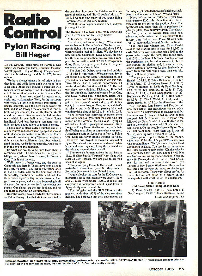 Radio Control Pylon Racing Bill Hager LETS SPEND some time Formula racing As know Formula fastest type RC Pylon Racing planes also best-looking models RC opinion have always taken lot pride look looks dont win races least dont think should think todays level competition could have effect As know Formula racing planes judged appearance scale workmanship Well part todays planes mostly appearance beauty contest best plane taking off first through fourthbest As can see fourth planes takeoff could three four seconds behind number onewhich over half lap Wow Some handicap just because someone has different idea about colors paint scheme have seen plane judged number major contest subsequently judged second third another contest another area no real consistency Because people different have different ideas about what good-looking judges people beauty eye beholder So what can fair about racehorse start has tried Quarter Midget room Formula way Well better way guys California Texas have using year Its simple line up four planes 1-2-3-4 order first drop starters flag numbers three take off second drop flag numbers two four go works great have using year area dont scale-judge planes planes best-looking no takes shortcut workmanship Overthe years have heard lot comments Pylon Racing sticks mind about great finishes get planes Boy couldnt Well wonder arent flying Formula very reason Well may chance Try just might like Racers California really going year Heres report Henry Bartle Hi racers Its again Six down six races go What year having Formula have people flying year 65 people since 1977 atotalof9l fliers also have new National Champion Dave Shadel now has three points has ever com piled before total 5233 Congratula tions Dave great year doubt anyone can come close him San Luis Obispo race held May 17-18 54 contestants What event called California State Championship world-class flier win Dave Shadel flawless performance weekend fast time 10812 close race Brian Richmond Brian led first three laps went long Pylon Dave passed him turn Brian passed Dave down straights did get horsepower What dog fight lap eight Brian went long again thats wrote Shadel passing him winning time 1103 Brians 11063 person surprised everyone Gary Long Q500 flier years just moved up Formula tint year Flying old Polecat did gre job weekend Gary Long Gary Hover tied second flyoff being exciting anyone has ever seen racehorse start put Long out front Pylon Long led Hover around first four laps Hover trying put move Long out PyIon Hover encountered wake turbu lence went skyward Long cruised win second place overall few names past SLO like Bob Smith old Kent Nogy sidekick Jeff Bertken glad see back again Everyone flying Formula should try make SLO meet next year premiere Formula event United States quick look stats SLO race interesting 15 contestants under 1150 21 under 1200 looks like everyone has horsepower just down flying abilityas should Tom Wiggins SLO Fliers greatest about 90% club members helping barbecue put serve up Saturday night included halves chicken steak beans excellent salad What feast Now lets get Calcutta have never SLO works 13 fastest pilots put auction block spectators pilots bid purchase pilot pilots believe will win Three heats flown winner heat advancing main event person fastest time Dave Shadel 10812 automatically qualifies final three heat-winners Dave Shadel went starting line race $1960 cash Whoever wins splits prize 50% person bought pilot 40% pilot 10% host club Tom Christopher auctioneer did excellent job also started bidding several cases almost outbid few wives husbands quote wife Next time bid Tom hell yours people qualified 1 Dave Shadel 10812 2 Brian Richmond 11063 3DubJett l1l164GaryHover l12325 Bernie Workman 11365 6 Paul Stenberg 11397 7 Jeff Bertken 11405 8 Tony Huber 11414 9 Emil Ghapgharan 11420 10 Lee Van Der Hey 11434 11 Ron Schorr 11437 12 Chuck WahI 11451 13 Henry Bartle 11472 skin teeth Jeff Bertken Ron Schorr Dub Jett won heats showdown set quick note As history has fastest qualifier has never won lined up flag dropped Jeff Bertken first Pylon followed Dave Shadel Bertken lead end lap Shadel Jett right behind lap two Bertken cut Pylon Jert went long Shadel winning time 11052 Dave picked up share money $784 club got $196and guess bought Shadel Well risk confidence Dave see has never won Calcutta before five tries Oh price purchased Oh about $740 much return money though see wife Donna decided outbid Tom Christo pher went halves Lyle Larson buy Bernie Workman also has thing 19-year-old guys bought Emil Ghapgharan went profits As stated before much return moneybut well worth excitement Final Results California State Championship Race 1 Dave Shadell0812 best time 2 Gary Longl1552 3 Gary Hoverl 1232 Continued page 154 photo left George Parks 1 JerrySmall getsetto race Jerrys new Estrellita Ed Pappy Rankin R rests between raceawith Polecat recent Dallas race fast time 1130thats really moving October 1986 55 Al Featuring fast service qualified people latest equipment including SPECTRUM ANAL YZER AM FM SIGNAL GENERATOR Call Sam Leonard Tony Stiliman custom work competition needs stock complete hobby line specializing competition accessories discounted prices 904 478-6745 RADIO SOUTH-m AUTHORIZED SERVICE CENTER FOR heft Pro Line Fuubu 43 West Nine Mile Rd Pensacola FL 32514 ~2 Kmm * Sales Service er Inquiries Welcome * RC Helicopters/Jolly Continued page 151 15 The reasons Heli-Star canopy just cosmetic although does look neat first built machine bad habit wanting lift high speed faster went forward cyclic use fitted Heli-Star canopy problem went away lop speed also improved install canopy use two Schluter Supe nor rear canopy mounts place stock Kalt mounts Move lower canopy mount off side radio tray use longer bolt Cut notch side canopy access starter belt 16 Make sure no slop control system Blade flutter can problem slop system So have Assemble bits pieces exactly Dan has explained will hav