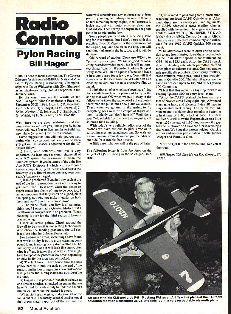 Radio Control Pylon Racing Bill Hager FIRST need make correction Contest Director years NMPRA National Min iature Pylon Racing Association Champion ships Doug Whiteaker Glen Sheppard assistantnot Greg Doe reported January issue way results NMPRA Sport Pylon Championship Race held September 20-21 1986 Expert 1 R Moreland 2 R Schuster 3 T Bogut 4 M Brown 5 J Solko Novice 1 5 Johnson 2 J Salisburg 3 G Wright 4 F Schwartz 5 M Franklin Well about midwinter means unless fly snow will have four five months build new plane planes 87 season Some suggestions will help out next spring test out new plane yoi get outlast seasons equipment 87 season follow 1 First batteriesand very important least once month charge RC system batteriesand mean complete system have units like Ace R/Cs Digipace will cycle system completely means use it best way go whatever use keep radios batteries charged 2 Radio problems such end last season dont wait until spring get fixed now dealer repair center has plenty time good job am implying wont good job spring make easier both Send radio now 3 The plane Well flew summer didnt once Quarter Midget flown two years no problems checking over third season found cracked wing Check stress points Check around firewall sure getting fuel-soaked Also check landing gear area tail sur faces wing hold-down blocks etc fuel-soaked areas something have found works dry out dry-cleaning com pound found grocery stores called CRD2 Just spray will look like snow wipe off takes oil might have repeat process few times depending badly area oil-soaked 4 The fuel tank have found best policy pull tank end season spring put new tankor least put new fuel tubing inside outside old tank 5 Engines probable us have time another unpacked engine havent used find didnt run well packed away storing engine make sure fuel out methyl alcohol used model fuel draws water vapor out air water will certainly rust exposed steel iron parts engine always make sure no fuel remaining engine saturate inside out motor oiljust about kind will wrap engine rag put old engine box Some people prefer use Zip-Loc plastic bag purpose dont agree practice Ifyou dont get moisture out engine rag air bag will seal moisture bag too will damage Oh word caution Dont use WD-40 protect engine WD-40 good loos ening rusted/corroded parts will pro tect things rust dont believe thisjust spray some WD-40 piece steel leave damp area few days will find some rust steel since WD-40 acts cleaning solvent protective film metal think us have have flying have taken plane out fly sr ing OK put away fall weve taken radio out ofaplane during winter put new plane weve built go out spring fly everything goes well couple flights thensuddenly dont have Well goes old reliable new bird just spent much time building todays very reliable radios crashes have due pilot error sor.ething mechanical goingwrong So withjust small amount work can put odds side trouble-free season little care right now will really pay off later following letter Art Arro subject Q500 Racing Michigan/Ohio area just wanted pass along some information regarding local CAPS Quickie rules After much discussion survey poll arguments CAPS adopted stock muffler rule supplied engine engine selection limited K&B *4011 05 40F5R ST 5-40 either ring ABC Como 40 ring ABC rules effective immediately andwillbe used 1987 CAPS Quickie 500 racing event alternatives open engine selec tion front-intake side-exhaust 40 includ ing Rossi 40 special tuned muffler OPS 40 $235 Also CAPS struck down standing rule permitted muffled tuned pipes exhaust systems new engine rule specifically prohibits flow-through mufflers stack mufflers mini-pipes tuned pipes equiv alent Quickie 500 aircraft specs same decided upon NMPRA Quickie 500 Committee feel move big step forward keeping Quickie 500 entry-level event Also CAPS retained handicap sys tem Novice class flying eight laps Advanced class nine laps Experts flying 10 laps singie-matrix heat racing cutoff ad vancement higher class remains bettering heat time 140 good new muffler rule will slow Experts down little over 135 instead 126 narrow gap between Novice Advanced flier winning few races hope can hold Quickie entries increase participation both Quarter Midget Formula Q500 next column See races Bill Hager 706 Glen Haven Dr Conroe TX 77385 52 Model Aviation rro wnn ni raCD-powered P-51 Mustang FAI racer Art flew plane PAl team selection meet September 26-28 finished very respectable eleventh place