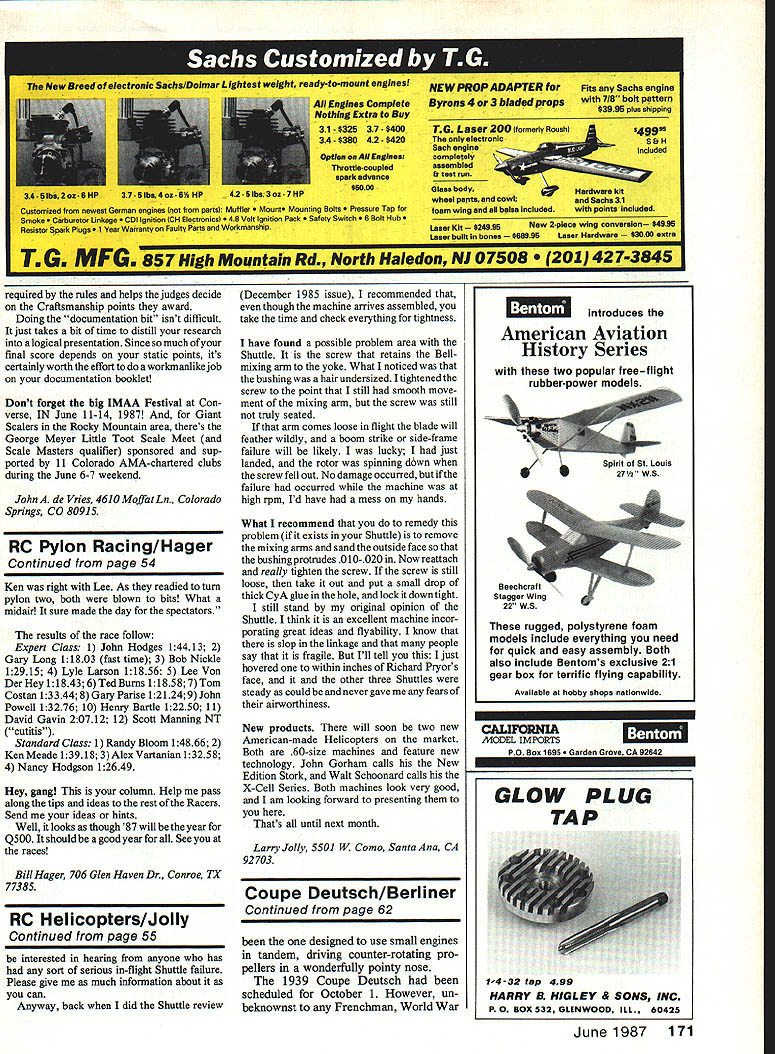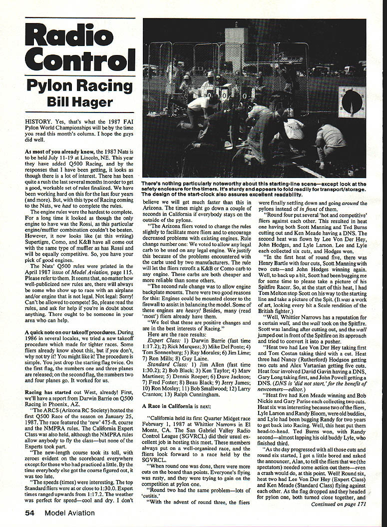 Radio Control Pylon Racing Bill Hager HISTORY Yes thats what 1987 FAI Pylon World Championships will time read months column hope guys did well As already know 1987 Nats held July 11-19 Lincoln NE year have added Q500 Racing responses have getting looks though lot interest has quite rush last several months order get good workable set rules finalized have working hard last four years type Racing coming Nats complete rules engine rules hardest complete long time looked though engine have Rossi particular engine/muffler combination couldnt beaten However now looks like writing Supertigre Como K&B have come out same type muffler has Rossi will equally competitive So have pick goad engines Nats Q500 rules printed April 1987 issue ModelAviation page 115 Please refer seems no matter well-publicized new rules will always some show up race airplane and/or engine legal legal Sorry Cant allowed compete So please read rules ask help youre doubt about anything ought someone area can help quick note takeoff procedures During 1986 several locales tried new takeoff procedure made tighter races Some fliers already know about dont try might like procedure simple just drop starting flag twice first flag numbers three planes released second flag numbers two four planes go worked us Racing has started out West already First II have report Darwin Barrie Q500 Racing Phoenix AZ ARCS Arizona RC Society hosted first Q500 Race season January 25 1987 race featured new 475-ft course NMPRA rules California Expert Class also held although NMPRA rules allow anybody fly classbut Experts took part new-length course took its toll zeroes evident scoreboard everywhere except practiced little time everybody else got course figured out too late speeds times interesting top Standard fliers close 1300 Expert times ranged upwards 1172 weather perfect speedcool dry dont believe will get much faster Arizona times might go down couple seconds California everybody stays outside pylons Arizona fliers voted change rules slightly facilitate fliers encourage decreased problems existing engines Rule change number voted allow legal carb used legal engine justify because problems encountered carbs used two manufacturers rule will let fliers retrofit K&B Coino carb engine carbs both cheaper reliable some others second rule change allow engine backplate mounts two good reasons Engines could mounted closer firewall assist balancing model Some engines heavy Besides read fliers already have feel positive changes best interests Racing race results Expert Class 1 Darwin Banle fast time 1172 2 Rick Marquez 3 Mike Del Ponte 4 Tom Sonnenburg 5 Ray Morales 6 Jim Lime 7 Ron Mills 8 Guy Lalne Standard Class Jim Allen fast time 1302 2 Bob Black 3 Ken Taylor 4 Mary Martinez 5 Dennis Roeper 6 Dave Jackson 7 Fred Foster 8 Beau Black 9 Jerry James 10 Ron Mosley 11 Bob Smallwood 12 Larry Cranton 13 Ralph Cunningham Race California next California held its first Quarter Midget race February 1 1987 Whittier Narrows El Monte CA San Gabriel Valley Radio Control League SGVRCL did usual ex cellent job hosting meet members always put well-organized race fliers look forward race held SGVRCL round done cuts board points Everyones flying rusty trying galn competition pylon Round two same problemlots cutitis advent round three fliers finally settling down going around pylons instead front Round four put several hot competitive fliers agalnst other resulted heat having both Scott Manning Ted Burns cutting out Ken Meade having DNS second heat flown Lee Von Der Hey John Hodges Lyle Larson Lee Lyle collected six cuts Hodges won first heat round five Henry Bartle four cuts Scott Manning two cutsand John Hodges winning again Well back up bit Scott bugging some time please take picture Spitfire Racer So start heat Tom Melton stop Scott way starting line take picture Spit work art looking bit Scale rendition British fighter Well Whittier Narrows has reputation certaln wall wall took Spitfire Scott landing after cutting out wall jumped out front Spitfire its approach tried convert pusher Heat two Lee Von Der Hey taking first Tom Costan taking third cut Heat three Nancy Ratherford Hodgson getting two cuts Alex Vartanian getting five cuts Heat four involved David Gavin having DNS Gary Long taking first John Powell getting DNS DNS did start benefit newcomerseditor Heat five Ken Meade winning Bob Nickie Gary Parise collecting two cuts Heat six interesting because two fliers Lyle Larson Randy Bloom old buddies Lyle bugging Randy two years get back Racing Well heat put head-to-head Ted Burns won Randy secondaimost lapping old buddy Lyle finished third As day progressed cuts round six started got little bored asked announcer Alan tell fliers spectators needed some action out thereeven crash would point Well Round six heat two Lee Von Der Hey Expert Class Ken Meade Standard Class flying against other As flag dropped headed pylon both turned close together Continued page 171 54 Model Aviation Theres nothing particularly noteworthy about startIng-line sceneexcept look safety enciosure timers its sturdy appears told readily fortransportlstorage design start-clock also assures excellent readability 41eebwc SaebslDoinar Lightest weight reaey-to-mGUliK easunl NEW PROP ADAPTER forFits Sacha engine Byrons 4or 3 hIadd props *3996 plus shipping TG Laser 200 formerly Roushl Thq eIectronlc~ e H Sschqnglnecompletelyk7 assembled run Glees body erdwars kIt wheel parts end cowlend Sacheil foam wIng end balsa IncludedwIth points Inaluded Laser KIt New 2plece wIng conversion *495 Laser buIlt bones 96 Laser l4erdwre 0 extra required rules helps judges decide Craftsmanship points award Doing documentation bit isnt difficult just takes bit time distill research logical presentation Since much ofyour final score depends static points its certainly worththe effort aworkmanlike job documentation booklet Dont forget big IMAA Festival Con verse IN June 11-14 1987 Giant Scalers Rocky Mountain area theres George