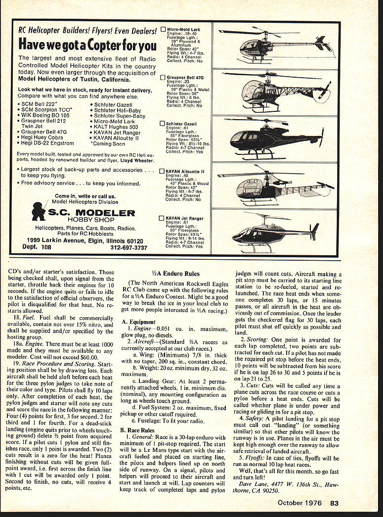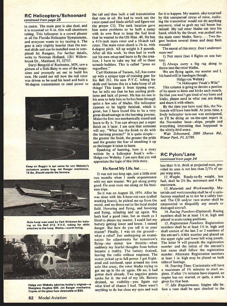 Pylon Racing COUPLE issues back made state ment effect Quarter Midgets have steerable nose wheel tail wheel have corrected couple Quarter Midget people fact rules state third wheel has steerable air plane controllable ground nice know least some guys out reading column would like bear racers model world let know what would like see column Racing Rules QMRC published following rules April newsletter 1 Objective provide closed-course racing sport flier novice racing enthusiast 2 General AMA FCC regula tions covering RC flier plane equipment shall applicable event except noted herein contestant shall allowed unlimited number entries provided back-up air planes same frequency number model Alternate models will used first flyable contestant may return first plane until has checked CD Con sideration safety spectators con testants contest personnel ut importance 3 Model Aircraft Requirements Mod els entered event shall semi-scale replicas propeller-driven aircraft have competed closed course speed record attempts cross-country racing recognizable three views front side top No deltas and/or tail less type aircraft shall allowed case unusual little-known designs flier shall produce requested CD documentation consisting photos 3-view drawing reliable souroc such manufacturer model aviation magazines books commer cially available 3-views verify such plane special design did exist 4 Engines Total displacement shall over 250 cc 1524 cu En gines shall stock RC types no rework ing least 1000 shall avail able through normal il channels US carburetor whether included engine specifically cataloged particular engine other manufacturer shall also 1000 available through normal retail channels US No crankcase exhaust muffler other type pressure shall applied fuel 900 START RACE COURSE LAYOUT PITS 350 4 SPECTATORS tanks No pressure type other atmospheric shall applied No diesel engines will allowed 5 Mufflers Only commercially avail able mufflers shall utilized required specified advance CD No tuned pipes 6 Accessories Items such wheels spinners general hardware shall commercially available through normal retail channels available quanti ties 1000 7 Propellers Two-bladed fixed propel lers commercially available through nor mal outlets shall used Material may removed blade reason balance other blade must remain unaltered 8Spinners Prop Nuts rounded spinner AMA prop nut shall used 9 Fuselage widest point ba sic fuselage must least 2 wide measured within wing chord area deepest point fuselage must least 5 deep including windshield can opy headrest points need coincide 10 Landing Gears Landing gear shall non-retractable wheels must free rolling tail skid utilized shall point rear aircraft No brakes al lowed Minimum wheel diameter shall 1 11 Wings No minimum span re quired thickness shall /8 measured outside fuselage wing fillets progress ing straight line taper tip Wing area shall minimum 300 sq biplane shall less 5/ upper wing thickness measured line projected vertically fuselage side top view point fuselage wing intersection Lower wing shall continued page 82 24 Model Aviation RC Helicopters/Schoonard continued page 25 caster main gear also dual mounted -in thin wall aluminum tubing helicopter crowd pleaser Florida Helicopter Symposiums everyone wants try taxiing gear slightly heavier nor mal skids can installed com pleted Jet Rangers further details write Norman Holland 1201 Willowbrook Dr Maitland FL 32757 Daryl Bengold Rochester MN saw picture H eli-Baby maga zines promptly set out build own could tell tail rotor driven used head built 90-degree transmission send power tail built tail transmission runs oil work out rotor speed blade airfoil figure out proper CG tank location gave him some problems built sump its own float keep fuel level wanted OS Max 40 has 41-inch main rotor 10-inch tail rotor main rotor chord 1 6-degree pitch up weight 8 pounds After work work out own setup learn fly crea tion have take hat off scratch-builders called press regardless Carl Hickman Tucson AZ has come up unique type training gear Bell 212 uses PVC tubing skids fastens hula-hoop things keeps tipping over tells has cooling prob lems lack power has no area help him has through quite few sets blades helicopter appears highly finished great have found very great disadvantage learning process Make first mechanically sound learn fly can always put super finish later am sure someone will say What has finish learning process quite simple greater finish greater pride greater fear smashing up longer takes learn Speaking learning story written helicopter freaks wife Helga von Websky am sure will appreciate logic little story Saved Life but.. too long ago just little over two months made acquaintance new master got along pretty good took along busi ness trips So August 20 1974 After done 8-hour-rat-race called working hours picked up motel drove out local model field Hovering flying hovering flying refueling up again both good time much liked please master could feel battery getting lower lower sensed danger tell master Finally groundwhat relief Just undergoing exami nation adjustments tomorrows flyingmy motor low throttlewhen suddenly fearful thoughts before became reality battery drained leaving radio response motor jerked up full power got fright ened confused spun around own axle like crazy rotor blades trying get up air again Oh no gotten dark already Two negative points spoke end life Battery drained no visibilityyou figure out what kind chance wasnt anything close eyes wait happen master also surprised unexpected circus realiz ing transmitter would anything anymore tried grab tail boom missed tail rotor blades cut hand thrust pushed main rotor blades Sorry. fin gers broken several times deep flesh wounds moral story Dont underesti mate 1 4 flights bat tery 2 Always carry big rag along throw rotor blades flying again master hand still bandages though Helga von Websky Helicopter Freaks Wife column going devote portion its space hint