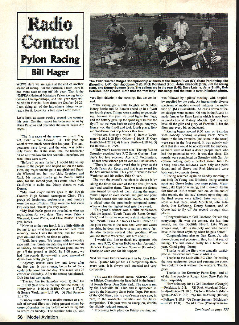 WOW again end another season racing Formula flier race cap off year NMPRA National Miniature Pylon Racing Asso ciation Championships year will held Florida Race dates October 24-25 am doing last-minute things get ready Look full report next month Lets look some racing around country year first report has sent us Brian Palacios describes South Texas Air Races first races season held May 2-3 1987 San Antonio TX year weather much better last year tem peratures lower wind defin itely lower same time barometer hit all-time low San Antonio therefore race times slow Before go further would like say thanks people helped Out race First major thanks go girlfriend Patri cia Wiegand two kids Gretchen Carl second thanks go Donna Bartles second year has come down California assist thanks Donna third major thanks goes Health Careers High School Aerospace Club group freshmen sophomores juniors race officials best crew Ive ever Thank very much final thanks go three ladies ran registration two days Patricia Wiegand Carol Willis Elsie Rankin Thank ladies Now race itself little difficult say what happened heat memory since starter too much goes onand theres no time write Well goes began two-day race five rounds Saturday five rounds Sunday Saturdays weather good got off ground 1000 300 pm five rounds flownwith good amount demolition derby going Anyway entries lowand lower after first day strange lot fliers could come day result 22 entries Saturday After smoke cleared Dub Jett won again top five Saturday 1 Dub Jett 11579 fast time day meet 2 Henry Bartle11641 3 Rich Oliver11758 4 Bernie Workmani 1780 5 Phil Bussel 1 19 35 Sunday started smaller turnout re sult several fliers being present either cause crashes day before being able return Sunday weather held up very light drizzle morning contin ued racing got little tougher Sunday Henry Bartle Ed Rankin ended up flyoff fourth place Things starting get excit ing because year used lights flags battery gave up spirit right before flyoffso went back using flags Anyway Henry won flyoff took fourth place per nie Workman took top honors time Sundays results 1 Bernie Work man11621 2 Rich Oliverl1648 3 Gary Heitholdl2228 4 Henry Bartle11846 5 Ed Rankin11999 years awards nice top five Saturday received Ace R/C Servo Cyclers Sun days top five received Ace R/C Voltmasters fast time winner got Ace RIC Datamaster other award given South Texas Air Races award best overall team year went Bernie Workman caller Edie Oliver way awards recipient chosen taking times top five day totaling take fastest time turned during meet round up second give point second beats 1200 latter added onto previously computed score Whoever has highest total gets award years winner won shirt emblazoned legend South Texas Air Races Overall Pilot caller received shirt leg end South Texas Air Races Overall Caller pilot returns race next year wears shirt does have pay entry fee also receives several other goodies see Bernie Workman ask him about would also like thank sponsors year Ace RIC Clayton Hobbies San Antonio Hancock Engines TruTurn Spinners Houston Thanks support Next have two reports sent John Kils donk Quarter Midget has Championship Race year always well attended very competitive fifteenth annual NMPRA Quar ter Midget Championship Race held beauti ful Rough River Dam State Park race run Louisville RC Club sponsored part Kentucky State Parks Dept QM fliers cant-miss race due part wonderful facilities fierce competition year no exception despite slightly reduced turnout Processing took place Friday evening followed pilots meeting hospital ity supplied park An increasingly diverse spectrum models entered indicates multi tude QM kits available least dozen differ ent designs entered note Rivets kit made famous Dave Latsha now back production Matney Models QM may have glitz glory Formula fliers bit dedicated Racing began around 900 am Saturday nobody holding anything back Several times low twenties some teens seen first round quickly evi dent would no cakewalk anybody least dozen people potential win close Six rounds completed Saturday Gail Ja cobson holding onto perfect score Jim De Young John Kilsdonk point down Al Grove Rick Moreland both two points down Racing resumed again Sunday morning see both DeYoung Kilsdonk losing another point Grove losing two points Mean time Jake kept winning looked like fast time 1162 would hold end nine rounds fat lady showed up sing final scores tallied Jake still alone first place Moreland John Kils donk Jim DeYoung Denny Sumner Al Grove fly off second through sixth places Congratulations Gail Jacobson winning everything won contest fast time award Doolittle Flyoff Like Wayne Yeager said Jake doesnt have lie about anything gets home Congratulations also Dan Kane Jr showed some real promise first year racing kid should really terror next year Good going Danny Thanks fliers annually partici pate event make what Thanks Louisville RC Club hauling race equipment down running event couldnt workers Thanks guys Thanks Kentucky Parks Dept fine people Rough River State Park hospitality Heres top 10 1 Gall Jacobson Georgia Polekitty/l 162 *2 Rick Moreland Mary landHeinkel/l183 *3 John Kilsdonk Mich iganP-63/l190 *4 Jim DeYoung Illinois Folkerts/1189 *5 Denny Sumner Michigan P-63/l 170 *6 Al Grove Pennsylvania Continued page 153 56 Model Aviation Radio Cono1 Pylon Racing Bill Hager 1987 Quarter Midget Championship winners Rough River KY State Park flying site Kneeling L-R Gail Jacobson 1st Rick Moreland 2nd John Kiladonk 3rd Jim Devoung 4th Denny Sumner 5th callers rear L-R Dave Latsha Jerry Smith Bob Petrinec Ken Heatlie Note fat lady has sung race over Kilsdonk photo CO ~pS ADULTS $300 CHILDREN 6-12 $100 wladult SENIOR CITIZENS $200 NEW PAVILION & EXPO HALL WESTERN WASHINGTON FAIRGROUNDS PUYALLUP WASHINGTON N. FOR INFO CONTACT DON SWEASY 206 847-1279 PO BOX 73939 PUYALLUP WA 98373 DAVE TURNER 206 537-9613 John de Vrzes 4610 Moffat Liz Colorado Springs CO 80915 RC Pylon Racing/