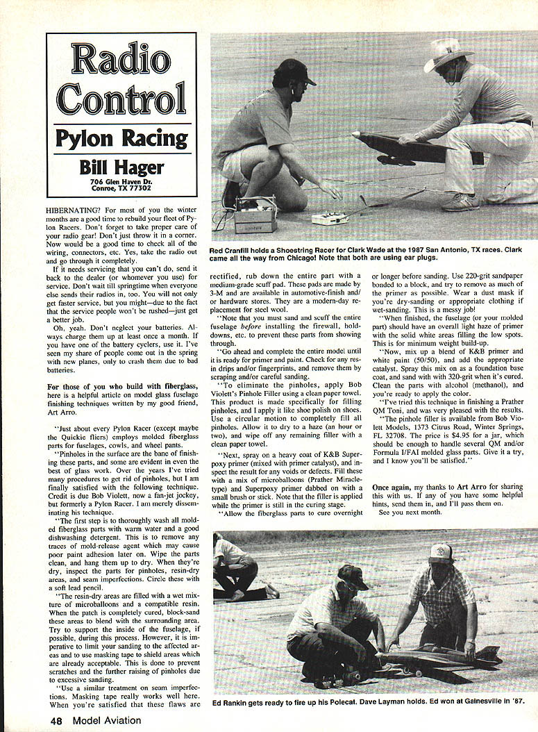 HIBERNATING winter months good time rebuild fleet Py ion Racers Dont forget take proper care radio gear Dont just throw corner Now would good time check wiring connectors etc Yes take radio out go through completely needs servicing cant send back dealer whomever use service Dont wait till springtime everyone else sends radios too will get faster service mightdue fact service people wont rushedjust get better job Oh yeah Dont neglect batteries Al ways charge up least once month have battery cyclers use Ive seen share people come out spring new planes crash due bad batteries build fiberglass helpful article model glass fuselage finishing techniques written good friend Art Arro Just about Pylon Racer except maybe Quickie fliers employs molded fiberglass parts fuselages cowls wheel pants Pinholes surface bane finish ing parts some evident best glass work Over years Ive tried procedures get rid pinholes am finally satisfied following technique Credit due Bob Violett now fan-jet jockey formerly Pylon Racer am merely dissem inating technique first step thoroughly wash mold ed fiberglass parts warm water good dishwashing detergent remove traces mold-release agent may cause poor paint adhesion later Wipe parts clean hang up dry theyre dry inspect parts pinholes resin-dry areas seam imperfections Circle soft lead pencil resin-dry areas filled wet mix ture microballoons compatible resin patch completely cured block-sand areas blend surrounding area Try support inside fuselage possible during process However im perative limit sanding affected ar eas use masking tape shield areas already acceptable done prevent scratches further raising pinholes due excessive sanding Use similar treatment seam imperfec tions Masking tape really works well youre satisfied flaws rectified rub down entire part medium-grade scuff pad pads made 3-M available automotive-finish and/ hardware stores modern-day re placement steel wool Note must sand scuff entire fuselage before installing firewall holddowns etc prevent parts showing through Go ahead complete entire model until ready primer paint Check res drips and/or fingerprints remove scraping and/or careful sanding eliminate pinholes apply Bob Violetts Pinhole Filler using clean paper towel product made specifically filling pinholes apply like shoe polish shoes Use circular motion completely fill pinholes Allow dry haze hour two wipe off remaining filler clean paper towel Next spray heavy coat K&B Super poxy primer mixed primer catalyst spect result voids defects Fill mix microballoons Prather Miracletype Superpoxy primer dabbed small brush stick Note filler applied primer still curing stage Allow fiberglass parts cure overnight longer before sanding Use 220-grit sandpaper bonded block try remove much primer possible Wear dust mask youre dry-sanding appropriate clothing wet-sanding messy job finished fuselage molded part should have overall light haze primer solid white areas filling low spots minimum weight build up Now mix up blend K&B primer white paint 50/50 add appropriate catalyst Spray mix foundation base coat sand with 320-grit its cured Clean parts alcohol methanol youre ready apply color Ive tried technique finishing Prather QM Toni very pleased results pinhole filler available Bob Vio lett Models 1373 Citrus Road Winter Springs FL 32708 price $495 jar should enough handle several QM and/or Formula 1/FAI molded glass parts Give try know youll satisfied Once again thanks Art Arro sharing us have some helpful hints send Ill pass See next month 48 Model Aviation Radio Conoi Pylon Racing Bill Hager 706 Glen Haven Dr Conro TX 77302 Red Cranfill holds Shoestring Racer Clark Wade 1987 San Antonio TX races Clark came way Chicago Note both using ear plugs Ed Rankin gets ready fire up Polecat Dave Layman holds Ed won Gainesville 87