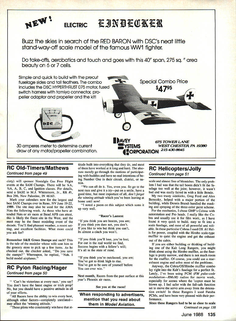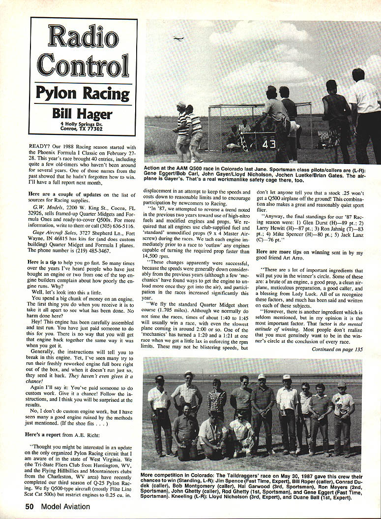 READY 1988 Racing season started Phoenix Formula Classic February 2728 years race brought 40 entries including quite few old-timers havent around several years names past showed hadnt forgotten win Ill have full report next month couple updates list sources Racing supplies G W Models 2200 W King St Cocoa FL 32926 sells framed-up Quarter Midgets mula Ones ready-to-cover QSOOs information write call 305636-5116 Gage Aircraft Sales 3727 Shepherd Ln Fort Wayne IN 46815 has kits does custom building Quarter Midget Formula planes phone number 219 485-3467 tip help go fast So times over years Ive heard people have just bought engine two top en gine builders complain about poorly en gine runs Well lets look little spend big chunk money engine first thing you receive take apart see what has done No harm done Hey engine has carefully assembled test run have just paid someone no way will get engine back together same way got Generally instructions will tell break engine Yet Ive seen try run freshly reworked engine full bore right Out box doesnt run just send back haven t given chance Again Ill say Youve paid someone custom work Give chance Follow structions think will surprised results No dont custom engine work have seen good engine ruined methods just mentioned shoe fits s report AE Richt Thought might interested update organized Pylon Racing circuit am aware state West Virginia Tn-State Fliers Club Huntington WV Flying Hillbillies Mountaineers clubs Charleston WV area have recently completed third season Q-25 Pylon Rac ing fly Q500-type aircraft mostly Flite Line Scat Cat SOOs restrict engines 025 Cu displacement attempt keep speeds costs down reasonable limits encourage participation newcomers Racing 87 attempted reverse trend noted previous two years toward use high-nitro fuels modified engines props re quired engines use club-supplied fuel standard unmodified props 9 x 4 Master Airscrew during races tach engine im mediately prior race outlaw engines capable turning required prop faster 14500 rpm changes apparently successful because speeds generally down consider ably previous years although few chanics have found ways get engine un load once get air partici pation races increased significantly year fly standard Quarter Midget short course 1705 miles Although normally time races times about 140 145 will usually win race slowest plane coming around 200 mechanics has turned 120 121 race got little lax enforcing rpm limits may blistering speeds dont let anyone tell stock 25 wont get Q500 airplane off ground combina tion also makes great reasonably quiet sport flier Anyway final standings 87 Rac ing season 1 Glen Durst H89 pt 2 Larry Hewitt H87 pt 3 Ron Jahnig T83 pt 4 Mike Spencer H80 pt 5 Jack Lanz C76 Pt tips winning sent good friend Art Arro lot important ingredients will put winners circle Some brute engine good prop clean air plane meticulous preparation good caller blessing Lady Luck us recognize factors much has said written subjects However another ingredient seldom mentioned opinion important factor factor mental attitude winning Most people dont realize must genuinely want win ners circle conclusion race 50 Model Aviation Radio Confrol Pylon Racing Bill Hager 4 Holly Springs Dr Conroe, TX 77302 Action AAM 0500 race Colorado last June Sportsman class pilotalcallers L-R Gene EggertlBob Carl John GayerlLloyd Nicholson Jochen LuetkelBnan Gates air plane Gayers Thats real workmanlike safety cage too Continued page 135 competition Colorado Taildraggers race May 30 1987 gave crew chances win Standing L-R Jim Spence Fast Time Expert Bill Roper caller Conrad Du dek caller Bob Montgomery caller Hal Garwood 3rd Sportsman Ron Meyers 2nd Sportsman John Ghetty caller Rod Ghetty 1st Sportsman Gene Eggert Fast Time Sportsman Kneeling L-R Lloyd Nicholson 3rd Expert Duane Ball 1st Expert RC Old-Timers/Mathews Continued page 49 clety will sponsor Nostalgia Gas Free Flight events SAM Champs will AA A B C Ignition classes details send SASE MJ Whittemore Jr RR #1 Box 296 New Palestine IN 46163 Mark calendars now largest best SAM Champs ever Reno NV June 19-22 1989 site may also used AMA Nats following week As have tended Nats air races Stead AFB can attest likely finest site West meet may finest modeling event decade Youll find pleasant weather resort set ting excellent facilities What could ask Remember S&H Green Stamps such tale modeler wife sent him grocery store pick up few items As checked out checker asked save stamps Whereupon replied Nab build model airplanes RC Pylon Racing/Hager Continued page 50 Cant victorious race say dont have latest engine trick prop No should have positive attitude efforts Racers have ability win heat although other factorscompletely unrelated may affect winning attitude pilots consistently win have attitude built everything have worked long hard alsotans merely go through motions participat ing buddies have no real intentions ing Number circuit district na flon can Yes So go next race give tryput smile have good time important don rforger winning attitude youve leaving home until now noted poem subject sums up very well Racers Lament think beaten you think dare dont like win think cant Its almost cinch wont think youll lose youre lost Out real world find Success begins fellows will Its state mind think youre outclassed Youve got think high rise Youve got sure yourself before can ever win Next month Racers past surface years Phoenix air races See races responding advertisers mention read about ModelAviation RC Helicopters/Jolly Continued page 51 scale almost free blemishes prob lem tail boom didnt fit fu selage too well joint however wasnt bad easily faired little Bondo two trusty sidekicks Greg Ford Alex Bereczky helped major portion building Dennis Brandt handled mask ing spraying three-color paint scheme mechanics chose GMPs Cobras autorotation Pro heads really like Co bra usually use film work have found very quick build easy fit scale fuselage powerful reli able particu