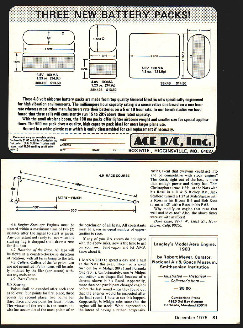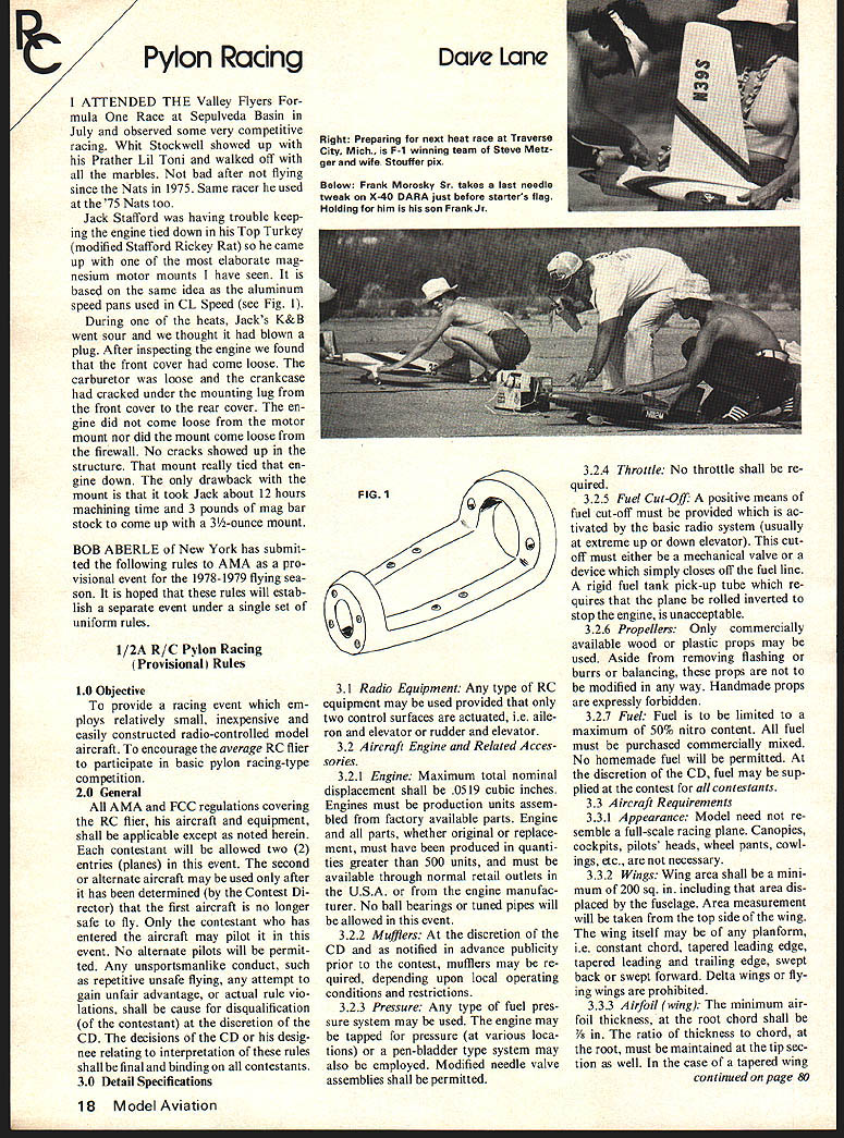 Pylon Racing ATTENDED THE Valley Flyers mula Race Sepulveda Basin July observed some very competitive racing Whit Stockwell showed up Prather Lil Toni walked off marbles bad after flying since Nats 1975 Same racer used 75 Nats too Jack Stafford having trouble keep ing engine tied down Top Turkey modified Stafford Rickey Rat came up elaborate mag nesium motor mounts have seen basel same idea aluminum speed pans used CL Speed see Fig 1 During heats Jacks K&B went sour thought blown plug After inspecting engine found front cover come loose carburetor loose crankcase cracked under mounting lug front cover rear cover en gine did come loose motor mount nor did mount come loose firewall No cracks showed up structure mount really tied en gine down drawback mount took Jack about 12 hours machining time 3 pounds mag bar stock come up 3-ounce mount BOB ABERLE New York has submit ted following rules AMA pro visional event 1978-1979 flying sea son hoped rules will estab lish separate event under single set uniform rules 1/ZA R/C Pylon Racing Provisional Rules 10 Objective provide racing event em ploys relatively small inexpensive easily constructed radio-controlled model aircraft encourage average RC flier participate basic pylon racing-type competition 20 General AMA FCC regulations covering RC flier aircraft equipment shall applicable except noted herein contestant will allowed two 2 entries planes event second alternate aircraft may used after has determined Contest Di rector first aircraft no longer safe fly Only contestant has entered aircraft may pilot event No alternate pilots will permit ted Any unsportsmanlike conduct such repetitive unsafe flying attempt gain unfair advantage actual rule vio lations shall cause disqualification contestant discretion CD decisions CD desig nee relating interpretation rules shall final binding contestants 30 Detail Specifications Dave Lane Right Preparing next heat race Traverse City Mich. F-i winning team Steve Metz ger wife Stouffer pix Below Frank Morosky Sr takes last needle tweak X-40 DARA just before starters flag Holding him son Frank Jr 31 Radio Equipment Any type RC equipment may used provided two control surfaces actuated ie aile ron elevator rudder elevator 32 Aircraft Engine Related Acces sories 321 Engine Maximum total nominal displacement shall 0519 cubic inches Engines must production units assem bled factory available parts Engine parts whether original replace ment must have produced quanti ties greater 500 units must available through normal retail outlets USA engine manufac turer No ball bearings tuned pipes will allowed event 322 Mufflers discretion CD notified advance publicity prior contest mufflers may re quired depending upon local operating conditions restrictions 323 Pressure Any type fuel pres sure system may used engine may tapped pressure various loca tions pen-bladder type system may also employed Modified needle valve assemblies shall permitted 324 Throttle No throttle shall re quired 325 Fuel Cut-Off positive means fuel cut-off must provided ac tivated basic radio system usually extreme up down elevator cut off must either mechanical valve device simply closes off fuel line rigid fuel tank pick-up tube re quires plane rolled inverted stop engine unacceptable 326 Propellers Only commercially available wood plastic props may used Aside removing flashing burrs balancing props modified way Handmade props expressly forbidden 327 Fuel Fuel limited maximum 50% nitro content fuel must purchased commercially mixed No homemade fuel will permitted discretion CD fuel may sup plied contest contestants 33 Aircraft Requirements 331 Appearance Model need re semble full-scale racing plane Canopies cockpits pilots heads wheel pants cowl ings etc necessary 332 Wings Wing area shall mini mum 200 sq including area dis placed fuselage Area measurement will taken top side wing wing itself may planform ie constant chord tapered leading edge tapered leading trailing edge swept back swept forward Delta wings fly ing wings prohibited 333 Airfoil wing minimum air foil thickness root chord shall 7/ ratio thickness chord root must maintained tip sec tion well case tapered wing continued page 80 18 ModelAviation MORE wHAfIOyfl PROPELL cojaster ofl same powerYELLOW e6 je pltCB ade 54 G\eTa O2~25 3 5 4 304 0-OBlade63 64 354 -Pusher74 76 78 504 seeSeach84 86 88 654 5 63 64 3W104 10685 RC 124 3 Blade Tractor125 126 150 5-354 63 64 504 ORISH 3 BladePusher BROS 6-3ST JOHN INDIANA 46373 Emergence/Stevens continued page S2 us would referred Parks Recreation Committee review recommendations Needless say ecstatic suddenly pro vided key what really want ed As writing letter has written successfully passed council will reviewed committee few weeks though publicity handled large part Art Jones contacted local radio station WKNE formed could have half-hour discuss sport show Mari anne Dinkels show opportunity immediately taken writer though frightened half death agreed show pre-broadcast meeting presented Marianne outline what wanted discuss during broadcast am told went very well guided through expert terviewing techniques addition radio broadcast also artistic new club member Dick Webster design produce several large posters placed promi nent places quantity small no tices placed informa tion boards public places over area Further prepared announce ments submitted three other radio stations within 20-mile radius Keene inclusion community activity broadcasts Just example type co operation hard work expended member job done Bill Sullivan new member last year Bill handled printing raffle tickets door prize forms club information handouts also directed can vassing local businesses door prize donations sold over 40 raffle tickets show slated Sunday April 25 held final meeting early April tie together loose ends simply matter covering lastminute details anxiously awaiting big day meantime contacted non-club members knew working models successful convincing three join us show A
