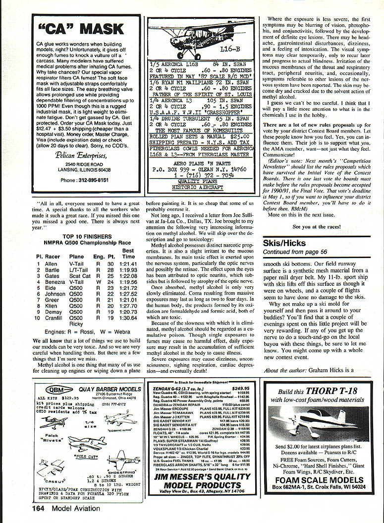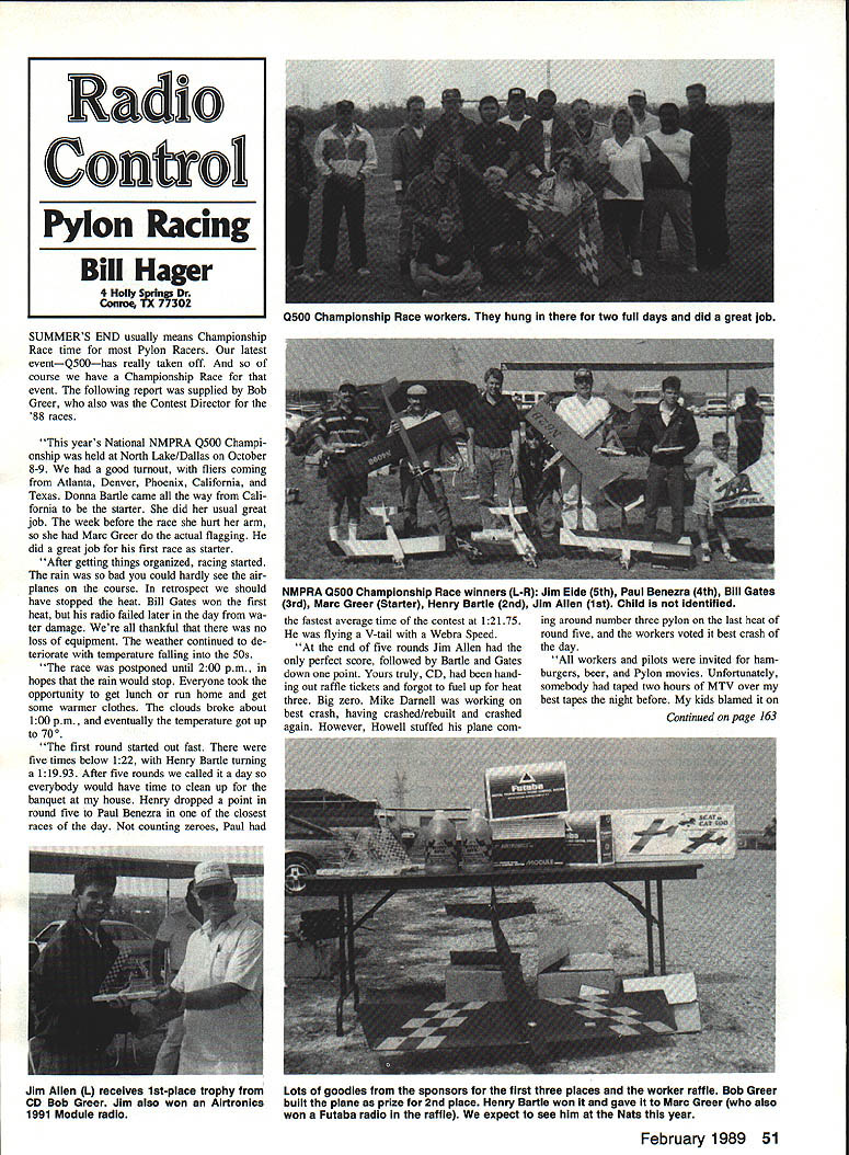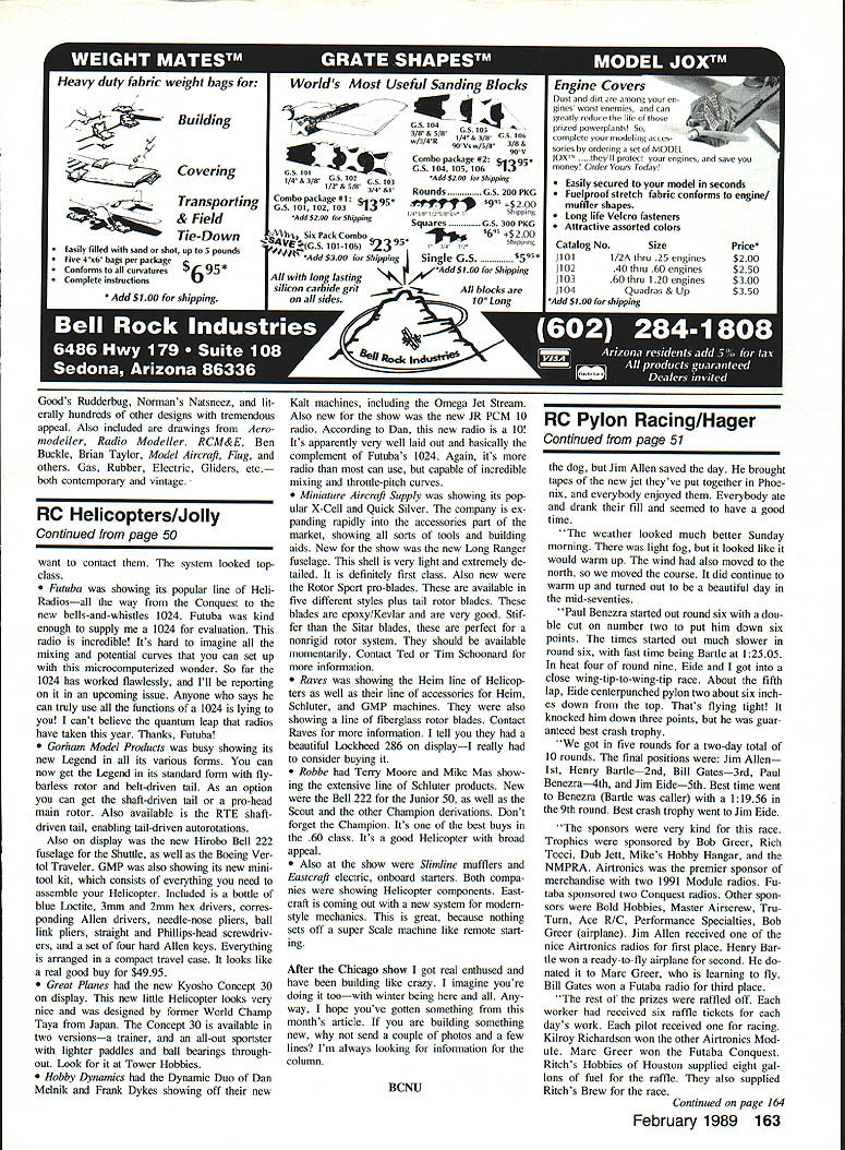 SUMMERS END usually means Championship Race time Pylon Racers latest eventQ500has really taken off course have Championship Race event following report supplied Bob Greer also Contest Director 88 races years National NMPRA Q500 Champi onship held North Lake/Dallas October 8-9 good turnout fliers coming Atlanta Denver Phoenix California Texas Donna Bartle came way Cali fornia starter did usual great job week before race hurt arm Marc Greer actual flagging did great job first race starter After getting things organized racing started rain bad could hardly see air planes course retrospect should have stopped heat Bill Gates won first heat radio failed later day wa ter damage thankful no loss equipment weather continued de teriorate temperature falling 50s race postponed until 200 pm. hopes rain would stop Everyone took opportunity get lunch run home get some warmer clothes clouds broke about 100 pm eventually temperature got up 700 first round started out fast five times below 122 Henry Bartle turning 11993 After five rounds called day everybody would have time clean up banquet house Henry dropped point round five Paul Benezra closest races day counting zeroes Paul NMPRA Q500 Championship Race winners L-R Jim Eide 5th Paul Benezra 4th Biii Gates 3rd Marc Greer Starter Henry Bartie 2nd Jim Ailen 1st Child identified fastest average time contest 12175 flying V-tail Webra Speed end five rounds Jim Allen perfect score followed Bartle Gates down point Yours truly CD hand ing Out raffle tickets forgot fuel up heat three Big zero Mike Darnell working best crash having crashed/rebuilt crashed a2ain However Howell stuffed plane com ing around number three pylon last heat round five workers voted best crash day workers pilots invited ham burgers beer Pylon movies Unfortunately somebody taped two hours MTV over best tapes night before kids blamed Continued page 163 February 1989 51 Radio Control Pylon Racing Bill Hager 4 HollyDr Q500 Championship Race workers hung far two full days did great job Jim Alien L receives 1st-place trophy CD Bob Greer Jim also won Alrtronics 1991 Module radio Lots goodies sponsors first three places worker raffle Bob Greer built plane prize 2nd place Henry Bartle won gave Marc Greer also won Futaba radio raffle expect ace him Nats year -EF1 y duty fabric weight bags for Worlds Most Useful anaing OCK5 BuildingI3/s/s ijt351t. CS 106 95 Vs ss/5/53/5 & '95 V Combo package #2 CoveringGO 101GS 104 105 10613 1/4 & 3/5 CS itCS 103Add $200 to-Shipping 1/2 &5/8RoundsG S 200 PKG TransportingCombo package #1 s5- 5951 $2 00 S 101 102 103 4 8 2 84Shippin8 & FieldAdd $200 Sh pp ngSquaresCS 300 PKG S x Pack Combo~ $200 Tie-DownSAl CS 101 106 Shppsu Easy flied w th sand shot up 5 poundsAdd $3 p ngSingle GS5505* Fve4x6 bagspe packagea Confo ms curvaturesr 95 *,. Add $100 Shipping Complete nst ud ui0All long lastingW%J/V s con carb de grit blocks Add $100 shipping s ong Goods Rudderbug Normans Natsneez lit erally hundreds other designs tremendous appeal Also included drawings Aero modeller Radio Modeller RCM&E Ben Buckle Brian Taylor Model Aircraft Flug others Gas Rubber Electric Gliders etc both contemporary vintage RC Helicopters/Jolly Continued page 50 want contact system looked topclass Futuba showing its popular line Heli Radiosall way Conquest new bells-and-whistles 1024 Futuba kind enough supply 1024 evaluation radio incredible Its hard imagine mixing potential curves can set up microcomputerized wonder So far 1024 has worked flawlessly Ill reporting upcoming issue Anyone says can truly use functions 1024 lying cant believe quantum leap radios have taken year Thanks Futuba Gorham Model Products busy showing its new Legend its various forms can now get Legend its standard form fly barless rotor belt-driven tail As option can get shaft-driven tail pro-head main rotor Also available RTE shaftdriven tail enabling tail-driven autorotations Also display new Hirobo Bell 222 fuselage Shuttle well Boeing Ver tol Traveler GMP also showing its new minitool kit consists everything need assemble Helicopter Included bottle blue Loctite 3mm 2mm hex drivers corres ponding Allen drivers needle-nose pliers ball link pliers stralght Phillips-head screwdriv ers set four hard Allen keys Everything arranged compact travel case looks like real good buy $4995 Great Planes new Kyosho Concept 30 display new little Helicopter looks very nice designed former World Champ Taya Japan Concept 30 available two versionsa trainer all-out sportster lighter paddles ball bearings through out Look Tower Hobbies Hobby Dynamics Dynamic Duo Dan Melnik Frank Dykes showing off new Kalt machines including Omega Jet Stream Also new show new JR PCM 10 radio According Dan new radio 10 Its apparently very well laid out basically complement Futubas 1024 Again its radio can use capable incredible mixing throttle-pitch curves Miniature Aircraft Supply showing its pop ular X-Cell Quick Silver company ex panding rapidly accessories part market showing sorts tools building aids New show new Long Ranger fuselage shell very light extremely de tailed definitely first class Also new Rotor Sport pro-blades available five different styles plus tail rotor blades blades epoxy/Kevlar very good Stif fer Sitar blades perfect nonrigid rotor system should available momentarily Contact Ted Tim Schoonard information Raves showing Heim line Helicop ters well line accessories Heim Schluter GMP machines also showing line fiberglass rotor blades Contact Raves information tell beautiful Lockheed 286 displayI really consider buying Robbe Terry Moore Mike Mas show ing extensive line Schluter products New Bell 222 Junior 50 well Scout other Champion derivations Dont forget Champion Its best buys 60 class Its good Helicopter broad appeal Also show Slimline mufflers Easrcraft electric onboard starters Both compa nies showing Helicopter components Eastcraft coming out new system modemstyle mechanics great because nothing sets off super Scale machine like remote sta