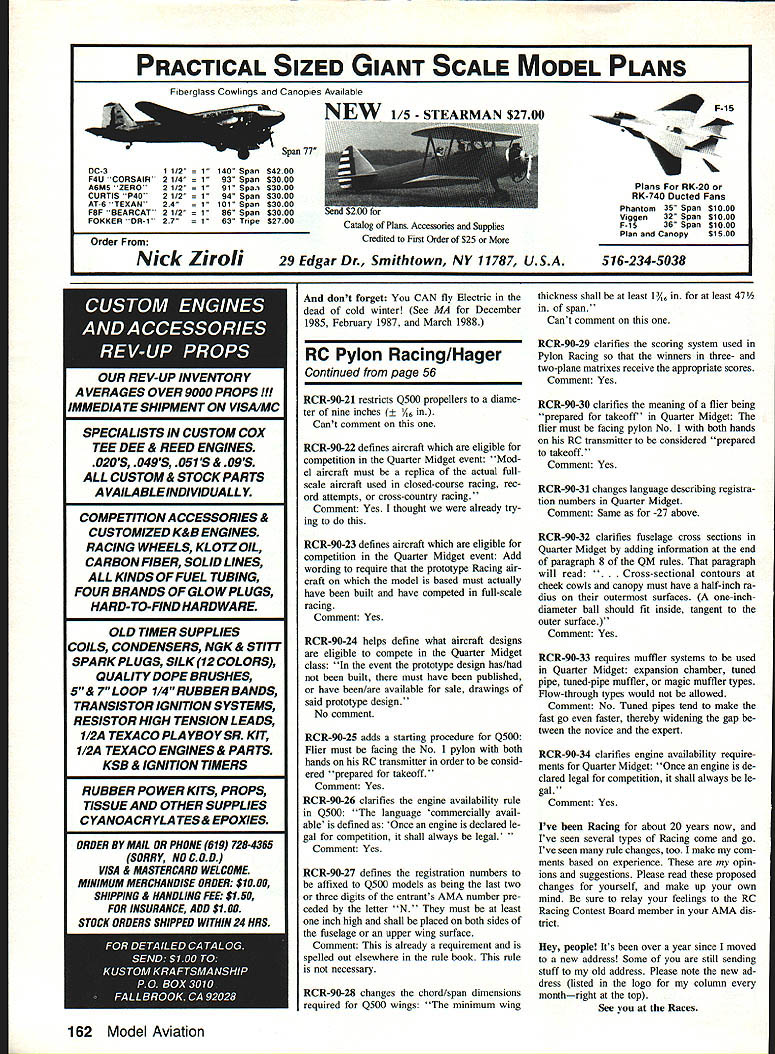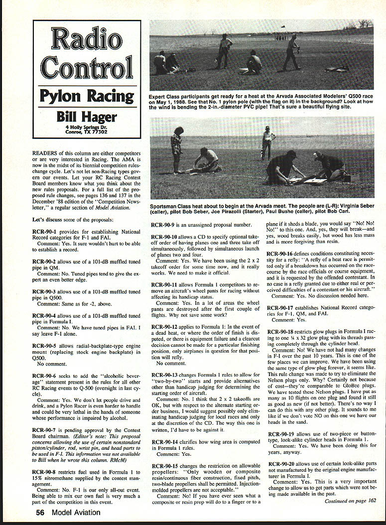 READERS column either competitors very interested Racing AMA now midst its biennial competition ruleschange cycle Lets let non-Racing types gov ern events Let RC Racing Contest Board members know what think about new rules proposals full list pro posed rule changes see pages 136 137 December 88 edition Competition News letter regular section Model Aviation Lets discuss some proposals RCR-90-1 provides establishing National Record categories F-i FAT Comment Yes sure wouldnt hurt able establish record RCR-90-2 allows use 101-dB muffled tuned pipe QM Comment No Tuned pipes tend give ex pert better edge RCR-90-3 allows use 101-dB muffled tuned pipe Q500 Comment Same -2 above RCR-90-4 allows use 101-dR muffled tuned pipe Formula Comment No have tuned pipes FAI say leave F-i alone RCR-90-5 allows radial-backplate-type engine mount replacing stock engine backplate Q500 No comment RCR-90-6 seeks add alcoholic bever age statement present rules other RC Racing events Q-500 oversight last cy cle Comment Yes dont let people drive drink Pylon Racer harder handle could very lethal hands someone performance impaired alcohol RCR-90-7 pending approval Contest Board chairman Editors note proposal concerns allowing use certain nonstandard piston/cylinder rod wrist pin head parts used F-I information available Bill wrote column RMcM RCR-90-8 restricts fuel used Formula 1 15% nitromethane supplied contest man agement Comment No F-l all-out event Being able mix own fuel very much part competition event RCR-90-9 unassigned proposal number RCR-90-1O allows CD specify optional take off order having planes three take off simultaneously followed simultaneous launch planes two four Comment Yes have using 2 x 2 takeoff order some time now really works need make official RCR-90-11 allows Formula 1 competitors re move aircrafts wheel pants racing affecting its handicap status Comment Yes lot areas wheel pants destroyed after first couple flights save some work RCR-90-12 applies Formula 1 event dead heat order finish dis puted equipment failure clearcut decision cannot made particular finishing position airplanes question posi tion will refly No comment RCR-90-13 changes Formula 1 rules allow two-by-two starts provide alternatives other handicap judging determining starting order aircraft Comment No think 2 x 2 takeoffs OK respect alternate starting der business would suggest possibly elim inating handicap judging local races discretion CD way written Id have against RCR-90-14 clarifies wing area computed Formula 1 rules Comment Yes RCR-90-15 changes restriction allowable propellers Only wooden composite resinlcontinuous fiber construction fixed pitch two-blade propellers shall permitted Injectionmolded propellers acceptable Comment No have ever seen what composite resin prop will finger plane sheds blade would say No No No yes will breakand yes wood breaks easily wood has less mass forgiving resin RCR-90-16 defines conditions constituting neces sity refly refly heat race permit ted breakdown has occurred race course race officials course equipment requested offended contestant no case refly granted due either real per ceived difficulties contestant aircraft Comment Yes No discussion needed RCR-90-17 establishes National Record catego ries F-l QM FAI Comment Yes RCR-90-18 restricts glow plugs Formula rac ing 1/4 x 32 glow plug its threads pass ing completely through cylinder head Comment No have changes F-I over past 10 years few places can improve have using same type glow plug forever seems like rule change made try eliminate Nelson plugs Certainly because costtheyre comparable GloBee plugs have tested Nelson plugs have put 10 flights plug found still good new better Theres no way can other plug sounds like dont vote NO have heads sand RCR-90-19 allows use two-piece buttontype look-alike cylinder heads Formula 1 Comment Yes have doing years anyway RCR-90-20 allows use certain look-alike parts manufactured original engine manufac turer Formula Comment Yes very important change allow us get parts ing made available past Continued page 162 56 Model Aviation Radio Conoi Pylon Racing Bill Hager Dr Canine Expert Class participants get ready heat Arvada Associated Modelers 0500 race May 11988 See No 1 pylon pole flag background Look wind bending 2-in-diameter PVC pipe Thats sure beautiful flying site Sportsman Class heat about begin Arvada meet people LR Virginia Seber caller pilot Bob Seber Joe Pirazolli Starter Paul Bushe caller pilot Bob Carl COMPETITION ACCESSORIES & CUSTOMIZED K&B ENGINES RACING WHEELS KLOTZ OIL CARBON FIBER SOLID LINES ALL KINDS OF FUEL TUBING FOUR BRANDS OFGLOWPLUGS HA RD-TO-FIND HARD WARE OLD TIMER SUPPLIES COILS CONDENSERS NGK & STIlT SPARK PLUGS SILK 12 COLORS QUALITY DOPE BRUSHES 5& 7LOOP 1/4 RUBBER BANDS TRANSISTOR IGNITION SYSTEMS RESISTOR HIGH TENSION LEADS 1/2A TEXACO PLA YBOYSR KIT 1/2A TEXACO ENGINES & PARTS KSB & IGNITION TIMERS RUBBER POWER KITS PROPS TISSUE AND OTHER SUPPLIES CYANOACRYLATES & EPOXIES dont forget CAN fly Electric dead cold winter See MA December 1985 February 1987 March 1988 RC Pylon Racing/Hager Continued page 56 RCR-90-21 restricts Q500 propellers diame ter nine inches Cant comment RCR-90-22 defines aircraft eligible competition Quarter Midget event Mod el aircraft must replica actual fullscale aircraft used closed-course racing rec ord attempts cross-country racing Comment Yes thought already try ing RCR-90-23 defines aircraft eligible competition Quarter Midget event Add wording require prototype Racing air craft model based must actually have built have competed full-scale racing Comment Yes RCR-90-24 helps define what aircraft designs eligible compete Quarter Midget class event prototype design has/had built must have published have been/are available sale drawings said prototype design No comment RCR-90-25 adds starting procedure Q500 Flier must facing No 1 pylon both hands RC transmitter order consid ered prepared takeoff Comment Yes RCR-90-26 clarifies engine ava
