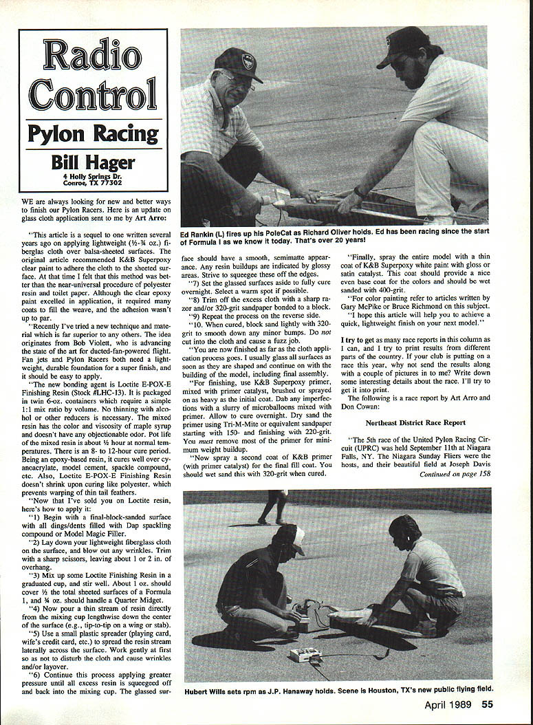 WE always looking new better ways finish Pylon Racers update glass cloth application sent Art Arro article sequel written several years ago applying lightweight A-3A oz fi berglas cloth over balsa-sheeted surfaces original article recommended K&B Superpoxy clear palnt adhere cloth sheeted sur face tune felt method bet ter near-universal procedure polyester resin toilet paper Although clear epoxy paint excelled application required coats fill weave adhesion wasnt up par Recently Ive tried new technique mate rial far superior others idea originates Bob Violett advancing state art ducted-fan-powered flight Fan jets Pylon Racers both need light weight durable foundation super finish should easy apply new bonding agent Loctite E-POX-E Finishing Resin Stock #LHC-13 packaged twin 6-oz containers require simple 11 mix ratio volume No thinning alco hol other reducers necessary mixed resin has color viscosity maple syrup doesnt have objectionable odor Pot life mixed resin about normal tem peratures 8- 12-hour cure period Being epoxy-based resin cures well over cy anoacrylate model cement spackle compound etc Also Loctite E-POX-E Finishing Resin doesnt shrink upon curing like polyester prevents warping thin tail feathers Now Ive sold Loctite resin heres apply 1 Begin final-block-sanded surface dings/dents filled Dap spackling compound Model Magic Filler 2 Lay down lightweight fiberglass cloth surface blow out wnnides Trim sharp scissors leaving about 1 2 overhang 3 Mix up some Loctite Finishing Resin graduated cup stir well About 1 oz should cover l sheeted surfaces Formula 1 M oz should handle Quarter Midget 4 Now pour thin stream resin directly mixing cup lengthwise down center surface eg tip-to-tip wing stab 5 Use small plastic spreader playing card wifes credit card etc spread resin stream laterally across surface Work gently first disturb cloth cause wrinkles and/or layover 6 Continue process applying greater pressure until excess resin squeegeed off back mixing cup glassed sur face should have smooth semimatte appear ance Any resin buildups indicated glossy areas Strive squeegee off edges 7 Set glassed surfaces aside fully cure overnight Select warm spot possible 8 Trim off excess cloth sharp ra zor and/or 320-grit sandpaper bonded block 9 Repeat process reverse side 10 cured block sand lightly 320grit smooth down minor bumps cut cloth cause fuzz job now finished far cloth appli cation process goes usually glass surfaces soon shaped continue building model including final assembly finishing use K&B Superpoxy primer mixed primer catalyst brushed sprayed heavy initial coat Dab imperfec tions slurry microballoons mixed primer Allow cure overnight Dry sand primer using Tri-M-Mite equivalent sandpaper starting 150- finishing 220-grit must remove primer rmm mum weight buildup Now spray second coat K&B primer primer catalyst final fill coat should wet sand 320-grit cured Finally spray entire model thin coat K&B Superpoxy white palnt gloss satin catalyst coat should provide nice base coat colors should wet sanded 400-grit color palnting refer articles written Gary McPike Bruce Richmond subject hope article will help achieve quick lightweight finish next model try get race reports column can try print results different parts country club putting race year send results along couple pictures Write down some interesting details about race Ill try get print following race report Art Arro Don Cowan Northeast District Race Report 5th race United Pylon Racing Cir cuit UPRC held September 11th Niagara Falls NY Niagara Sunday Fliers hosts beautiful field Joseph Davis Continued page 158 April 1989 55 Radio Confrol Pylon Racing Bill Hager 4 Holly Springs Dr Conroe TX 77302 Ed Rankin L fires up PoleCat Richard Oliver holds Ed has racing since start Formula know today Thats over 20 years Hubert Wills sets rpm JP Hanaway holds Scene Houston TXs new public flying field Modeling Accessories MASTER AJRSCREW Balsa Stripper Precision stripwood easy Balsa Strip per Strips up 1/2 wide 1/4 thick can Cut quickly accurately sheet stock vernier wheel advances 1/32 precise adjust ment stripper uses aid type 11 hobby blade $495 sugges fed ref Razor Master Assasw r ~4lane Plane uses heavy-duty industrial blade held place two locating screws allowing cutting depth set very rigidly accurately Use rounding smoothing contours fuselages cowlings shaping edges thinning strips etc $495 sug gesfed retail Replacement blades available stock no MA21O1 $149 pack 3 ine Fuel Filter fuel filter 2J outstanding value has threaded two-part alum num body 100-mesh stainless screen removeable easy cleaning $119 suggesfed ref Direct Drive 05 Prop Adaptor all-aluminum prop adaptor designed 05 electric motors recommended use Master Airscrew 7x4 7x6 8x4 8x6 propellers $395 sugges fed ref See Hobby Dealer WINDSOR PROPELLER CO 384 Tesconl Ct Santa Rosa CA 95401 allow fly need Mini EH welcome addition fill longing Helo fliers can fly want fly indoors out anytime Thanks Dave point importation Masters EH somewhat cloudy would appear want should contact Al berta Condor Trading Company PO Box 3479 Mission Viejo CA 92690 showed Helicopter recent IMS show seemed interested its importation As can see Dave Herbert has Electric Helicopter bug pretty bad Just preparing article another minicopter has released Called Honey Bee appears same general size layout Masters EH am checking availability will report findings Both new mini-electrics best suited flying power cord designed around new Futaba radio features builtin motor speed controller thc receiver case should also mention Astro Flight still manufactures 40-size cobalt Electric Heli copter use would perfect Hirobo Shuttle Kalt Baron 30 MX believe Hyatts sells complete Shuttle Electric package So thats Electric Helicopters 1989 Intri guing Challenging bet Practical Well has measured degrees Some people see no sense tethering Helicopter power cord intrigue untethered flight car rying load getting long flight pos sib