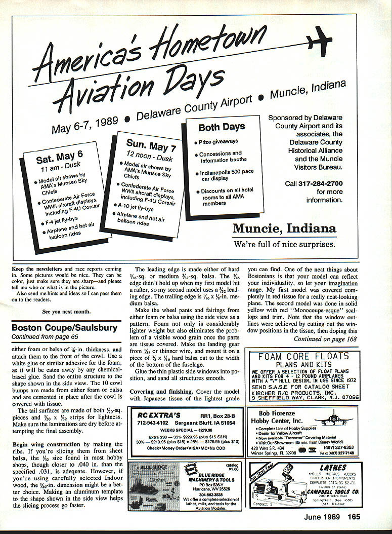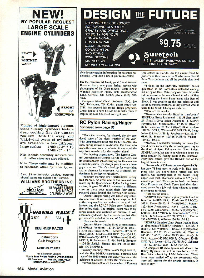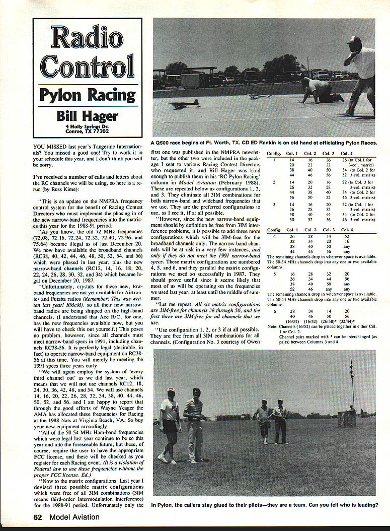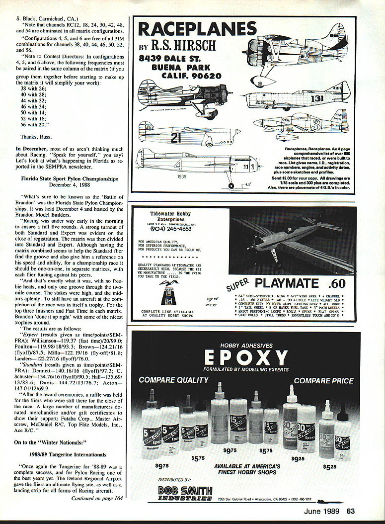 YOU MISSED last years Tangerine Internation als missed good Try work schedule year dont think will sorry Ive received number calls letters about RC channels will using re run Russ Kime update NMPRA frequency control system benefit Racing Contest Directors must implement phasing new narrow-band frequencies matric es year 1988-91 period As know old 72 MHz frequencies 7208 7216 7224 7232 7240 7296 7564 became illegal last December 20 now have available broadband channels RC38 40 42 44 46 48 50 52 54 56 phased last year plus new narrow-band channels RCl2 14 16 18 20 22 24 26 28 30 32 34 bccame le gal Dccember 20 1987 Unfortunately crystals new lowband frequencies yet available Airtron ics Futaba radios Remember writ ten last year RMcM new narrowband radios being shipped high-band channels understand Ace R/C has new frequencies available now will have check out yourself poses no problem however since channels must meet narrow-band specs 1991 including chan nels RC38-56 perfectly legal desirable fact operate narrow-band equipment RC3856 time will merely meeting 1991 specs three years early will again employ system third channel out did last year means will use channels RCL2 18 24 30 36 42 48 54 will use channels 14 16 20 22 26 28 32 34 38 40 44 46 50 52 56 am happy report through good efforts Wayne Yeager AMA has allocated frequencies Racing 1988 Nats Virginia Beach VA So buy new equipment accordingly 50-54 MHz Ham-band frequencies legal last year continue year foreseeable future course require user have appropriate FCC license will checked register Racing event violation Federal law use frequencies proper FCC license Ed Now matrix configurations Last year devised three possible matrix configurations free 31M combinations 31M means third-order insermodulation interference 1988-91 period Unfortunately first published NMPRA newslet ter other two included pack age sent various Racing Contest Directors requested Bill Hager kind enough publish RC Pylon Racing column Model Aviation February 1988 repeated below configurations 1 2 3 eliminate 31M combinations both narrow-band wideband frequencies use preferred configurations use see possible However since new narrow-band equip ment should definition free 31M inter ference problems possible add three configurations will 31M-free broadband channels narrow-band chan nels will risk very few instances meet 1991 narrow-band specs matrix configurations numbered 4 5 6 parallel matrix configu rations used successfully 1987 should prove useful since seems likely us will operating frequencies used last year least until middle sum mer Let repeat six matrix configurations 31M-free channels 38 through 56 first three 31M-free channels use Use configuration 1 2 3 possible free 31M combinations channels Configuration No 3 courtesy Owen Config Col ICol 2Col 3Col 4 1t4162628 Col1 202232 t matrix 38405034 toCol2 44465652 3-cot matrix 214201622toCol3for 2632283-col matrix 44384034toCol2for 565052463-col matrix 314162022toCol 2628323-col matrix 38404434toCol2 505256463-col matrix ConfigCol ICol 2Cot 3Cot 4 4 26281452 32342016 384050any 444656any remaining channels drop wherever space available 50-54 MHz channels drop two available columns 516283220 26344456 384050any 5246anyany remaining channels drop wherever space available 50-54 MHz channels drop two available columns 6 28 34 20 40 46 56 16/52t16/5226/3832/44 Note Channels 16/52 can placed together either Col Col 2 Channel pairs marked interchanged pairs between Columns 3 4 62 Model Aviation Radio Control Pylon Racing Bill Hager race begins Ft Worlh TX CD ED Rankin old hand officiating Pylon Races Pylon callers stay glued pilotsthey team Can tell leading S Black Carmichael CA Note channels RCL2 18 24 30 42 48 54 eliminated matrix configurations Configurations 4 5 6 free 31M combinations channels 38 40 44 46 50 52 56 Note Contest Directors configurations 4 5 6 above following frequencies must paired same column matrix group together before starting make up matrix will simpliti work 38 26 40 28 44 32 46 34 50 14 52 16 56 20 Thanks Russ December us arent thinking much about Racing Speak yourself say Lets look whats happening Florida re ported SEMPRA newsletter Florida State Sport Pylon Championships December 4 1988 Whats sure known Battle Brandon Florida State Pylon Champion ships held December 4 hosted Brandon Model Builders Racing under way early morning ensure full five rounds strong turnout both Standard Expert evident close registration matrix divided Standard Expert Although having matrix combined seems help Standard flier find groove also give him reference speed ability championship race should one-on-one separate matrices flier Racing against peers thats exactly what no free bie heats groove through twomile course stakes high midairs aplenty still have aircraft com pletion race itself trophy top three finishers Fast Time matrix Brandon done up right some nicest trophies around results follows Expert results given time/points/SEM PRA Williamsonl 1937 fast time/20/990 Poulton1 1998/18/933 Brown12421/16 flyoff/875 Milla 12219/16 fly-off/8 18 Landers12227/16 flyoff/760 Standard results given time/points/SEM PRA Dennett14016/16 flyoff/973 C Schuster13476/16 flyoft/905 Hall 13569/ 13/836 Davis14472/13/767 Acton 14701/12/699 After award ceremonies raffle held fliers still close race large number manufacturers nated merchandise and/or gift certificates show support Futaba Corp Master Air screw McDaniel R/C Top Flite Models Inc Ace R/C Winter Nationals 1988/89 Tangerine Internationals Once again Tangerine 88-89 complete success Pylon Racing best years yet Deland Regional Airport gave fliers ultimate flying site well landing strip forms Racing aircraft Continued page 164 TIdewater Hobby Enterprises L7& SE4kt StflflFlflhFL32691 904 245-4653 FOR AMERICAN QUALITY FOR SUPERIOR PERFORMANCE FOR PRODUCTS YOU CAN RE PROUD OF QUALITY STANDARDS AT TIDEWATER ARE NECESSARILY NIGH NECAUSE TSR KIT WE MANUPACTURE II THE PEIOD YOU TAKE TO 