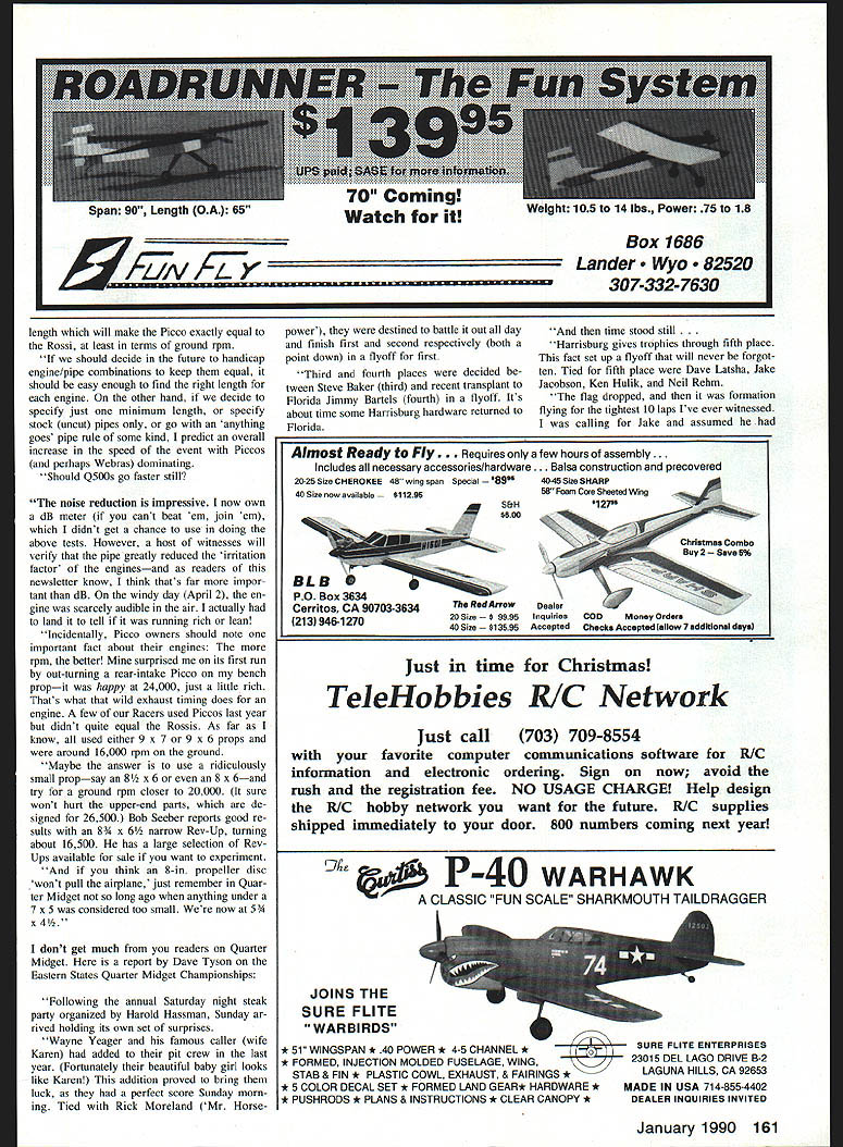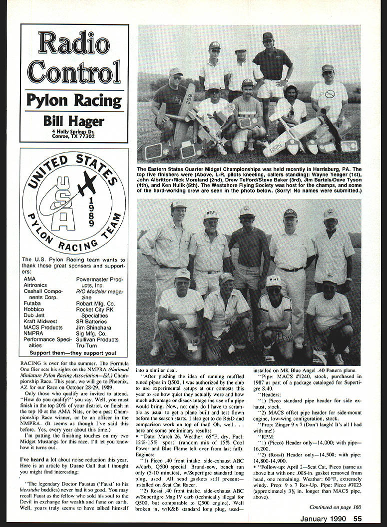 RACING over summer Formula flier sets sights NMPRA National Miniature Pylon Racing AssociationEd Cham pionship Race year will go Phoenix AZ Race October 28-29 1989 Only qualify invited attend qualify say Well must finish top 20% district finish top 10 AMA Nats past Cham pionship Race winner officer NMPRA seems though Ive said before Yes year about time Im putting finishing touches two Midget Mustangs race Ill let know turns Out Ive heard lot about noise reduction year article Duane Gall thought might find interesting legendary Doctor Faustus Faust bierstube buddies never good may recall Faust fellow sold soul Devil exchange wealth fame earth Well yours truly seems have talked himself similar deal After pushing idea running muffled tuned pipes Q500 authorized club use experimental setups contests year see quiet actually much advantage disadvantage use pipe would bring Now have scram ble usual get plane built test flown before season starts also get R&D comparison work top Oh well some preliminary results Date March 26 Weather 650F dry Fuel 12%-15% sport random mix 15% Cool Power Blue Flame left over last fall Engines 1 Picco 40 front intake side-exhaust ABC w/carb Q500 special Brand-new bench run 5-10 minutes w/Supertigre standard long plug used head gaskets still present installed Scat Cat Racer 2 Rossi 40 front intake side-exhaust ABC w/Supertigre Mag IV carb technically illegal Q500 comparable Q500 engine Well broken w/K&B standard long plug used installed MK Blue Angel 40 Pattern plane Pipe MACS #1240 stock purchased 1987 part package cataloged Superti gre S40 Headers 1 Picco standard pipe header side ex haust stock 2 MACS offset pipe header side-mount engine low-wing configuration stock Prop Zinger 9 x 7 Dont laugh Its RPM 1 Picco Header only14000 pipe 16200 2 Rossi Header only14500 pipe 14800-14900 Follow-up April 2Scat Cat Picco same above 008-in gasket removed head remaining Weather 600F extremely windy Prop 9 x 7 Rev-Up Pipe Picco #7023 approximately 3R longer MACS pipe above Continued page 160 January 1990 55 Radio Conoi Pylon Racing Bill Hager 4 Holly Springs Dr Conroe TX 77302 Eastern States Quarter Midget Championships held recently Harrisburg PA top five finishers Above L-R pilots kneeling callers standing Wayne Yeager 1st John Aibritton/Rick Moreland 2nd Drew Telford/Steve Baker 3rd Jim BartelslDave Tyson 4th Ken Hulik 5th Westshore Flying Society host champs some hard-working crew seen photo below Sorry No names submitted 9 p 1 9 8 494 ACIt US Pylon Racing team wants thank great sponsors support ers AMAPowermasler Prod Airtronics ucts Inc Cashall Compo-RIC Modeler maga nents Corp zine FutabaRobart Mfg Co HobbicoRocket City RK Dub Jett Specialties Kraft MidwestSR Batteries MACS ProductsJim Shinohara NMPRASig Mfg Co Performance Sped-Sullivan Products alliesTru-Turn Support themthey support Smal stanwed aett-sddrcind cowiope tar pncusa individual cfsnisicns Add 5300 fir COD Parrish Aircraft & Scale Models 1125 SW 4*bTefhntstloe1 333tT 305 581 4477 SAVE YOUR FIELD SNUF-LER muffler Ia low cost easy install lightweight sound reducing muffler no performance penalty answer AMA muffler rule suggestions saving flying fields Meets AMA muffler rule suggestions SNUF-FLERTM 3 10 decibels quieter stock muffler MUFFLER No power loss wIth possible 300-500 RPM increase patented Improves engine idle s better fuel economy Easily attached 25-108 stock mufflers Heat corrosion resistant Black E coat finish No special adapters required Weighs 35 025 Fits ASP BRAT ENYA FOX HP IRVINE K & B 05 MAX ROYAL VS SUPER TIGRE mufflers II available hobby shop ORDER DIRECT immediate shipment Check MO Visa MC. CODSEND 2Sf STAMP accepted Add$250 tsr UPS $200 COD and6% salestasFOR ADDITIONAL INFO Lfor Cald reodentAND JTEC CATALOG capacity discharger 11 aviv need cycle battery Yes Repeated charge discharge cycles low current levels such experience RC tend form active materials cells large crystals thus lessening active surface area Although does affect capacity battery does tend reduce discharge voltage can adversely affect operation equipment course time Perform ning few controlled cycles higher charge discharge rate reduces crystals effectively re vitalizing battery Discharging 11 volts per cell considered full discharge battery cycler available few dis charges through controlled discharger de scribed below time followed 24-hour charge radios 50 mA charger pro vide acceptable quite efficient alter native cycling should performed once twice year depending much use equipment 12 What happens cell goes down cases unless battery has severely mistreated will have caused inadequate charging ie trying recharge amount battery has dis charged Because charging about 70% ef ficient takes 14 15 hours put back 500 mA safer regard cells being fully discharged time used individual cells battery slightly different capacities weakest cell ie. lowest fully recharged time will start lag behind others capac ity Eventually lag will cause cell dis charge completely partway through discharge cycle entire battery pack results will obviously disastrous happens flight Normally condition one-cell discharge will cause cell reverse its polarity thus lowering batterys voltage over two volts unless left state long period se vere permanent damage should result partic ularly pencells Recharge check bat tery described above remember fully charge time future 13 can check capacity bat tery cvcler Build controlled dis charger can made quite simply requir ing few resistors spare charger plugs voltmeter stopwatch circuit de scribed below discharges about 230-240 milli amps uses cheap resistors can built about hour operate instructions receiver transmitter instructions brackets [I After charging battery least 15 hours connect voltmeter points B [A C] discharger connect dis Rx Jack resistors 820 5% Unit de signed discharge ONE pack time Av erage current drain about 240 mA charger plug appropriate battery volt meter should read 5-6 volts [10-12 volts] w