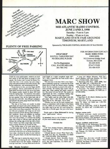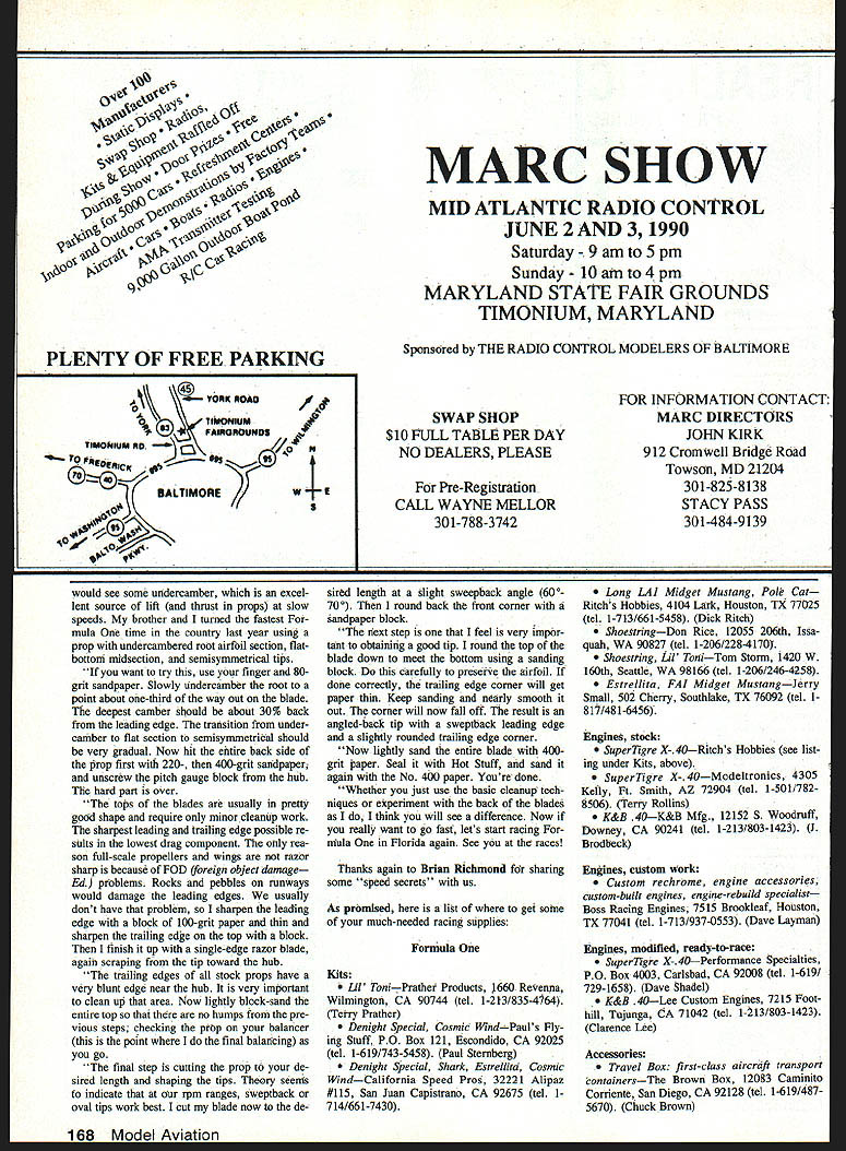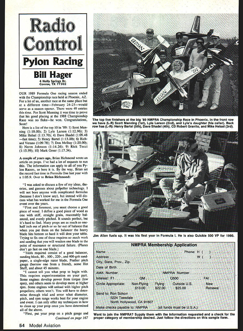 OUR 1989 Formula racing season ended Championship race held Phoenix AZ lot us another race same place different timeFebruary 24-25would serve season opener 49 entries time Scott Manning time prove good placing 1988 Championship Race no flukehe won Congratulations Scott list top lOin 89 1 Scott Man ning 11000 2 Lyle Larson 11296 3 Mike Helsel 11370 4 Dave Shadel 10948 fast time 5 Henry Bartel 11300 6 Rich ard Verano 10978 7 Don McStay 12000 8 Norm Johnson 11426 9 Rick Tocci 11599 10 Mark Greer 11734 couple years ago Brian Richmond wrote article props Ive lot requests run information can apply Py lon Racers way Brian set record fast time Formula last year 1059 Over Brian Richmond asked discuss few ideas ories guesses about prdpeller technology will bore anyone complicated formulas because dont know instead will dis cuss what has worked Formula event over years First foremost must choose good piece wood define good piece wood stiff straight grain reasonably bal anced evenly pitched sounds perfect its hard find props much onehalf inch Out pitch far Out balance put balancer heavy blade hits bottom hard will dent table Trying fix requires much work sanding will weaken blade point resonance structural failure Planes dont go fast blade Tools required consist good balancer sanding block 80- 100- 220- 400-grit sand paper single-edge razor blade Prather pitch gauge borrow friend some Hot Stuff about 45 minutes cannot tell what prop begin requires experimentation part Some engines develop power torque low rpm others seem develop higher rpm Some engines will unload higher pitch propellers others wont will have deter through trial error what diameter pitch rpm range works best engine event can offer techniques clean up prop once have determined above First put prop pitch gauge Continued page 167 54 Model Aviation Radio Control Pylon Racing Bill Hager 4 Holly Springs Dr Conroe TX 77302 Jim Allen fuels up first year Formula also Quickie 500 Vp 1990 Want join NMPRA Supply Information requested check proper category membership desired Just follow directions sample form REALISTIC PILOT FIGURES Figures Available Now 1/3 Civilian S Navy /4 Civilian / ME /s Civilian AE Bust $1995 & $4 UPS $795 & $3 UPS Bust Phone 201-996-4414 ENIGh1TS CF ThI AIIINC PO Box 187 Pittatown NJ 08867 RC Scale/Crooks Continued page 163 picture ever taken Navy photograph er request very specific about aircraft picture need Preferably should request picture aircraft type serial number approximate date squadron write address will clue particulars fees Customer Services Department Defense Still Media Records Cen ter Code SSRC Washington DC 20374-1681 want model look better have better ground handling Robart has just ticket have made excellent Giant Scale re tracts shock-absorbing struts some time Now have same quality retracts shock-absorbing struts 40/120-size models set designed specifically Yellow Aircraft F-4 kit However will work Spring-Air slimline retracts Fear solution Contact Robart theyll help Out Flying Dynamax/OS ducted-fan combina tion device available will help both fuel economy aircraft performance considerably called turbine-body fairing streamlines carburetor area en gine usual unfaired installation high-speed airflow creates negative draft carburetor enclosing area streamline rear engine carb now draws least neutralif positiveair pressure aerodynamically clean model SR-71 approximately 7-mph speed increase accompa RONS MODEL Radio Controlled BIJILDINGAirplaneN Other Aircraft Boats 213451-0484 Build Fly WeU Call Write 435 San Vicente Blvd J Santa Monica CA 90402I OTBE COOL HSTAY COOL PERFECT SHADS AT THE FLYING FIELDTRACEOUT CARPING OR AT ThE LAKE OFFICIAL SHADE TENT AT 1987 RATS FOR N/C PATFERN JUDGES SHADE TENT AT 1988 RATS AT R/C PAIFERR SITES FOR OFFICIALS HEADOUARTERS TENTS AND TRANSI4ITIER IMPOONDS POkThE$AT5 500141 ---- No center pole nearly 7 tall Opaque heat reflecting canopy QIX8E2LLN0 ---- 5 Minutes 6R1R LIOlnLWGHT Weighs 6 1/2 pounds WI8D8r15TANT 6110 Tested tD 48 MPH ADJUSTABLE -- Level tilted side EXFAIIDADIE ---- Too three can joined PRICE Econoey helD$39OD $488OPS Sportesan 6e15$4395s $488UPS Dining Nob$5788s $488UPS Sporthing 9s18$8358 $558UPS Mech Tote-Tarp 4116$ 795i $288OPS Trak-Lok-Eve Kit TAA2$1008$288UPS Trak-Iok-Eye Kit TAA3$1458 $288UPS CALLLEQLL FRSZ 1-800-421-4626 4MCO ORDERI OHALERS & DISTRIR5TOR CALLSNAf 209 SW BUCY AVE Free literature availahieBARTLESVILLEOK 74083 4M CoepanyPH 918-336-9445 want Scat Cat have twisted wing dont want unevenly pitched props take single-edge razor blade scrape back prop tip hub until perfectly flat stations should take few minutes Now unless youre ready try some trick top secret stuff youre done back blades However never quit Depending rpm diameter tips blades can turning 400-500 mph Does ajet airplane uti lize flat-bottom wing does pro peller accept lot drag run fulllength flat-bottom blades could get rid drag would turn blade faster could use larger blade same rpm either way youll first down #1 pylon start back blade about station sixor one-third blade length tipand carefully work toward tip piece 100-grit black sandpaper Take little off leading edge falr amount off trail ing edge being careful touch center blade approximately 30% back lead ing edge Compare blade other care fully Semisyminetrical fine just dont go too far Doing right takes lot practice get too frustrated simply take prop break half will feel lot better Usually takes two such sac rifices before have part mastered Another trick have known try deals inner root section blade part moving through air very fast Some say root doesnt provide thrust just con nects tip hub streamlined enough make root section pull its own weight Pic ture high-speed wing slow flight leading edge devices out flaps down PORT5-10ADSandI8AXzW$yS kits use R/Vs have canopy track nied fuel savings about ounce per min ute per engine fairings bargain $9 Contact DC Aviation PO Box 98 Big Rock IL 60511 some events comlng up summer C