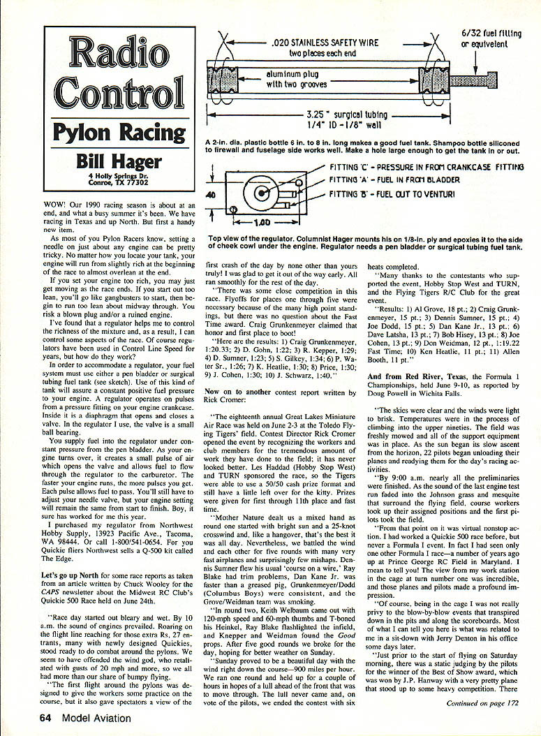 WOW 1990 racing season about end what busy summer its have racing Texas up North first handy new item As Pylon Racers know setting needle just about engine can pretty tricky No matter locate tank engine will run slightly rich beginning race almost overlean end set engine too rich may just get moving race ends start out too lean youll go like gangbusters start gin run too lean about midway through risk blown plug and/or ruined engine Ive found regulator helps control richness mixture result can control some aspects race course regu lators have used Control Line Speed years work order accommodate regulator fuel system must use either pen bladder surgical tubing fuel tank see sketch Use kind tank will assure constant positive fuel pressure engine regulator operates pulses pressure fitting engine crankcase Inside diaphragm opens closes valve regulator use valve small ball bearing supply fuel regulator under con stant pressure pen bladder As en gine turns over creates small pulse air opens valve allows fuel flow through regulator carburetor faster engine runs pulses get pulse allows fuel pass Youll still have adjust needle valve engine setting will remain same start finish Boy sure has worked year purchased regulator Northwest Hobby Supply 13923 Pacific Ave Tacoma WA 98444 call 1-800/541-0654 Quickie fliers Northwest sells Q-500 kit called Edge Lets go up North some race reports taken article written Chuck Wooley CAPS newsletter about Midwest RC Clubs Quickie 500 Race held June 24th Race day started out bleary wet 10 am sound engines prevailed Roaring flight line reaching extra Rs 27 en trants newly designed Quickies stood ready combat around pylons seem have offended wind god retali ated gusts 20 mph share bumpy flying first flight around pylons de signed give workers some practice course also gave spectators view 020 STAINLESS SiFETY WIRE two places end 6/32 fuel fitting equivelent b/N aluminum plug grooves 325 - surgical tubing 1/4 ID-l/8 wall 2-in dia plastic bottle 6 8 long makes good fuel tank Shampoo bottle siliconed firewall fuselage side works well Make hole large enough get tank out FITTING C PRESSURE IN FROM CRANKCASE FITTIE3 FITTING FuEL IN FRQ1 BLAODER FITTING fl FUEL OUT TO VENTURI Top view regulator Columnist Hager mounts 1/B-In ply epoxies side cheek cowl under engine Regulator needs pen bladder surgical tubing fuel tank first crash day other yours truly glad get out way early ran smoothly rest day some close competition race Flyoffs places through five necessary because high point stand ings no question about Fast Time award Craig Grunkenmeyer claimed honor first place boot results 1 Craig Grunkenmeyer 12033 2 D Gohn 122 3 R Kepper 129 4 D Sumner 123 5S Gilkey 134 6 P Wa ter Sr 126 7 K Heatlie 130 8 Price 130 9 J Cohen 130 10 J Schwarz 140 Now another contest report written Rick Cromer eighteenth annual Great Lakes Miniature Air Race held June 2-3 Toledo Fly ing Tigers field Contest Director Rick Cromer opened event recognizing workers club members tremendous amount work have done field has never looked better Les Haddad Hobby Stop West TURN sponsored race Tigers able use 50/50 cash prize format still have little left over kitty Prizes given first through 11th place fast time Mother Nature dealt us mixed hand round started bright sun 25-knot crosswind like hangover thats best day Nevertheless battled wind other five rounds very fast airplanes surprisingly few mishaps Den nis Sumner flew usual course wire Ray Blake trim problems Dan Kane Jr faster greased pig Grunkenmeyer/Dodd Columbus Boys consistent Grove/Weidman team smoking round two Keith Welbaum came Out 120-mph speed 60-mph thumbs T-boned Heinkel Ray Blake flashlighted infield Knepper Weidman found Good props After five good rounds broke day hoping better weather Sunday Sunday proved beautiful day wind right down course900 miles per hour ran round held up couple hours hopes lull ahead front move through lull never came vote pilots ended contest six heats completed thanks contestants sup ported event Hobby Stop West TURN Flying Tigers R/C Club great event Results 1 Al Grove 18 pt 2 Craig Grunk enmeyer 15 pt 3 Dennis Sumner 15 pt 4 Joe Dodd 15 pt 5 Dan Kane Jr 13 pt 6 Dave Latsha 13 pt 7 Bob Hisey 13 pt 8 Joe Cohen 13 pt 9 Don Weidman 12 Pt 11922 Fast Time 10 Ken Heatlie 11 p1 11 Allen Booth 11 Pt Red River Texas Formula 1 Championships held June 9-10 reported Doug Powell Wichita Falls skies clear winds light brisk Temperatures process climbing upper nineties field freshly mowed support equipment place As sun began its slow ascent horizon 22 pilots began unloading planes readying days racing ac tivities 900 am nearly preliminaries finished As sound last engine test run faded Johnson grass mesquite surround flying field course workers took up assigned positions first pi lots took field point virtual nonstop ac tion worked Quickie 500 race before never Formula event fact seen other Formula racea number years ago up Prince George RC Field Maryland mean tell view work station cage turn number incredible planes pilots made profound im pression course being cage really privy blow-by-blow events transpired down pits along scoreboards Most what can tell what related sit-down Jerry Denton office some days later Just prior start flying Saturday morning static judging pilots winner Best Show award won JP Hanway very pretty plane stood up some heavy competition Continued page 172 64 Model Aviation Radio Confrol Pylon Racing Bill Hager 4HollyDr Conm modela fill need hotdog show-off sport plane Knife edge take-offs flat apins snaps anything can Wing foam Fuselage Tail lite ply balsa Builds quick lands like trainer Flyingweight lOlba 184 1 l3lbs 192 Ohio OHIO SUPERSTAR PRODUCTS INC 11376 RIOGEWAY ROADKENSINGTON OHIO 44427 r 216-223-1950 great idea cant resist quoting Mr Stahls comments opening paragraph Overemphasis strictly flying designs con tests throughout country recent years has brought about unwarranted condition ne glect buildin