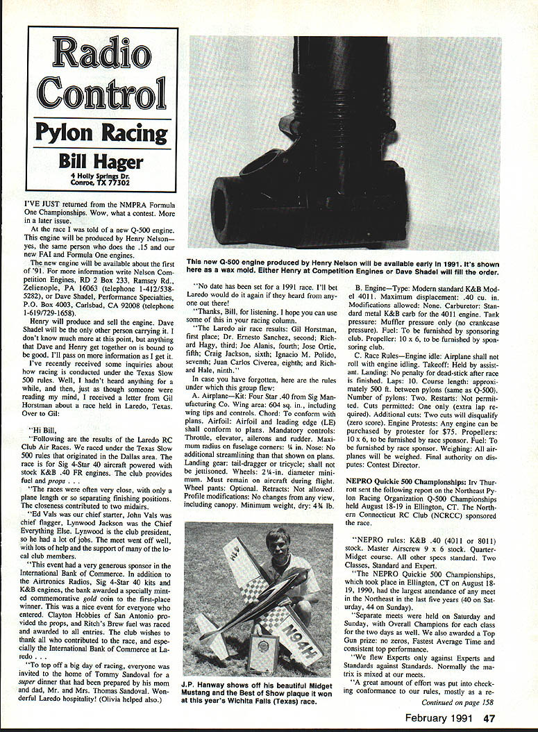 IVE JUST returned NMPRA Formula Championships Wow what contest later issue race told new Q-500 engine engine will produced Henry Nelson yes same person does 15 new PAl Formula engines new engine will available about first 91 information write Nelson Com petition Engines RD 2 Box 233 Ramsey Rd Zelienople PA 16063 telephone 1-412/5385282 Dave Shadel Performance Specialties PO Box 4003 Carlsbad CA 92008 telephone 1-619/729-1658 Henry will produce sell engine Dave Shadel will other person carrying dont know much point anything Dave Henry get together bound good Ill pass information get Ive recently received some inquiries about racing conducted under Texas Slow 500 rules Well hadnt heard anything just though someone reading mind received letter Gil Horstman about race held Laredo Texas Over Gil Hi Bill Following results Laredo RC Club Air Races raced under Texas Slow 500 rules originated Dallas area race Sig 4-Star 40 aircraft powered stock K&B 40 FR engines club provides fuel props races often very close plane length separating finishing positions closeness contributed two midairs Ed Vals chief starter John Vals chief flagger Lynwood Jackson Chief Everything Else Lynwood club president lot jobs meet went off well lots help support of lo cal club members event very generous sponsor International Bank Commerce addition Airtronics Radios Sig 4-Star 40 kits K&B engines bank awarded specially mint ed commemorative gold coin first-place winner nice event everyone entered Clayton Hobbies San Antonio pro vided props Ritchs Brew fuel raced awarded entries club wishes thank contributed race espe cially International Bank Commerce Laredo top off big day racing everyone invited home Tommy Sandoval super dinner prepared mom dad Mr Mrs Thomas Sandoval Won derful Laredo hospitality Olivia helped also No date has set 1991 race Ill bet Laredo would again heard out Thanks Bill listening hope can use some racing column Laredo air race results Gil Horstman first place Dr Ernesto Sanchez second Rich ard Hagy third Joe Alanis fourth Jose Ortie fifth Craig Jackson sixth Ignacio M Polido seventh Juan Carlos Civerea eighth Rich ard Hale ninth case have forgotten rules under group flew AirplaneKit Four Star 40 Sig Man ufacturing Co Wing area 604 sq including wing tips controls Chord conform plans Airfoil Airfoil leading edge LE shall conform plans Mandatory controls Throttle elevator ailerons rudder Maxi mum radius fuselage corners Nose No additional streamlining shown plans Landing gear tail-dragger tricycle shall jettisoned Wheels 2 A-in diameter mini mum Must remain aircraft during flight Wheel pants Optional Retracts allowed Profile modifications No changes view including canopy Minimum weight dry 4h lb B EngineType Modern standard K&B Mod el 4011 Maximum displacement 40 cu Modifications allowed None Carburetor Stan dard metal K&B carb 4011 engine Tank pressure Muffler pressure no crankcase pressure Fuel furnished sponsoring club Propeller 10 x 6 furnished spon soring club C Race RulesEngine idle Airplane shall roll engine idling Takeoff Held assist ant Landing No penalty dead-stick after race finished Laps 10 Course length approxi mately 500 ft between pylons same Q-500 Number pylons Two Restarts permit ted Cuts permitted extra lap re quired Additional cuts Two cuts will disquali1r zero score Engine Protests Any engine can purchased protester $75 Propellers 10 x 6 furnished race sponsor Fuel furnished race sponsor Weighing air planes will weighed Final authority dis putes Contest Director NEPRO Quickie 500 Championships Irv Thur rott sent following report Northeast Py lon Racing Organization Q-500 Championships held August 18-19 Ellington CT North ern Connecticut RC Club NCRCC sponsored race NEPRO rules K&B 40 4011 8011 stock Master Airscrew 9 x 6 stock QuarterMidget course other specs standard Two Classes Standard Expert NEPRO Quickie 500 Championships took place Ellington CT August 1819 1990 largest attendance meet Northeast last five years 40 Sat urday 44 Sunday Separate meets held Saturday Sunday Overall Champions class two days well also awarded Top Gun prize no zeros Fastest Average Time consistent top performance flew Experts against Experts Standards against Standards Normally ma trix mixed meets great amount effort put check ing conformance rules mostly re Continued page 158 February 1991 47 Radio Control Pylon Racing Bill Hager 4HoIlySprln Dr Conro TX new Q-500 engine produced Henry Nelson will available early 1991 Its shown wax mold Either Henry Competition Engines Dave Shadel will fill order JP Hanway shows off beautiful Midget Mustang Best Show plaque won years Wichita Falls Texas race S E beSt sellng spa lgnlttOfl System V Chosen Byron Ovighids ThG Mtg uwI AM Anratt Sqiply tar its outsiuuhg reliablity Comp e e angle cylinder system mc ud ng h o e coup ed spark advance kit spa k spa k pug ead25 pug ba e y pack charger 900 ded 0 Much longer une life Easy hand startsno kickback 1000-12in RPM releble kite 0% inure power fain atTokers oni mstahtimn evulable Lower piced fuels no nitre needed S Shielded uk uul 90 phig cover Ferniuye902lt4strokesktgleuidtwhicyfrders KlMzalWoductsevdmlie ing preparation working time Re-launches allowed except winch failure officials miscue Club winches should used about same power Just get Flight Group up winches ask Everybody ready say Go start task Remember nothing official about suggested rules F3B/USA Board just asks clubs try out during 91 season let us know what happens think will work trying popularize SMT com ing up rules appeal fliers SMT aimed being 11w SMT program works perhaps Americans will get interested multi-task flying move up real F3B flying Well need feedback based actual ex perience meantime new rules sound F3B/USA specialized newsletter F3B SMT enthusiasts $12 six issues per RC Aerobatics/Van Putte Continued page 43 Scale pilots Sport pilots Racing pilots IMAA pilots Old-Timers yes Free Flight pilots hes afraid will end until AMA includes rule Safety C