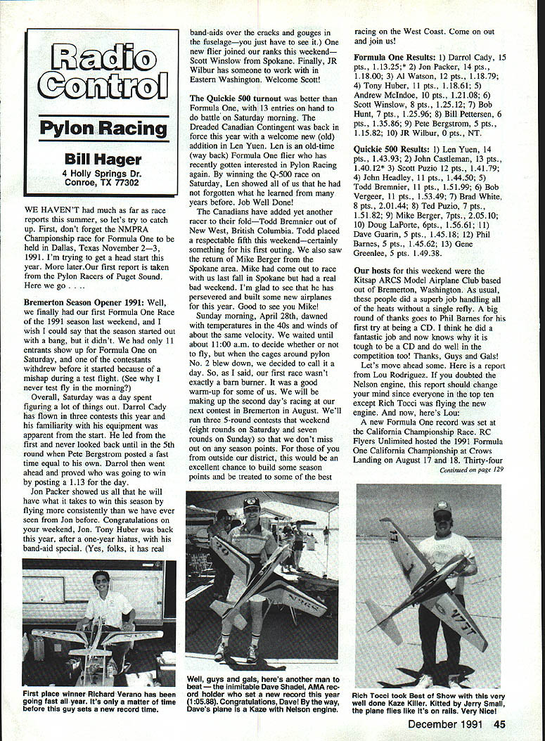 WE HAVENT much far race reports summer lets try catch up First dont forget NMPRA Championship race Formula held Dallas Texas November 23 1991 Im trying get head start year laterOur first report taken Pylon Racers Puget Sound go Bremerton Season Opener 1991 Well finally first Formula Race 1991 season last weekend wish could say season started out bang didnt 11 entrants show up Formula Saturday contestants withdrew before started because mishap during test flight See never test fly morning Overall Saturday day spent figuring lot things out Darrol Cady has flown three contests year familiarity equipment apparent start led first never looked back until 5th round Pete Bergstrom posted fast time equal own Darrol went ahead proved going win posting 113 day Jon Packer showed us will have what takes win season flying consistently have ever seen Jon before Congratulations weekend Jon Tony Huber back year after one-year hiatus band-aid special Yes folks has real band-aids over cracks gouges fuselageyou just have see new flier joined ranks weekend Scott Winslow Spokane Finally JR Wilbur has someone work Eastern Washington Welcome Scott Quickie 500 turnout better Formula 13 entries hand battle Saturday morning Dreaded Canadian Contingent back force year welcome new old addition Len Yuen Len old-time way back Formula flier has recenfly gotten interested Pylon Racing again winning Q-500 race Saturday Len showed us forgotten what learned years before Job Well Done Canadians have added yet another racer foldTodd Bremnier out New West British Columbia Todd placed respectable fifth weekendcertainly something first outing also saw return Mike Berger Spokane area Mike come out race us last fall Spokane real bad weekend Im glad see has persevered built some new airplanes year Good see Mike Sunday morning April 28th dawned temperatures 40s winds about same velocity waited until about 1100 am decide whether fly cages around pylon No 2 blew down decided call day So said first race wasnt exactly barn burner good warm-up some us will making up second days racing next contest Bremerton August Well run three 5-round contests weekend eight rounds Saturday seven rounds Sunday dont miss out season points outside district would excellent chance build some season points treated some best racing West Coast Come out join us Formula Results 1 Darrol Cady 15 pts 11325* 2 Jon Packer 14 pts 11800 3 Al Watson 12 pts 11879 4 Tony Huber 11 pts 11861 5 Andrew Mclndoe 10 pts 12108 6 Scott Winslow 8 pts 12512 7 Bob Hunt 7 pts 12596 8 Bill Pettersen 6 pts 13586 9 Pete Bergstrom 5 pts 11582 10 JR Wilbur 0 pts NT Quickie 500 Results 1 Len Yuen 14 pts 14393 2 John Castleman 13 pts 14012 3 Scott Puzio 12 pts 14179 4 John Headley 11 pts 14450 5 Todd Bremnier 11 pts 15199 6 Bob Vergeer 11 pts 15349 7 Brad White 8 pts 20144 8 Ted Puzio 7 pts 15182 9 Mike Berger 7pts 205 10 10 Doug LaPorte 6pts 15661 11 Dave Guarin 5 pts 14518 12 Phil Barnes 5 pts 14562 13 Gene Greenlee 5 pts 14938 hosts weekend Kitsap ARCS Model Airplane Club based out Bremerton Washington As usual people did superb job handling heats single refly big round thanks goes Phil Barnes first try being CD think did fantastic job now knows tough CD well competition too Thanks Guys Gals Lets move ahead some report Lou Rodriguez doubted Nelson engine report should change mind since everyone top ten except Rich Tocci flying new engine now heres Lou new Formula record set California Championship Race RC Flyers Unlimited hosted 1991 Formula California Championship Crows Landing August 17 18 Thirty-four Continued page 129 December 1991 45 Pylon Racing Bill Hager 4 Holly Springs Dr Conroe TX 77302 First place winner Richard Verano has going fast year its matter time before guy sets new record time Well guys gais heres another man beat itable Dave Shadel AMA rec ord holder set new record year 10588 Congratulations Dave way Daves plane Kaze Nelson engine Rich Tocci took Best Show very well done Kaze Killer Kitted Jerry Small plane flies like its rails Very Nice RC Aerobatics/Van Putte Continued page 116 judges would otherwise have given eight theyll give four instead know what theyre doing Get somebody help box practice chalked painted white line toward poles would big help too because probably wont able see poles Now rse Cuban Eight complete draw another straight line Cuban Eight middle box draw another straight line exit box left Once youve exited box free whatever want Just remember youre box performing maneuvers drawing straight lines new Sportsman class maneuver schedule continues second set three maneuvers Immelmaun Turn Split S Three Inside Loops before exiting box again time will exiting box right Theres three-maneuver set Straight Inverted Flight Stall Turn Reverse Outside Loop before get relief box sets three maneuvers box will allow practice staying box managing aircraft its Once move up Advanced dont get relief box tough put aircraft want different wind conditions limited experience turnaround Ive discovered think about drawing pictures about doing individual maneuvers Its easy describe what mean maneuvers flow other what have work maneuver depends previous maneuver example too close draw too long straight line after Double Stall Turn wont have enough room box 1/2 Reverse Cuban Eight happens youll probably ugly job trying fit rse Cuban Eight box finish up airplane going too fast bottom Suddenly Cuban Eight upon youll rush botching well think get picture pun intended Try drawing maneuvers piece paper help visualize should look sequenced together air will need 1992/1993 rule book Buy first opportunity time AMA sent rule book AMA member Now Contest Directors get free rule book first chance buy rule book will AMA membership renewal time So order rule book read thoroughly arrives right around first year go out practice may make perfect sure cuts down excuses practice luckier get Rule books will mailed automatically vice-presidents associate vicepresidents Contest Board members rule 