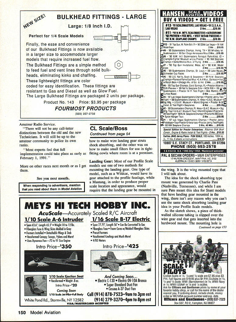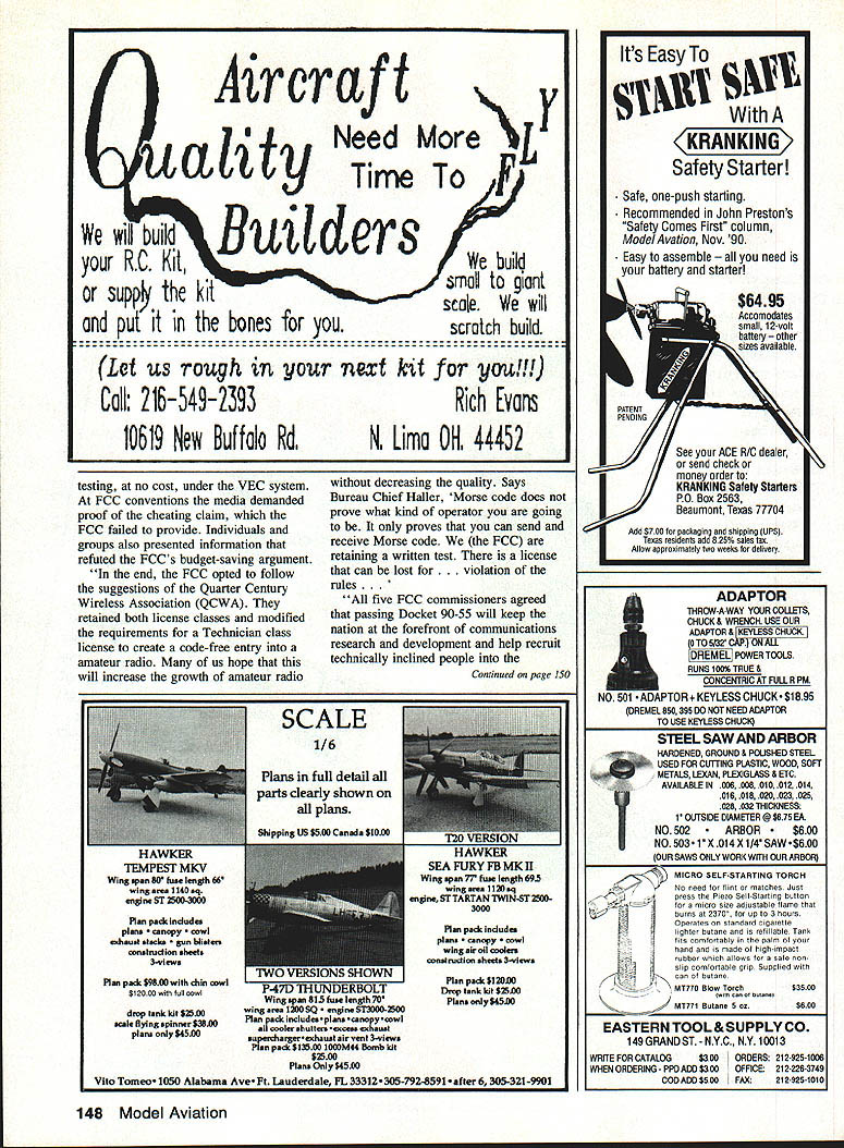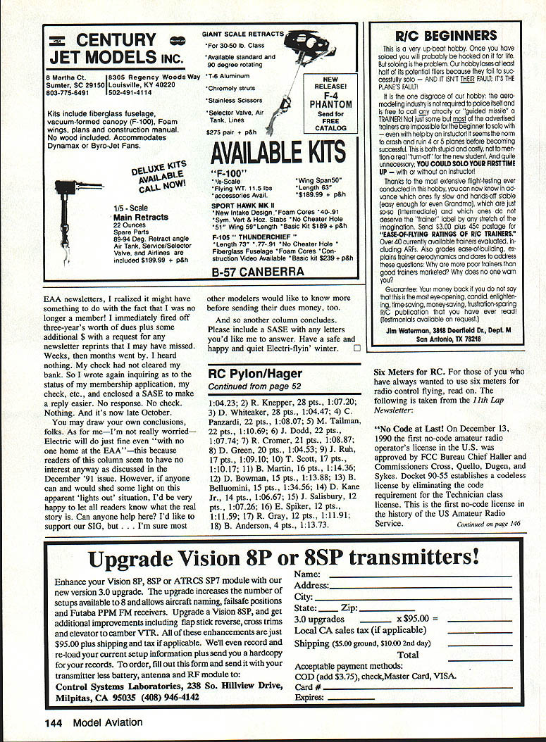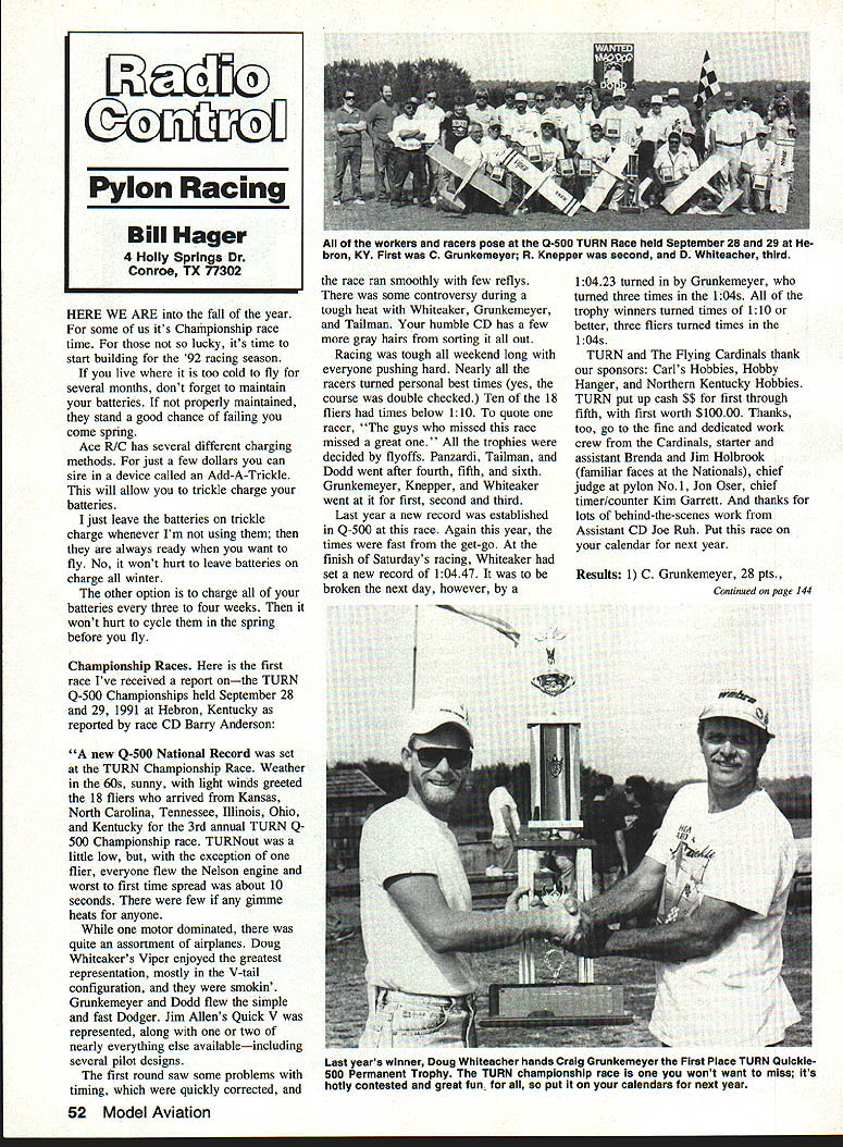 HERE WE ARE fall year some us its Championship race time lucky its time start building 92 racing season live too cold fly several months dont forget maintain batteries properly maintained stand good chance failing come spring Ace R/C has several different charging methods just few dollars can sire device called Add-A-Trickle will allow trickle charge batteries just leave batteries trickle charge whenever Im using always ready want fly No wont hurt leave batteries charge winter other option charge batteries three four weeks wont hurt cycle spring before fly Championship Races first race Ive received report onthe TURN Q-500 Championships held September 28 29 1991 Hebron Kentucky reported race CD Barry Anderson new Q-500 National Record set TURN Championship Race Weather 60s sunny light winds greeted 18 fliers arrived Kansas North Carolina Tennessee Illinois Ohio Kentucky 3rd annual TURN Q 500 Championship race TURNout little low exception flier everyone flew Nelson engine worst first time spread about 10 seconds few gimme heats anyone motor dominated quite assortment airplanes Doug Whiteakers Viper enjoyed greatest representation mostly V-tail configuration smokin Grunkemeyer Dodd flew simple fast Dodger Jim Allens Quick V represented along two nearly everything else availableincluding several pilot designs first round saw some problems timing quickly corrected race ran smoothly few reflys some controversy during tough heat Whiteaker Grunkemeyer Tailman humble CD has few gray hairs sorting out Racing tough weekend long everyone pushing hard Nearly racers turned personal best times yes course double checked Ten 18 fliers times below 110 quote racer guys missed race missed great trophies decided flyoffs Panzardi Tailman Dodd went after fourth fifth sixth Grunkemeyer Knepper Whiteaker went first second third Last year new record established Q-500 race Again year times fast get-go finish Saturdays racing Whiteaker set new record 10447 broken next day however 10423 turned Grunkemeyer turned three times l04s trophy winners turned times 110 better three fliers turned times 1 04s TURN Flying Cardinals thank sponsors Carls Hobbies Hobby Hanger Northern Kentucky Hobbies TURN put up cash $$ first through fifth first worth $10000 Thanks too go fine dedicated work crew Cardinals starter assistant Brenda Jim Holbrook familiar faces Nationals chief judge pylon No1 Jon Oser chief timer/counter Kim Garrett thanks lots behind-the-scenes work Assistant CD Joe Ruh Put race calendar next year Grunkemeyer 28 pts 52 Model Aviation Pylon Racing Bill Hager 4 Holly Springs Dr Conroe TX 77302 workers racers pose 0-500 TURN Race held September 28 29 Hebran KY First C Grunkemeyer R Knepper second D Whiteacher third Results 1 C Continued page 144 Last years winner Doug Whiteacher hands Craig Grunkemeyer First Place TURN Quickie500 Permanent Trophy TURN championshIp race wont want miss its hotly contested great fun put calendars next year 8 Martha Ct18305 Regency Woods Way Sumter SC 291501 Louisville KY 40220 803-775-6491 1502-491-4114 Kits include fiberglass fuselage vacuum-formed canopy F-ba Foam wings plans construction manual No wood included Accommodates Dynamax Byro-Jet Fans z CENTURYGIANT SCALE RETRACTS 30-50 lb Class- JET MODELS INCAvadabie standard T-6 AluminumNEW Chromoly StrutsI RELEASE Stainless scissorsI F-4 PHANTOM Selector Valve Air-ISend Tank Lines $275 pair ATALOG AVAILABLE KITS F-100 1/aScale Flying WT 115 lbs accessories Avail SPORT HAWK MK II New Intake Design Foam Cores 40-91 SYm Vert & Hoz Stabs No Cheater Hole 51 Wing 59 Length Basic Kit $189 F-lOS THUNDERCHIEF Length 7V 1 No Cheater Hole Fiberglass Fuselage Foam Cores Con struction Video Available c kit $239 F 0LU -Scale Main Retracts 22 Ounces Spare Parts 89-94 Deg Retract angle Air Tank Service/Selector Valve Airlines included $19999 EAA newsletters realized might have something fact no longer member immediately fired off three-years worth dues plus some additional $ request newsletter reprints may have missed Weeks months went heard nothing check cleared batik So wrote again inquiring status membership application check etc enclosed SASE make reply easier No response No check Nothing its now late October may draw own conclusions folks As meIm really worried Electric will just fine no home EAAthis because readers column seem have no interest anyway discussed December 91 issue However anyone can would shed some light apparent lights out situation Id very happy let readers know what real story Can anyone help Id like support SIG sure B-57 CANBERRA Wing SpansO Length 63 $18999 other modelers would like know before sending dues money too another column concludes Please include SASE letters youd like answer Have safe happy quiet Electri-flyin winter ] RC Pylon/Hager Continued page 52 10423 2 R Knepper 28 pts 10720 3 D Whiteaker 28 pts 10447 4 C Patizardi 22 pts 10807 5 M Tailman 22 pts 11069 6 J Dodd 22 pts 10774 7 R Cromer 21 pts 10887 8 D Green 20 pts 10453 9 J Ruh 17 pts 10910 10 T Scott 17 pts 11017 11 B Martin 16 pts 11436 12 D Bowman 15 pts 11388 13 B Belluomini 15 pts 13456 14 D Kane Jr 14 pts 10667 15 J Salisbury 12 pts 10726 16 E Spiker 12 pts 11159 17 R Gray 12 pts 11191 18 B Anderson 4 pts 11373 Six Meters RC have always wanted use six meters radio control flying read following taken 11th Lap Newsletter No Code Last December 13 1990 first no-code amateur radio operators license US approved FCC Bureau Chief Haller Commissioners Cross Quello Dugen Sykes Docket 90-55 establishes codeless license eliminating code requirement Technician class license first no-code license history US Amateur Radio ServiceContinued page 146 Upgrade Vision 8P 8SP transmitters Enhance Vision 8P 85P ATRCS SP7 module new version 30 upgrade upgrade increases number setups available 8 allows aircraft naming failsafe positions Futaba PPM FM receivers Upgrade Vision 85P get additional improvements including flap stick reverse cross trims elevator camber VTR enhancements
