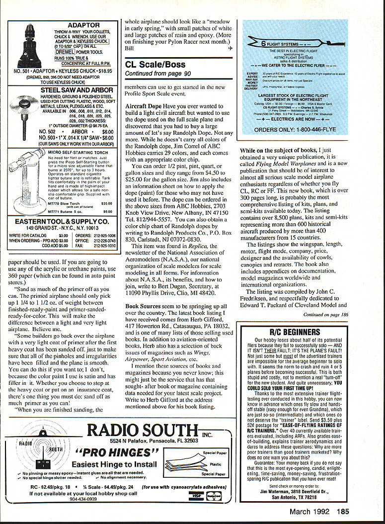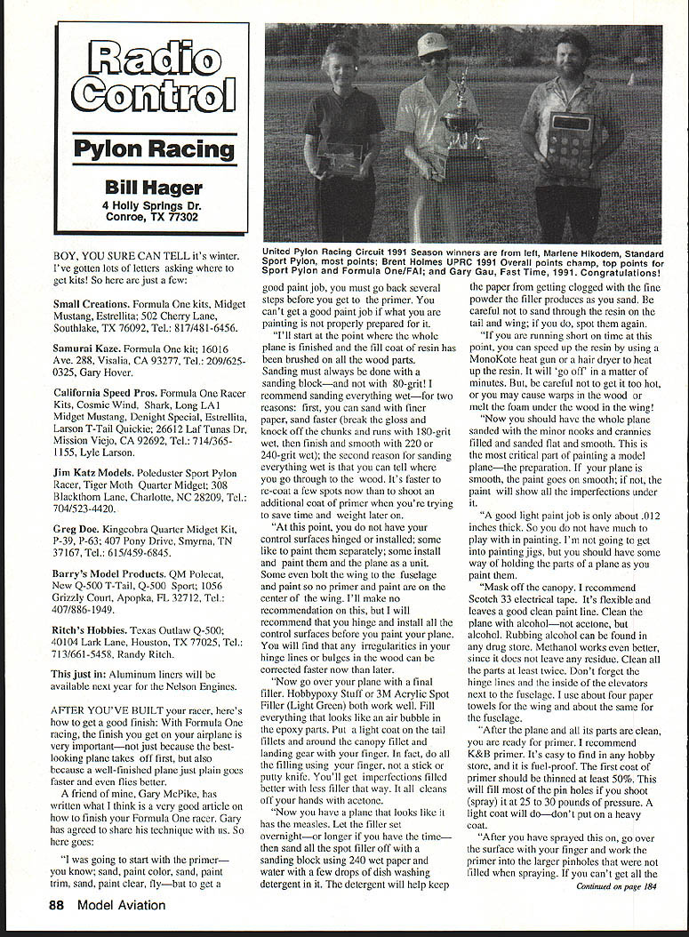 BOY YOU SURE CAN TELL its winter Ive gotten lots letters asking get kits So just few Small Creations Formula kits Midget Mustang Estrellita 502 Cherry Lane Southiake TX 76092 Tel 817/481-6456 Samurai Kaze Formula kit 16016 Ave 288 Visalia CA 93277 Tel 209/6250325 Gary Hover California Speed Pros Formula Racer Kits Cosmic Wind Shark Long LAl Midget Mustang Denight Special Estrellita Larson T-Tail Quickie 26612 Laf Tunas Dr Mission Viejo CA 92692 Tel 714/3651155 Lyle Larson Jim Katz Models Poleduster Sport Pylon Racer Tiger Moth Quarter Midget 308 Blackthorn Lane Charlotte NC 28209 Tel 704/523-4420 Greg Doe Kingeobra Quarter Midget Kit P-39 P-63 407 Pony Drive Smyrna TN 37167 Tel 615/459-6845 Barrys Model Products QM Polecat New Q-500 T-Tail Q-500 Sport 1056 Grizzly Court Apopka FL 32712 Tel 407/886-1949 Ritchs Hobbies Texas Outlaw Q-500 40104 Lark Lane Houston TX 77025 Tel 713/661-5458 Randy Ritch just Aluminum liners will available next year Nelson Engines AFTER YOUVE BUILT racer heres get good finish Formula racing finish get airplane very importantnot just because bestlooking plane takes off first also because well-linished plane just plain goes faster flies better friend Gary McPike has written what think very good article finish Formula racer Gary has agreed share technique us So goes going start primer know sand paint color sand paint trim sand paint clear flybut get good paint job must go back several steps before get primer cant get good paint job what painting properly prepared Ill start point whole plane finished fill coat resin has brushed wood parts Sanding must always done sanding blockand 80-grit reommend sanding everything wetfor two reasons first can sand finer paper sand faster break gloss knock off chunks runs 180-grit wet finish smooth 220 240-grit wet second reason sanding everything wet can tell go through wood Its faster re-coat few spots now shoot additional coat primer youre trying save time weight later point have control surfaces hinged installed some like paint separately some install paint plane unit Some bolt wing fuselage paint no primer paint center wing Ill make no recommendation will recommend hinge install control surfaces before paint plane will find irregularities hinge lines bulges wood can corrected faster now later Now go over plane final filler Hobbypoxy Stuff 3M Acrylic Spot Filler Light Green both work well Fill everything looks like air bubble epoxy parts Put light coat tail fillets around canopy fillet landing gear finger fact filling using finger stick putty knife Youll get imperfections filled better less filler way cleans off hands acetone Now have plane looks like has measles Let filler set overnightor longer have time sand spot filler off sanding block using 240 wet paper water few drops dish washing detergent detergent will help keep paper getting clogged fine powder filler produces sand careful sand through resin tail wing spot again running short time point can speed up resin using MonoKote heat gun hair dryer heat up resin will go off matter minutes careful get too hot may cause warps wood melt foam under wood wing Now should have whole plane sanded minor nooks crannies filled sanded flat smooth critical part painting model planethe preparation plane smooth paint goes smooth paint will show imperfections under good light paint job about 012 inches thick So have much play painting Im going get painting jigs should have some way holding parts plane paint Mask off canopy recommend Scotch 33 electrical tape Its flexible leaves good clean paint line Clean plane alcoholnot acetone alcohol Rubbing alcohol can found drug store Methanol works better since does leave residue Clean parts least twice Dont forget hinge lines inside etevators next fuselage use about four paper towels wing about same fuselage After plane its parts clean ready primer recommend K&B primer Its easy find hobby store fuel-proof first coat primer should thinned least 50% will fill pin holes shoot spray 25 30 pounds pressure light coat will dodont put heavy coat After have sprayed go over surface finger work primer larger pinholes filled spraying cant get Continued page 184 88 Model Aviation Pylon Racing Bill Hager 4 Holly Springs Dr Conroe TX 77302 United Pylon Racing Circuit 1991 Season winners left Marlene Hikodem Standard Sport Pylon points Brent Holmes UPRC 1991 Overall points champ top points Sport Pylon Formula One/FAI Gary Gau Fast Time 1991 Congratulations rough bunch characters want smooth out next project Es. Hobart Ruff-N-Tuff Carbide Cutters nasty work quickly no complaints Cut through grind off clear out rough up sand down rip off smooth out guys carbide-quick cool never load up Wood fiberglass lexan plastic ceramics no modeling material scares Theyre quite abrasive bunch available variety shapes two different grits Hobart Carbide Cutters rough bunch characters right can sure theyll never rub wrong way iobby Dealers Nationwide 1247 StCharles IL 60174 708-584-7616 few silent prayers go have some guiltless fun flying brains out generous slope lift Additionally because resort town accommodations located right bluffs Dave included brochure motor inn such location Seascape Motor Inn original name huh Rte 6A North Truro MA 02652 Cape Cod Tel 617 487-1225 look brochure Inn appears clean comfortable fun place stay might want call write information Rates better before Memorial Day after Labor Day rooms costing $44 $82 would prefer contact David write him 5 Birch Lane Scotia New York 12302 telephone 518 457-6712 Airfoil Month month Im going present what think very good airfoil choice Slope Racer general fun Slope ship airfoil SD-7003 section section has extremely good L/D ratio good looking drag bucket big difference way airfoil performs will depend two things heavily loaded what Reynolds number operates two items go hand hand because flown lightly loaded velocity will drop off cases will result reduced Reynolds number reduced Reynolds number will decrease slope lift cur