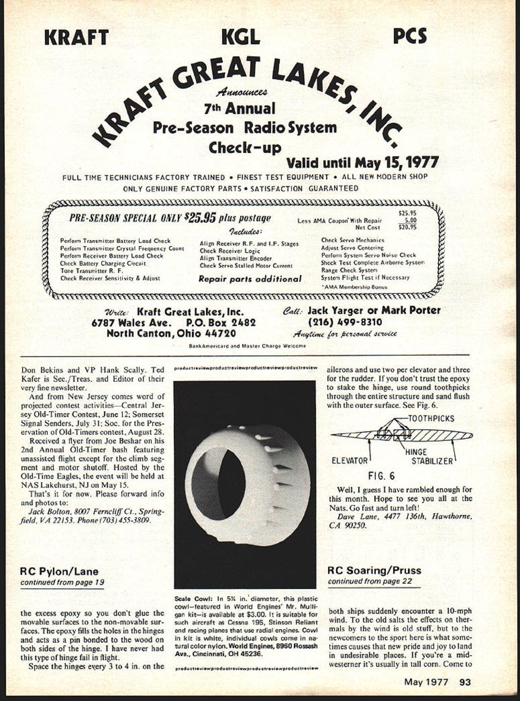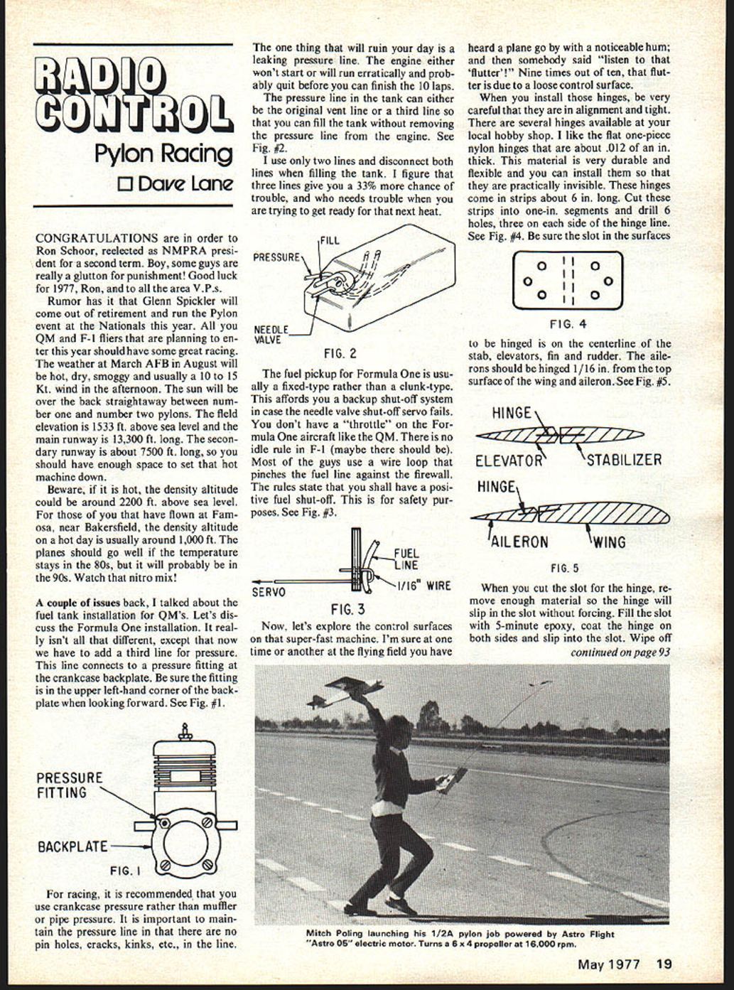 S Pylon Racing 0 Dave Lane CONGRATULATIONS order Ron Schoor reelected NMPRA presi dent second term Boy some guys really glutton punishment Good luck 1977 Ron area VPs Rumor has Glenn Spickler will come out retirement run Pylon event Nationals year QM F-l fliers planning en ter year should have some great racing weather March AFB August will hot dry smoggy usually 10 15 Kt wind afternoon sun will over back straightaway between num ber number two pylons field elevation 1533 ft above sea level main runway 13300 ft long secon dary runway about 7500 ft long should have enough space set hot machine down Beware hot density altitude could around 2200 ft above sea level have flown Fain osa near Bakersfield density altitude hot day usually around 1000 ft planes should go well temperature stays 80s will probably 90s Watch nitro mix couple issues back talked about fuel tank installation QMs Lets dis cuss Formula installation real ly isnt different except now have add third line pressure line connects pressure fitting crankcase backplate sure fitting upper left-hand corner backplate looking forward See Fig #1 PRESSURE FITTING BACKPL ATE FIGI racing recommended use crankcase pressure rather muffler pipe pressure important main tain pressure line no pin holes cracks kinks etc line thing will ruin day leaking pressure line engine either wont start will run erratically prob ably quit before can finish 10 laps pressure line tank can either original vent line third line can fill tank removing pressure line engine See Fig #2 use two lines disconnect both lines filling tank figure three lines give 33% chance trouble needs trouble trying get ready next heat PRESSURE FIG 2 fuel pickup Formula usu ally fixed-type rather clunk-type affords backup shut-off system case needle valve shut-off servo fails dont have throttle mula aircraft like QM no idle rule F-l maybe should Most guys use wire loop pinches fuel line against firewall rules state shall have posi tive fuel shut-off safety pur poses See Fig #3 SERVO kIIII F UEL LINE 1/16 WIRE FIG 3 Now lets explore control surfaces super-fast machine Im sure time another flying field have heard plane go noticeable hum somebody said listen flutter Nine times out ten flut ter due loose control surface install hinges very careful alignment tight several hinges available local hobby shop like flat one-piece nylon hinges about 012 thick material very durable flexible can install practically invisible hinges come strips about 6 long Cut strips one-in segments drill 6 holes three side hinge line See Fig #4 sure slot surfaces 0110 II II 0 0110 FIG 4 hinged centerline stab elevators fin rudder aile rons should hinged 1/16 top surface wing aileron See Fig #5 HINGE ~LIZER ELEVATOR HINGE AlL ERO FIG 5 cut slot hinge re move enough material hinge will slip slot forcing Fill slot 5-minute epoxy coat hinge both sides slip slot Wipe off continued page 93 May1977 19 Mitch Poling launching 1/2A pylon job powered Astro Flight Astro 05 electric motor Turns 6 x 4 propeller 16000 rpm pcs KGL IAT LA 4 7th Annual 4Pre-Season Radio System Check-up Valid until May 151977 FULL TIME TECHNICIANS FACTORY TRAINED ST TEST EQUIPMENT NEW MODERN SHOP ONLY GENUINE FACTORY PARTS SFACTION GUARANTEED PR-SEA SON SPECIAL ONLY $2595 plus post aqe Perform Transmitter Battery Load Check Perform Transmitter Crystal Frequency Count Perform Receiver Battery Load Check Check Battery Charging Circuit Tune Transmitter R F Check Receiver Sensitivity & Adjust Align Receiver RF IF Stages Check Receiver Logic Align Transmitter Encoder Check Servo Stalled Motor Current Repair parts additional $2595 500 $2095 Less AMA CoupoeWith Repair ______ Net Cost Check Servo Mechanics Adjust Servo Centering Perform System Servo Noise Check Shock Test Complete Airborne System Range Check System System Flight Test Necessary AMA Membership Bonus uie Kraft Great Lakes Inc 6787 Wales Ave PO Box 2482 North CantonOhio 44720 BankAmericard Master Charge Welcome aa Jack Yarger Mark Porter 216 499-8310 4&ue 4osea/ ewcee Don Bekins VP Hank Scally Ted Kafer Sec/Treas Editor very fine newsletter New Jersey comes word projected contest activitiesCentral Jer sey Old-Timer Contest June 12 Somerset Signal Senders July 31 Soc Pres ervation Old-Timers contest August 28 Received flyer Joe Beshar 2nd Annual Old-Timer bash featuring unassisted flight except climb seg ment motor shutoff Hosted Old-Time Eagles event will held NAS Lakehurst NJ May 15 Thats now Please forward info photos Jack Bolton 8007 Fernclzff Ci Spring field VA 22153 Phone703455 -3809 RC Pylon/Lane continued page 19 excess epoxy dont glue movable surfaces non-movable sur faces epoxy fills holes hinges acts pin bonded wood both sides hinge have never type hinge fail flight Space hinges exery 3 4 Scale Cowl 5/a diameter plastic cowlfeatured World Engines Mr Mulli gan kitis available $300 suitable such aircraft Cessna 195 Stinson Reliant racing planes use radial engines Cowl kit white individual cowls come na tural color nylon World Engines 8960 Rossash Ave Cincinnati OH 45236 productrviwproduetrviwproducrevewproductrviem ailerons use two per elevator three rudder dont trust epoxy stake hinge use round toothpicks through entire structure sand flush outer surface See Fig 6 TOOTHPICKS HINGE ELEVATORSTABILIZER FIG 6 Well guess have rambled enough month Hope see Nats Go fast turn left Dave Lane 4477 136th Hawthorne CA 90250 RC Soaring/Pruss continued page 22 both ships suddenly encounter 10-mph wind old salts effects ther mals wind old stuff newcomers sport what some times causes new pride joy land undesirable places youre mid westerner its usually tall corn Come May1977 93 KRAFT