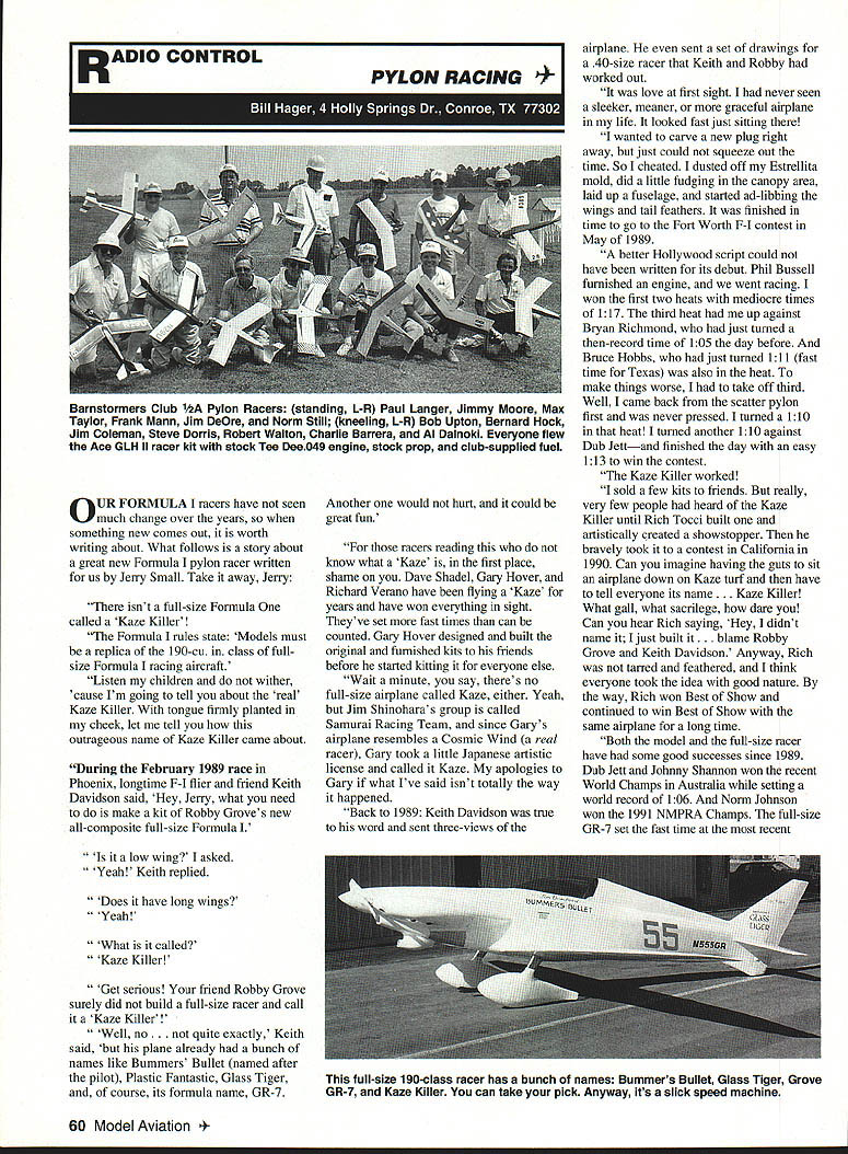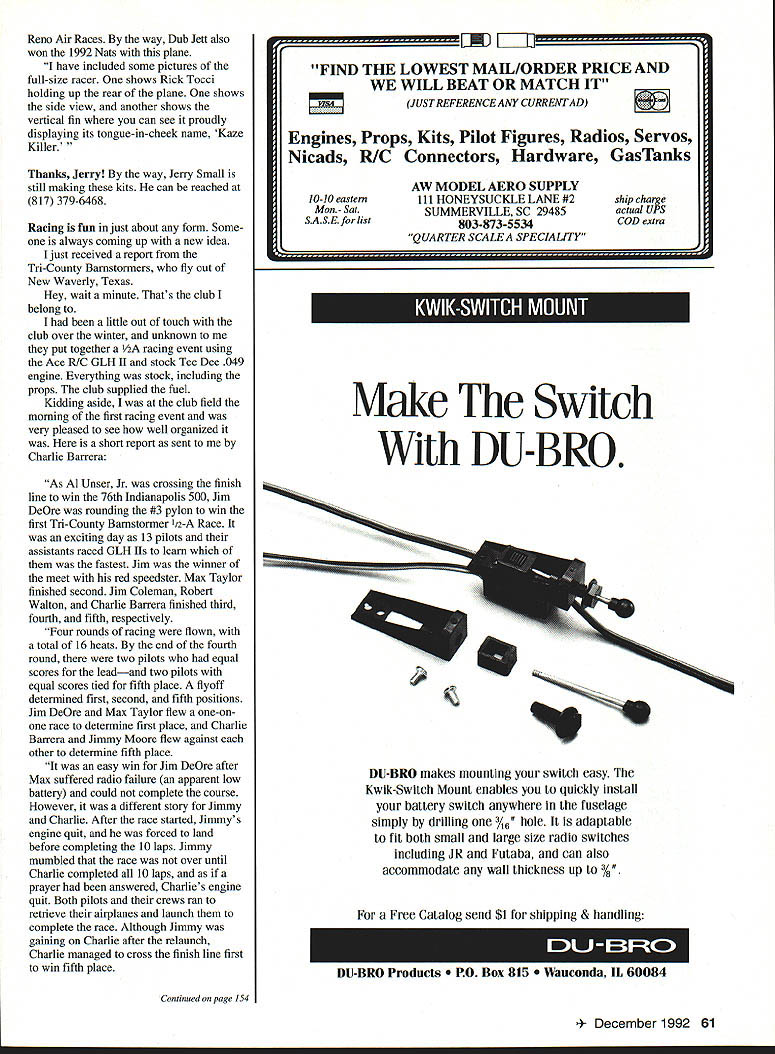 I R AD HO CONTROL OUR FORMULA racers have seen much change over years something new comes out worth writing about What follows story about great new Formula pylon racer written us Jerry Small Take away Jerry isnt full-size Formula called Kaze Killer Formula rules state Models must replica 190-cu class fullsize Formula racing aircraft Listen children wither cause Im going tell about real Kaze Killer tongue firmly planted cheek let tell outrageous name Kaze Killer came about During February 1989 race Phoenix longtime F-I flier friend Keith Davidson said Hey Jerry what need make kit Robby Groves new all-composite full-size Formula PYLON RACING 1 Another would hurt could great fun racers reading know what Kaze first place shame Dave Shadel Gary Hover Richard Verano have flying Kaze years have won everything sight Theyve set fast times can counted Gary Hover designed built original furnished kits friends before started kitting everyone else Wait minute say theres no full-size airplane called Kaze either Yeah Jim Shinoharas group called Samurai Racing Team since Garys airplane resembles Cosmic Wind real racer Gary took little Japanese artistic license called Kaze apologies Gary what Ive said isnt totally way happened Back 1989 Keith Davidson true word sent three-views airplane sent set drawings 40-size racer Keith Robby worked out love first sight never seen sleeker meaner graceful airplane life looked fast just sitting wanted carve new plug right away just could squeeze out time So cheated dusted off Estrellita mold did little fudging canopy area laid up fuselage started ad-libbing wings tail feathers finished time go Fort Worth F-I contest May 1989 better Hollywood script could have written its debut Phil Bussell furnished engine went racing won first two heats mediocre times 117 third heat up against Bryan Richmond just turned then-record time 105 day before Bruce Hobbs just turned 111 fast time Texas also heat make things worse take off third Well came back scatter pylon first never pressed turned 110 heat turned another 110 against Dub Jettand finished day easy 113 win contest Kaze Killer worked sold few kits friends really very few people heard Kaze Killer until Rich Tocci built artistically created showstopper bravely took contest California 1990 Can imagine having guts sit airplane down Kaze turf have tell everyone its name e Killer What gall what sacrilege dare Can hear Rich saying Hey didnt name just built me Robby Grove Keith Davidson Anyway Rich tarred feathered think everyone took idea good nature way Rich won Best Show continued win Best Show same airplane long time Both model full-size racer have some good successes since 1989 Dub Jett Johnny Shannon won recent World Champs Australia setting world record 106 Norm Johnson won 1991 MvIPRA Champs full-size GR-7 set fast time recent low wing asked Yeah Keith replied Does have long wings Yeah What called Kaze Killer Get serious friend Robby Grove surely did build full-size racer call Kaze Killer Well no te exactly Keith said plane already bunch names like Bummers Bullet named after pilot Plastic Fantastic Glass Tiger course its formula name GR-7 60 Model Aviation stormers Club Pylon Racers standing L-R Paul Langer Jimmy Moore Max Taylor Frank Mann Jim DeOre Norm Still kneeling L-R Bob Upton Bernard Hock Jim Coleman Steve Dorris Robert Walton Charlie Barrera Al Dalnoki Everyone flew Ace GLH II racer kit stock Tee Dee049 engine stock prop club-supplied fuel full-size 190-class racer has bunch names Bummers Bullet Glass Tiger Grove GR-7 Kaze Killer can take pick Anyway its slick speed machine Reno Air Races way Dub left also won 1992 Nats plane have included some pictures full-size racer shows Rick Tocci holding up rear plane shows side view another shows vertical fin can see proudly displaying its tongue-in-cheek name Kaze Killer Thanks Jerry way Jerry Small still making kits can reached 817 379-6468 Racing fun just about form Some always coming up new idea just received report Tn-County Barnstormers fly out New Waverly Texas Hey wait minute Thats club belong little out touch club over winter unknown put together racing event using Ace R/C GLH II stock Tee Dee 049 engine Everything stock including props club supplied fuel Kidding aside club field morning first racing event very pleased see well organized short report sent Charlie Barrera As Al Unser Jr crossing finish line win 76th Indianapolis 500 Jim DeOre rounding #3 pylon win first Tn-County Barnstormer 12-A Race exciting day 13 pilots assistants raced GLH Ils learn fastest Jim winner meet red speedster Max Taylor finished second Jim Coleman Robert Walton Charlie Barrera finished third fourth fifth respectively Four rounds racing flown total 16 beats end fourth round two pilots equal scores leadand two pilots equal scores tied fifth place flyoff determined first second fifth positions Jim DeOre Max Taylor flew one-onone race determine first place Charlie Barrera Jimmy Moore flew against other determine fifth place easy win Jim DeOre after Max suffered radio failure apparent low battery could complete course However different story Jimmy Charlie After race started Jimmys engine quit forced land before completing 10 laps Jimmy mumbled race over until Charlie completed 10 laps prayer answered Charlies engine quit Both pilots crews ran retrieve airplanes launch complete race Although Jimmy gaining Charlie after relaunch Charlie managed cross finish line first win fifth place Continued page 154 _____EIUDEIZI2 FIND THE LOWEST MAIL/ORDER PRICE AND WE WILL BEAT OR MATCH IT JUST REFERENCE ANY CURRENTAD Engines Props Kits Pilot Figures Radios Servos Nicads RIC Connectors Hardware GasTanks AW MODEL AERO SUPPLY 10-10 eastern111 HONEYSUCKLE LANE #2ship charge Mon- SotSUMMERVILLE SC 29485actual UPS SA SE list 03-873-5534COD extra QUARTER SCALE SPECIALITY Make Switch DU-BRO DIJ-BRO makes mounting switch easy Kwik-Switch Mount enables quickly install battery switch anywhere fuselage simply drillin