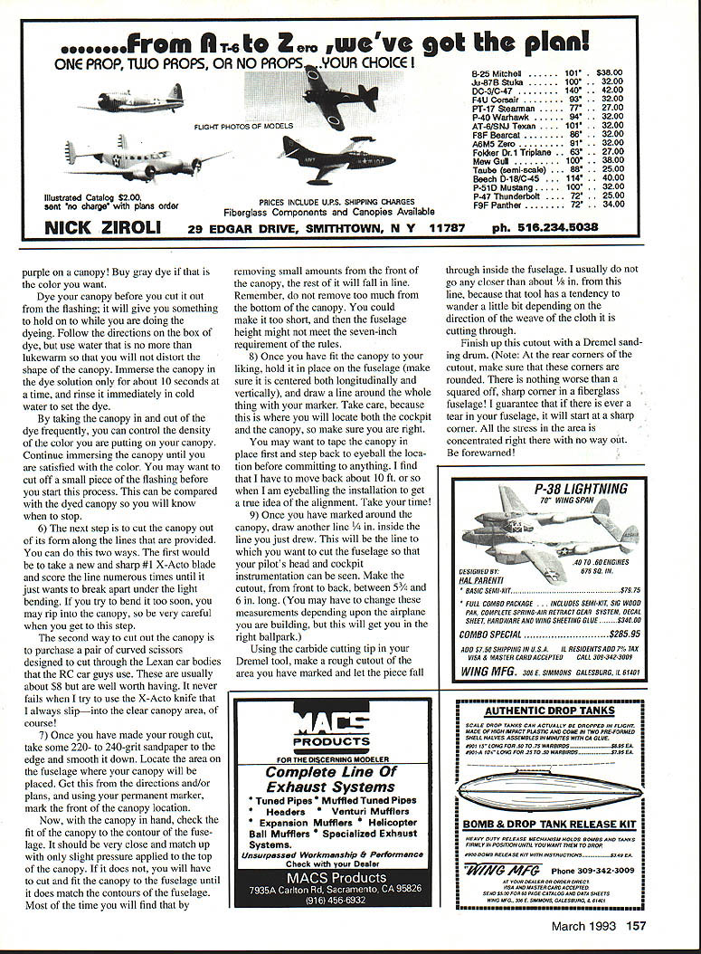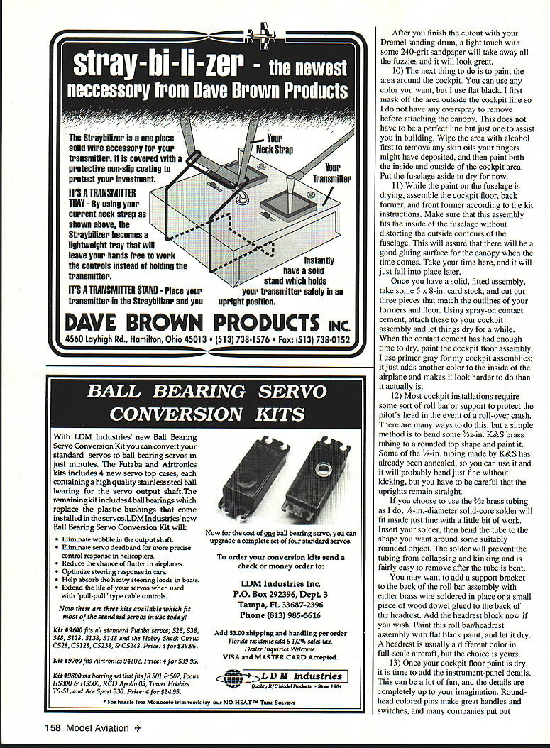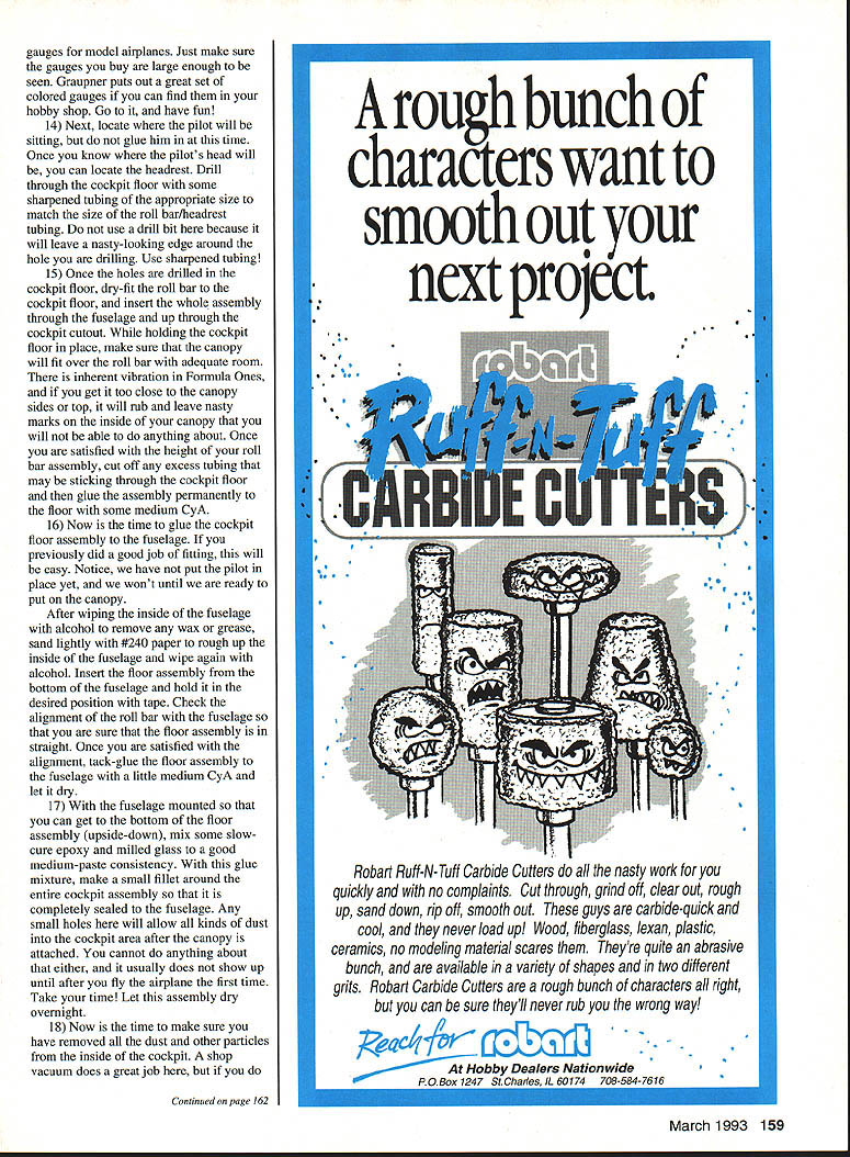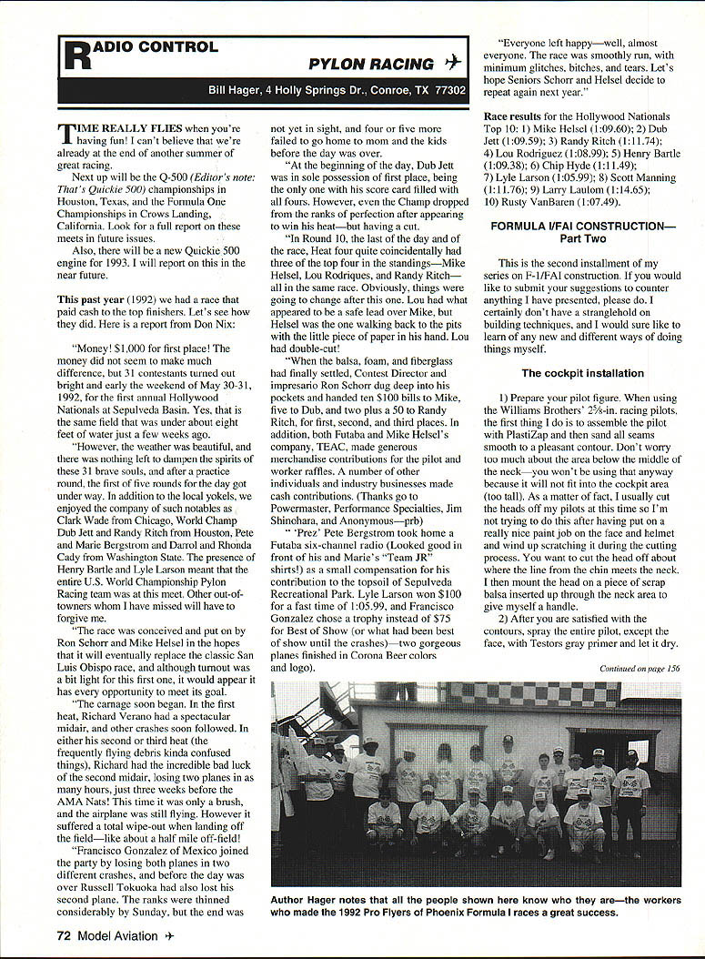 I R AD 10 CONTROL TIME REALLY FLIES youre having fun cant believe already end another summer great racing Next up will Q-500 Editors note Thats Quickie 500 championships Houston Texas Formula Championships Crows Landing California Look full report meets future issues Also will new Quickie 500 engine 1993 will report near future past year 1992 race paid cash top finishers Lets see did report Don Nix Money $1000 first place money did seem make much difference 31 contestants turned out bright early weekend May 30-31 1992 first annual Hollywood Nationals Sepulveda Basin Yes same field under about eight feet water just few weeks ago However weather beautiful nothing left dampen spirits 31 brave souls after practice round first five rounds day got under way addition local yokels enjoyed company such notables Clark Wade Chicago World Champ Dub Jett Randy Ritch Houston Pete Marie Bergstrom Darrol Rhonda Cady Washington State presence Henry Bartle Lyle Larson meant entire US World Championship Pylon Racing team meet Other out-of towners have missed will have forgive race conceived put Ron Schorr Mike Helsel hopes will eventually replace classic San Luis Obispo race although turnout bit light first would appear has opportunity meet its goal carnage soon began first heat Richard Verano spectacular midair other crashes soon followed either second third heat frequently flying debris kinda confused things Richard incredible bad luck second midair losing two planes hours just three weeks before AMA Nats time brush airplane still flying However suffered total wipe-out landing off fieldlike about half mile off-field Francisco Gonzalez Mexico joined party losing both planes two different crashes before day over Russell Tokuoka also lost second plane ranks thinned considerably Sunday end PYLON RACING sight four five failed go home mom kids before day over beginning day Dub Jett sole possession first place being score card filled fours However Champ dropped ranks perfection after appearing win heatbut having cut Round 10 last day race Heat four quite coincidentally three top four standingsMike Helsel Lou Rodriques Randy Ritch same race Obviously things going change after Lou what appeared safe lead over Mike Helsel walking back pits little piece paper hand Lou double-cut balsa foam fiberglass finally settled Contest Director impresario Ron Schorr dug deep pockets handed ten $100 bills Mike five Dub two plus 50 Randy Ritch first second third places addition both Futaba Mike Helsel s company TEAC made generous merchandise contributions pilot worker raffles number other individuals industry businesses made cash contributions Thanks go Powermaster Performance Specialties Jim Shinohara Anonymousprb Prez Pete Bergstrom took home Futaba six-channel radio Looked good front Maries Team JR shirts small compensation contribution topsoil Sepulveda Recreational Park Lyle Larson won $100 fast time 10599 Francisco Gonzalez chose trophy instead $75 Best Show what best show until crashestwo gorgeous planes finished Corona Beer colors logo Everyone left happywell almost everyone race smoothly run minimum glitches bitches tears Lets hope Seniors Schorr Helsel decide repeat again next year Race results Hollywood Nationals Top 10 1 Mike Helsel 10960 2 Dub Jett 10959 3 Randy Ritch 11174 4 Lou Rodriguez 10899 5 Henry Bartle 10938 6 Chip Hyde 11149 7 Lyle Larson 10599 8 Scott Manning 11176 9 Larry Laulom 11465 10 Rusty VanBaren 10749 FORMULA 1/FAI CONSTRUCTION Part Two second installment series F- 1/FAI construction would like submit suggestions counter anything have presented please certainly dont have stranglehold building techniques would sure like learn new different ways doing things myself cockpit installation 1 Prepare pilot figure using Williams Brothers 25/s-in racing pilots first thing assemble pilot PlastiZap sand seams smooth pleasant contour Dont worry too much about area below middle neckyou wont using anyway because will fit cockpit area too tall As matter fact usually cut heads off pilots time Im trying after having put really nice paint job face helmet wind up scratching during cutting process want cut head off about line chin meets neck mount head piece scrap balsa inserted up through neck area give myself handle 2 After satisfied contours spray entire pilot except face Testors gray primer let dry 72 Model Aviation inued poge 156 Author Hager notes people shown know arethe workers made 1992 Pro Flyers Phoenix Formula races great success Serious Horsepower1 05 ST YS Rossi & Webra Parts Service Custom Engines Accessories Dave Shadel Performance Specialties 9c /ib La / JJ}JabJ Send $1 00for fully illustrated catalog information Call 702 265-7523 Hours 10 am 5 pm Monday Thursday PO Box 3146 nerville NV 89410 Available YS Lang & Short Stroke 06 Long Stroke 05 6IFSR 0S 40 VRP/VF 0S 91 VROF STX-40 Rossi 40 coming soon enjoy themselves wind blowing event becomes slope soaring rally doesnt its thermal field rally youve suppressing desire scale finally want become part new growing movement write NASSA will doubt discovering some best-performing sailplanes RC dCC M4Wrc6ood Learn fly planes private field Five 6 day course $350 Open year round Send SASE complete info Southwest RC Flying 2818 Carolina NE Albuquerque NM 87110505-832-6394 soaring has offer NASSAs address now same Rt 4 Box 9544 W Richiand WA 99352 information please include SASE cost join association $10 per year Some funds will go toward supporting column RCSD rest money will used sponsor annual scale event must noted NASSA intends host its annual scale rally different sites year scale modelers parts North America will eventually have chance attend going join NASSA may wise subscribe RCSD address PO Box 2108 Wylie TX 75098-2108 4RO PylonlHager Continued paqe 72 will allow good paint adhesion provide color beneath top colors cover coat color paint will needed cover helmet Let primer dry well before proceeding 3 Lately has trend static judges look pilot matches pa