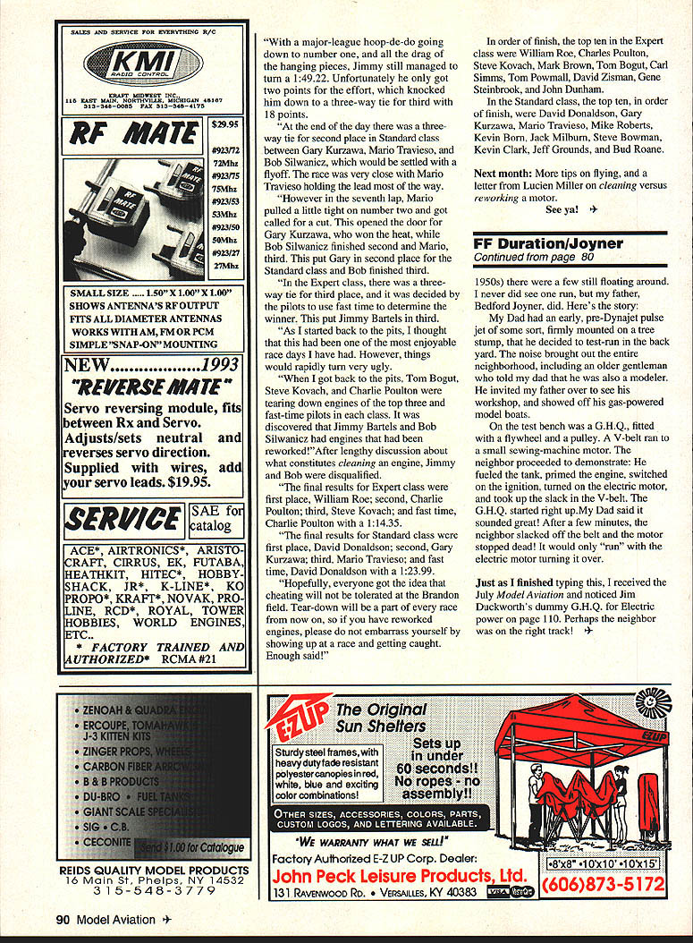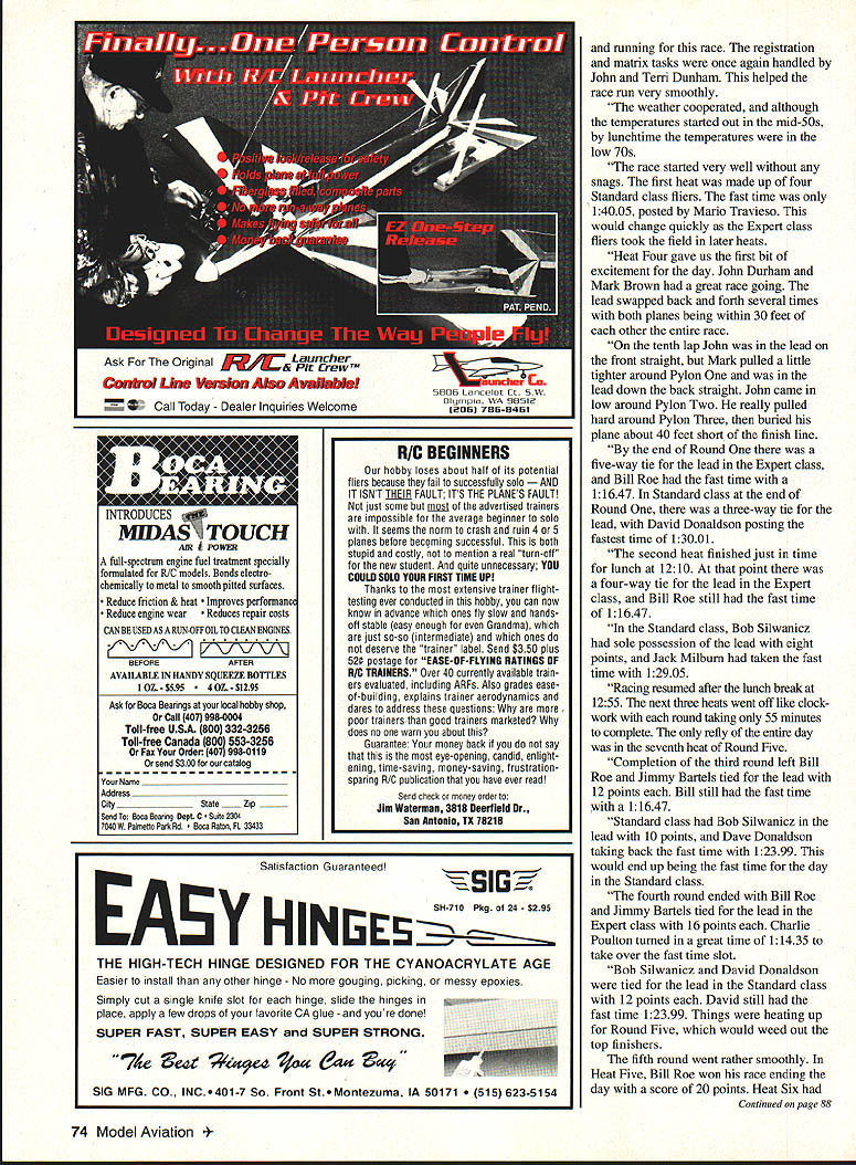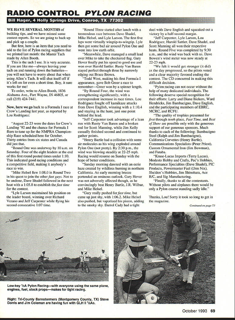 RADIO CONTROL PYLON RACING 1i WE HAVE SEVERAL MONTHS building tips have missed some contest reports So going back up pick up couple first item need add list Pylon racing suppliers printed last month Master Tach made Allen Booth tach use very accurate like mealways leaving tach running down batteries will have worry about using Allens Tach will shut itself off its left short time Boy sure works order write Allen Booth 1836 Alabama Ave Fort Wayne IN 46805 call 219 424-7441 Now go back Formula race Crows Landing last year reported Lou Rodriguez August 22-23 dates Crows Landing 92 chance Formula fliers tune up NMPRA Champion ship Race scheduled October Thirty entries six states Canada did just Round underway 10 am Saturday Four eight leaders end first round posted times under 110 indicated good racing conditions competitive field making anybodys race win Mike Helsel flew 1080 Round Two quest join otherfast guys undone Dave Shadel followed next heat 1058 establish fast time contest Lyle Larson maintained position leader board winning over Richard Verano Jeff Carpenter flying second consecutive 107 time Round Three started after lunch tremendous race between Dave Shadel Mike Helsel Lyle Larson first five laps virtually wingtip-to-wingtip Lyle got some bad air around Pylon went low earth orbit Meanwhile Dave managed small lead over Mike take checkered flag Gary Hover finally put speed good use won over Harold Sattler Rusty Van Baren stayed perfect through three narrowly edging out Bruce Brown Todd West making first Formula appearance gave Bob Greer race rememberGreer won spinner length Round Four wind strengthening significantly correspondent increase race times Lou Rodriguez fought off kamikaze attacks Dave English winning 1104 staying hunt just point behind lead Jeff Carpenter took advantage lean run Rusty Van Baren broken rod Scott Manning Jim Kelly casually finished second continued gather points Henry Bartle collision some air molecules wing exploded around Pylon pretty 230 pm wind blowing steadily 22-25 mph Racing would resume Sunday hope better conditions Sunday morning dawned eerie haze created wildfires burning northern California An early morning breeze portended ominous outlook Gary Hover adversely affected though convincingly beat Henry Bartle JR Wilbur Mike Helsel Gary really pushed fast time came up just shy 1062 Mike Helsel also pushed vaporized piston adding smoky sky Darrol Cady tight duel Dave English squeaked out victory half-second margin Jeff Carpenter Lyle Larson Lou Rodriguez Harold Sattler Dave Shadel Scott Manning won respective heats Round Five completed 930 am wind back us Dave Bowens wind meter now steady 22-23 mph felt would get stronger did day progressed pilots voted clear majority favored ending contest CD concurred making difficult decision Pylon racing can occur help dedicated individuals following deserve special recognition efforts Larry Diane Bickers Ward Hendricks Jim Bambacigno Dave English participating members EBRC MCRC RCFU quality trophies presented first through tenth place Fast Time Best Show possible generous support generous sponsors Much thanks following Bambacigno Steel Ralph Jim Bambacigno California Corvettes Henry Bartle Communications Specialists Peter Priest Custom Ornamental Iron Jim Bowman Futaba Kruse-Lucas Imports Terry Lucas Modesto Hobby Crafts Pecs Hobbies Performance Specialties Dave Shadel PlC Products Powermaster Fuel Don Nix Sheldons Hobbies Jim Shinohara Ace RIC Sig Manufacturing Finally thanks contestants Without pilots airplanes would Pylon course standing sadly idle Thanks Lou Sorry took long get magazine Right Tn-County Barnstormers Montgomery County TX Steve Darns Jim Coleman having fun GLH II 112A5 October 1993 69 Continued page 73 Low-key Pylon Racingwith everyone using same plane engines fuel stock propsmakes tight racing width RF power outputs ranged 200 500 mW See reference 3 detailed description RC systems Instrumentation The decoded servo output signals receiver-under-test fed two on-board recorders telemeter transmitter on-board recorders monitored servo position jitter due interference servo jitter counter SJC recorded number times decoded servo position pulse width deviated encoded pulse encoded pulse width 15 ins deviation exceeding 1-50 microseconds counted other recorder counted absence servo position information frame rate counter FRC registered count servo information refereshed encoded frame rate 20 ins SJC FRC counts stored two separate binary sequenced LED dis plays counters reset prior flight data count documented after flight telemeter system modified Ace R/C Inc Thermic Sniffler operating 49845 MHz under FCC Part 15 rules commercial unit normally telemeters modulated tone represents change ambient air pressure makes useful variometer model sailplanes variometer air flow sensor signal disconnected modulation source on-board counter signals substituted Note SJC FRC cannot operate simultaneously telemeter chirp indication other counter counting possible distin guished between two counters telemetered signal RC interference flight test procedure Five people needed run tests person operated mobile transmitter remote site An airplane pilot mechanic helper operated aircraft flying site transmitter sending signals receiver-under-test required another person simulate RC pilot test conductor flying site made fifth test conductor coordinated interfering signal via VHF radio required test sequence recorded test sequence telemetered data post flight on-board recorder data pocket voice recorder telemeter record simple voice description test conductors observa tions listened telemeter signal magnetic record later transcribed hard copy Most model aircraft flown individuals enjoyment competition other pilots typical fun flight powered model starts takeoff runway followed climb altitude aerobatics performedThe altitude about 400 feet maximum range airport about one-quarter mile S THEGREATEST RIC VJDEOSEVERPRODUCED Tke Mos