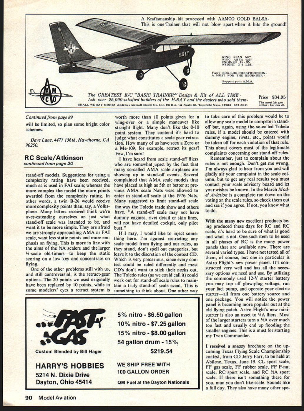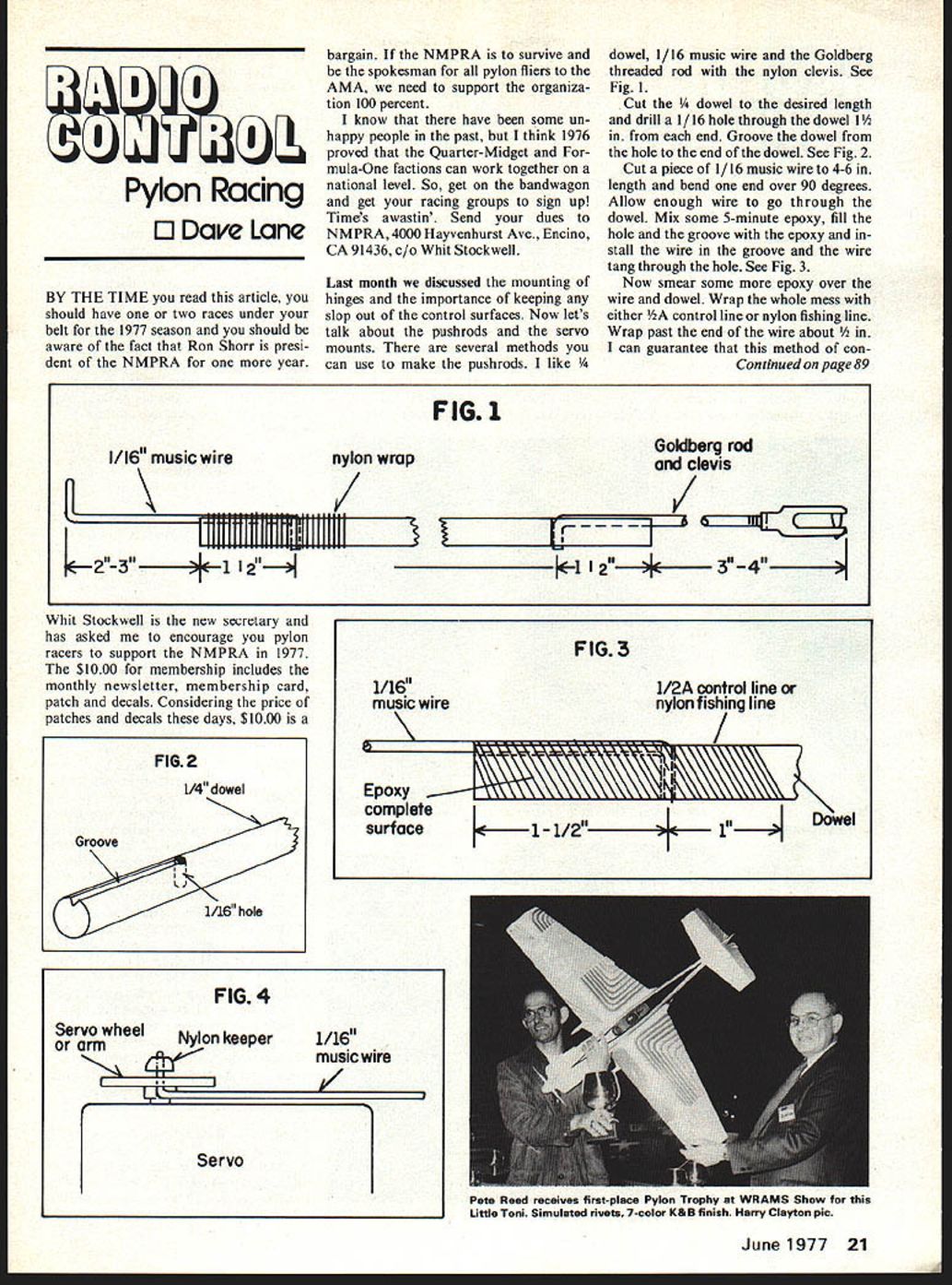 I Pylon Racing 0 Dave Lane BY THE TIME read article should have two races under belt 1977 season should aware fact Ron Shorr presi dent NMPRA year Whit Stockwell new secretary has asked encourage pylon racers support NMPRA 1977 $1000 membership includes monthly newsletter membership card patch decals Considering price patches decals days $1000 bargain NMPRA survive spokesman pylon fliers AMA need support organiza tion 100 percent know have some un happy people past think 1976 proved Quarter-Midget mula-One factions can work together national level So get bandwagon get racing groups sign up Times awastin Send dues NMPRA 4000 Hayvenhurst Ave Encino CA 91436 c/o Whit Stockwell Last month discussed mounting hinges importance keeping slop out control surfaces Now lets talk about pushrods servo mounts several methods can use make pushrods like 1/4 FIG3 1/16 music wire Epoxy complete surfacej* 1dowel 1 / 16 music wire Goldberg threaded rod nylon clevis See Fig Cut /4 dowel desired length drill 1 / 16 hole through dowel /2 end Groove dowel hole end dowel See Fig 2 Cut piece 1/16 music wire 4-6 length bend end over 90 degrees Allow enough wire go through dowel Mix some 5-minute epoxy fill hole groove epoxy stall wire groove wire tang through hole See Fig 3 Now smear some epoxy over wire dowel Wrap whole mess either /2A control line nylon fishing line Wrap past end wire about /2 can guarantee method conContinued page 89 1/2A control line nylon fishing line / wel T June 1977 21 FIG1 1/16 music wirenylon wrapGoldberg rod clevis ___v/I k 2-3 41 2AfE-i 12A 311 FIG 2 1/4 dowel Groove 1/16 hole FIG 4 Servo wheelmm armNylon keeper1/16 Pete Aced receives first-place Pylon Trophy WRAMS Show Little Toni Simulated rivets 7-color K&B finish Harry Clayton pic wherever convenient Perpendicular end bench keeps out way Now roll shade down tape plans across top onto shade up close roller now have excellent display plans want get out way just tug shade voila plans shade disappear faster timer its turn fly Have ideas club happenings think unique would care share others Send column well pass Sketches pictures help Dan Pruss Box 490 Plainfleld IL 60544 RC Pylon/Lane continued page 21 structing pushrod will never fail flight Now lets hook up pushrod servo wheel arm control sur face clevis should snug fit onto control horn Keep slop mini mum also make sure no binds hookup clevis must move freely horn other end pushrod bend wire 90 degrees about 5/16 end insert through hole servo arm wheel See Fig4 Install nylon keeper wire top servo arm insurance pushrod will vibrate out servo set up servo linkages properly servo body will also keep pushrod dropping out servo arm wire should push fit servo arm Keep slop minimum area hope has helped speedsters may have some problems sloppy control systems flutter heard some disturbing news concerning Quickie-500 racing seems en gine restrictions going already lifted Southern California area times 500s already competing Formula thought Q-500 guy wanted get pylon racing having fight super-engine syndrome Sounds will go way racing ie fast possible hang cost sup pose will see two classes Q-500 just have Quarter Midget mula something like done interest new people pylon racing would like see class racing set up novice beginner whatever want label individual wants learn fly compete pylon would satisfy needs beginner Maybe need class racing based similar category pattern classes Once individual has mastered art going straight turning left stock equipment have him graduate sophisticated engines air craft draw line would say individual able consis tently fly standard Formula-One course under 150 stock equipment ready advanced class would like hear people thinking getting pylon dont because see super-fast engines tearing up course know need another racing class like need hole head believe will entice new blood sport dont set up basic class new comer CPC Chicago area has come up plan get help out races will pay $1000 per day full days work pit crew member also carried motion allow airplane being kitted 500 class allowed long built kit specifica tions Front rotor 40s may used no pumps mufflers exhaust extensions Sounds guys Chicago area trying what have harping get away no mufflers Im sure everybody knows now pylon Nationals will after noon day can plan some wind probably lot smog Visibility Continued page 90 June1977 89 TRY THESE OTHER CONTEST QUALITY PRODUCTS FROM PACTRA ____Solal Film HAND SELECTEDEXCLUSIVE LOW-HEAT PRECISION SANDEDtOVERING FOR SHEETS KSFOAM & BALSA DOWELS SFLYING MODELS TRIANGLES KSflexible ble PLANKSfuel proof tweight pUiu Industries Inc 7080 HOLLYWOOD BLVD LOS ANGELES CA 90028 Continued page 89 will limited plan some bright color schemes Dave Lane 4477 136th Hawthorne CA 902S0 RC Scale/Atkinson continued page 20 stand-off models Suggestions using complexity rating have received much used FAI scale whereas complex model points awarded complexity rating other words twin B-26 would receive complexity points say Volks plane letters received think over-extending ourselves just what stand-off scale intended want simple afraid strongly approaching AMA FAI scale want less static points em phasis flying line aims scalers larger /4-scale old-timersto keep static scoring low key concentrate flying other problems still us still controversial retract-gear options 20 points used originally have replaced 10 points some modelers eyes retract system Custom Blended Bill Hager worth 10 points given wing-over simple maneuver like straight flight dont like 0-10 point system contend its hard judge what constitutes scale gear retrac tion us have seen Zero Me-109 example retract its gear Few Im sure have heard scale stand-off fliers somewhat upset fact so-called AMA scale airplanes showing up stand-off events Several complained AMA scale models have placed high 5th better pre vious AMA scale Nats allowed enter stand-off scale 1976 Nats suggested limit stand-off scale way Toledo trade show others have 