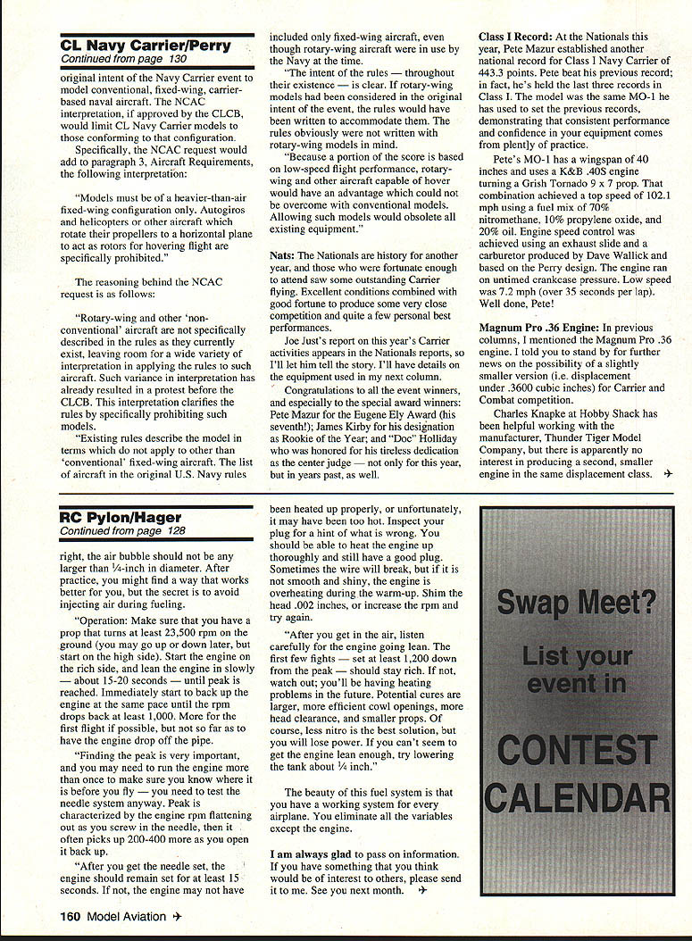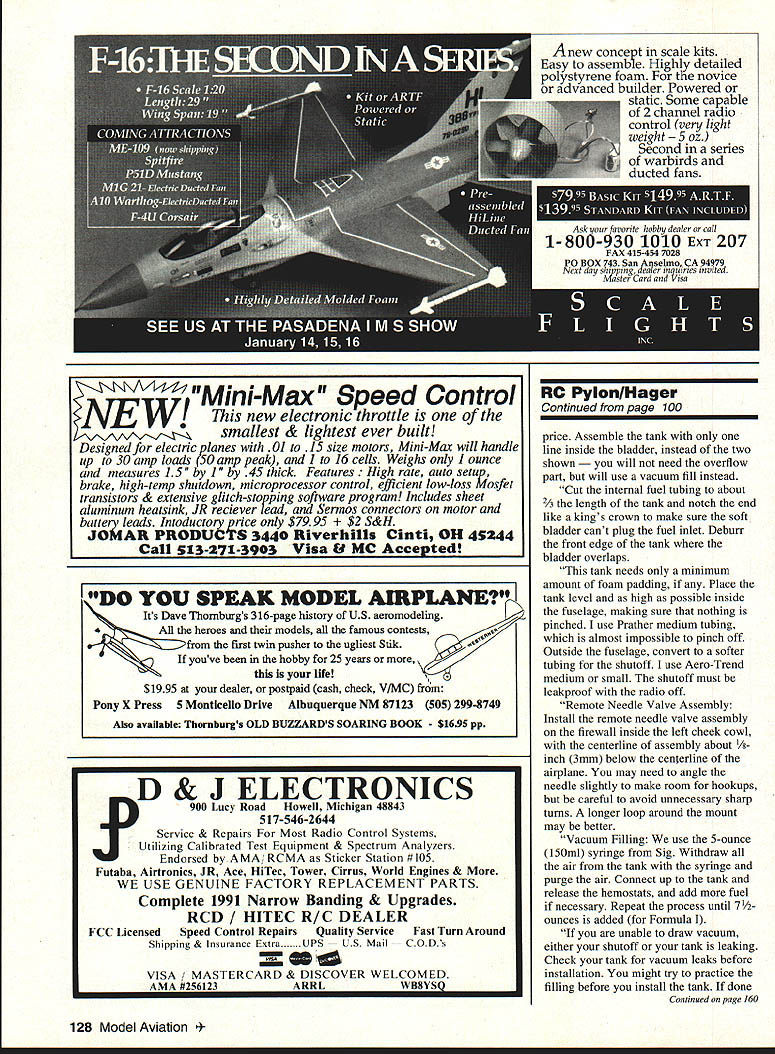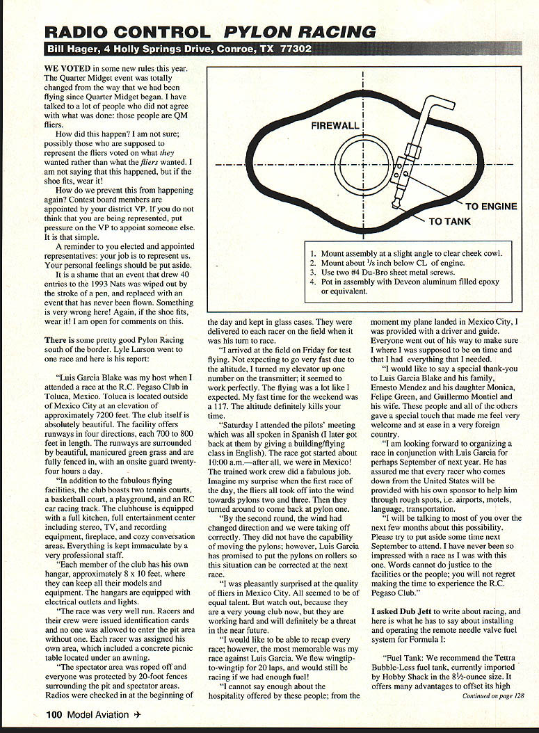 RADIO CONTROL PYLON RACING WE VOTED some new rules year Quarter Midget event totally changed way flying since Quarter Midget began have talked lot people did agree what done people QM fliers did happen am sure possibly supposed represent fliers voted what wanted rather what fliers wanted am saying happened shoe fits wear prevent happening again Contest board members appointed district VP think being represented put pressure VP appoint someone else simple reminder elected appointed representatives job represent us personal feelings should put aside shame event drew 40 entries 1993 Nats wiped out stroke pen replaced event has never flown Something very wrong Again shoe fits wear am open comments some pretty good Pylon Racing south border Lyle Larson went race report Luis Garcia Blake host attended race RC Pegaso Club Toluca Mexico Toluca located outside Mexico City elevation approximately 7200 feet club itself absolutely beautiful facility offers runways four directions 700 800 feet length runways surrounded beautiful manicured green grass fully fenced onsite guard twentyfour hours day addition fabulous flying facilities club boasts two tennis courts basketball court playground RC car racing track clubhouse equipped full kitchen full entertainment center including stereo TV recording equipment fireplace cozy conversation areas Everything kept immaculate very professional staff member club has own hangar approximately 8 x 10 feet can keep models equipment hangars equipped electrical outlets lights race very well run Racers crew issued identification cards no allowed enter pit area racer assigned own area included concrete picnic table located under awning spectator area roped off everyone protected 20-foot fences surrounding pit spectator areas Radios checked beginning 1the day kept glass cases delivered racer field turu race arrived field Friday test flying expecting go very fast due altitude turned elevator up number transmitter seemed work perfectly flying lot like expected fast time weekend 117 altitude definitely kills time Saturday attended pilots meeting spoken Spanish later got back giving building/flying class English race got started about 1000 amafter Mexico trained work crew did fabulous job Imagine surprise first race day fliers took off wind towards pylons two three turned around come back pylon second round wind changed direction taking off correctly did have capability moving pylons however Luis Garcia has promised put pylons rollers situation can corrected next race pleasantly surprised quality fliers Mexico City seemed equal talent watch out because very young club now working hard will definitely threat near future would like able recap race however memorable race against Luis Garcia flew wingtipto-wingtip 20 laps would still racing enough fuel cannot say enough about hospitality offered people moment plane landed Mexico City provided driver guide Everyone went out way make sure supposed time everything needed would like say special thank-you Luis Garcia Blake family Ernesto Mendez daughter Monica Felipe Green Guillermo Montiel wife people others gave special touch made feel very welcome ease very foreign country am looking forward organizing race conjunction Luis Garcia perhaps September next year has assured racer comes down United States will provided own sponsor help him through rough spots ie airports motels language transportation will talking over next few months about possibility Please try put aside some time next September attend have never impressed race Words cannot justice facilities people will regret making time experience RC Pegaso Club asked Dub Jett write about racing what has say about installing operating remote needle valve fuel system Formula Fuel Tank recommend Tettra Bubble-Less fuel tank currently imported Hobby Shack 8/2-ounce size offers advantages offset its high Continued page 128 100 Model Aviation unt assembly slight angle clear cheek cowl 2 Mount about 1/ inch below CL engine 3 Use two #4 Du-Bro sheet metal screws 4 Pot assembly Devcon aluminum filled epoxy equivalent DO YOU SPEAK MODEL AIRPLANE Its Dave Thomburgs 316-page history US aeromodeling 4 es models famous contests first twin pusher ugliest Stik youve hobby 25 years life $1995 dealer postpaid cash check V/MC Pony X Press 5 Monticello Drive Albuquerque NM 87123 505 299-8749 Also available Tbornburgs OLD BUZZARDS SOARING BOOK $1695 pp price Assemble tank line inside bladder instead two shown need overflow part will use vacuum fill instead Cut internal fuel tubing about 2A length tank notch end like kings crown make sure soft bladder cant plug fuel inlet Deburr front edge tank bladder overlaps tank needs minimum amount foam padding Place tank level high possible inside fuselage making sure nothing pinched use Prather medium tubing almost impossible pinch off Outside fuselage convert softer tubing shutoff use Aero-Trend medium small shutoff must leakproof radio off Remote Needle Valve Assembly Install remote needle valve assembly firewall inside left cheek cowl centerline assembly about 1/~ inch 3 mm below centerline airplane may need angle needle slightly make room hookups careful avoid unnecessary sharp turns longer loop around mount may better Vacuum Filling use 5-ounce 150m1 syringe Sig Withdraw air tank syringe purge air Connect up tank release hemostats add fuel necessary Repeat process until 7 1/2 ounces added Formula unable draw vacuum either shutoff tank leaking Check tank vacuum leaks before installation might try practice filling before install tank done Continued page 160 128 Model Aviation concet scale kits toe Highly detailed foam novice builder Powered static Some capable 2 channel radio control very light 5oz series waroirds ducted fans RC PylonlHager Mini-Max Speed Control Continued page 100 PVE IIJ new electronic throttle smallest & lightest ever built Designed electric p lanes 01 15 size motors Mini-Max will handle up 30 amp loads SO am eak 1 16 cells Weighs 1 ounce 