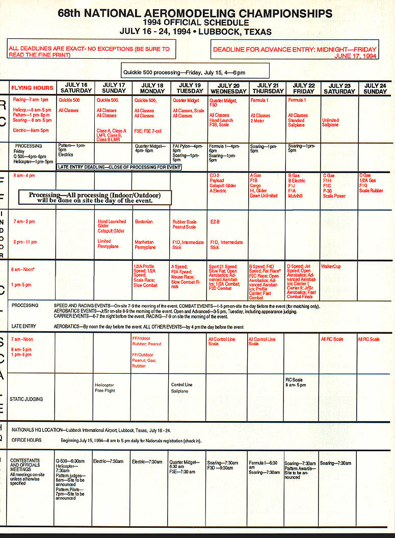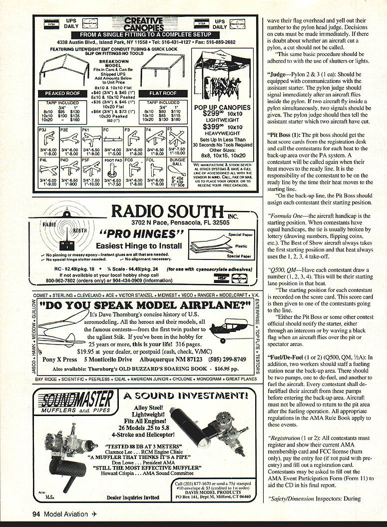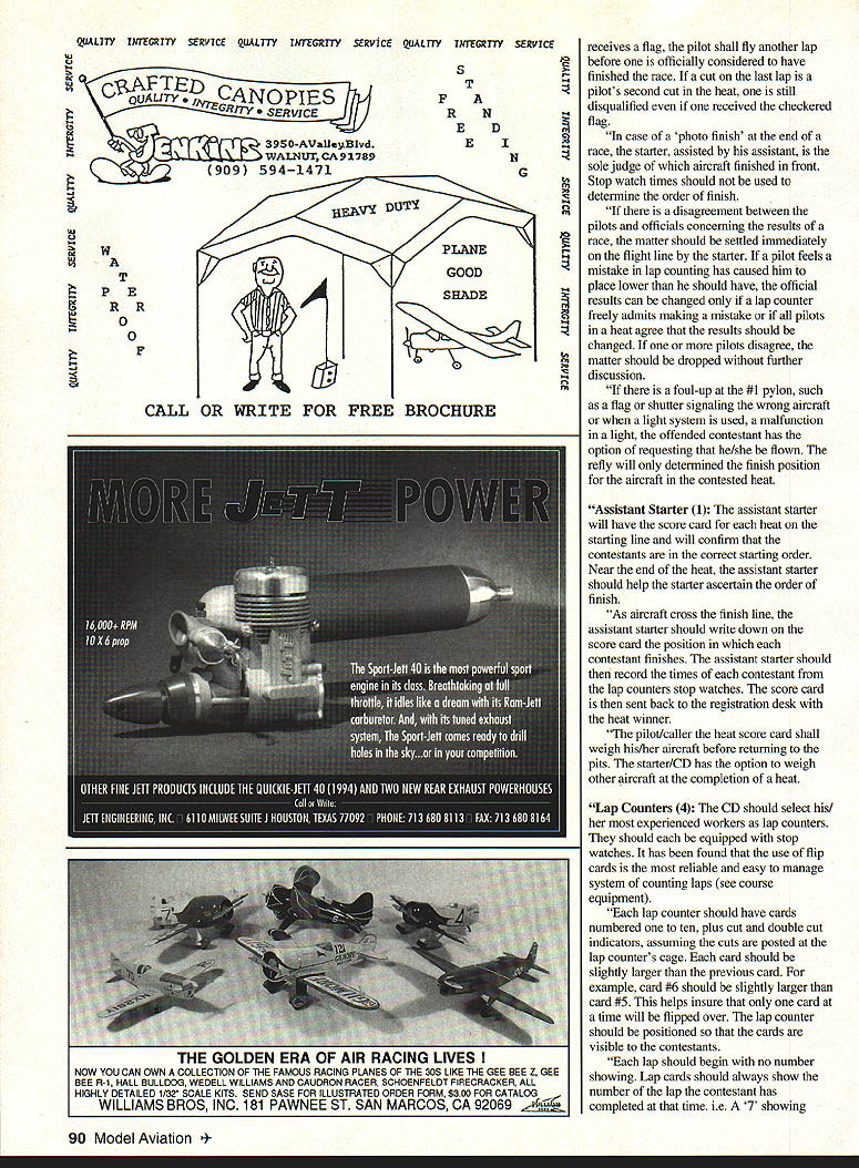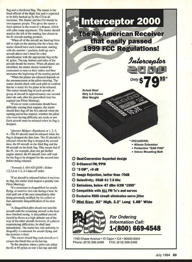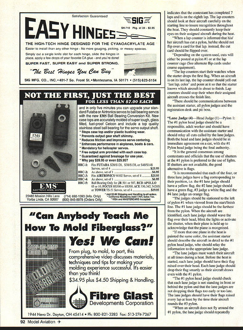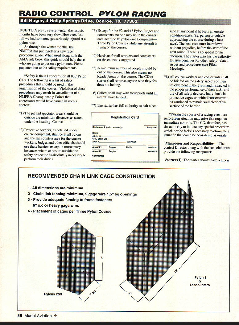 RADIO CONTROL PYLON RACING DUE TO pretty severe winter last six months have very slow However last fall someone get seriously injured pylon race So through winter months NIvIPRA has put together new race procedure guide used along AMA rule book guide should help going put pylon race Please pay attention safety requirements Safety #1 concern RIC Pylon CDs following list safety procedures should used organization contest Violation procedures may result cancellation NMPRA Championship Points contestants would have earned such contest 3 Except #2 #3 Pylon Judges contestants no may danger area near #3 pylon see Equipment Three Pylon Course aircraft flying course 4 Hardhats workers contestants course suggested 5 A minimum number people should out course also means no Ready Areas course CD starter shall remove anyone feel does belong 6 Callers shall stay pilots until aircraft have landed 7 starter has full authority halt heat race point feels unsafe condition exists ie person vehicle approaching course during heat race heat race must reflown prejudice before start next round no appeal decision starter also has authority issue penalties other safety-related issues procedures see Pilots Meeting 8 All course workers contestants shall briefed safety aspects involvement event instructed proper performance tasks use safety devices Individuals protective cages behind barriers must cautioned remain well clear surface barrier 1 The pit spectator areas should outside minimum distances stated under heading Course 2 Protective barriers detailed under course equipment shall pylons lap counters area course workers Judges other officials should use barriers except momentary instances exposure outside safety protection absolutely necessary perform duties During course racing event unforeseen situation may arise requires immediate controls CD therefore has authority initiate special procedure he/she feels necessary eliminate situation could considered unsafe Manpower Responsibilities contest Director along host club must provide following manpower Starter 1 starter should have green 4 Placement cages per Three Pylon Course RECOMMENDED CHAIN LINK CAGE CONSTRUCTION 1- dimensions minimum 2 Chain link fencing minimum 9 gage wire 15 sq openings 3 Provide adequate fencing frame fasteners 6 oc heavy gage wire k 88 Model Aviation stration Card ContestantS matrix use onlyFreqlChan Name Address i1y State Zip AMA a__________________ NMPRA#______________ Aircraft 1EngIneRadioHandicap Alrcratt 2EngIneHandicap Comments Pylons 2&3 ego b Pylon 1 & Lapcounters flag checkered flag starter head official flight line expected fully backed up CD decisions Starter CD should two separate people gives starter third opinion event dispute will calm arguments starter should stand left starting line closest #1 aircraft starting position aircraft lined up left right starting line heat starter should have contestant starting number 1 position hold up ones aircraft above ones head color identification appropriate flag #1 pylon top bottom sides alrcraft should shown planes identified starter should remind contestants turn radios announce beginning starting period planes released depends announcement pilots meeting starter should check pilot confirm ready plane released starter should flag aircraft group aircraft approximately one-second intervals after prescribed time has expired see Pilots Meeting contestants should have difficulty starting engines starter should flag off first aircraft starting period has elapsed whether pilots having difficulty ready aircraft must released its flag dropped Quarter MidgetRacehorse 1 2 3 4The #1 aircraft must released flag dropped first time #2 aircraft released flag dropped second time #3 aircraft third flag #4 aircraft forth flag means #1 example does get his/her engine started #2 aircraft must still wait flag dropped second time before being released Formula 424-428 QSOOEither 1234 1-3 2-4 take-off order aircraft released before receives its flag starter shall impose penalty see Pilots Meeting contestant disqualified unsafe flying receives two cuts during heat shall pull out race immediately after being personally notified caller face automatic disqualification next heat disqualified pilot should land aircraft until remaining aircraft heat have finished racing disqualified aircraft should flown high altitude out way other aircraft however pilot experiencing difficulties shall land immediately starter has sole authority disqualify contestant unsafe flying decision final starter should flag aircraft crosses finish line its last lap situation pilot cuts either #2 #3 pylon ones last lap still 0 Dual-Conversion Superhet design O SChannel FM/PPM o OIP 9 dB O Image Rejection better -70dB O Selectivity -55dB 0 75 Khz O Emissions below 47 dBm @3M 1999 O Compatible ALL FM Txs servos O Exclusive RSSI circuit eliminates servo jitter O Mini Size 82 High 22 Long 168 Wide or Ordering nformation Call 1800 6694548 1780 Chase Avenue ajon 92020-8304 Phone 619 596-2496FAX 619 596-2492 July1994 89 oniYs7 995* * INCLUDING Aileron Extension Protective DAD PAD Velcro Mounting Belt QUALIV/ WTGRT7Y SERVICE QuALrI-/ INTEGU1Y SERVICE QJJALTTY INTEGRITY SERVICE U GR7ySER VICE 395O-AVaUBIvd WALNUT CA 91789 cl U 0 w T FE RR 0 0 F ce tb2y S T FA RN ED E N G 1 0 CALL OR WRITE FOR FREE BROCHURE receives flag pilot shall fly another lap before officially considered have finished race cut last lap pilots second cut heat still disqualified received checkered flag case photo finish end race starter assisted assistant sole judge aircraft finished front Stop watch times should used determine order finish disagreement between pilots officials concerning results race matter should settled immediately flight line starter pilot feels mistake lap counting has caused him place lower should have official results can changed lap counter freely admits making mistake pilots heat agree results should changed pilots disagree matter should dropped further di