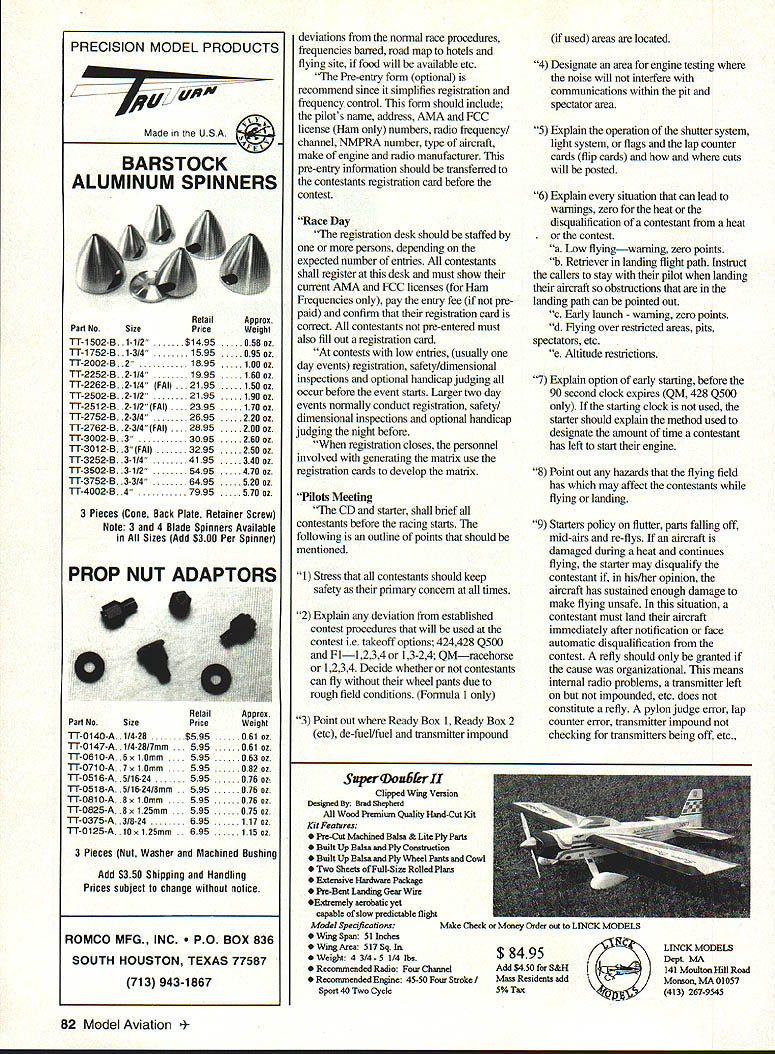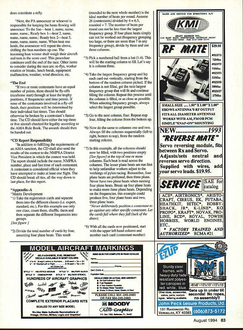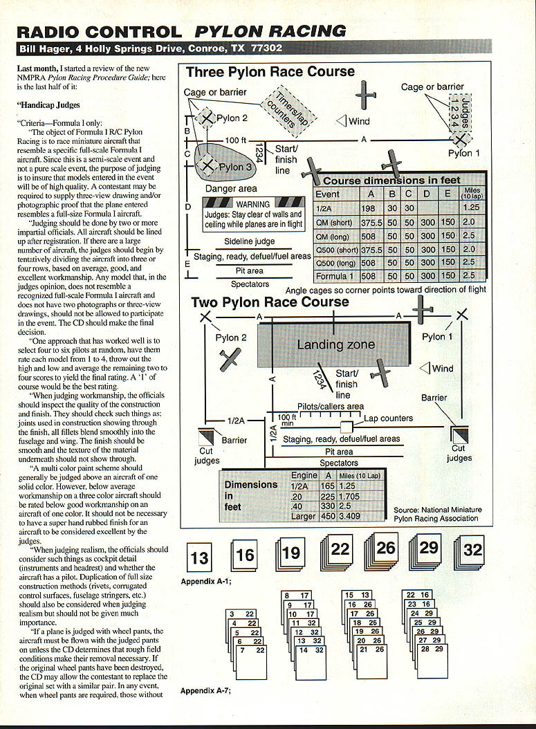 RADIO CONTROL PYLON RACING U 11K p Last month started review new NMPRA Pylon Racing Procedure Guide last half Handicap Judges CriteriaFormula object Formula R/C Pylon Racing race miniature aircraft resemble specific full-scale Formula aircraft Since semi-scale event pure scale event purpose judging insure models entered event will high quality contestant may required supply three-view drawing and/or photographic proof plane entered resembles full-size Formula aircraft Judging should done two impartial officials aircraft should lined up after registration large number aircraft judges should begin tentatively dividing aircraft three four rows based average good excellent workmanship Any model judges opinion does resemble recognized full-scale Formula aircraft does have two photographs three-view drawings should allowed participate event CD should make final decision approach has worked well select four six pilots random have rate model 1 4 throw Out high low average remaining two four scores yield final rating 1 course would best rating judging workmanship officials should inspect quality construction finish should check such things joints used construction showing through finish fillets blend smoothiy fuselage wing finish should smooth texture material underneath should show through multi color paint scheme should generally judged above aircraft solid color However below average workmanship three color aircraft should rated below good workmanship aircraft color should necessary have super hand rubbed finish aircraft considered excellent judges judging realism officials should consider such things cockpit detail instruments headrest whether aircraft has pilot Duplication full size construction methods rivets corrugated control surfaces fuselage stringers etc should also considered judging realism should given much importance plane judged wheel pants aircraft must flown judged pants unless CD detennines rough field conditions make removal necessary original wheel pants have destroyed CD may allow contestant replace original set similar pair event wheel pants required Three Pylon Race Course Cage barrier tj S5 c9Pyion 2 B 1C D Danger area k Start/ C nish line WARNING Judges Stay clear walls ceiling planes flight Sideline judge E Staging ready defuel/fuel areas Pit area * ]Wind Cage barrier Spectators Angle cages corner points toward direction OT iignt Two Pylon Race Course IAj / Pylon 2Pylon 1 1/2A Barrier CutI judges line Pilots/callers area lOOftcounters c,j Z Staging ready defuel/fuel areas Pit area Barrier Cut judges Source National Miniature Pylon Racing Association 13 Appendix A-i 8 1715 1322 16 917162623 16 1017172624 29 1132182625 29 1232192626 29 1332202627 29 1432212628 29 Appendix A-7 Pyion 1 CLASSIC PROPELLERS Scale replicas nostalgic propellers Golden Years Avaition R/G aircraft -Precision Scale -Hand crafted maple -Balanced & ready flight -Highest quality -Simulated brass leading edge -Authentic manufacturers markings -Dynamic display LIY ace order information write call Advanced Marketing Inc 8989 W Central Wichita Kansas 67212 Phone/Fax 316 721-4164 take off last Exposed engine heads should down graded However exaggerated bumps cowling cover engine otherwise would exposed should also downgraded bumps extend beyond scale outline top side views After roughly ranking aircraft degree workmanship realism judges should just consider scale outline should go far however measure accuracy outline ruler slide rule Scale outline should used deciding factor between aircraft equivalent workmanship realism no event should judge pick up handle model unless move judge Best Show aircraft designated Best Show shall qualify award flying least heat judging should done quickly standing position no reason closer four five feet model being judged airplanes should marked some way ie 1 2 ABetc ensure proper handicap assigned correct aircraft judges should have list contestants names rank aircraft according AMA rule book Alternate Handicap Judging Method [Refer Focus Competition section] Scorekeeper 1 person persons may also people involved registration since assigned tasks have completed contestant disqualified heat ie penalty under weight etc other contestants will move up accordingly heat positions scorekeeper can convert heat finish positions points First place should receive four points secondthree points third-two points fourthone point heats three plane heats first place receives three points second-two points third-one point No finish zero points times recorded score board contestant disqualified during after completion contest cheating unsportsmanlike conduct points will reduced zero everyone affected will move up final standings CD will go back individual heats change scores Matrix Overview purpose section serve guide toward organizing aircraft frequencies such manner arrive reasonably equitable series heat races contest participants methods selecting recording can tailored suit individual preferences forms important thing sure frequency groups conflict list groups readily available easily interpreted throughout event Some basic rules should kept mind operating pylon race mimmum five rounds must flown 80 Model Aviation 517-546-2644 Service & Repairs Most Radio Control Systems Utilizing Calibrated Test Equipment & Spectrum Analyzers Endorsed AMA/RCMA Sticker Station #105 Futaba Airtronics JR Ace HiTec Tower Cirrus World Engines & WE USE GENUINE FACTORY REPLACEMENT PARTS Complete 1991 Narrow Banding & Upgrades RCD / HITEC R/C DEALER FCC Licensed Speed Control Repairs Quality Service Fast Turn Around Shipping & Insurance ExtraUPS ailCODs VISA MASTERCARD & DISCOVER WELCOMED AMA #256123ARRLWB8VSQ race order classified official contest Formula race scheduled Saturday separate race scheduled Sunday minimum five rounds must flown day racing [Refer Appendix A] Transmitter Impound 1 transmitter impound area should provided near ready area contestants shall impound transmitters between heats contestant 